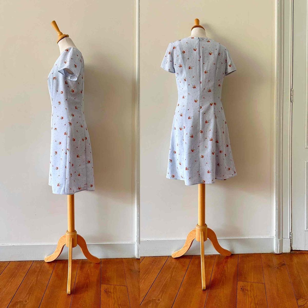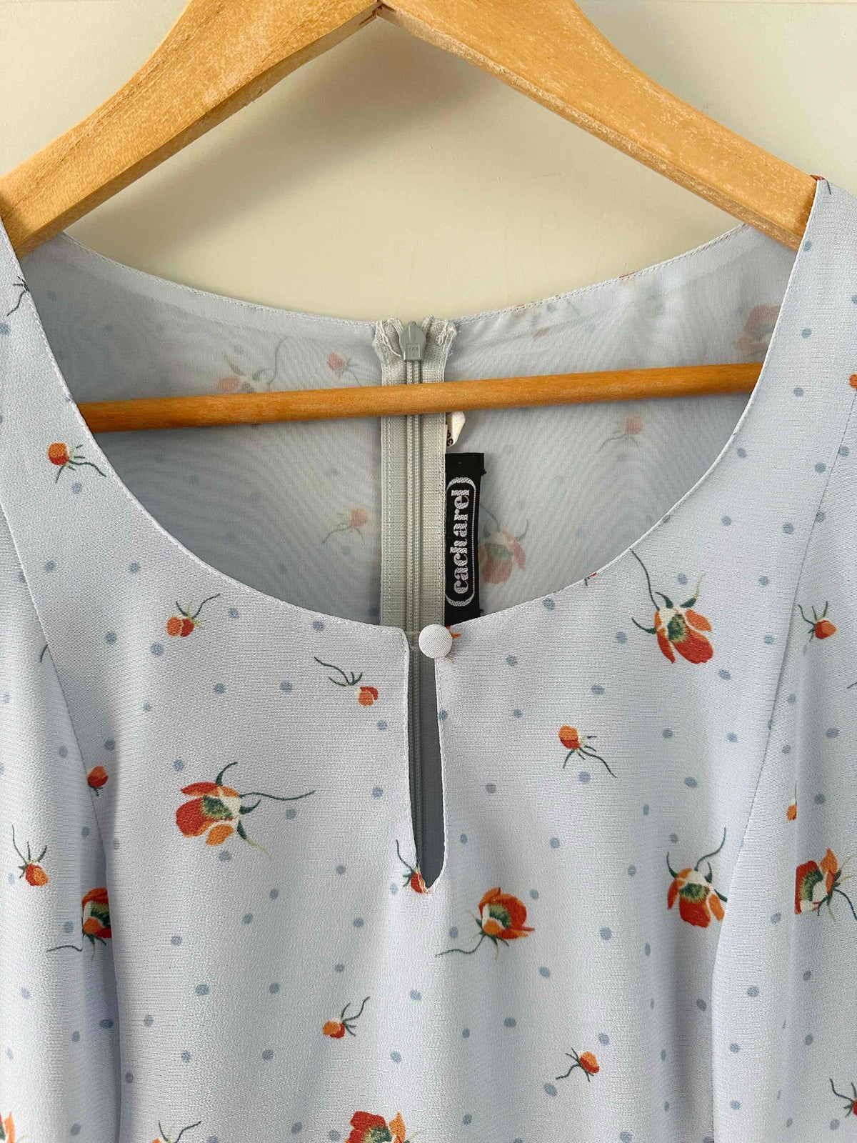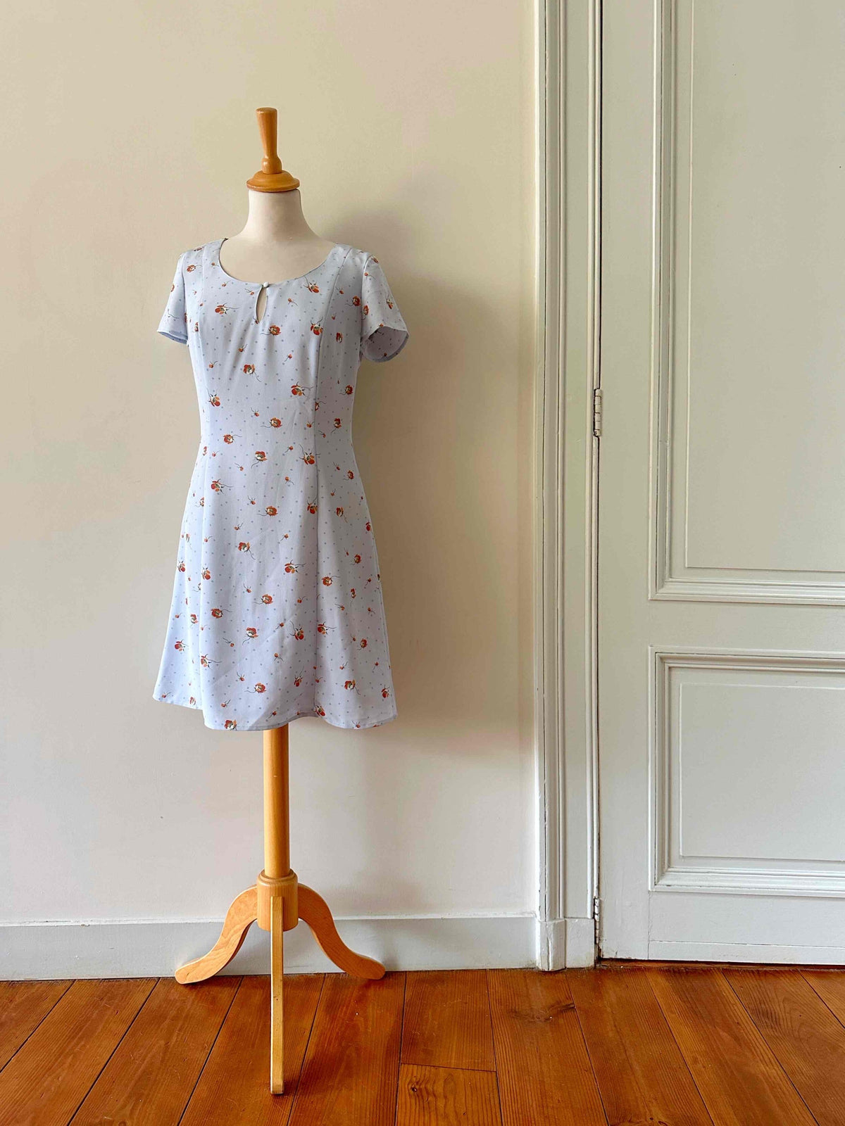 Robe Cacharel en viscose bleue ciel imprimée fleurs rouges et pois roses, encolure ronde ajourée d’un petit bouton goutte, forme fit and flare, fabriquée en France, taille 36 portée ici sur un mannequin T36, aisselles 44cm.