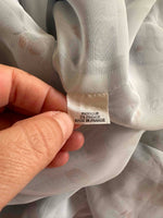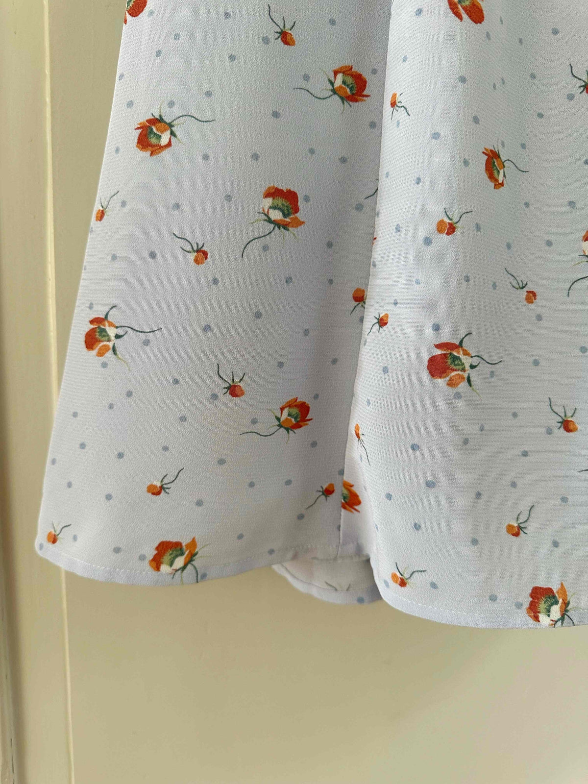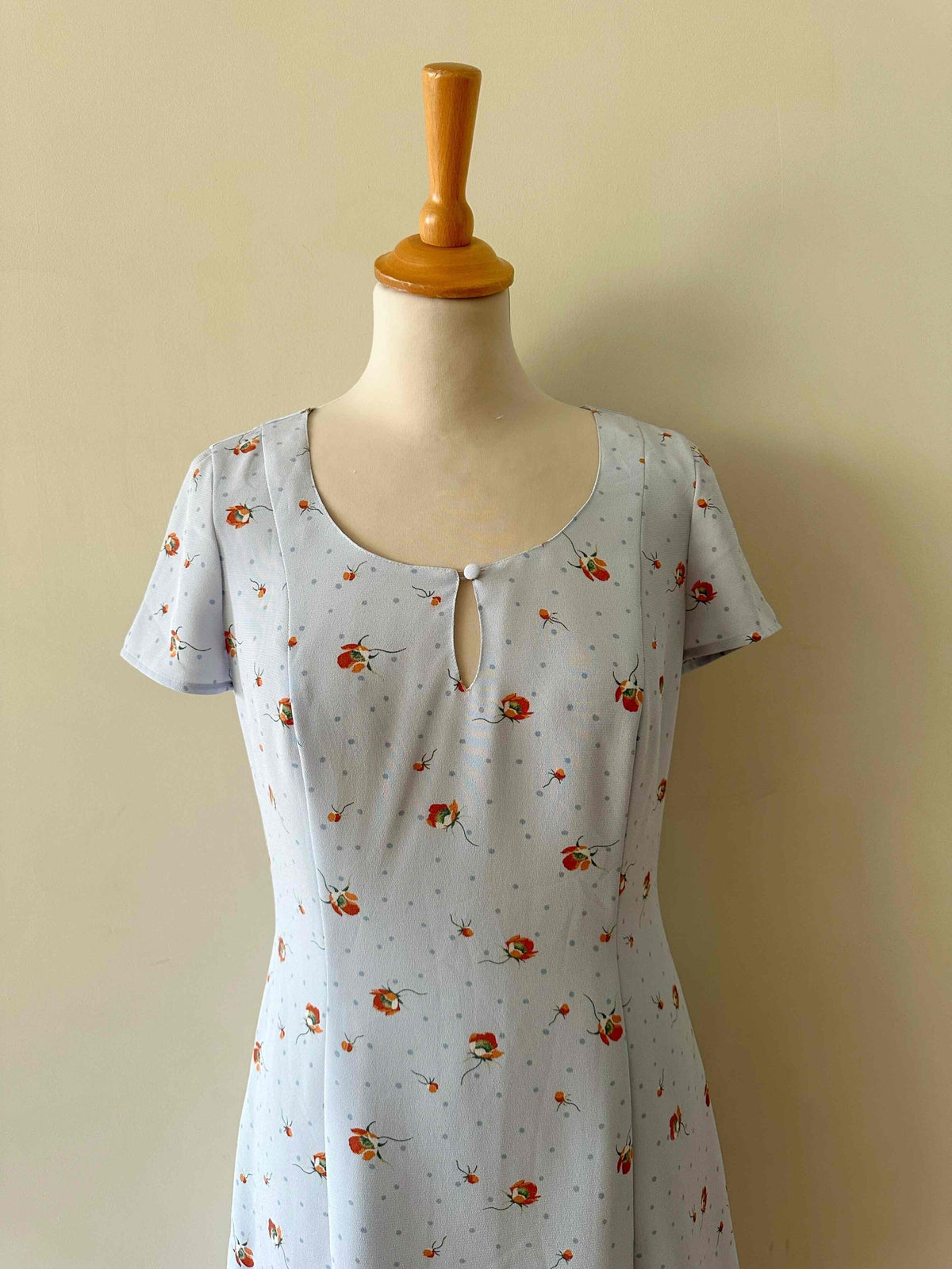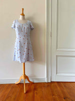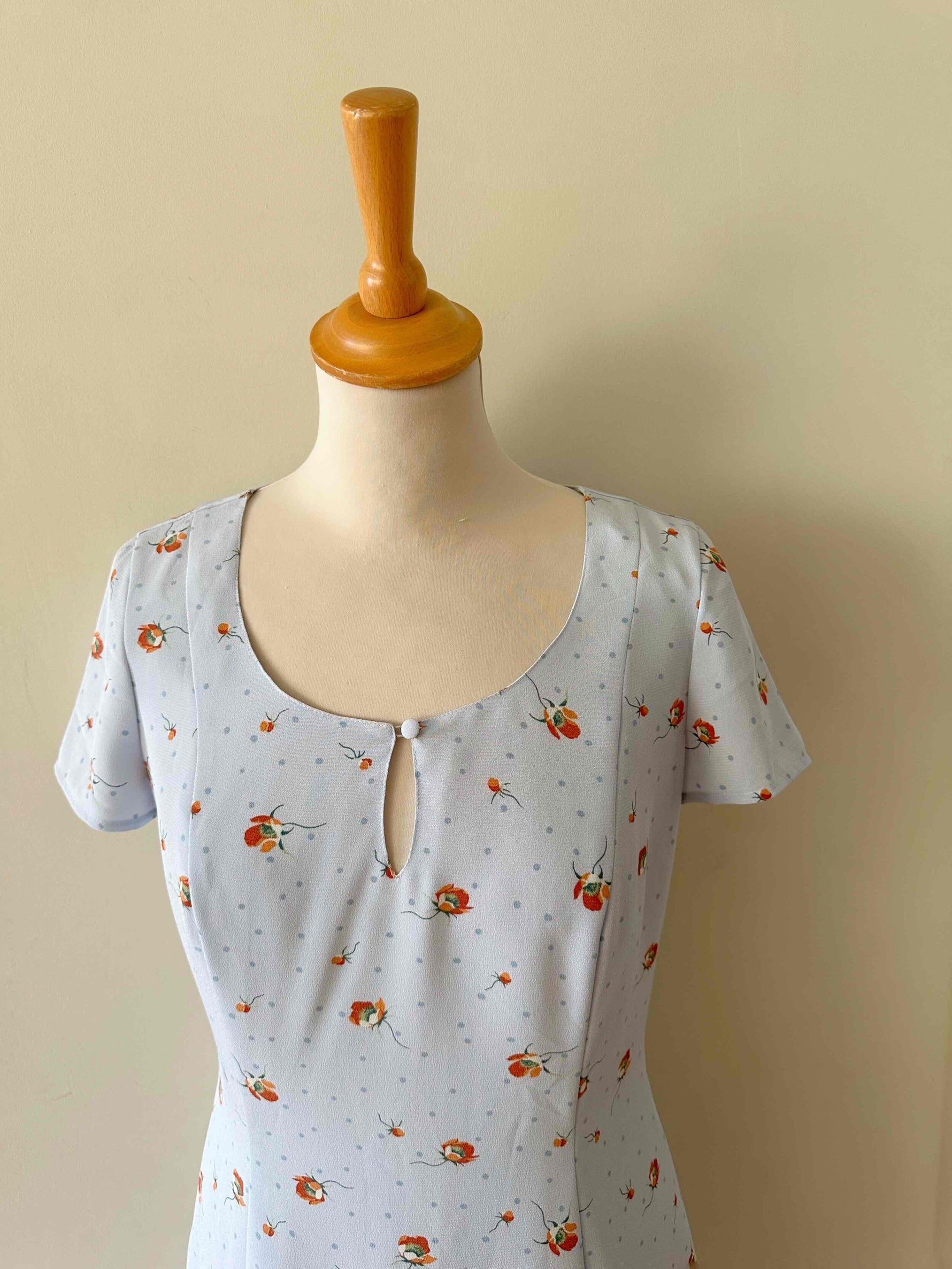 Robe Cacharel en viscose bleue ciel imprimée fleurs rouges et pois roses, encolure ronde ajourée d’un petit bouton goutte, forme fit and flare, fabriquée en France, taille 36 portée ici sur un mannequin T36, aisselles 44cm.