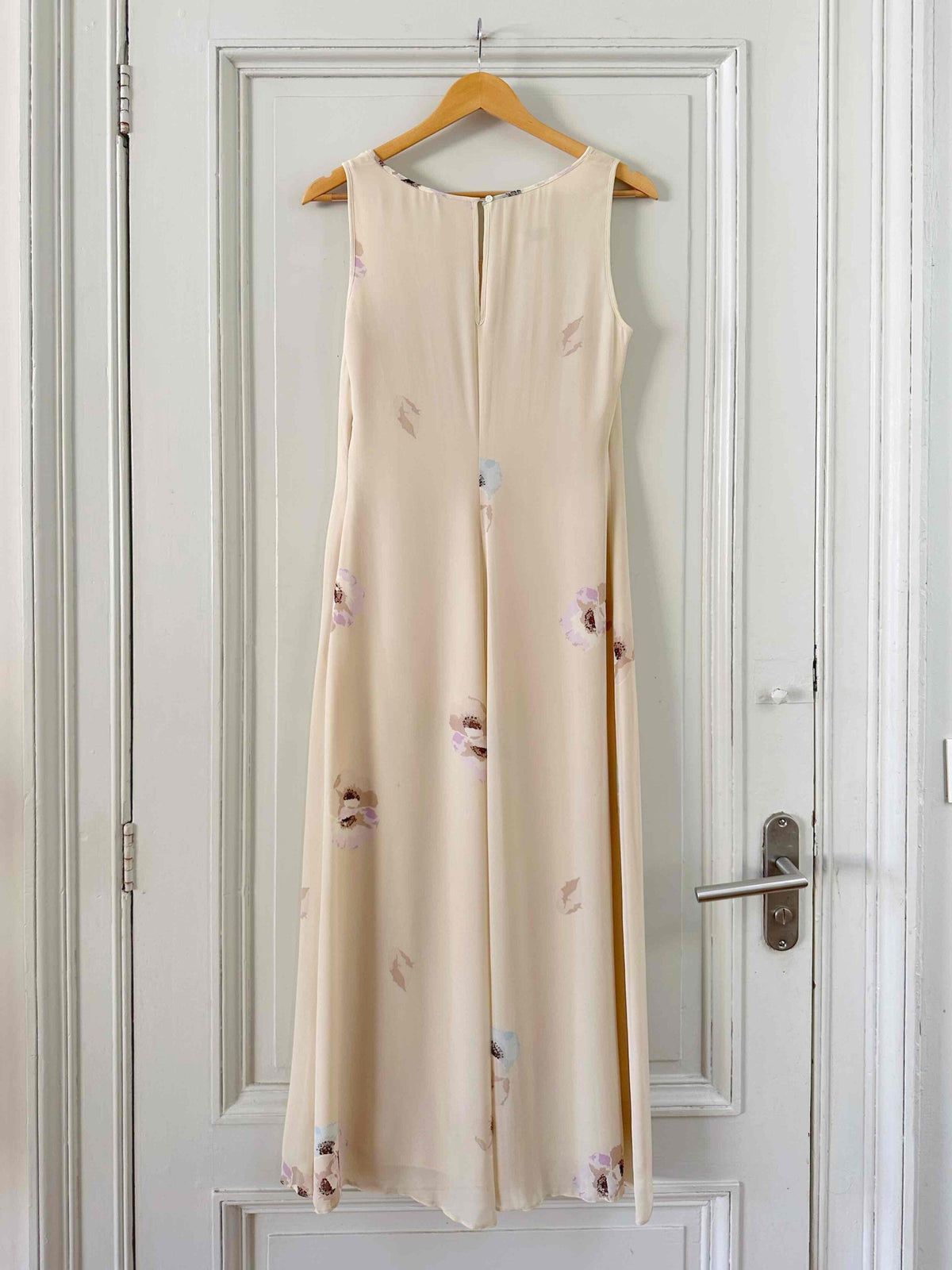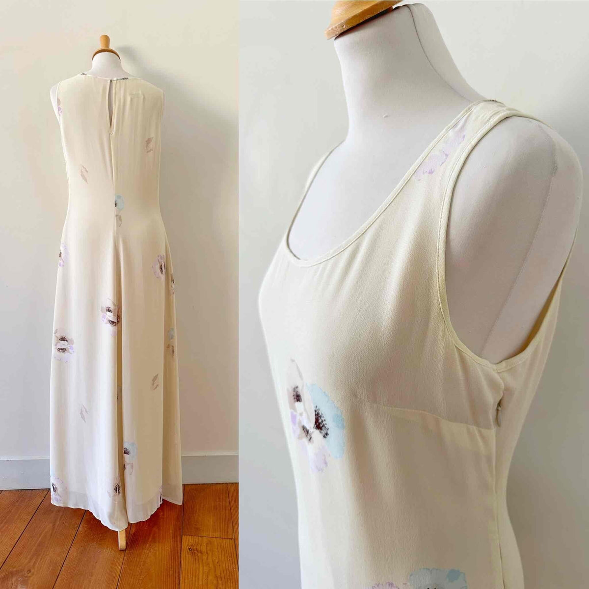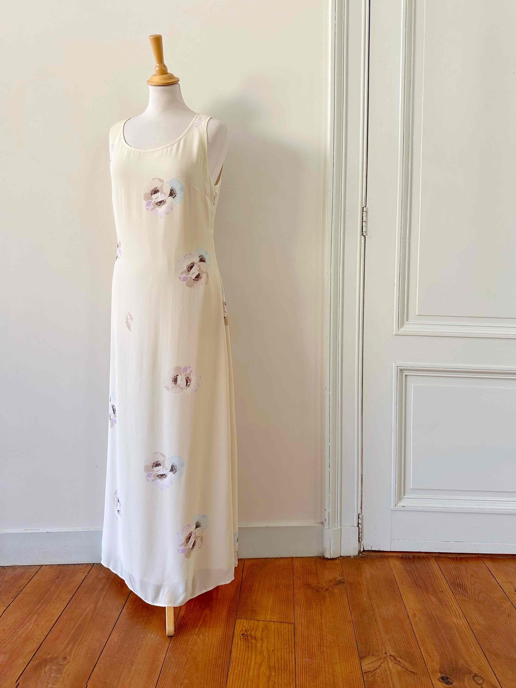 Robe longue Cacharel, en voile viscose crème, imprimée motifs coquelicots pastels lilas et bleu ciel, fermeture éclair côté, fabriquée en France, taille 38 portée ici sur un mannequin T36, aisselles 47cm.