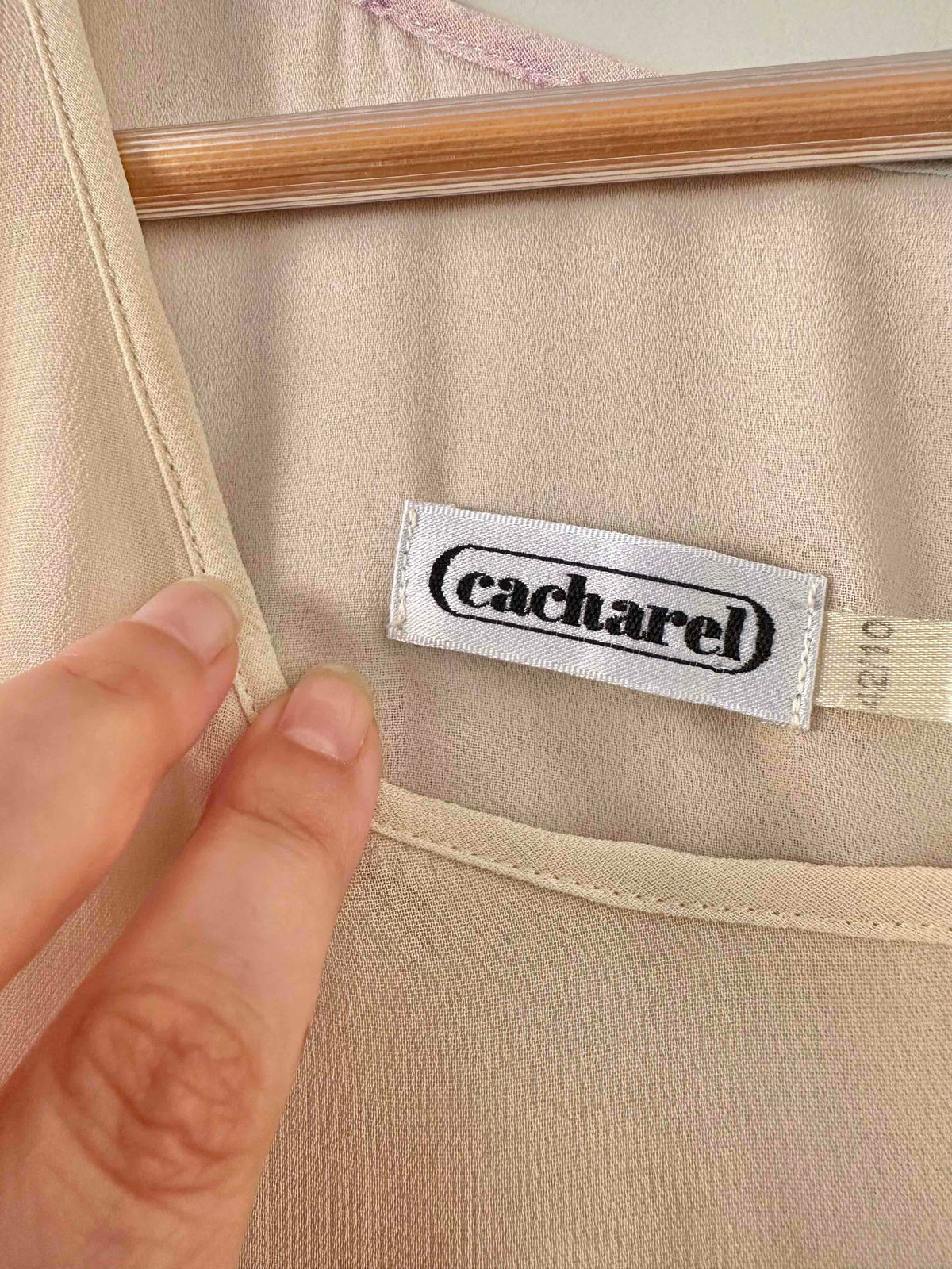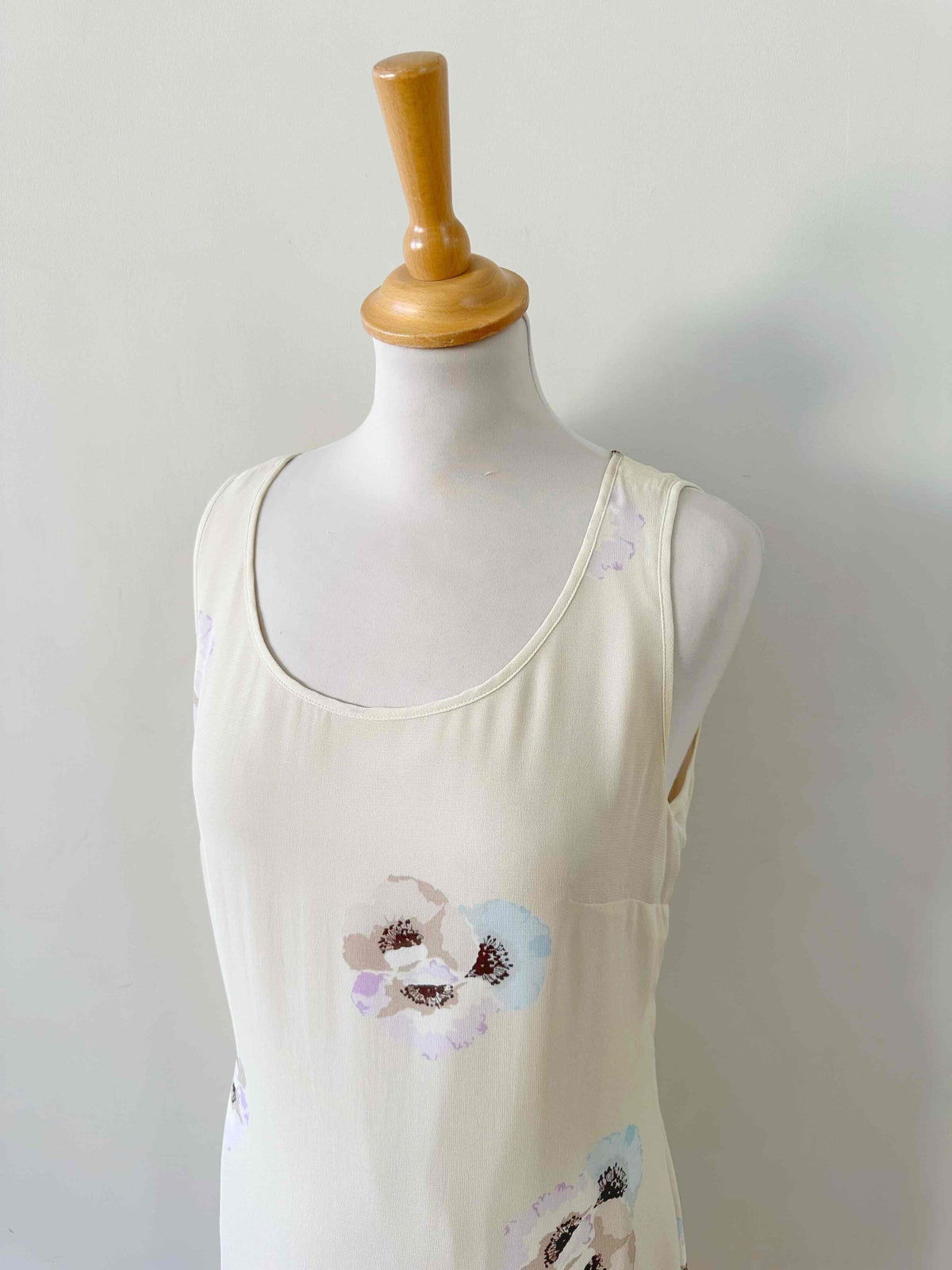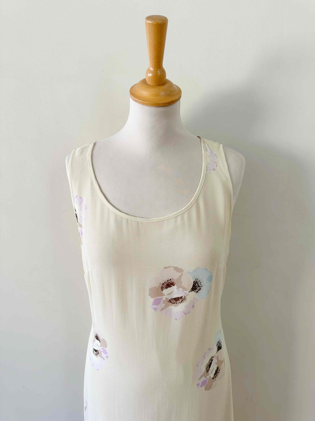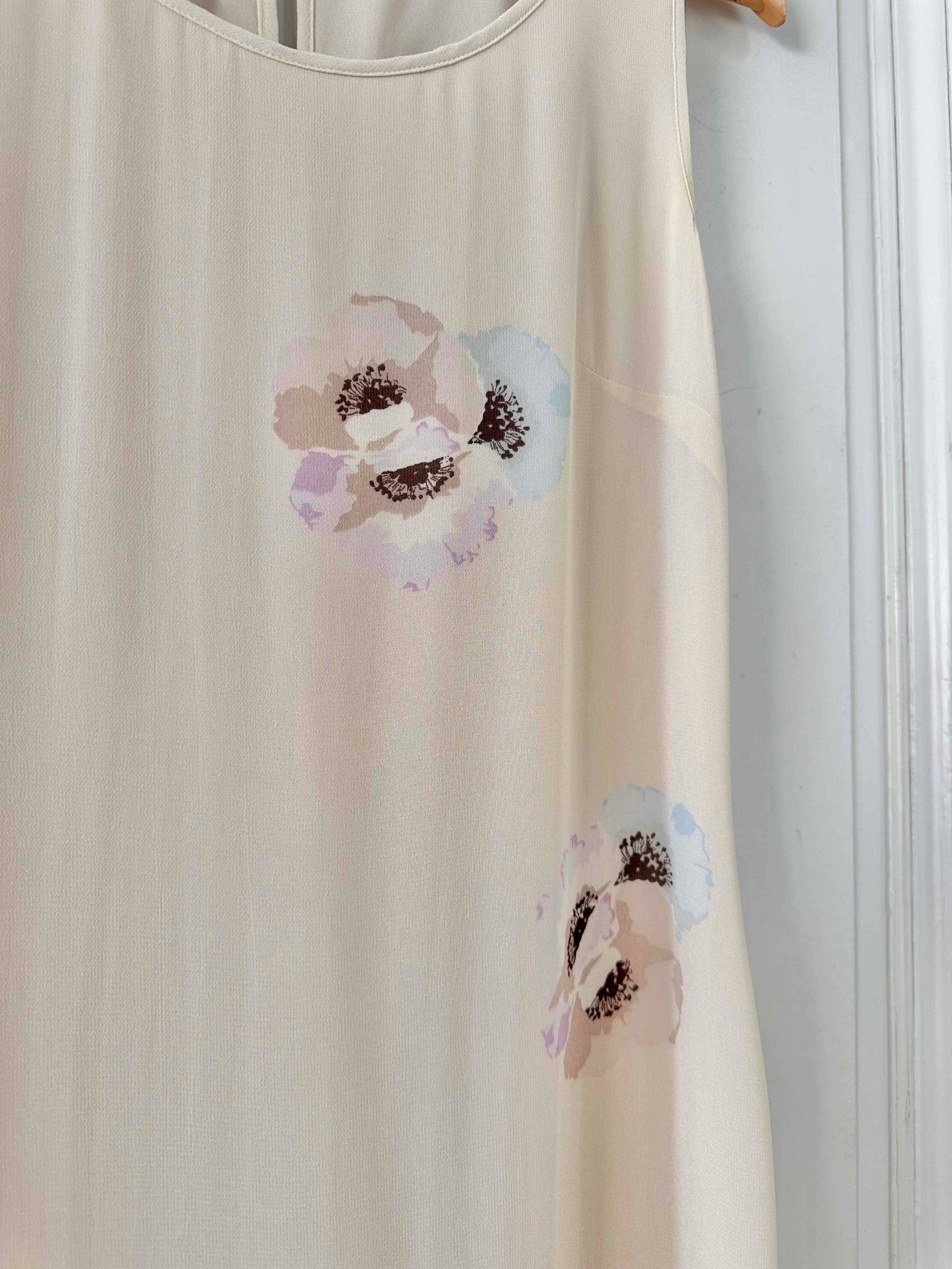 Robe longue Cacharel, en voile viscose crème, imprimée motifs coquelicots pastels lilas et bleu ciel, fermeture éclair côté, fabriquée en France, taille 38 portée ici sur un mannequin T36, aisselles 47cm.