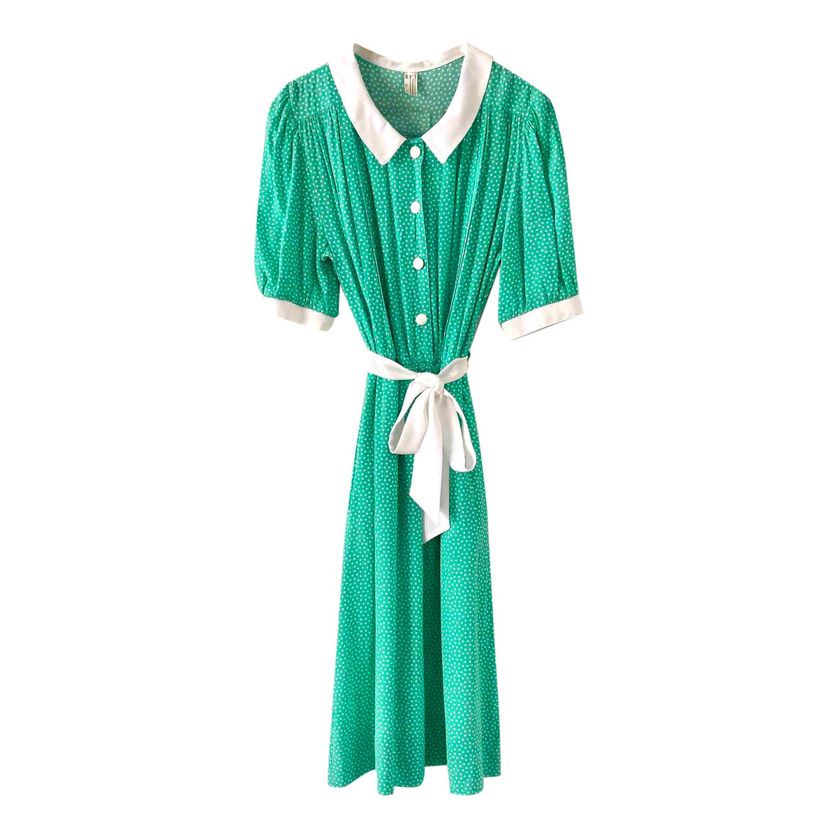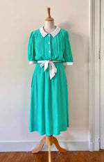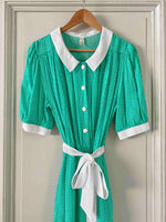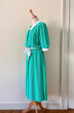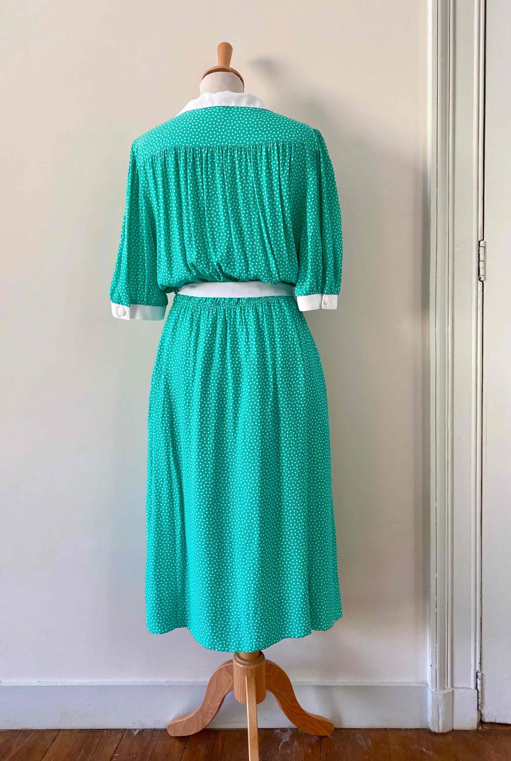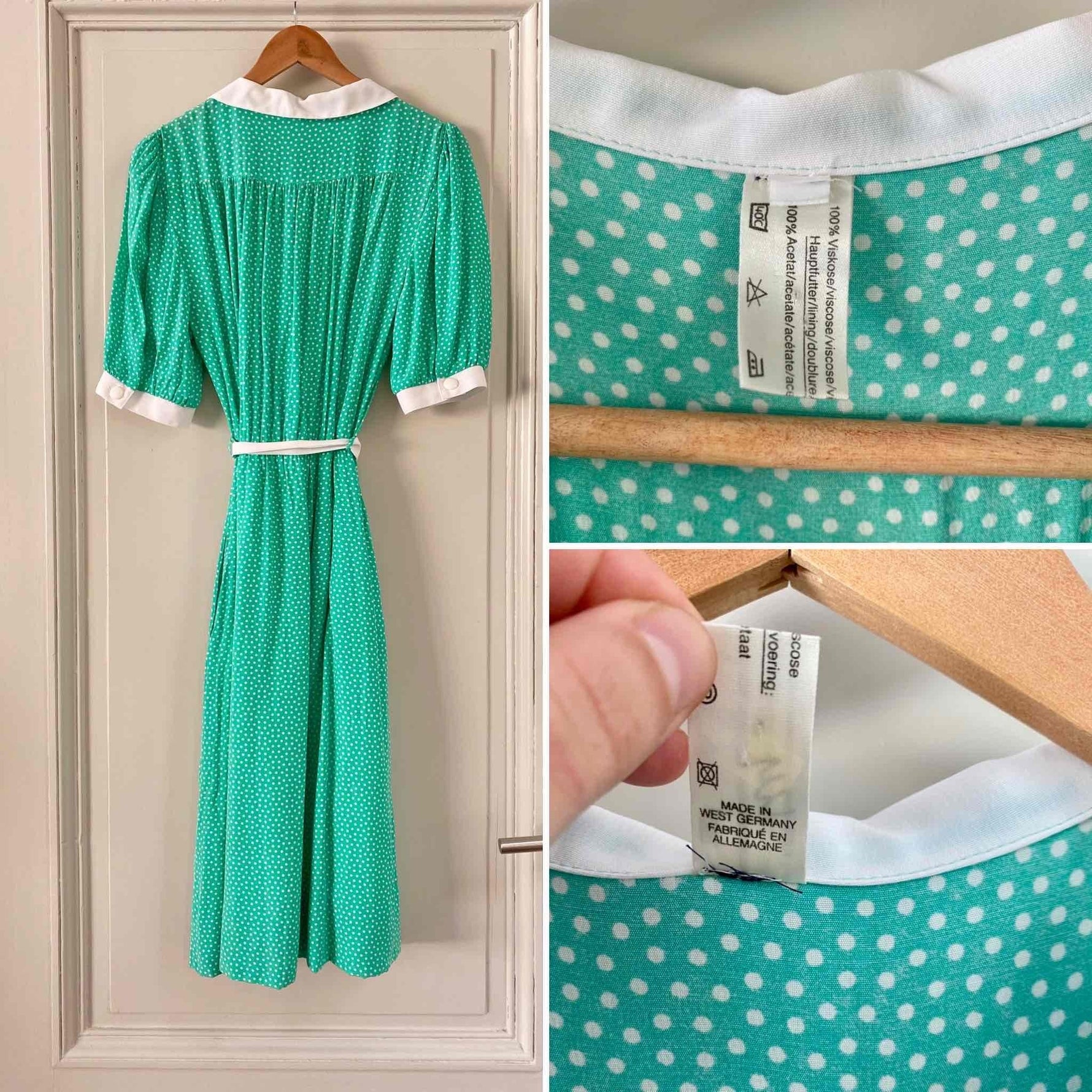 Prix unitaire parRobe Midi à pois blancs vert mentholé, col contrasté blanc, manches ballons, en viscose acétate effet soie très fluide, ceinture contrastée blanche à nouer taille, fabriquée en Allemagne. Aisselles 48cm / Taille 35cm élastique
