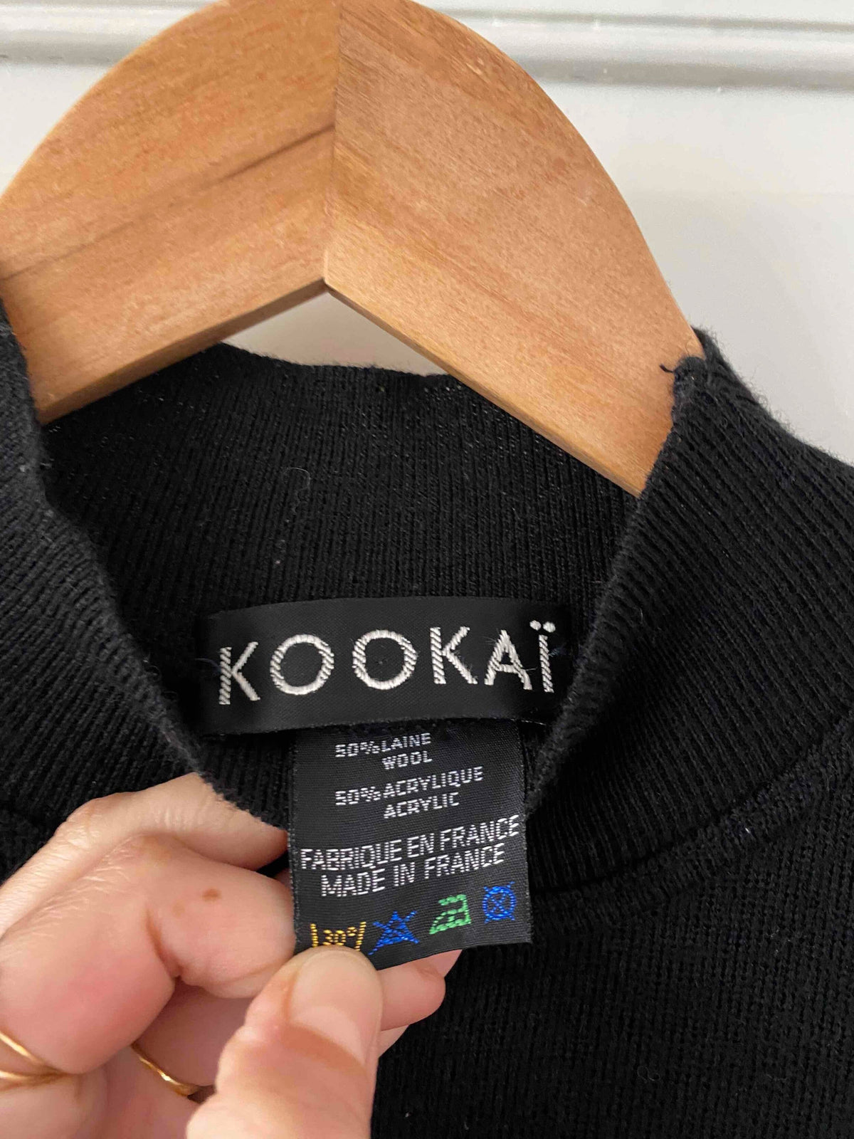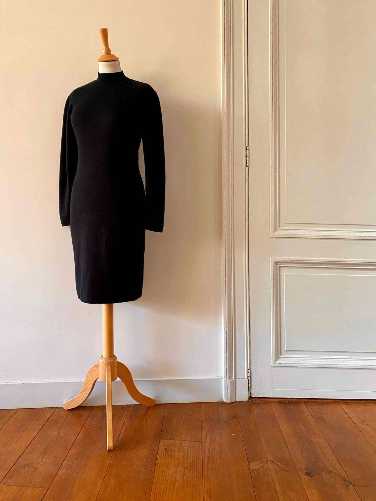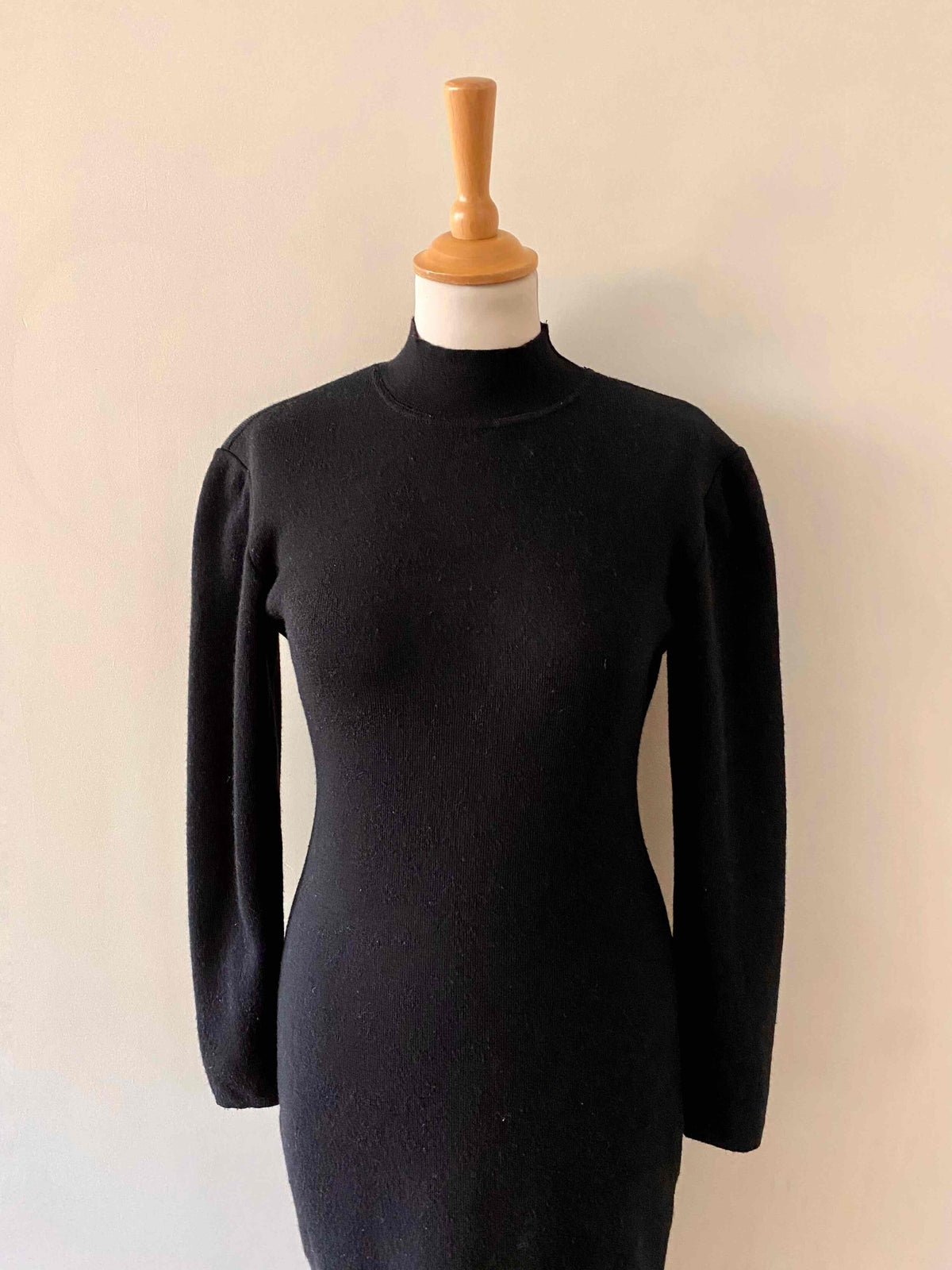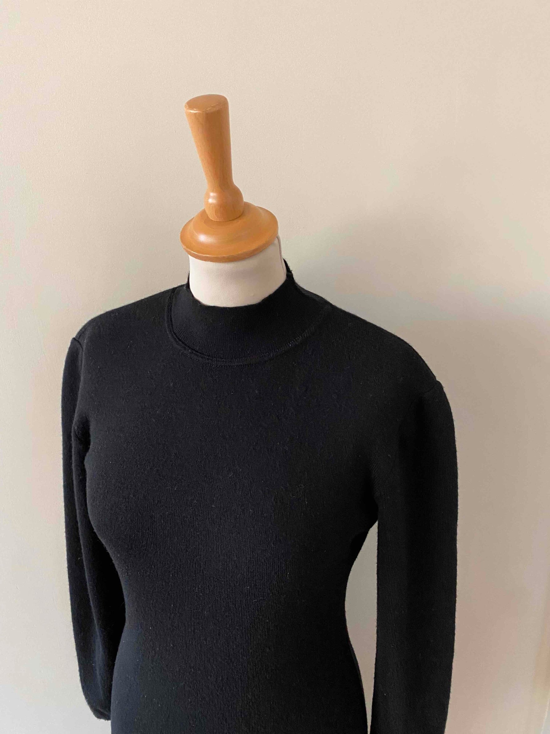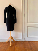 Prix unitaire parRobe col roulé en laine, laine mélangée noire, col montant, manches ballons, forme bodycon, fabriquée en France, taille 36 portée ici sur un mannequin T36.