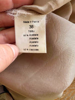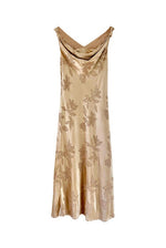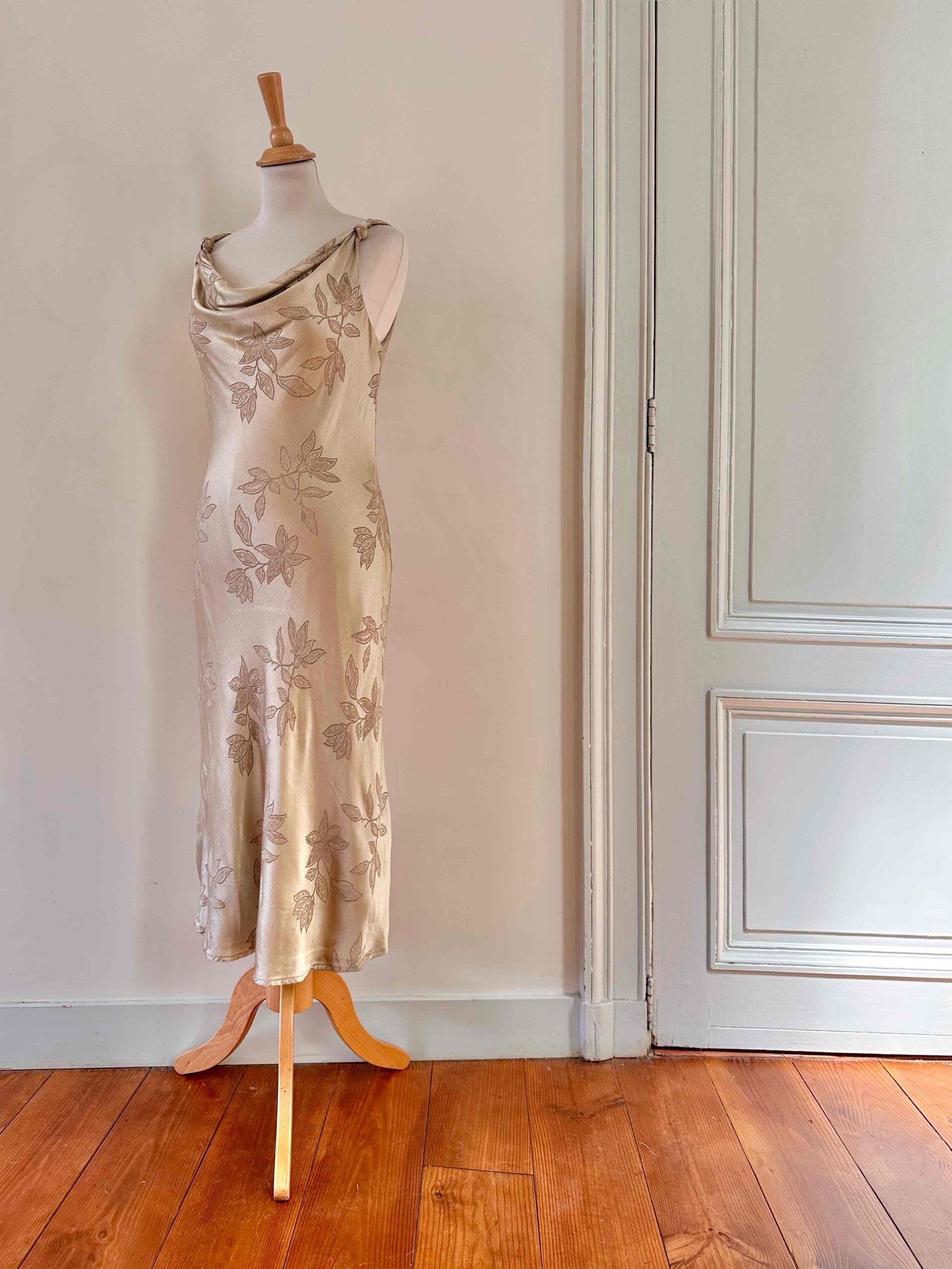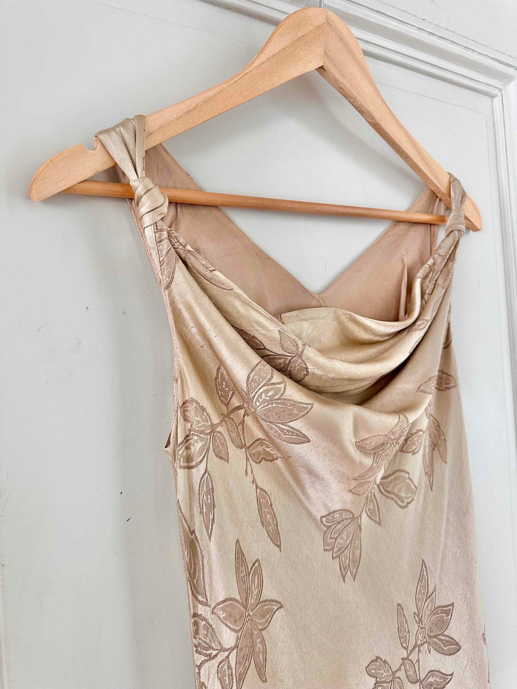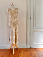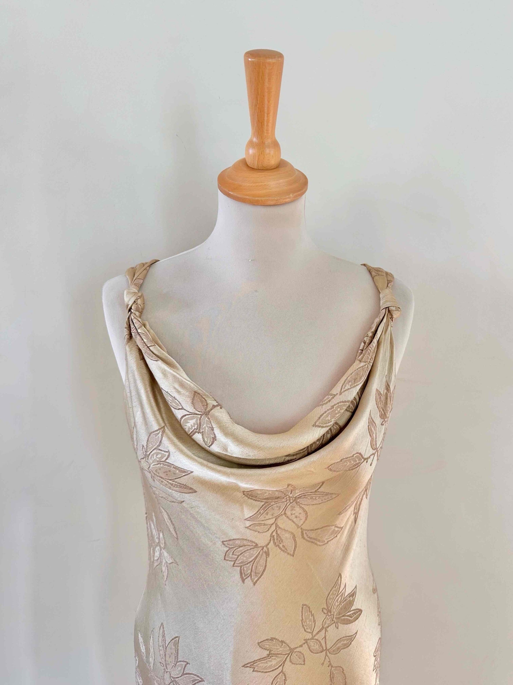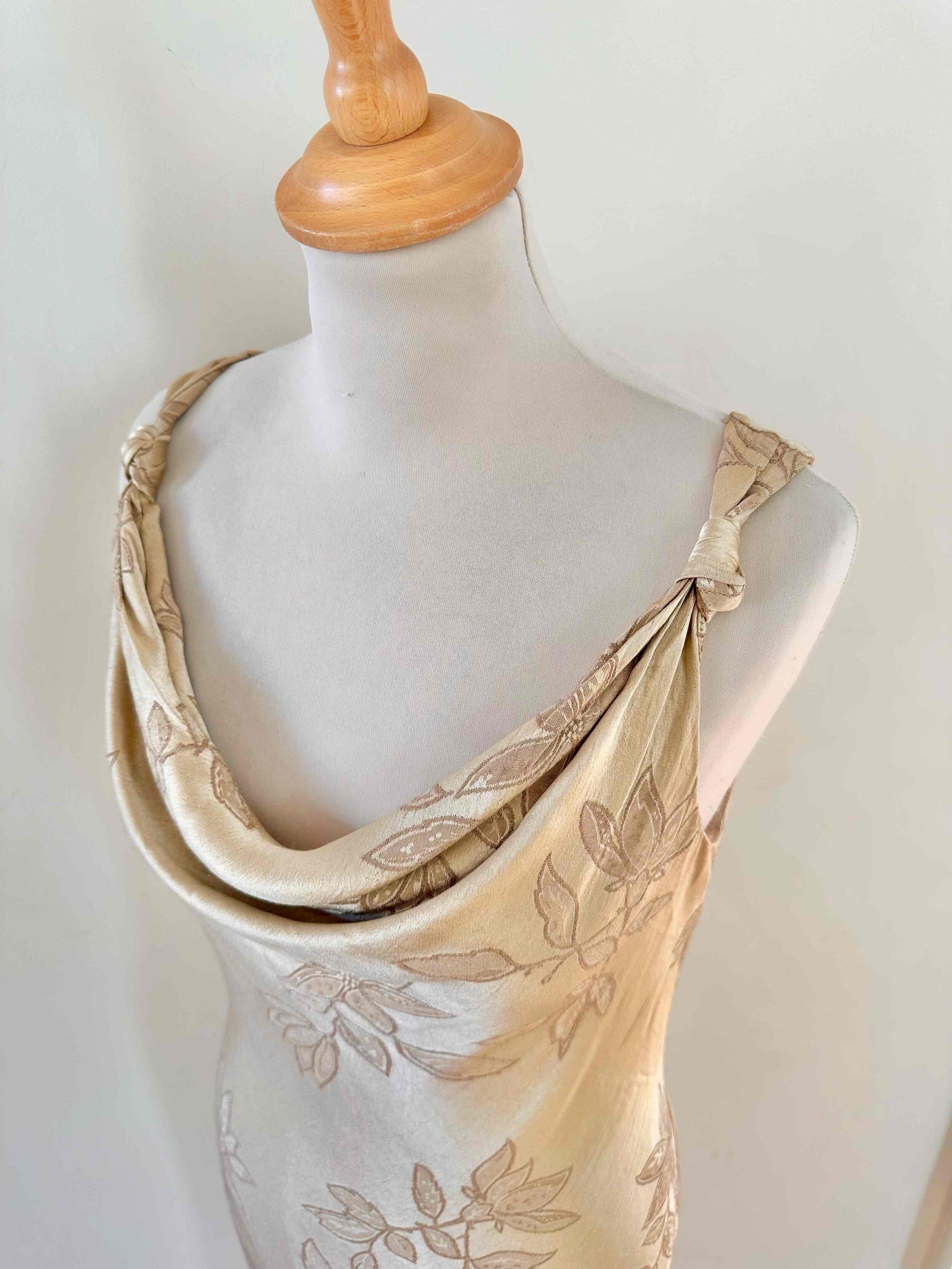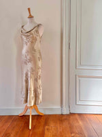 Prix unitaire parRobe midi damassée à fleurs, en satin beige doré jacquard fleuri, encolure bénitier drapée, épaules nouées, forme fit and flare en biais, fabriquée en France, taille 36, portée ici sur un mannequin T36, aisselles