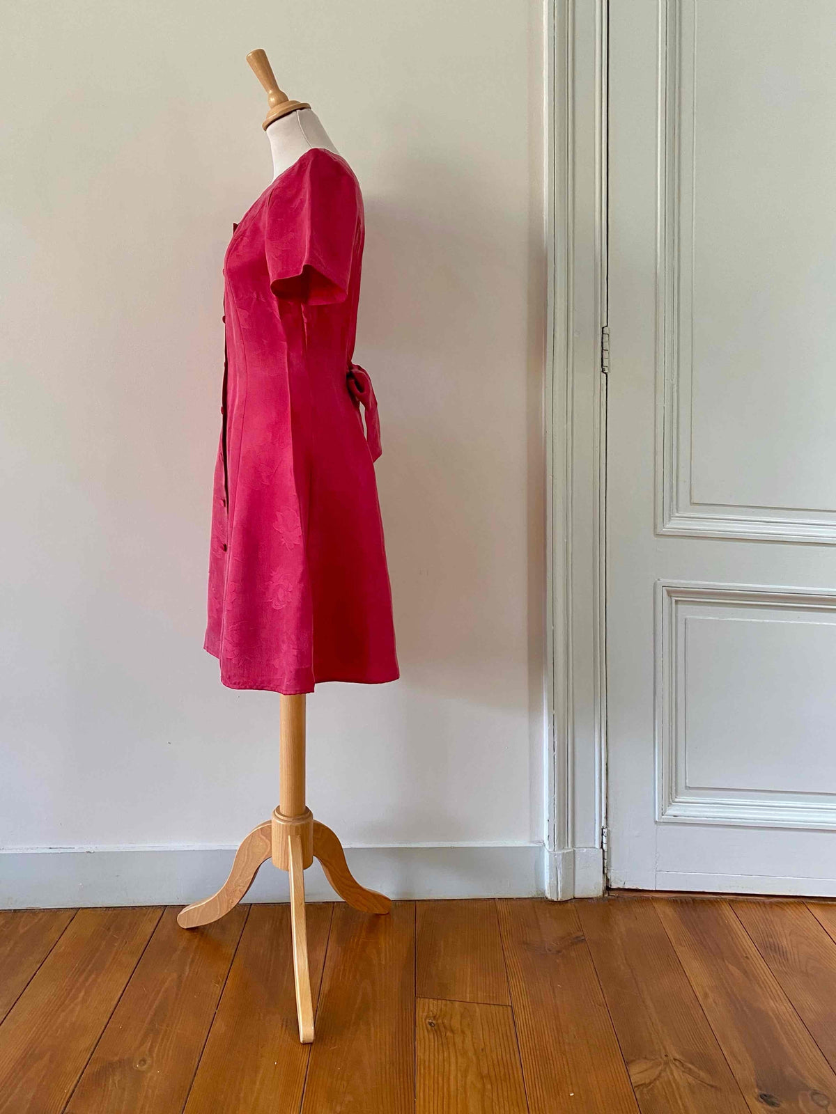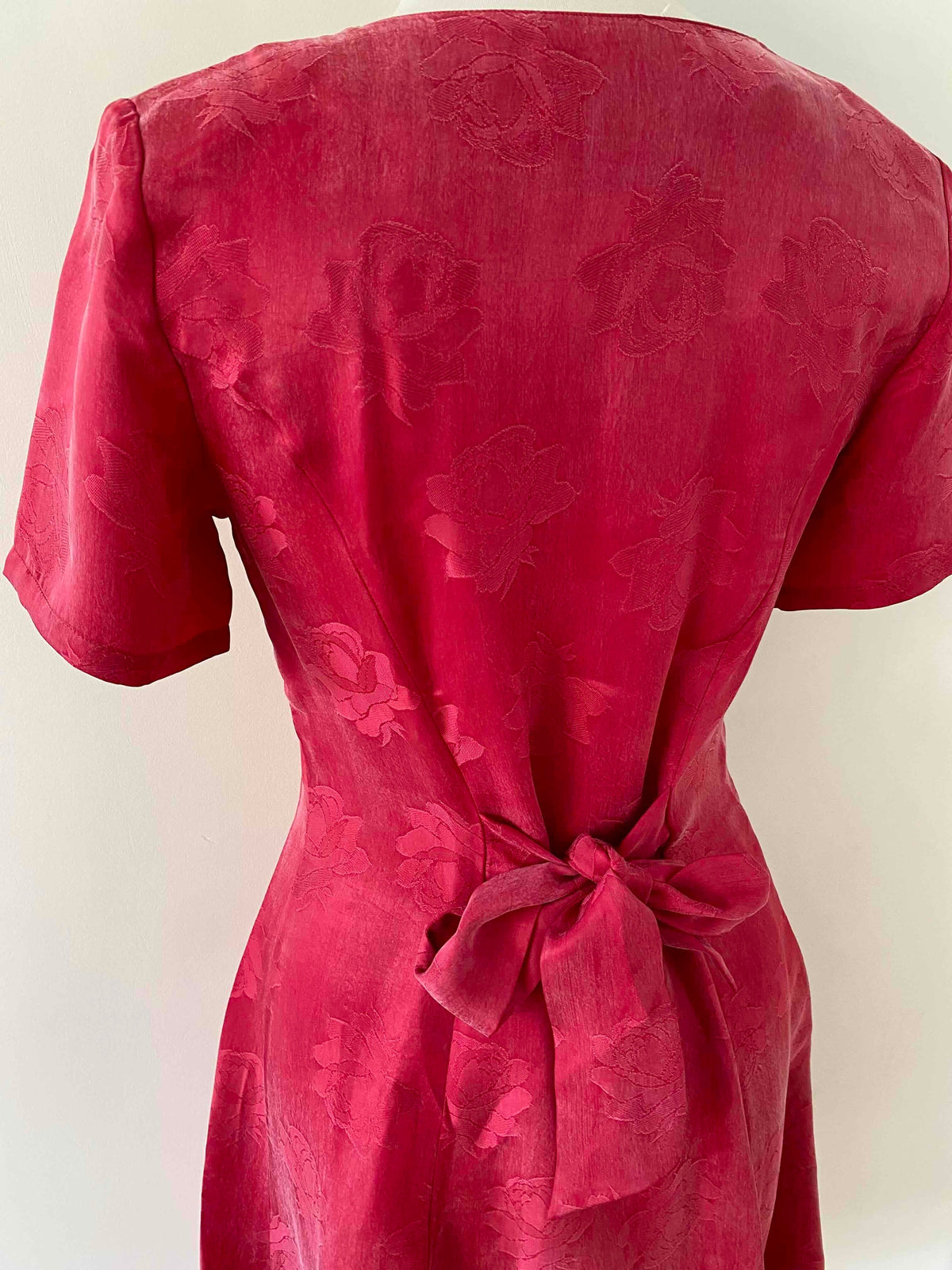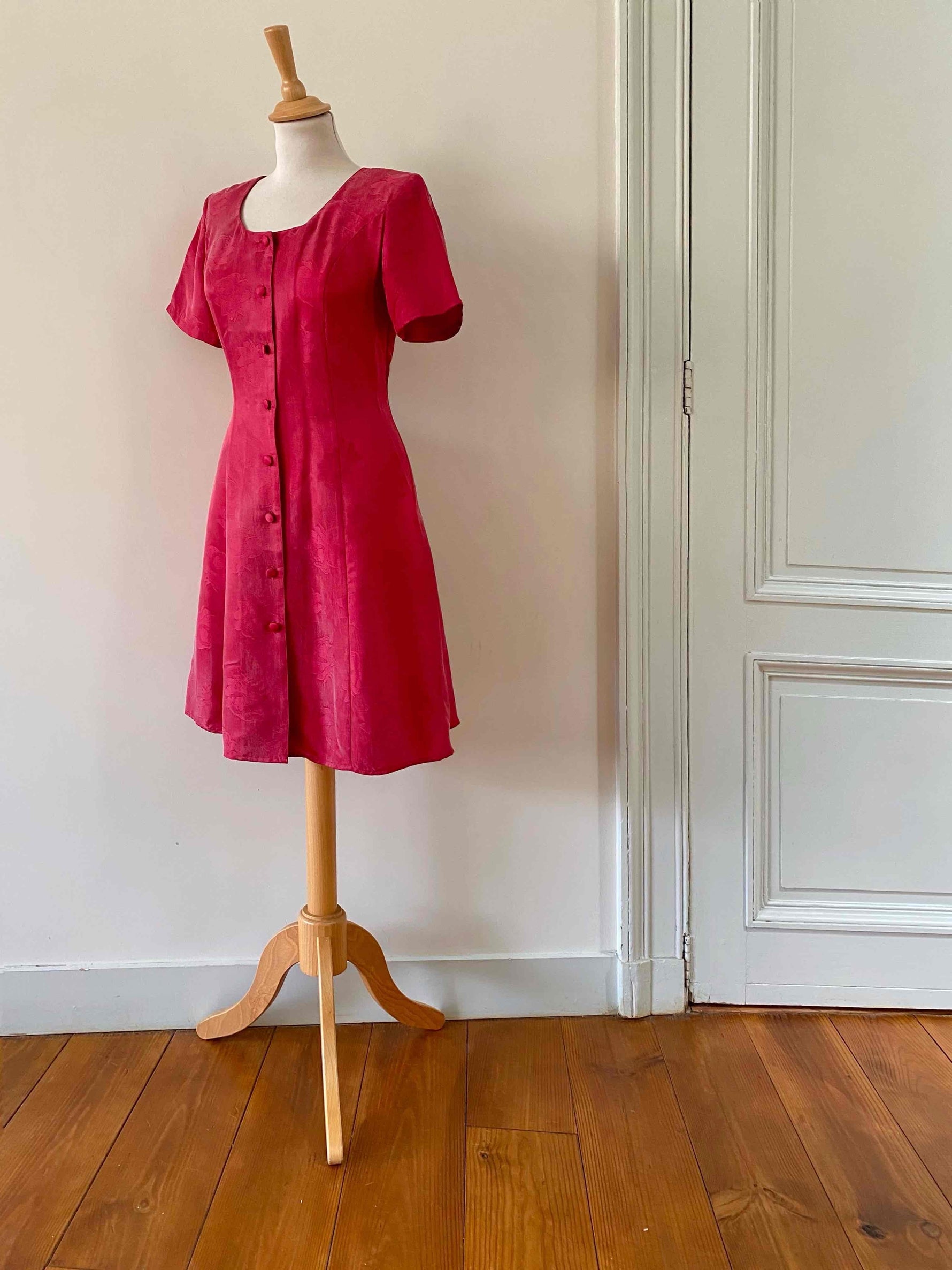 Prix unitaire parRobe damassée à fleurs, en cupro satiné rouge framboise jacquard damassé fleuri, boutons recouverts, taille dos à nouer, forme fit and flare, fabriquée en France, taille 34 et 36 portée ici sur un mannequin T36, aisselles 43cm.