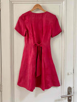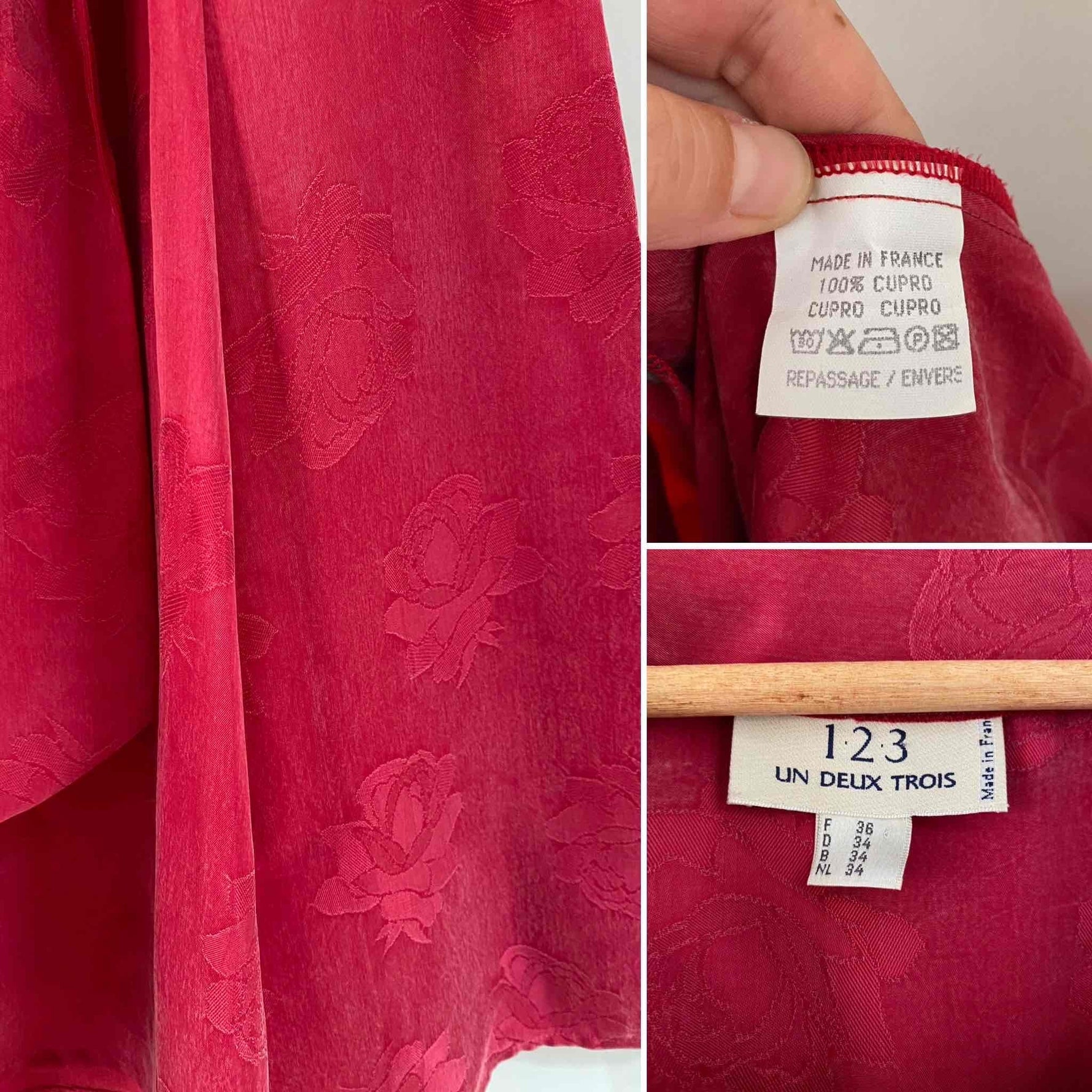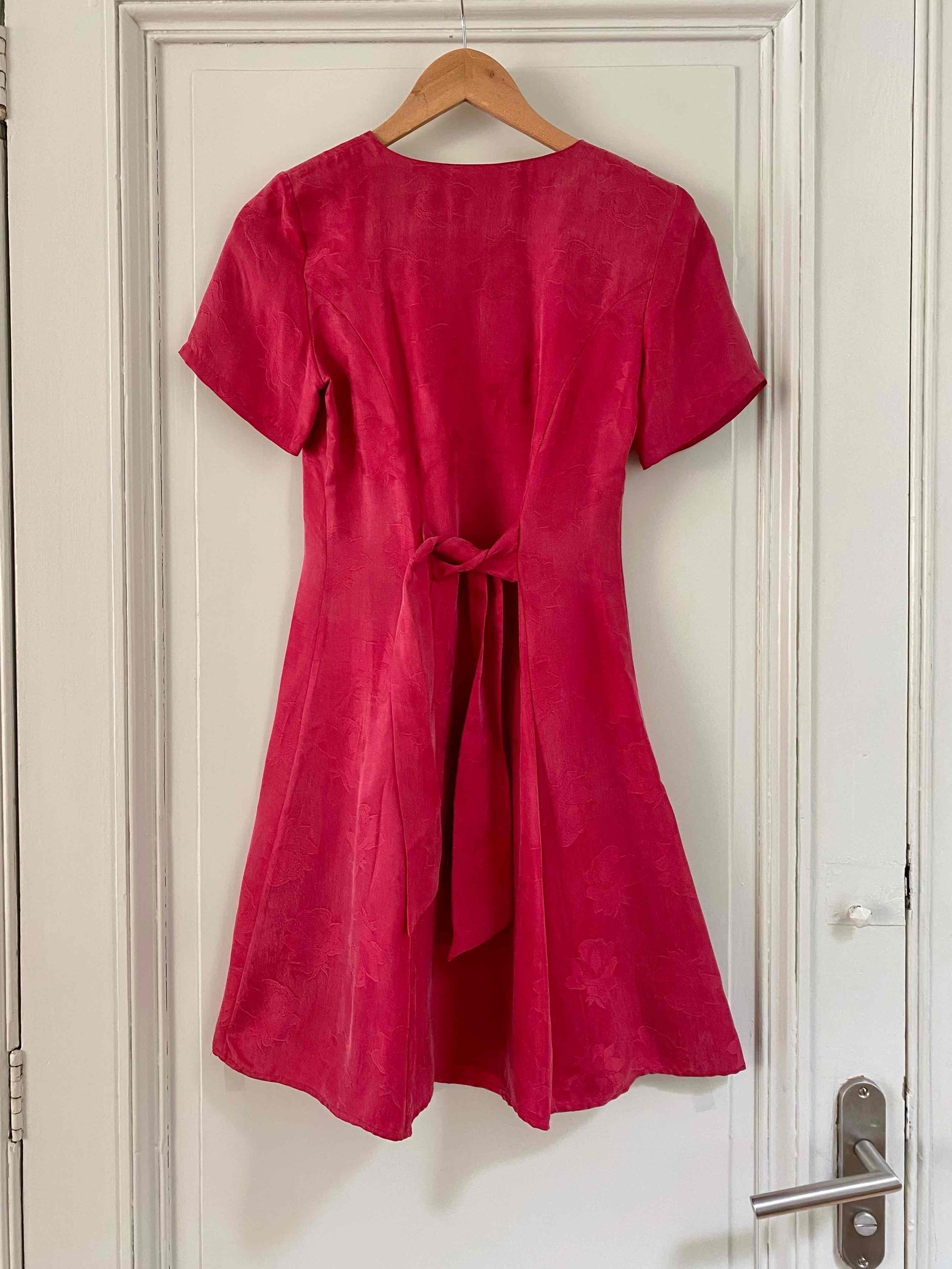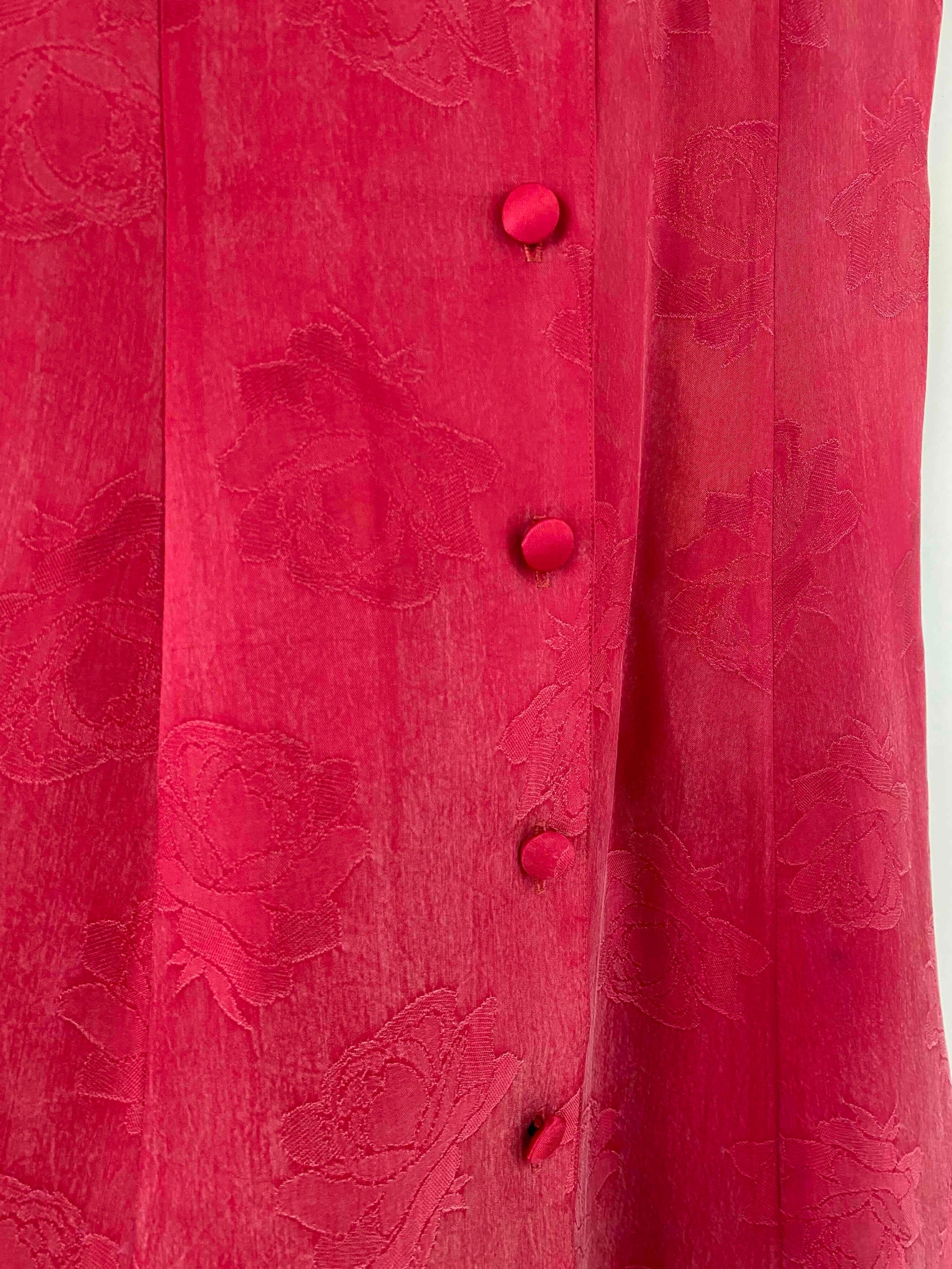 Prix unitaire parRobe damassée à fleurs, en cupro satiné rouge framboise jacquard damassé fleuri, boutons recouverts, taille dos à nouer, forme fit and flare, fabriquée en France, taille 34 et 36 portée ici sur un mannequin T36, aisselles 43cm.