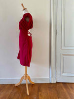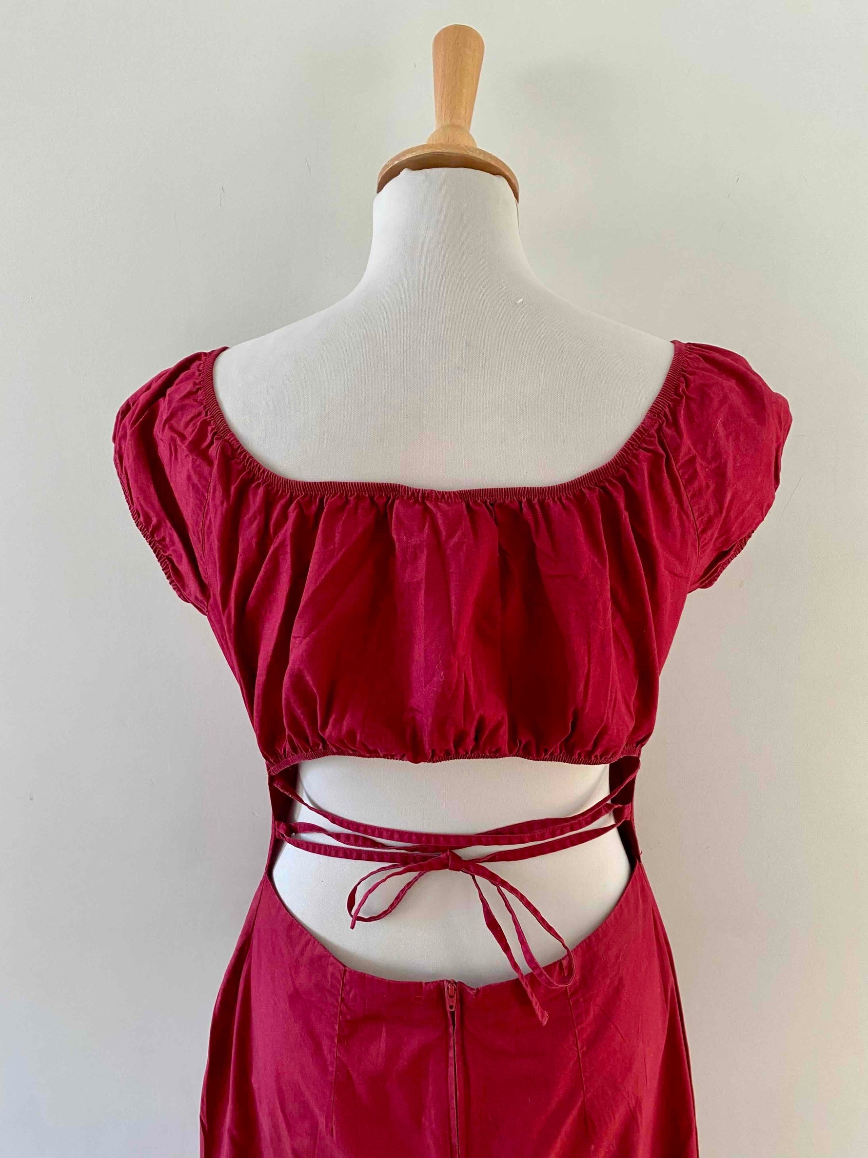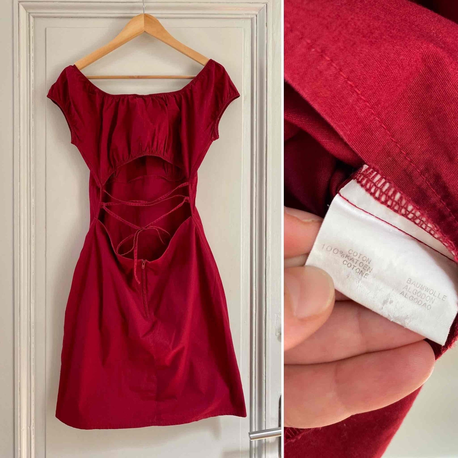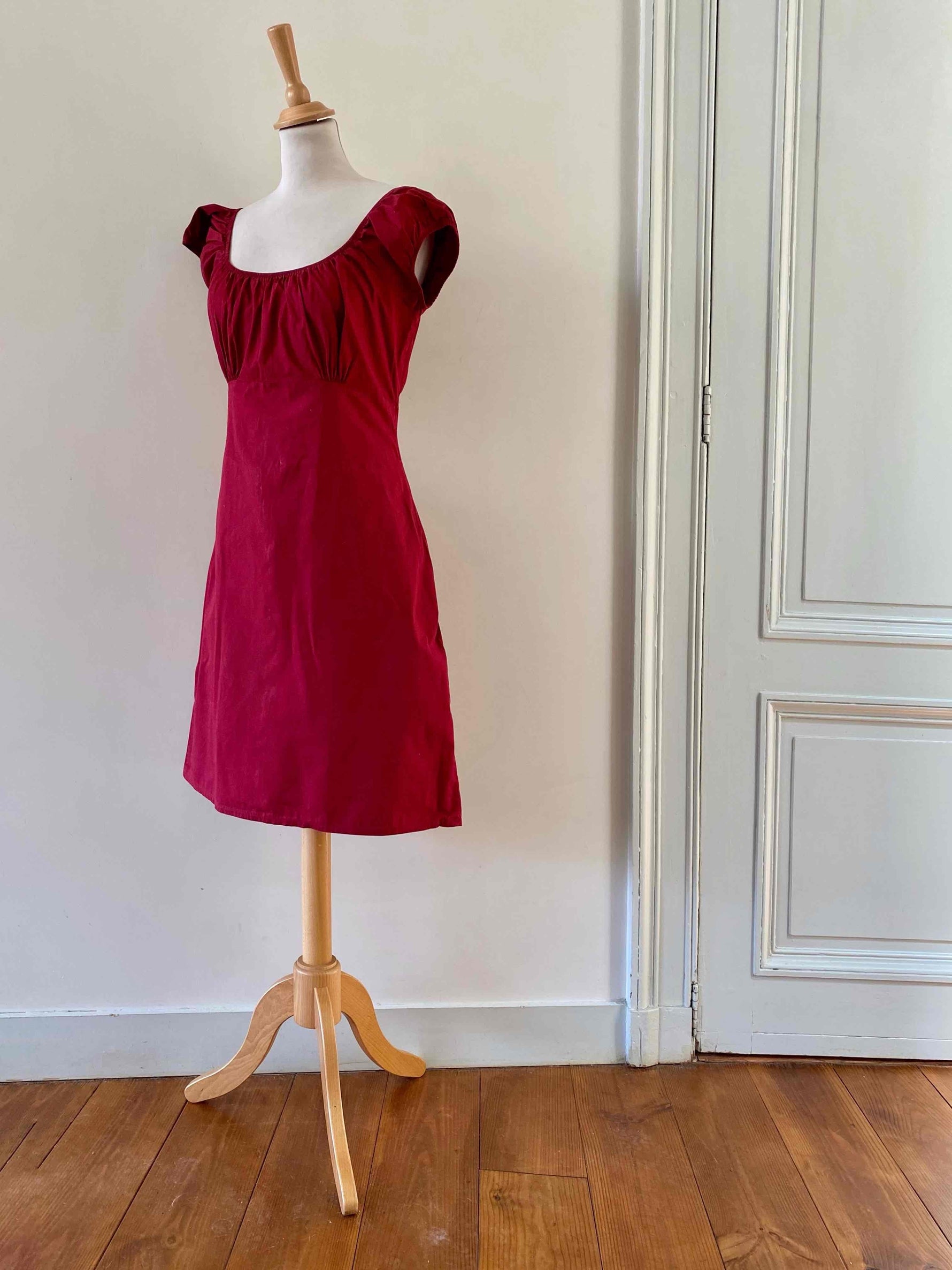 Prix unitaire parRobe dos nu lacée, en coton et élasthanne rouge griotte, manches ballons poitrine froncée à porter open-shoulder, dos nu ajouré à lacets, fermeture éclaire, années 90's, taille 38portée ici serrée sur un mannequin T36, aisselles 45cm, hanches 47cm.