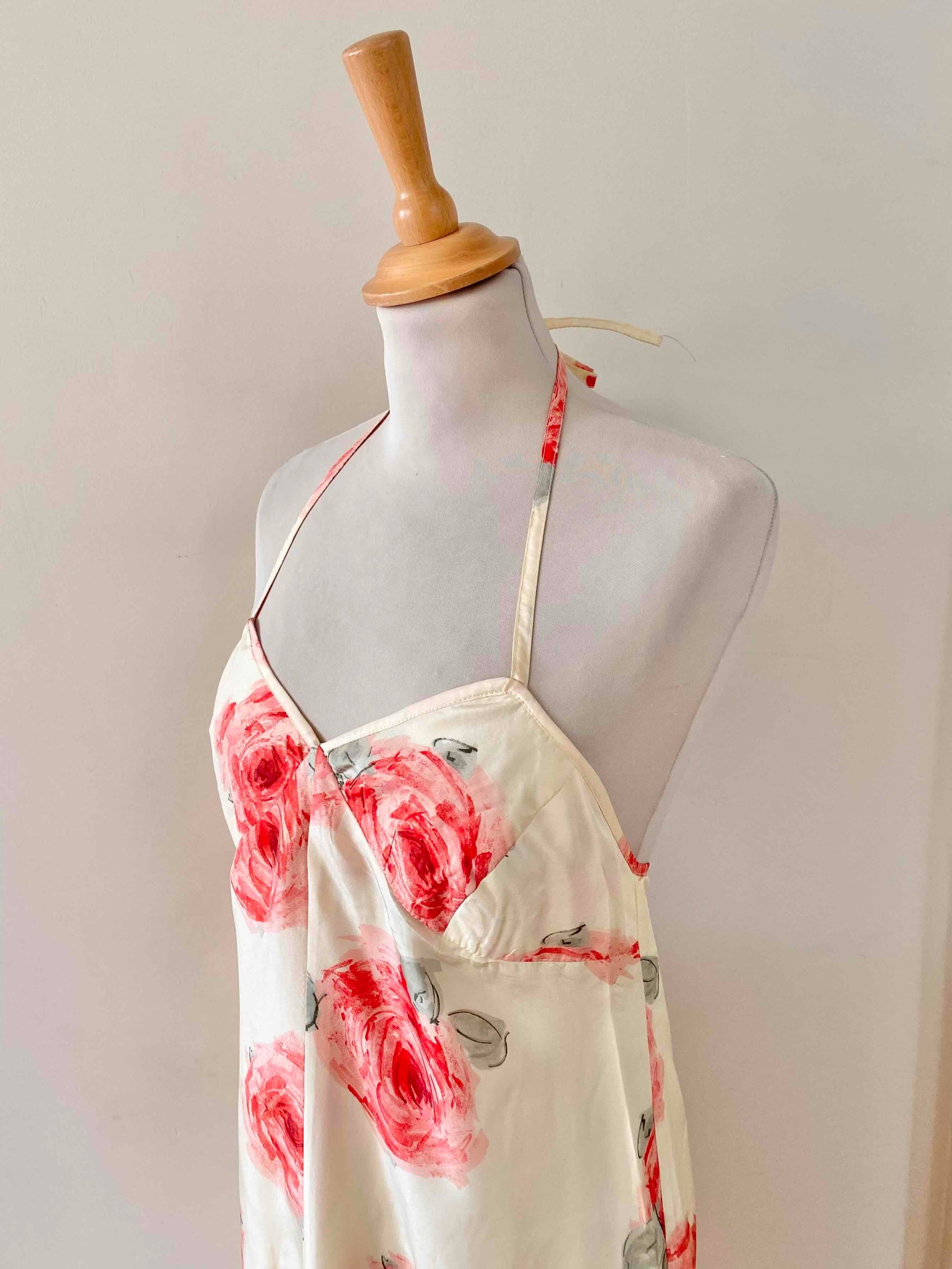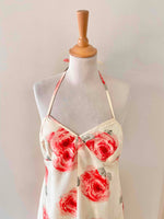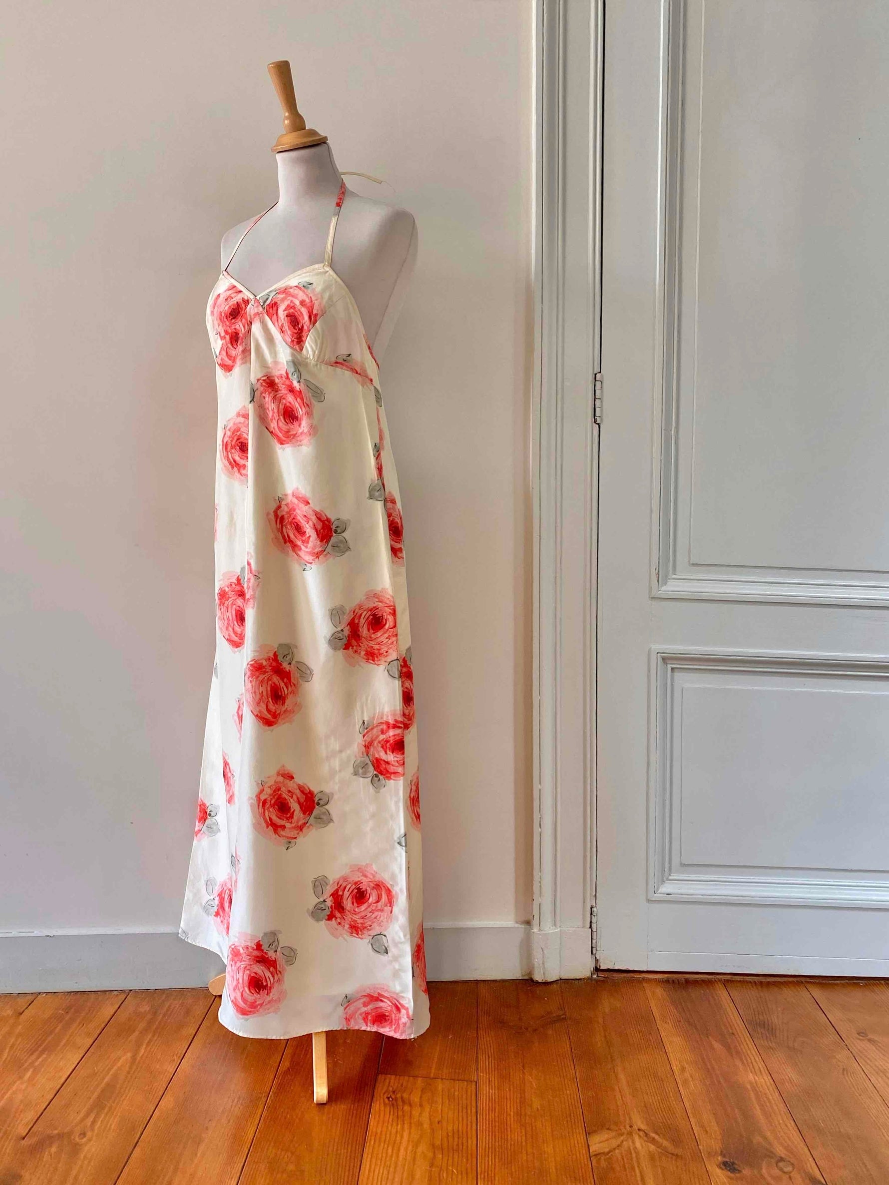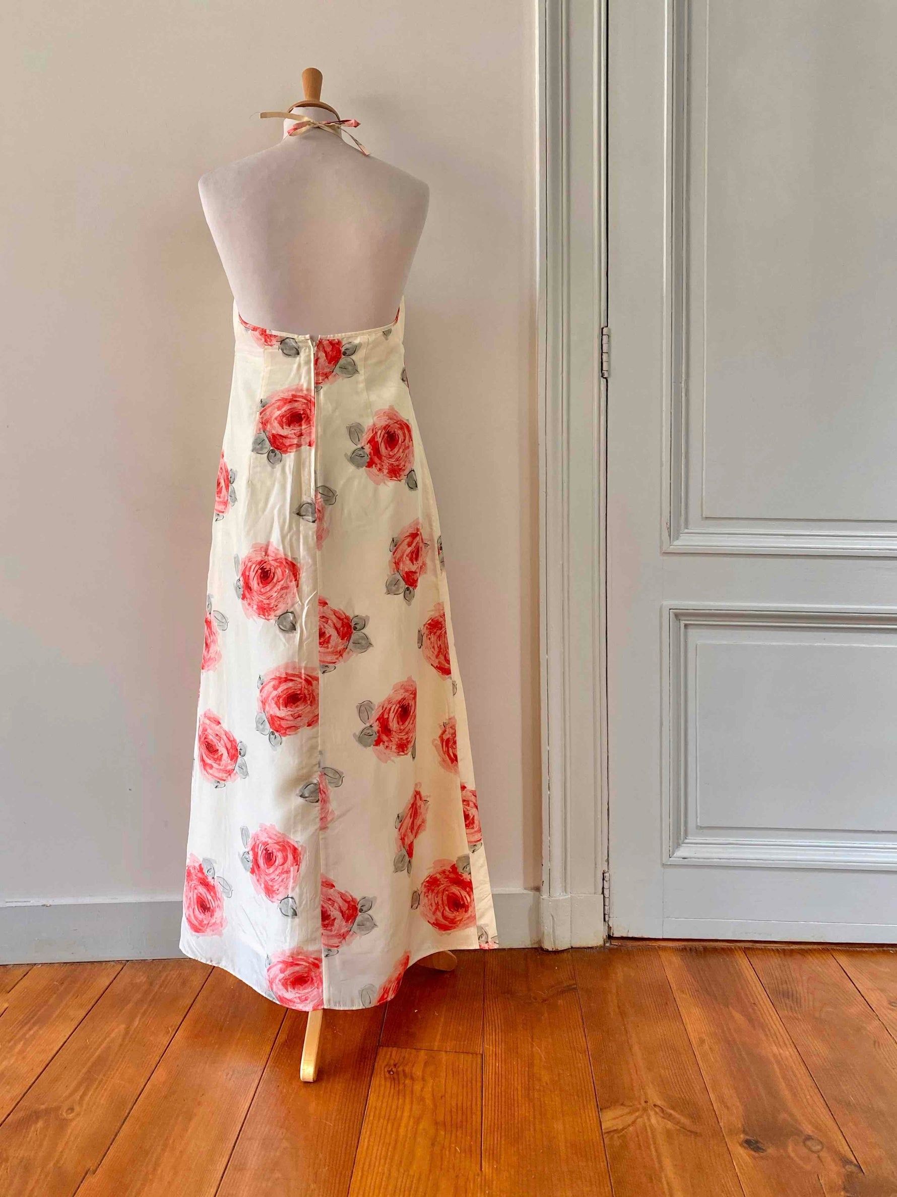 Prix unitaire parRobe dos nu en soie écrue ivoire imprimée grandes fleurs roses, et vertes, poitrine triangle à nouer dans le dos, longueur maxi, fabriquée en Italie, taille 36 portée ici sur un mannequin T36, aisselles 43cm.