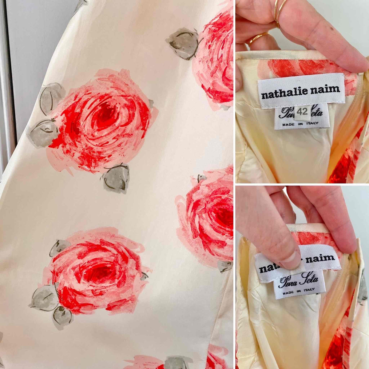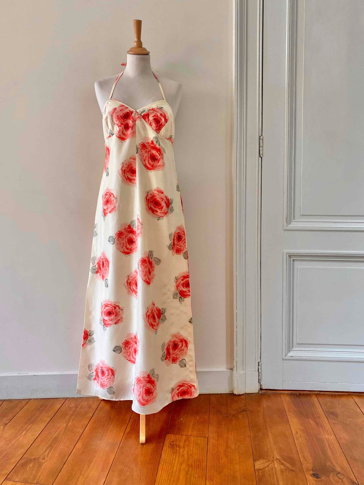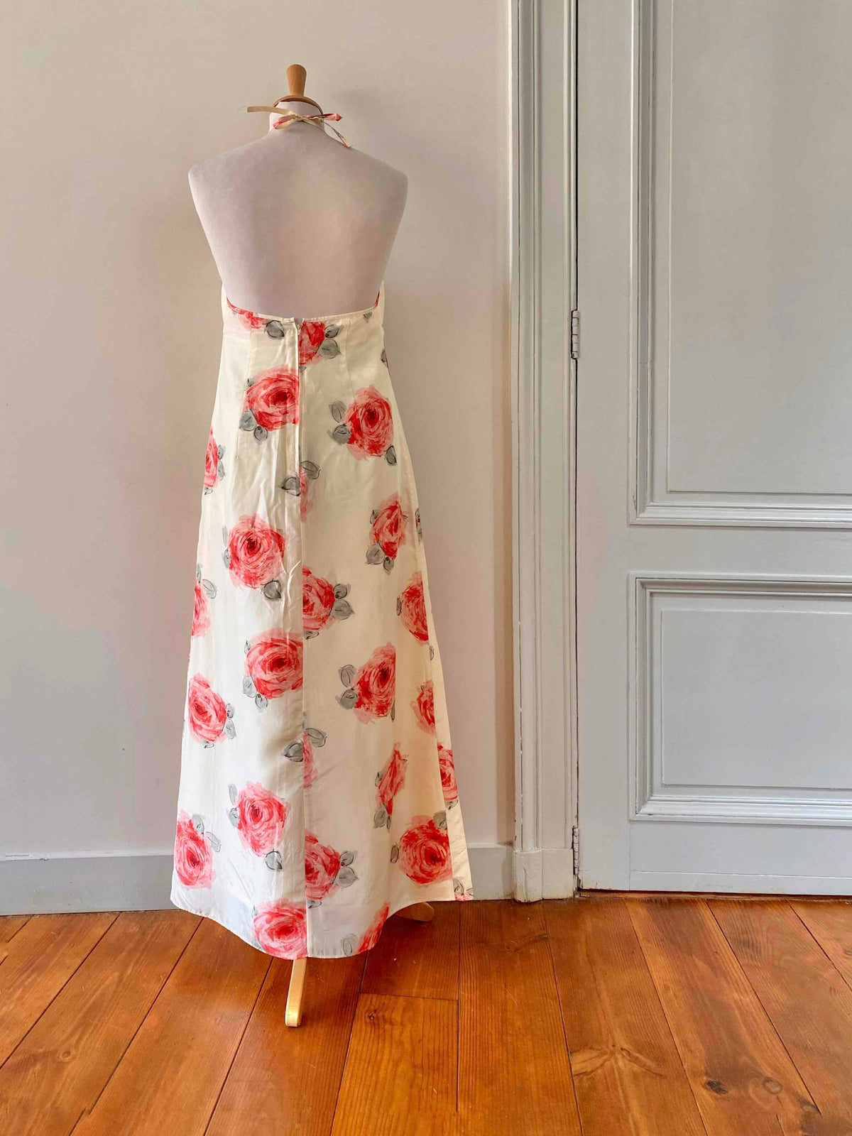 Prix unitaire parRobe dos nu en soie écrue ivoire imprimée grandes fleurs roses, et vertes, poitrine triangle à nouer dans le dos, longueur maxi, fabriquée en Italie, taille 36 portée ici sur un mannequin T36, aisselles 43cm.