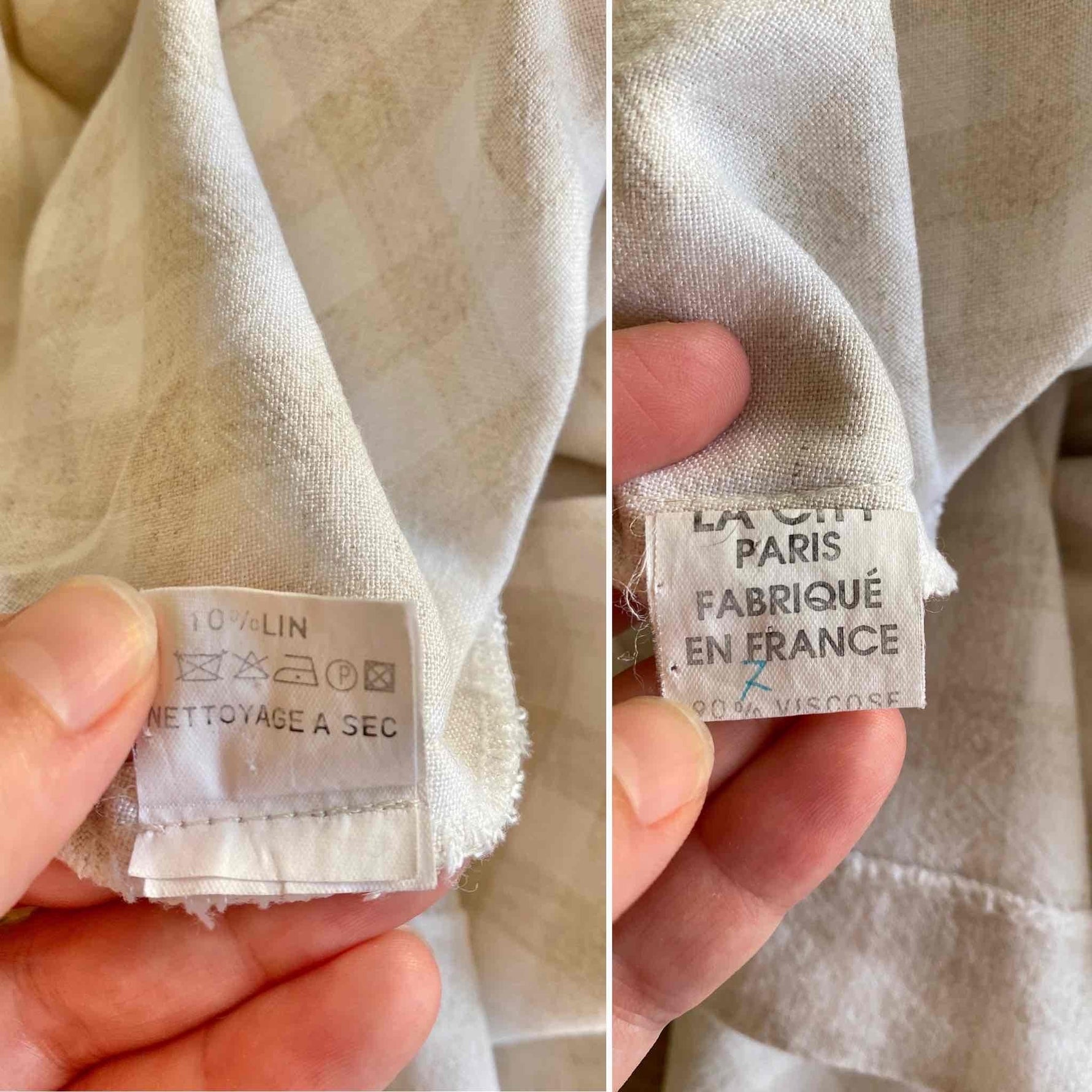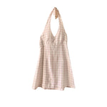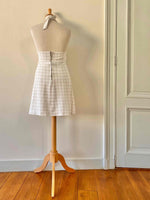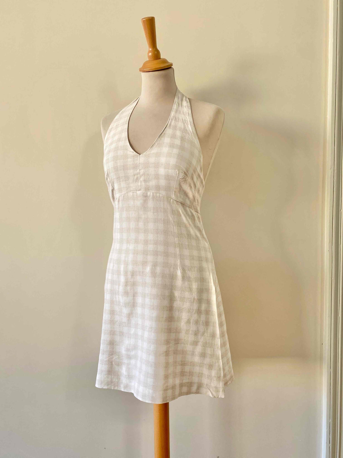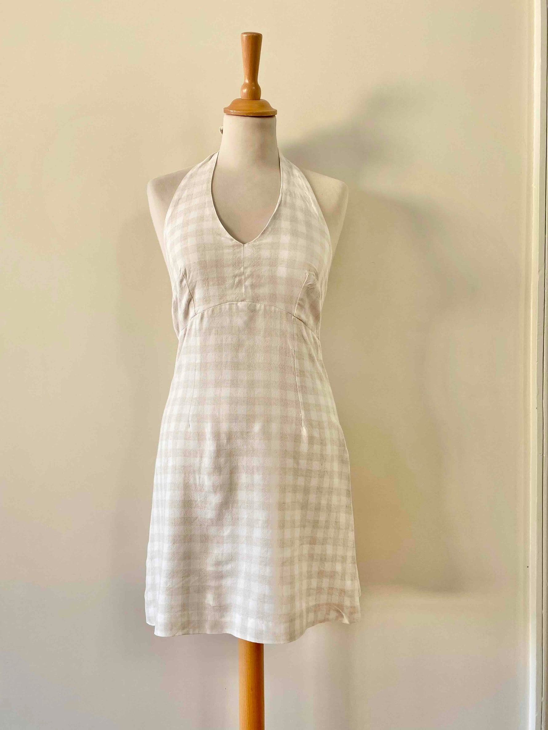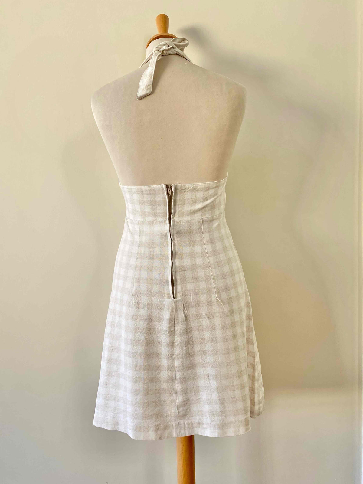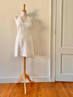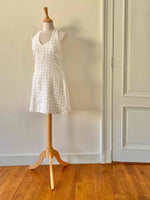Prix unitaire parRobe dos nu vichy en lin et viscose blanche à carreaux vichy beige et blancs, dos nu à nouer, fabriquée en France, taille 34 portée ici sur un mannequin T36, aisselles 42cm.