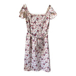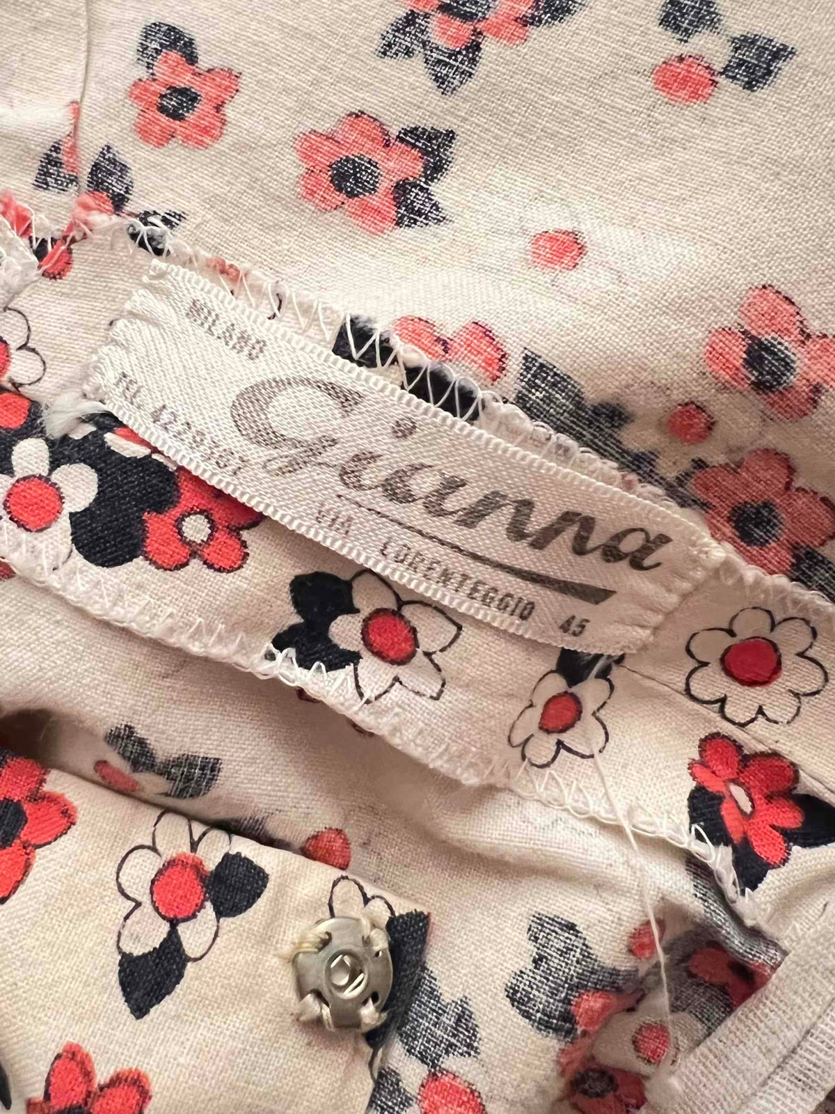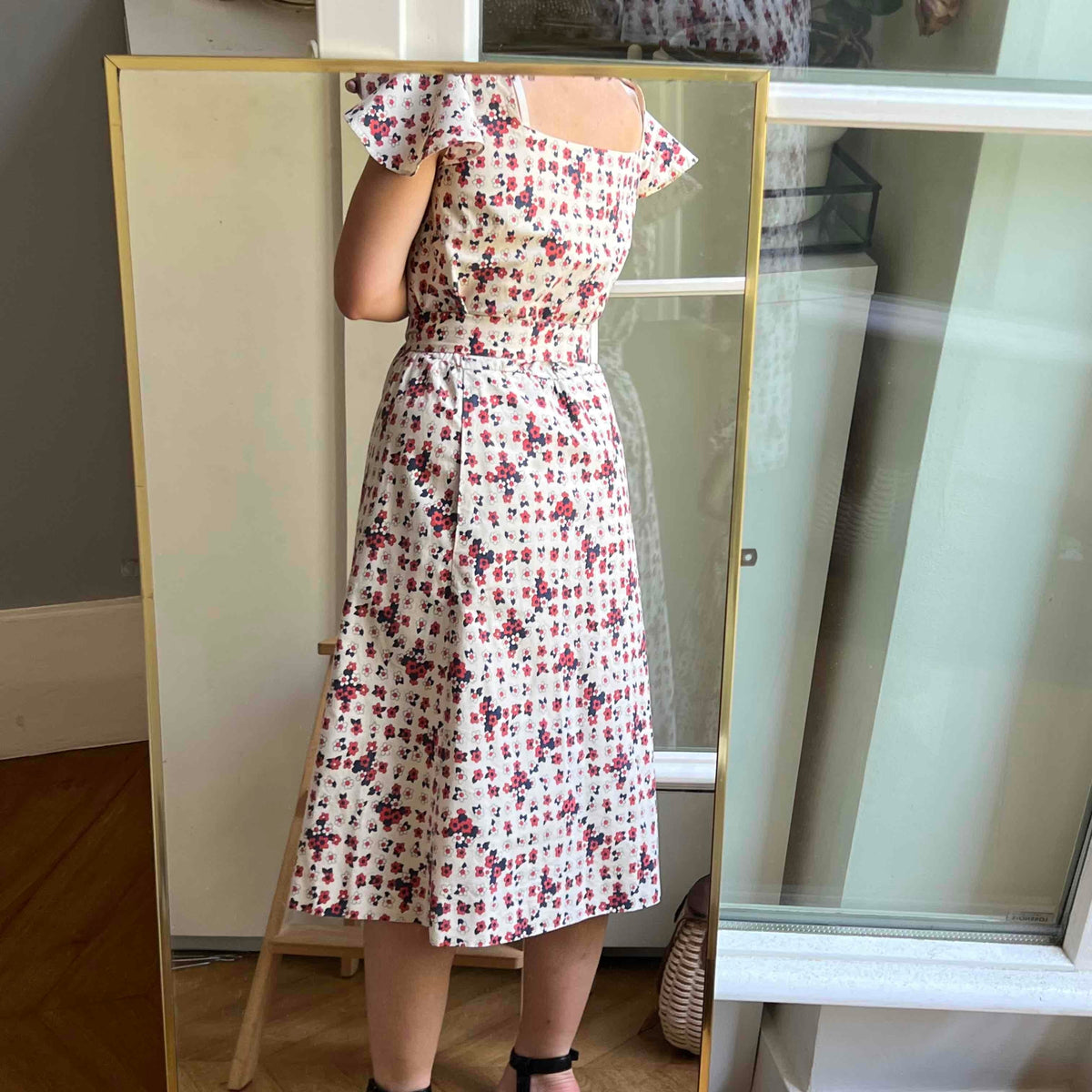 Robe en coton écrue blanche avec des fleurs corail et bleu marine. Décolleté carré et nœud à la taille. Boutonnée sur le côté, excellent état. Années 70 taille 36–38.