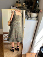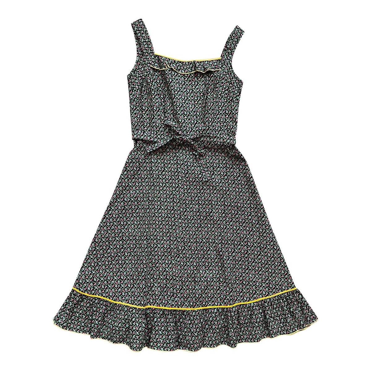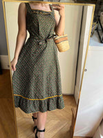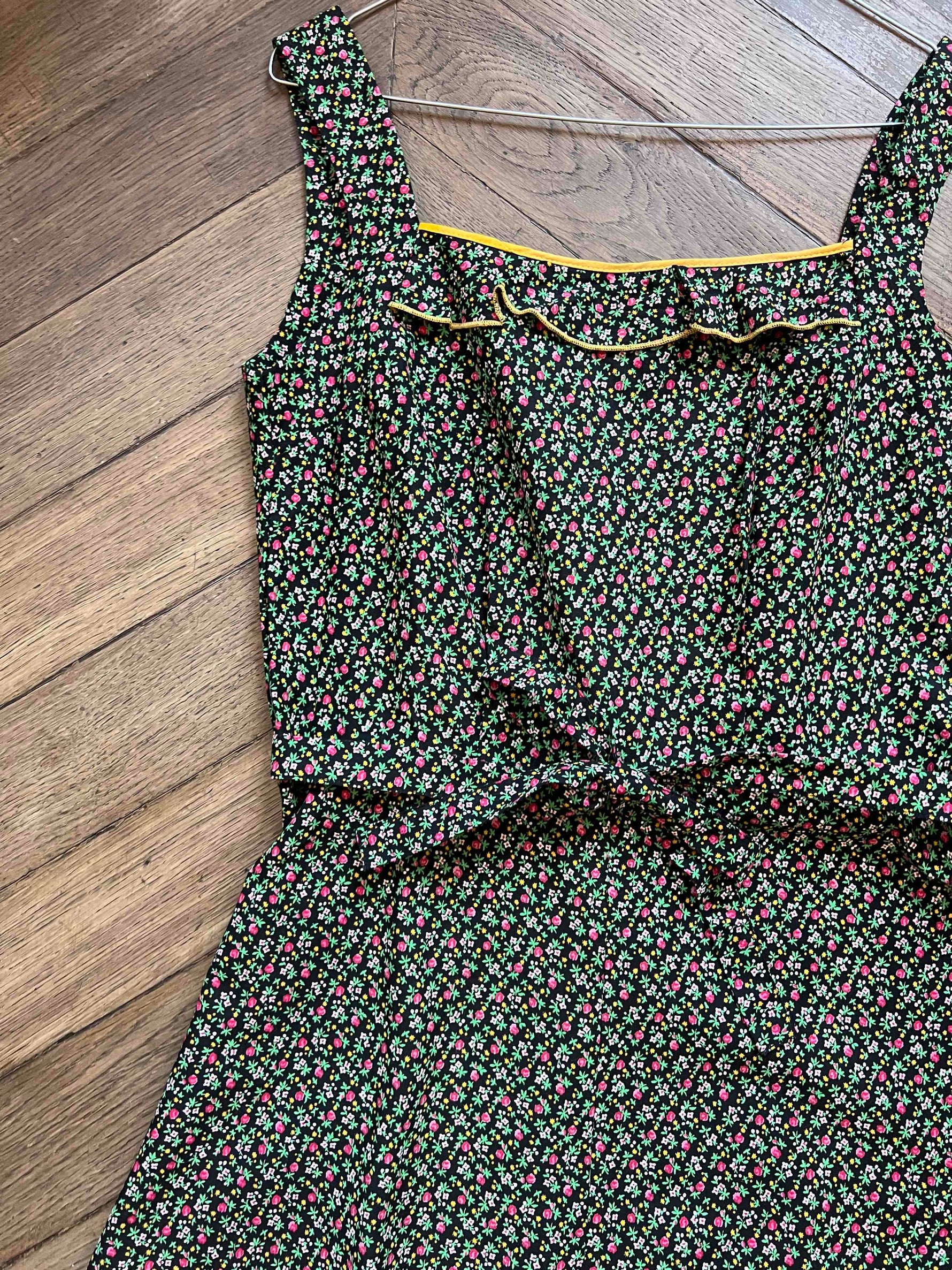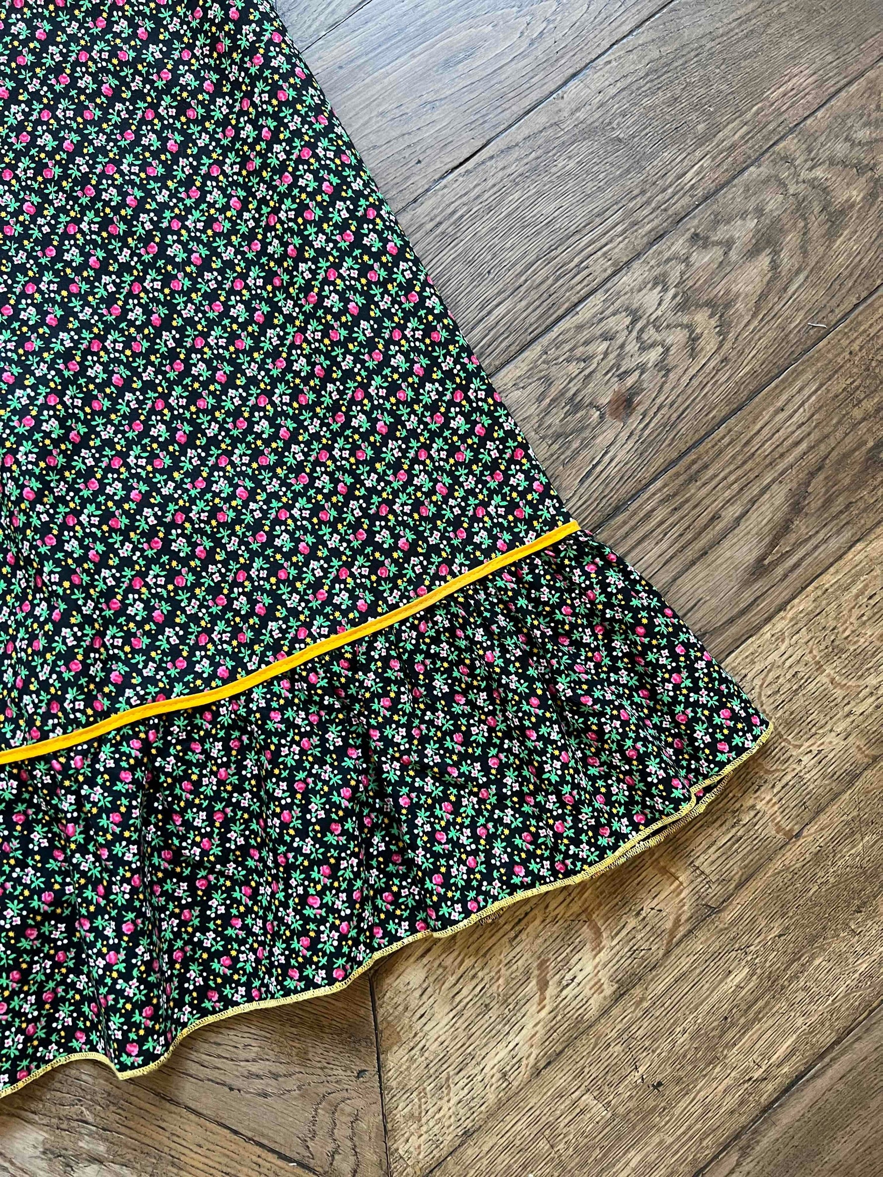 Prix unitaire parRobe longue en coton noire à fleurs roses et vertes, détails de volants avec surpiqûres jaunes. Années 90s, ceinture. Taille 36/38. Excellent état. Aucun défaut. Marque Laly Chic
