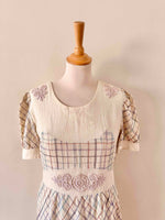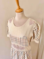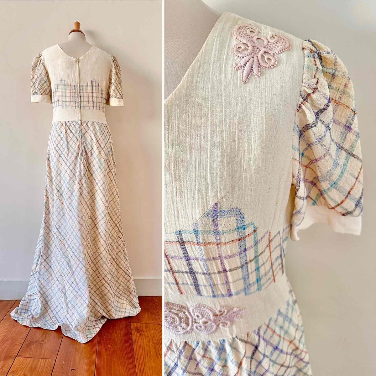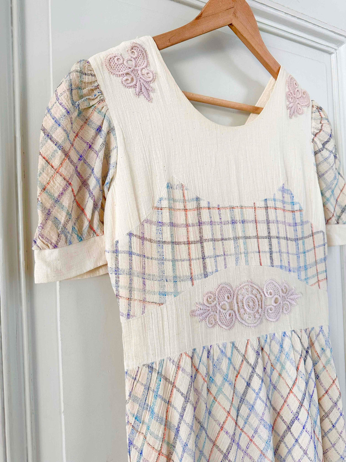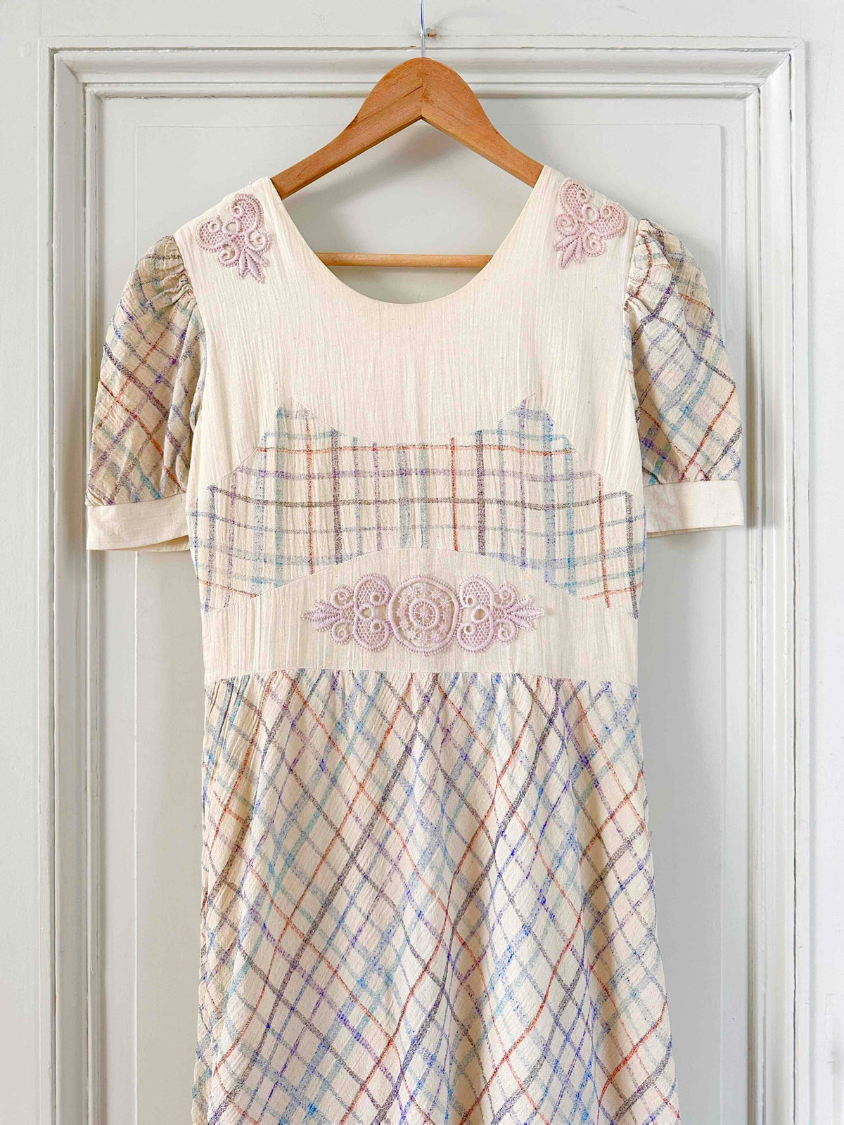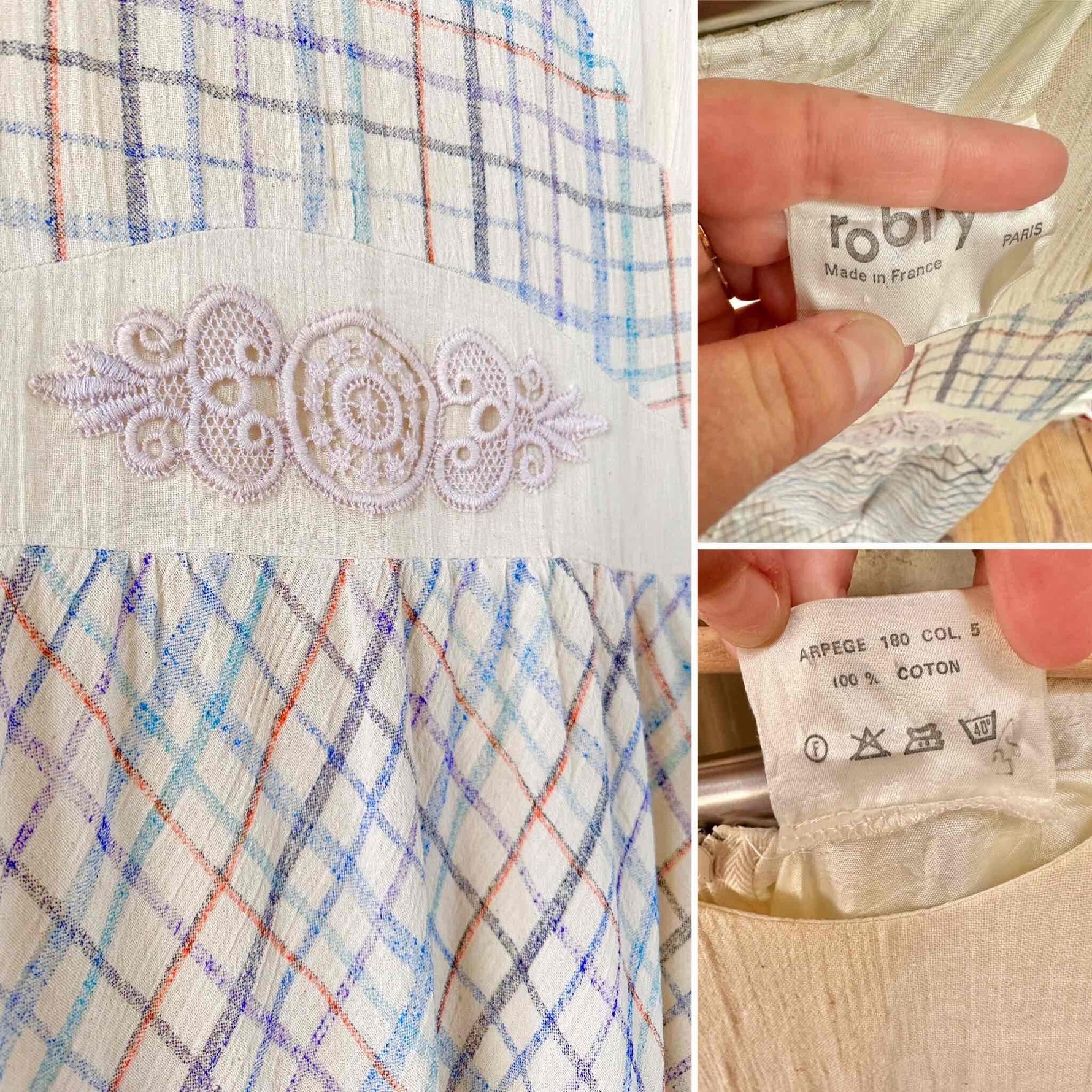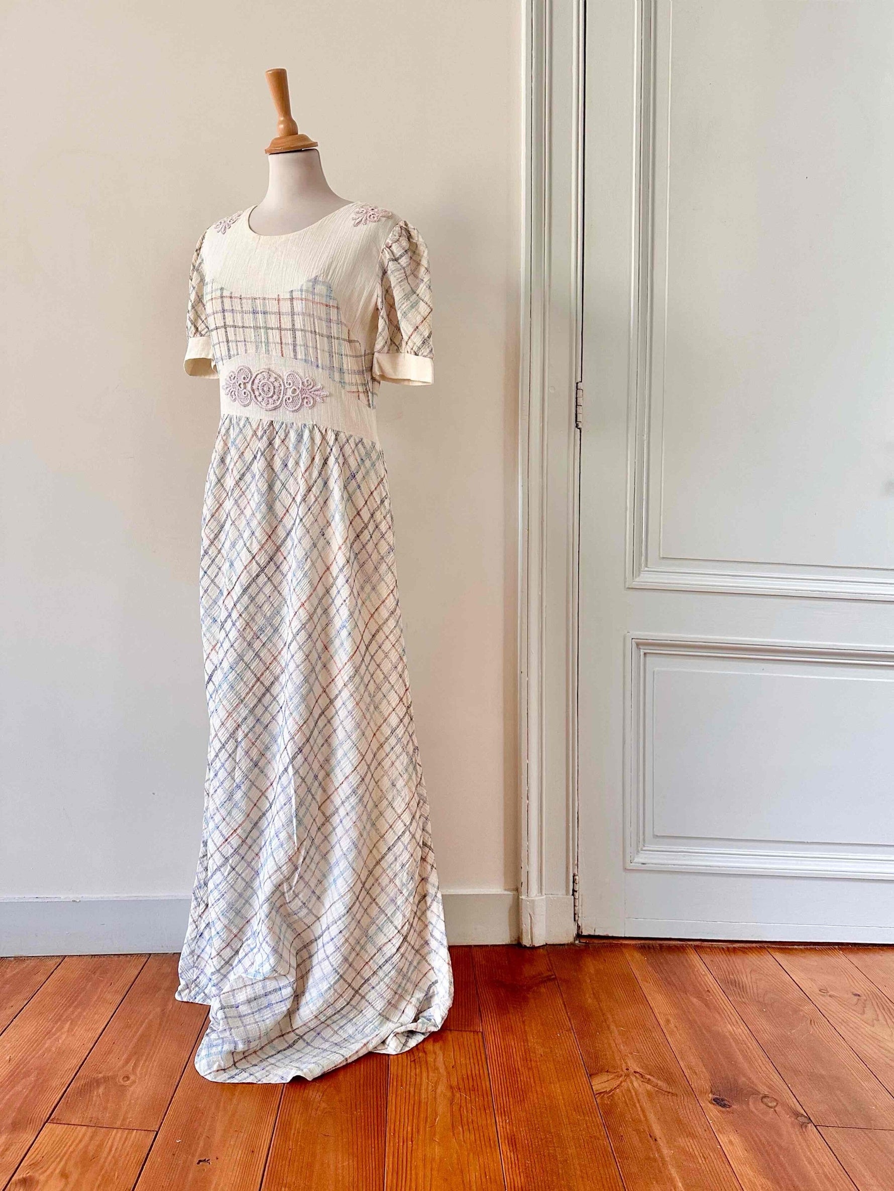 Prix unitaire parRobe vichy en Gaze de Coton 70s, coton gaze écru, carreaux effet crayonnés dans les tons pastel bleu ciel, lilas et orange, manches ballons, broderies dentelle lilas aux épaules et a la taille, longueur maxi forme prairie, années 70s, fabriquée en France, taille 36 portée ici sur un mannequin T36, aisselles 44 cm.