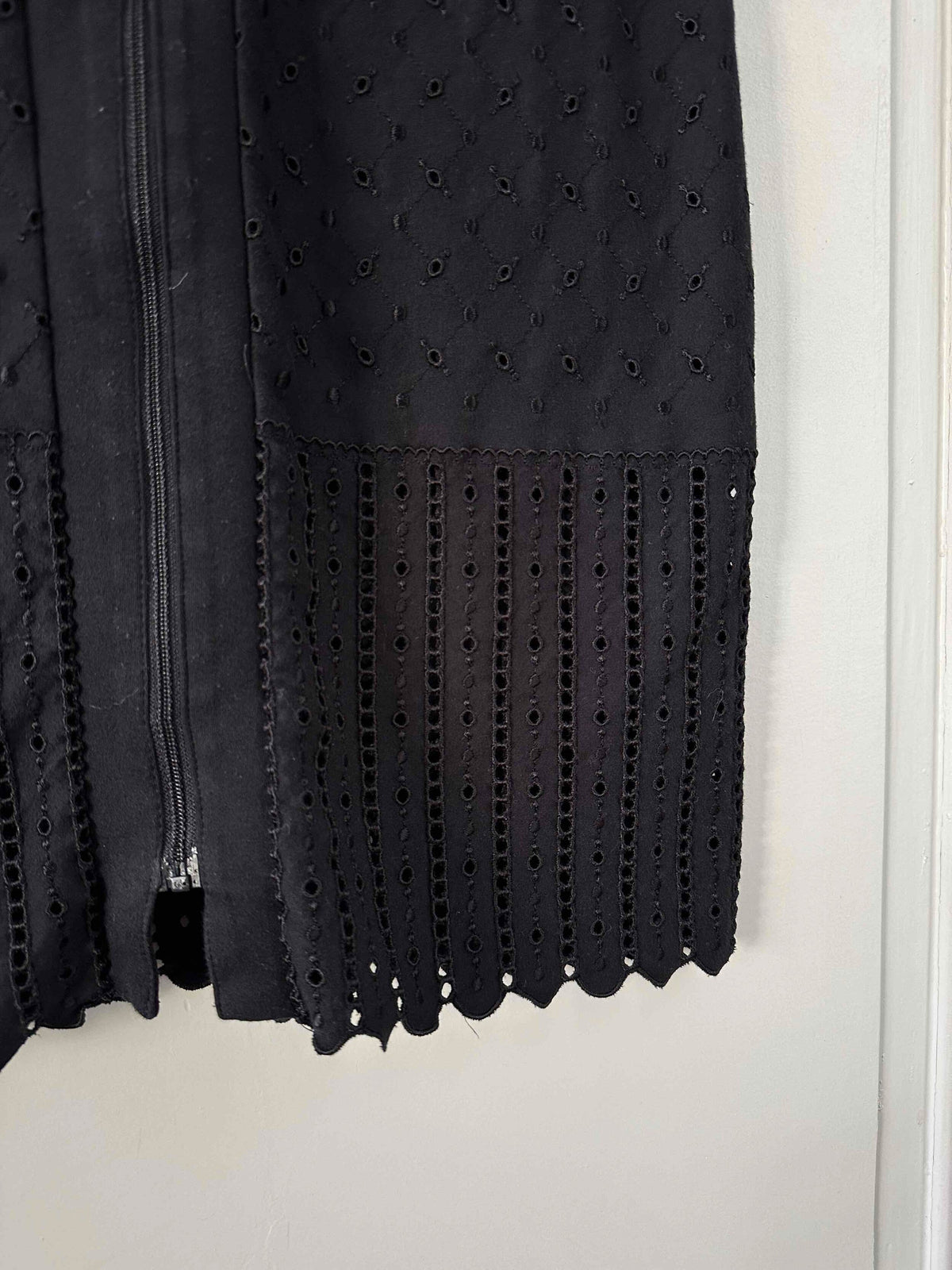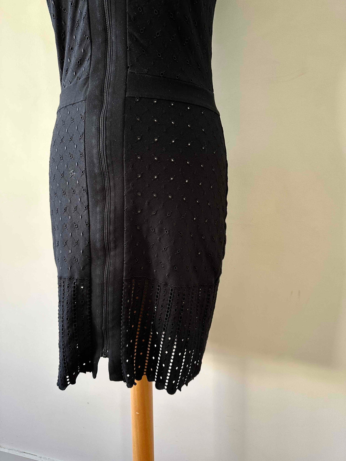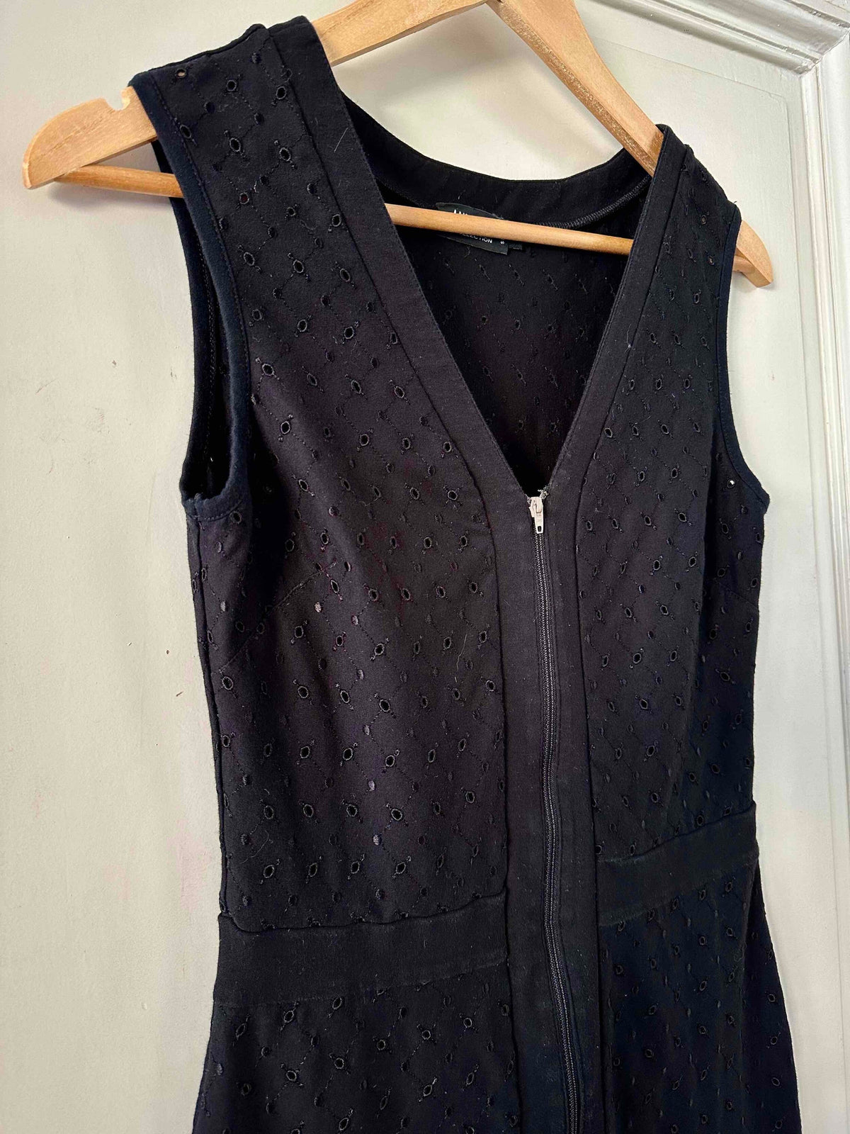 Prix unitaire parRobe brodée Anti-Flirt, en jersey de coton élasthanne noir entièrement ajouré de broderies anglaises eyelet noir, fermeture Éclair décorative devant, fabriquée en France, taille 36 portée ici sur un mannequin T36.