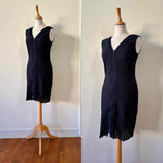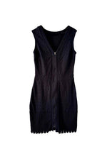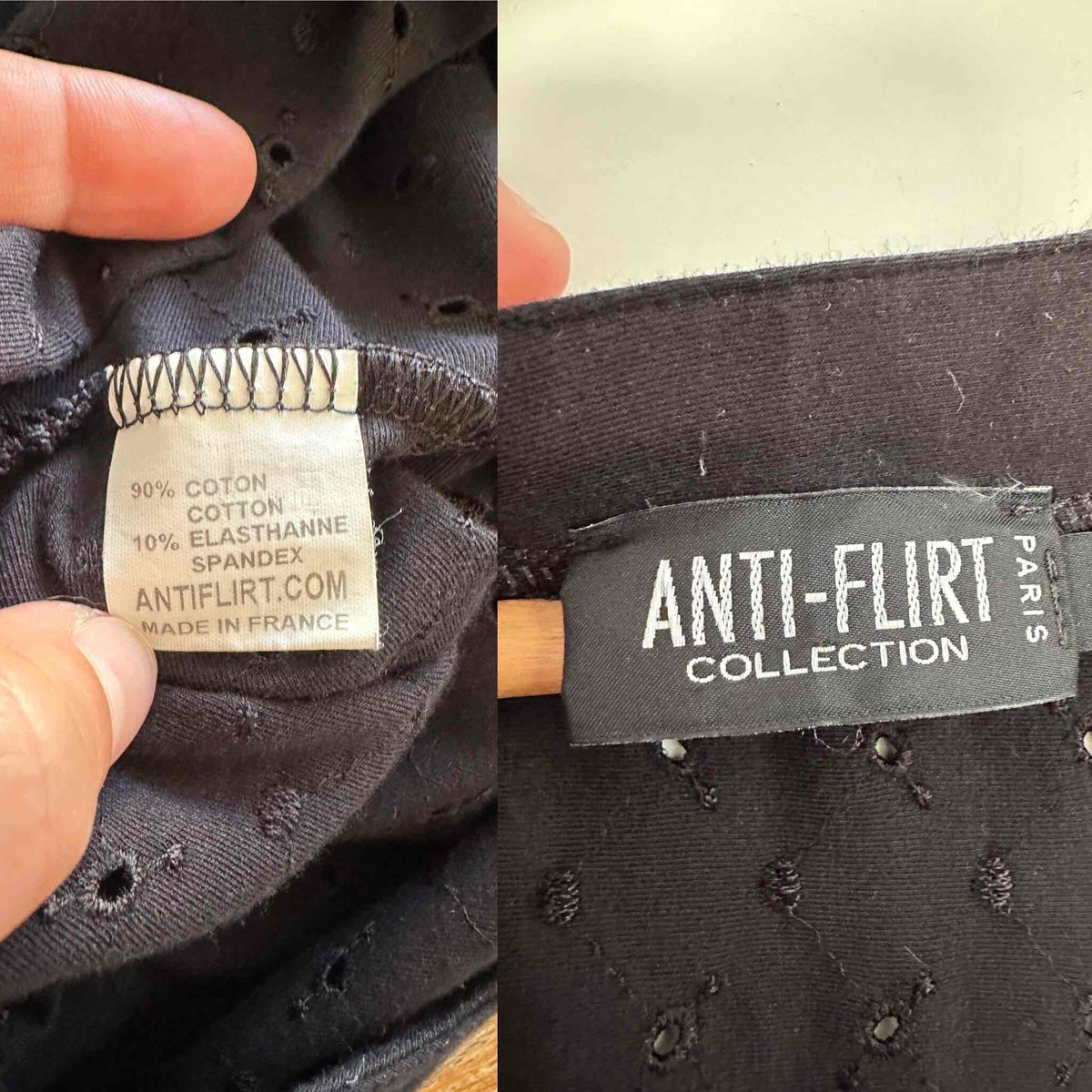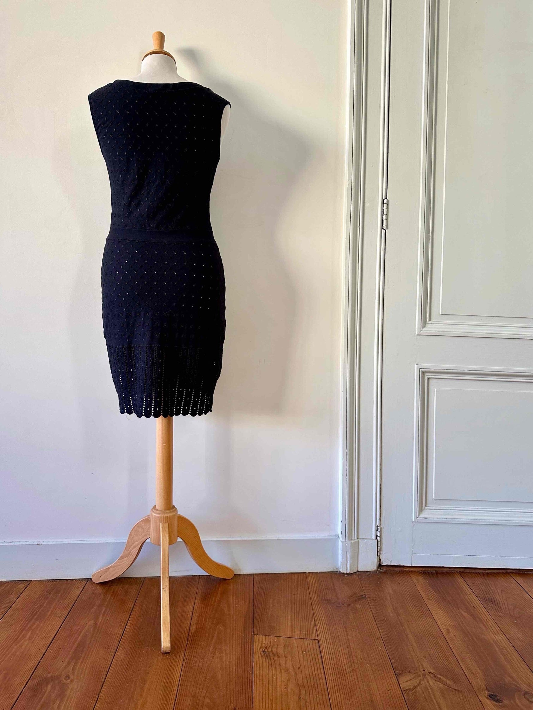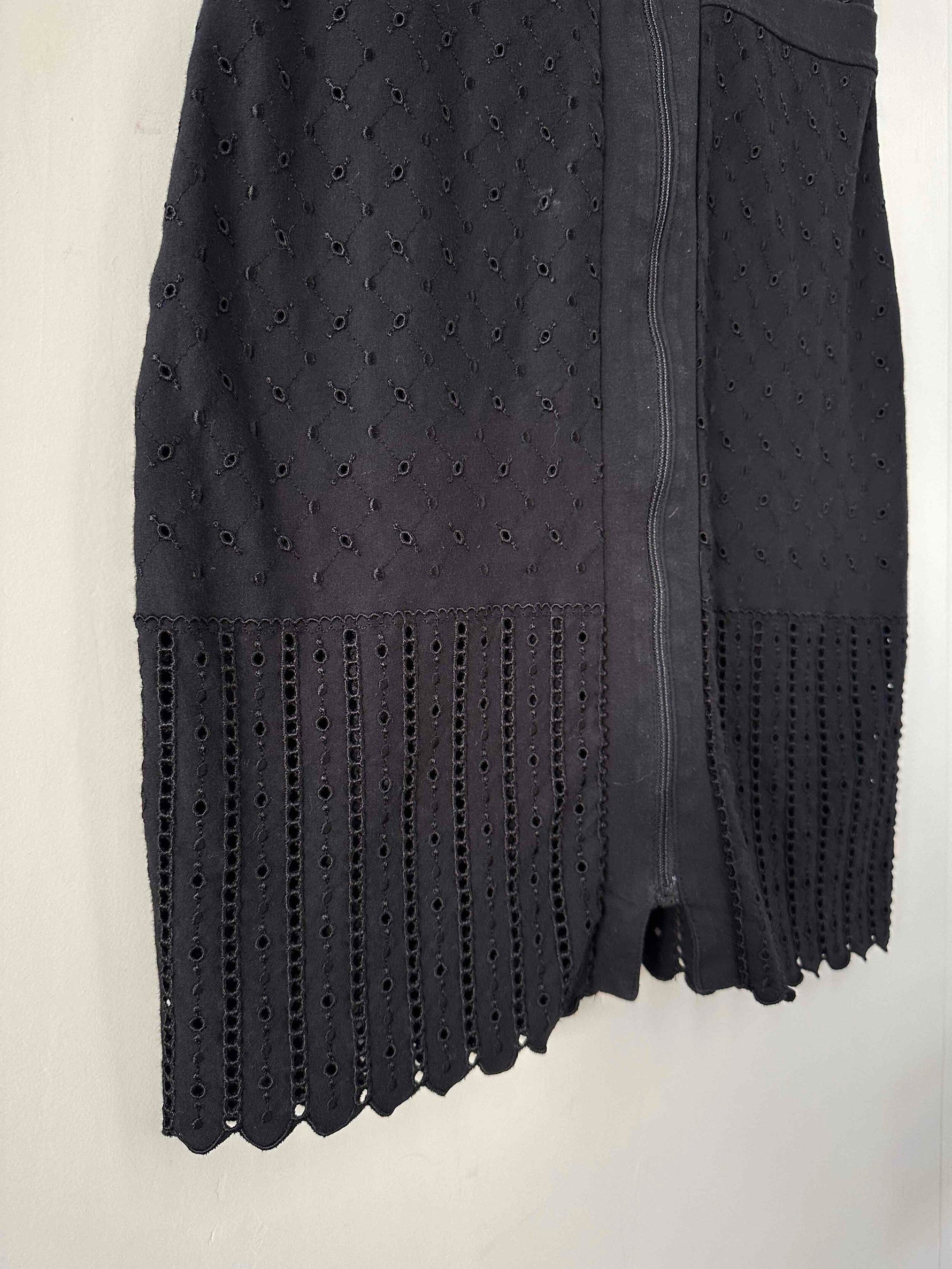 Prix unitaire parRobe brodée Anti-Flirt, en jersey de coton élasthanne noir entièrement ajouré de broderies anglaises eyelet noir, fermeture Éclair décorative devant, fabriquée en France, taille 36 portée ici sur un mannequin T36.