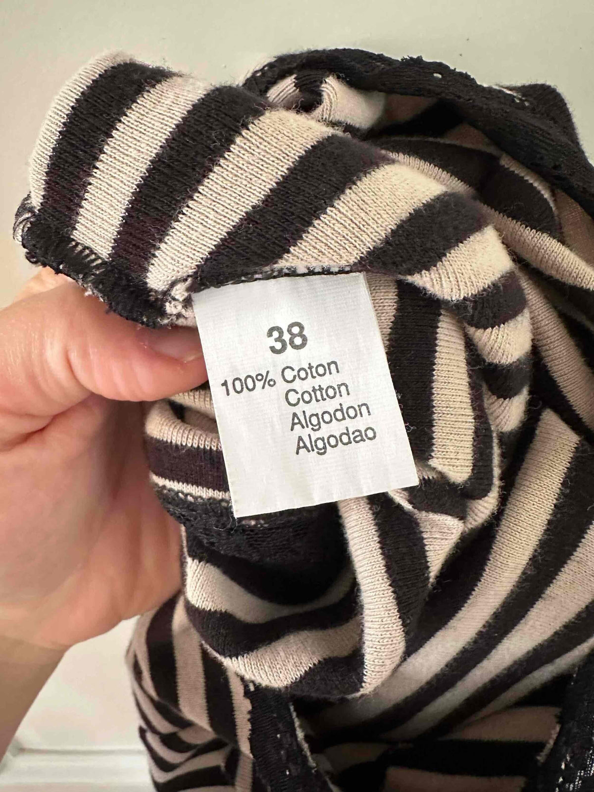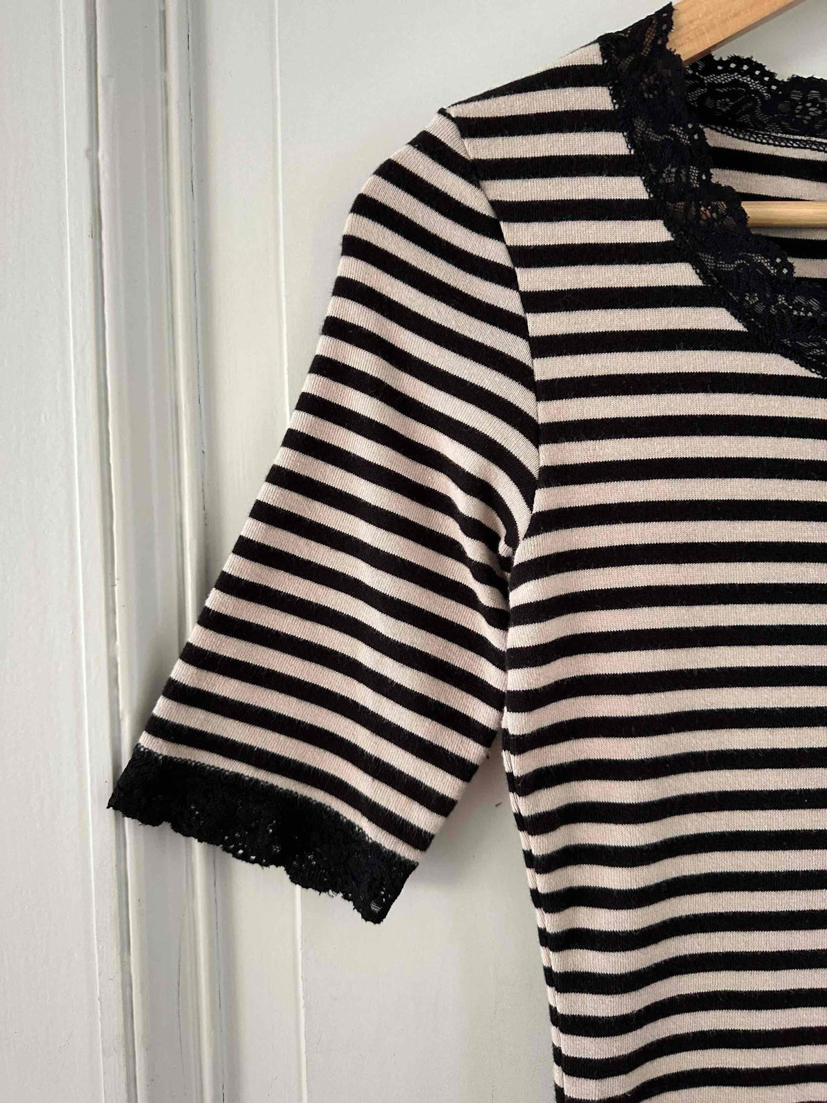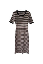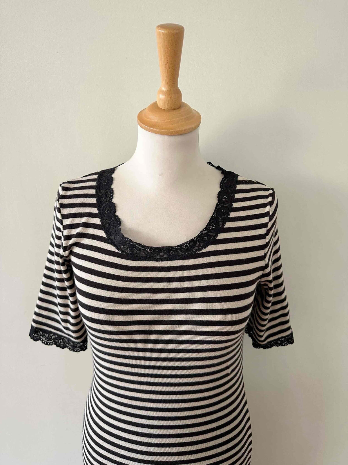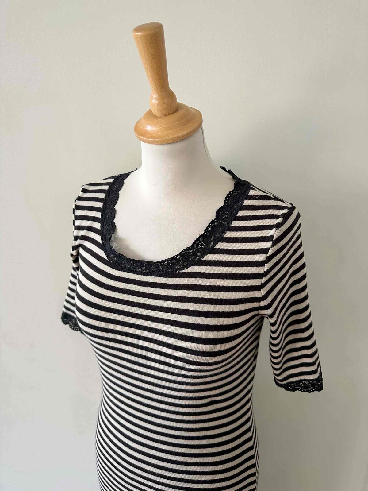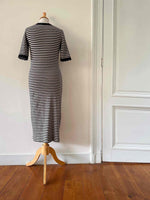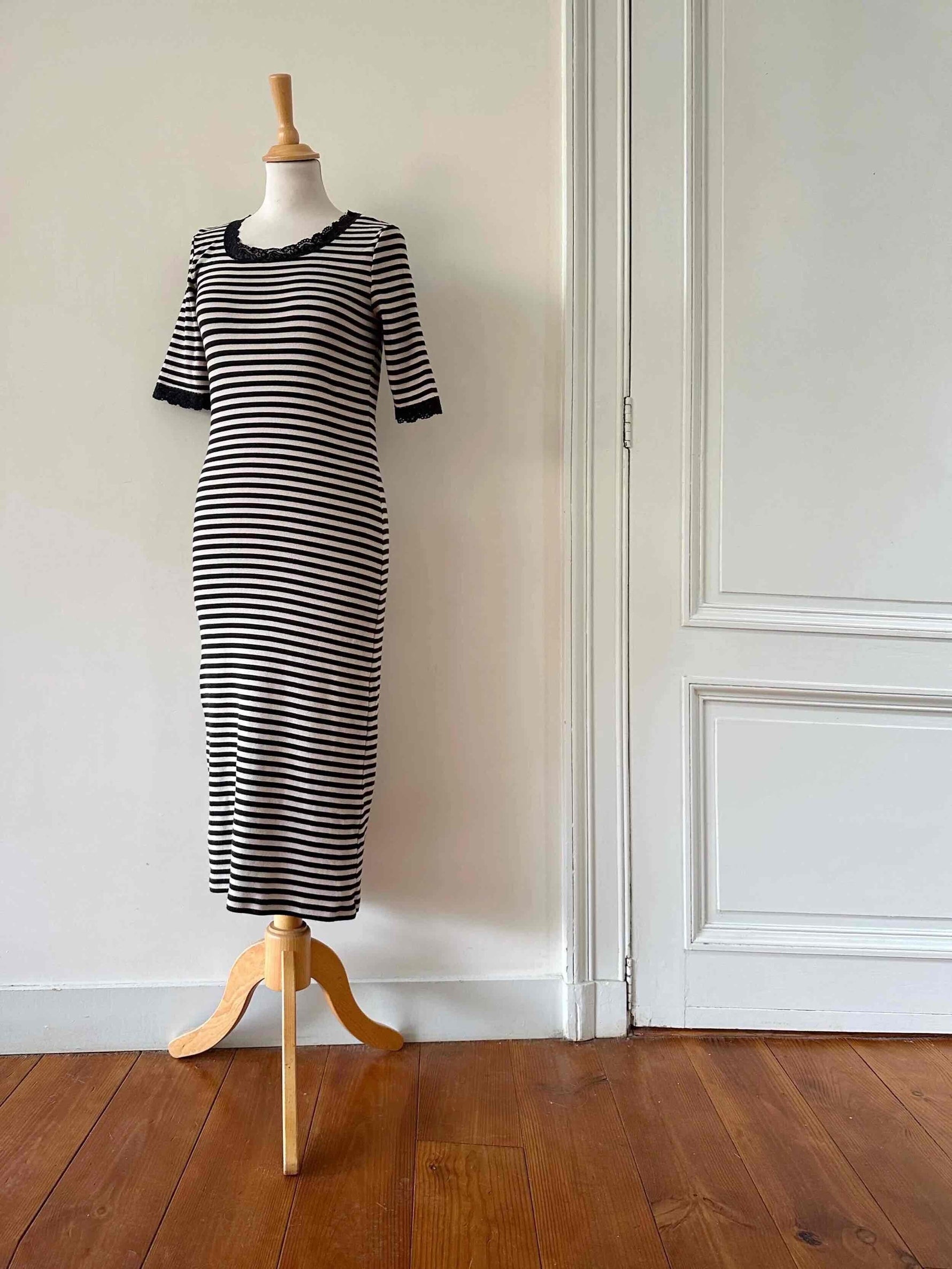 Prix unitaire parRobe longue marinière, en jersey 100% coton, rayures écru beige et noires, encolure ronde et manches courtes bordées de dentelle noire, fabriquée en France, taille 38, portée ici sur un mannequin T36.