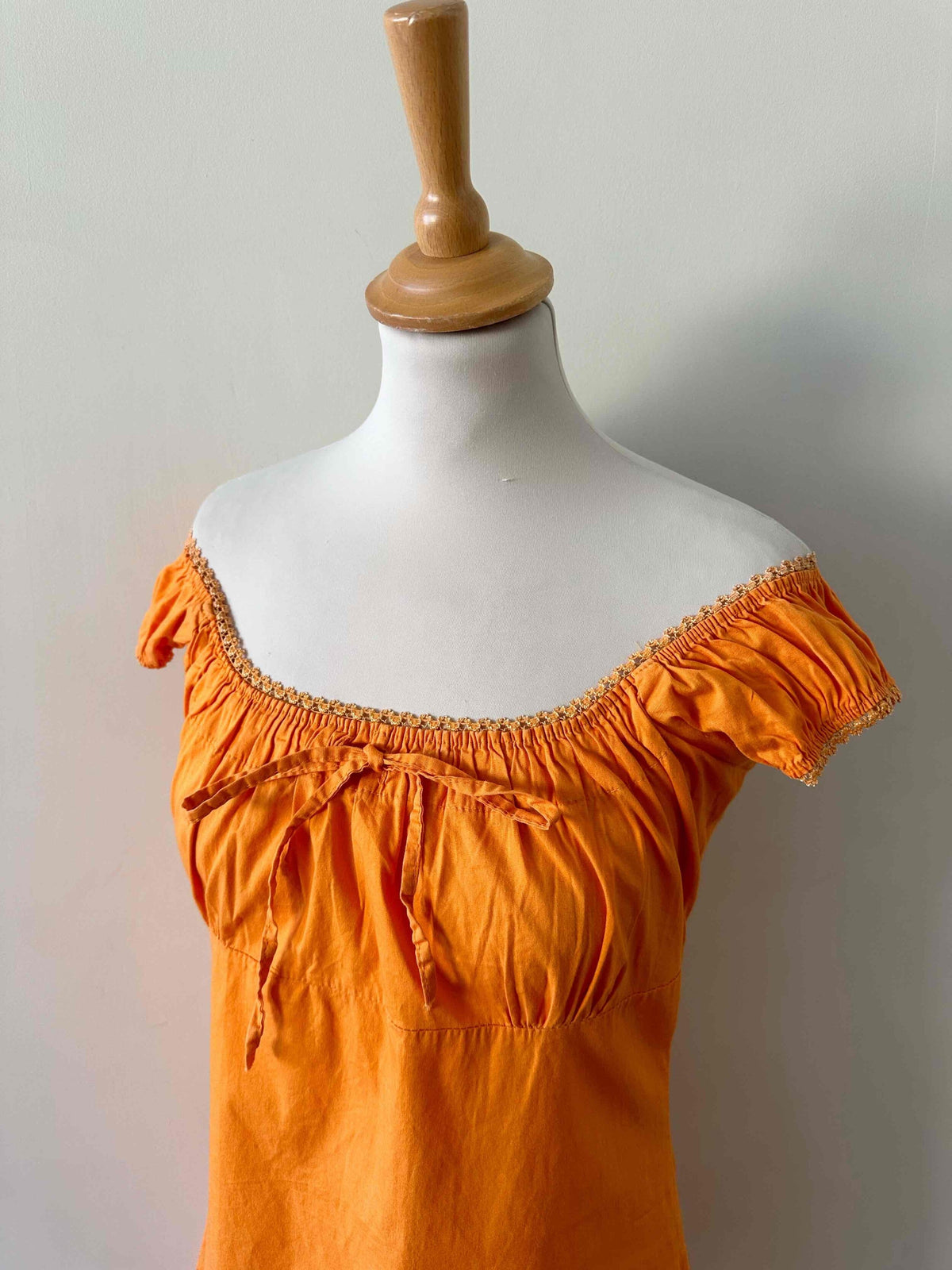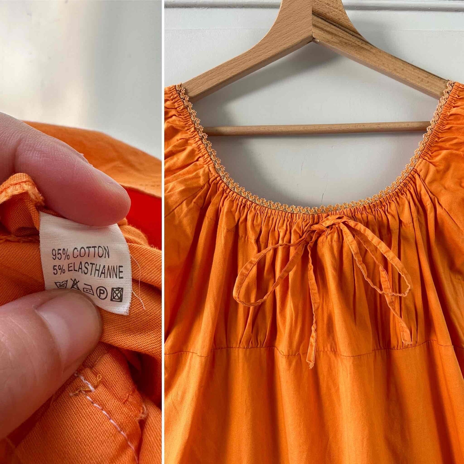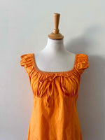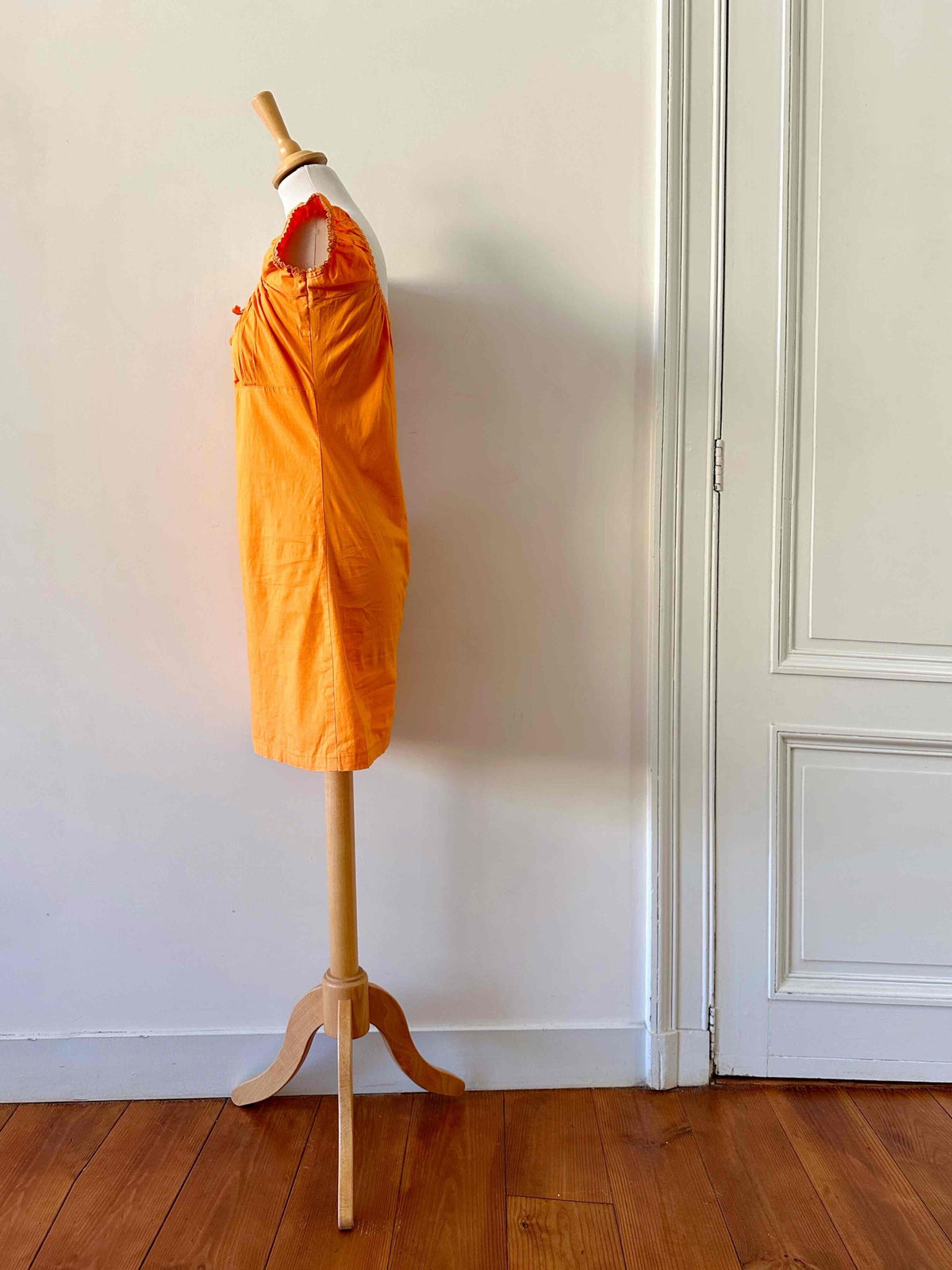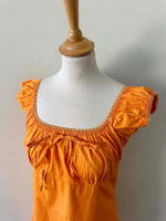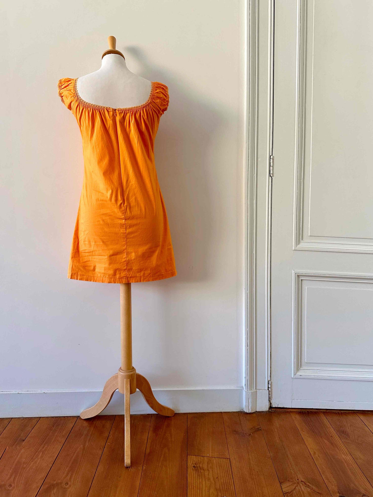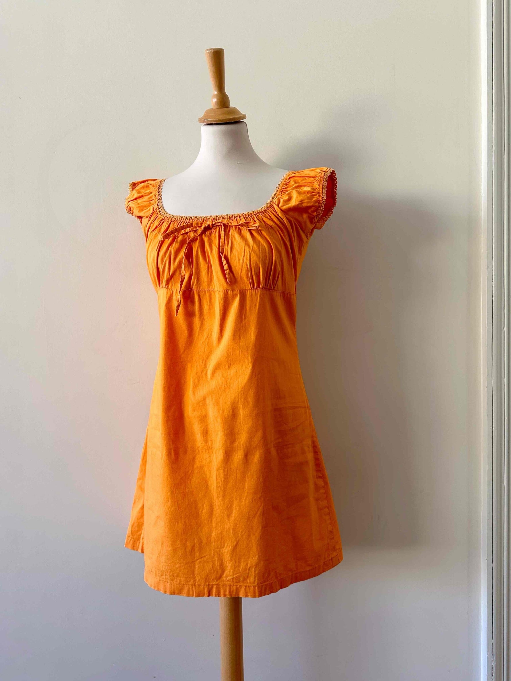 Prix unitaire parRobe mini en coton, coton popeline élasthanne orange, encolure élastique, poitrine froncée à nouer et manches ballons à porter open-shoulders, fabriquée en France, convient aux tailles 34 et 36, portée ici sur un mannequin T36, aisselles 43 cm.