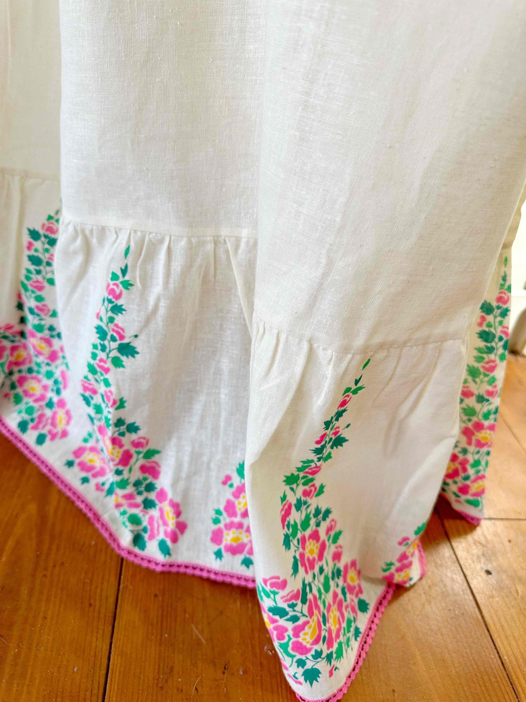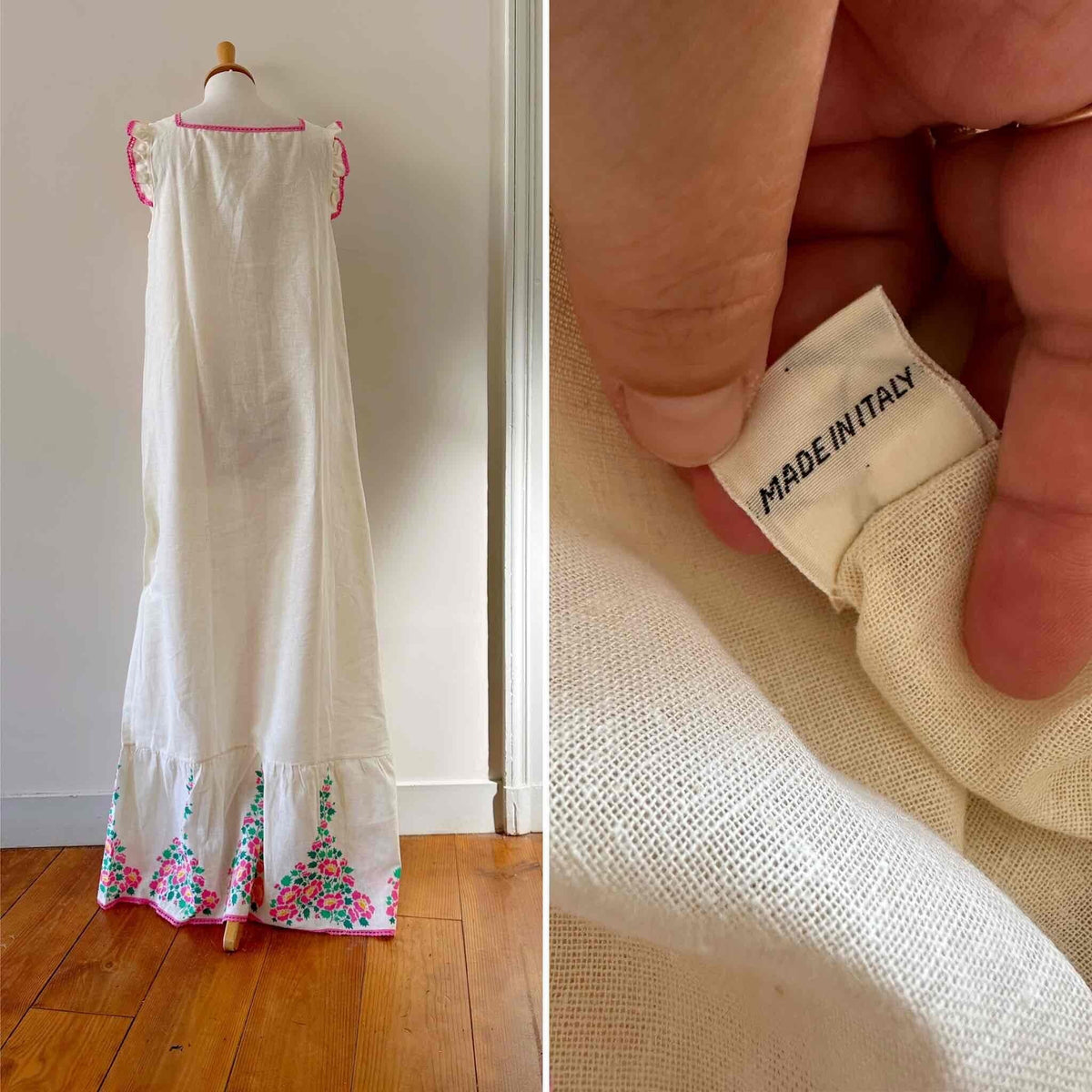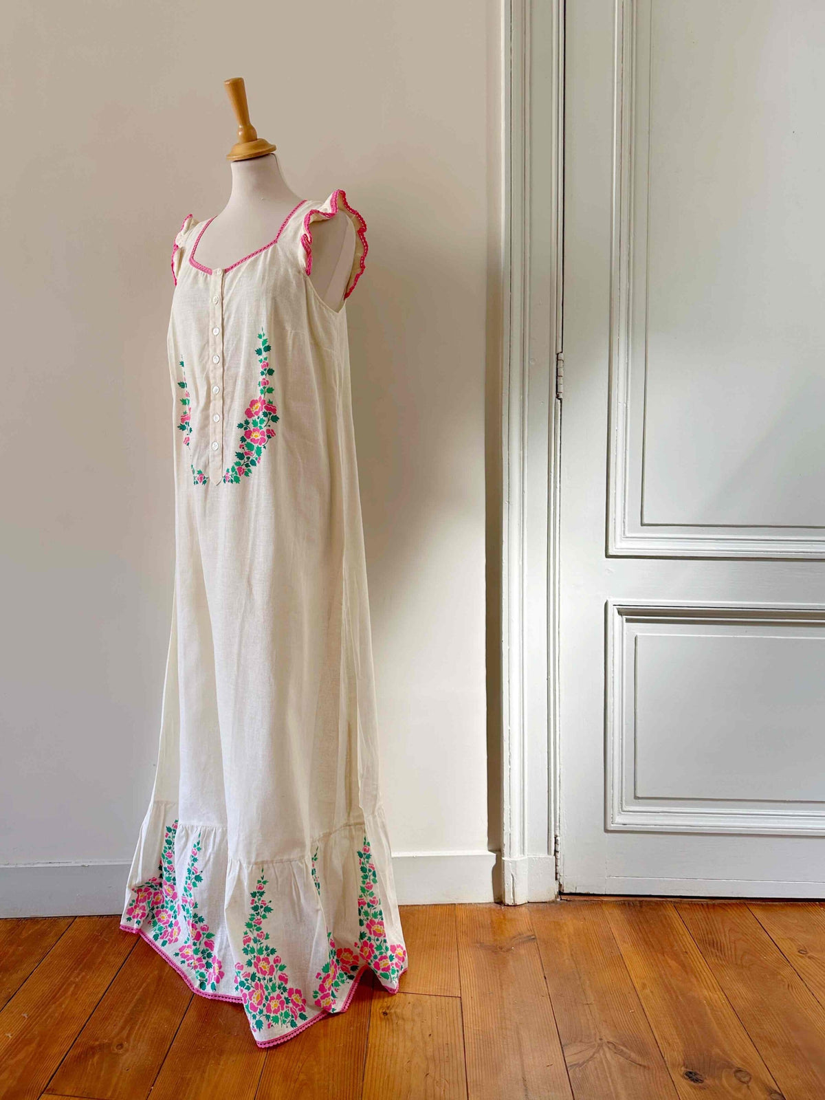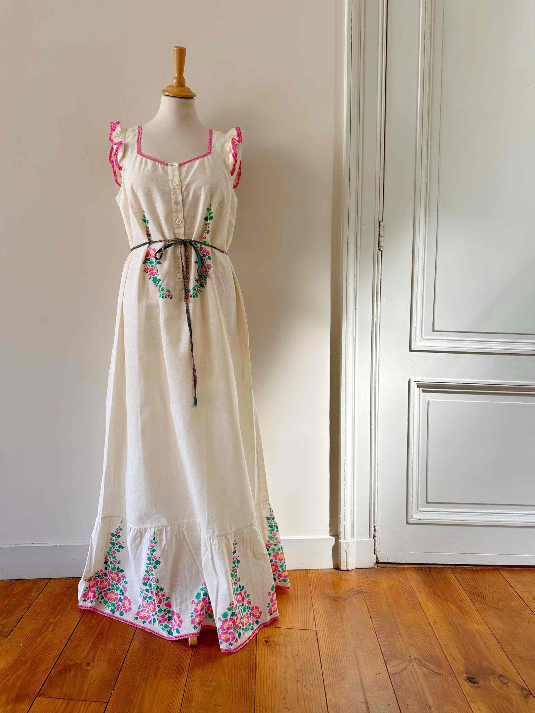 Robe brodee 70s, en coton rustique ecru, imprimé de fleurs multicolores, bordures brodées de dentelle rose, forme évasée longueur maxi, fabriquée en Italie, taille 38 portée ici sur un mannequin T36, aisselles 48cm.