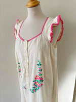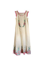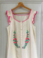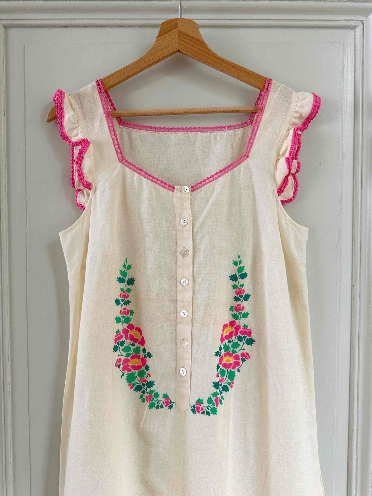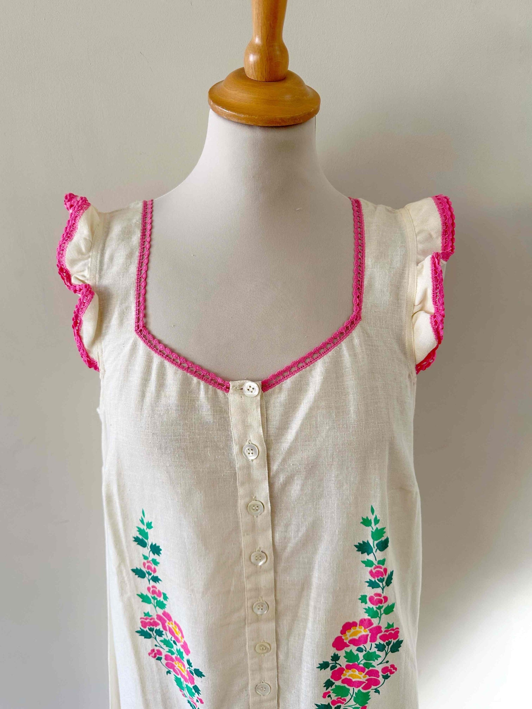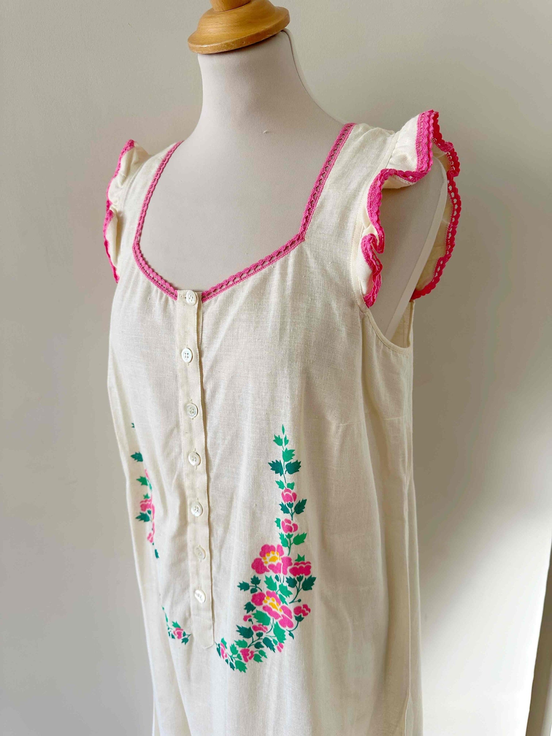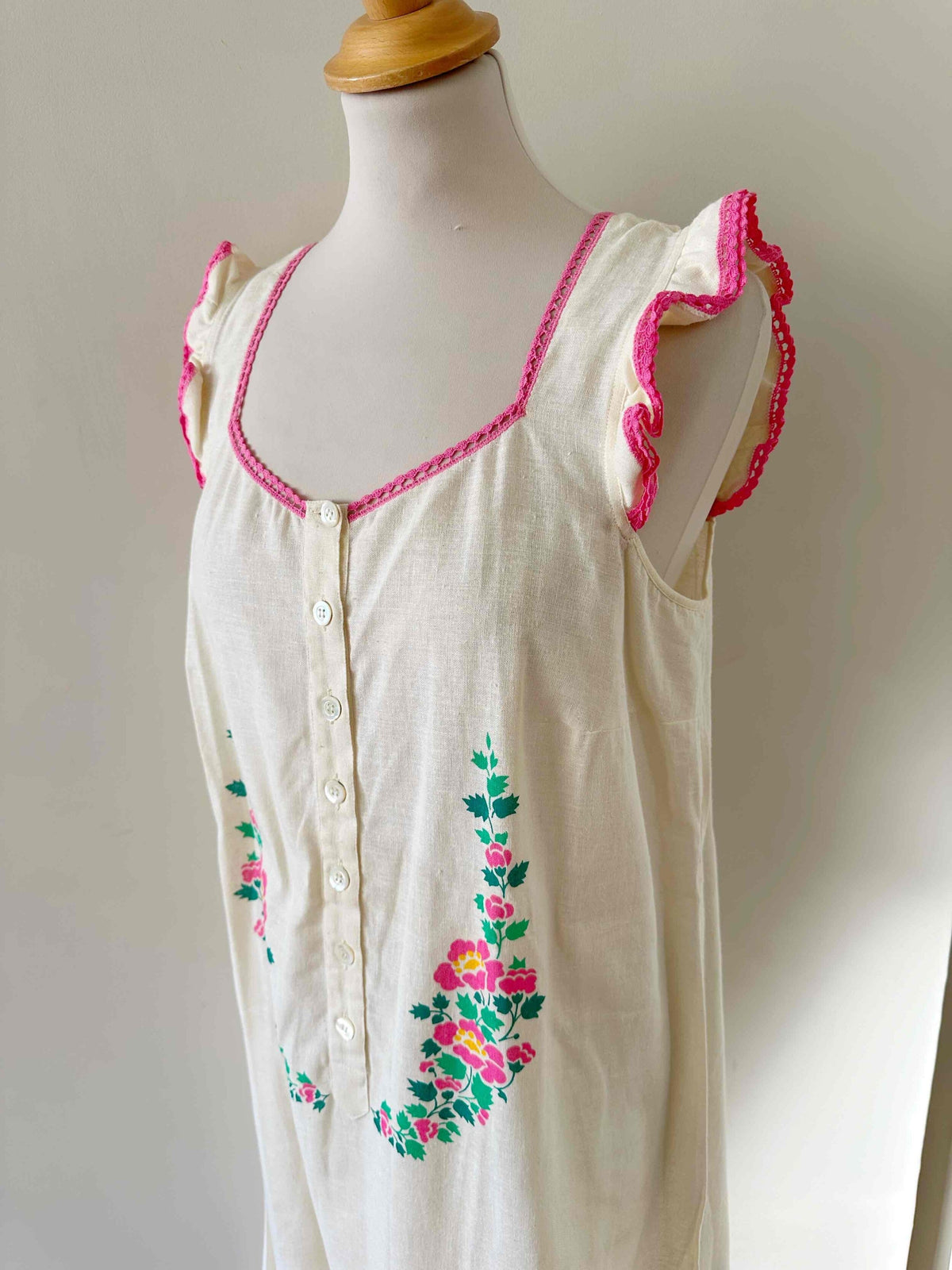 Robe brodee 70s, en coton rustique ecru, imprimé de fleurs multicolores, bordures brodées de dentelle rose, forme évasée longueur maxi, fabriquée en Italie, taille 38 portée ici sur un mannequin T36, aisselles 48cm.