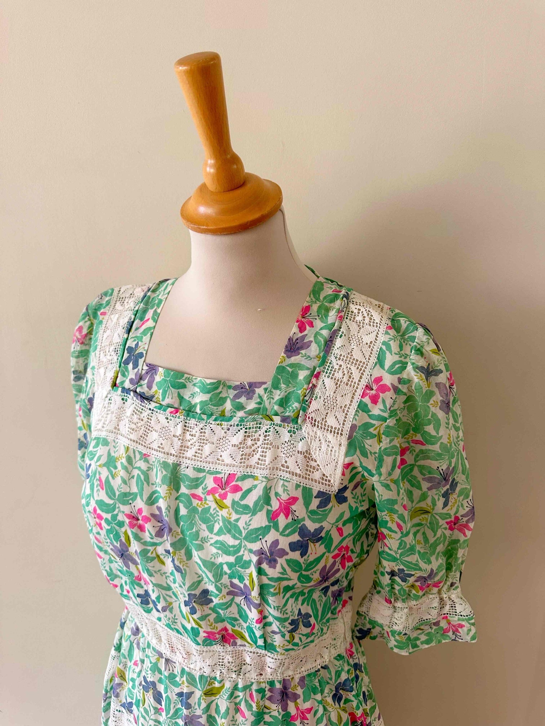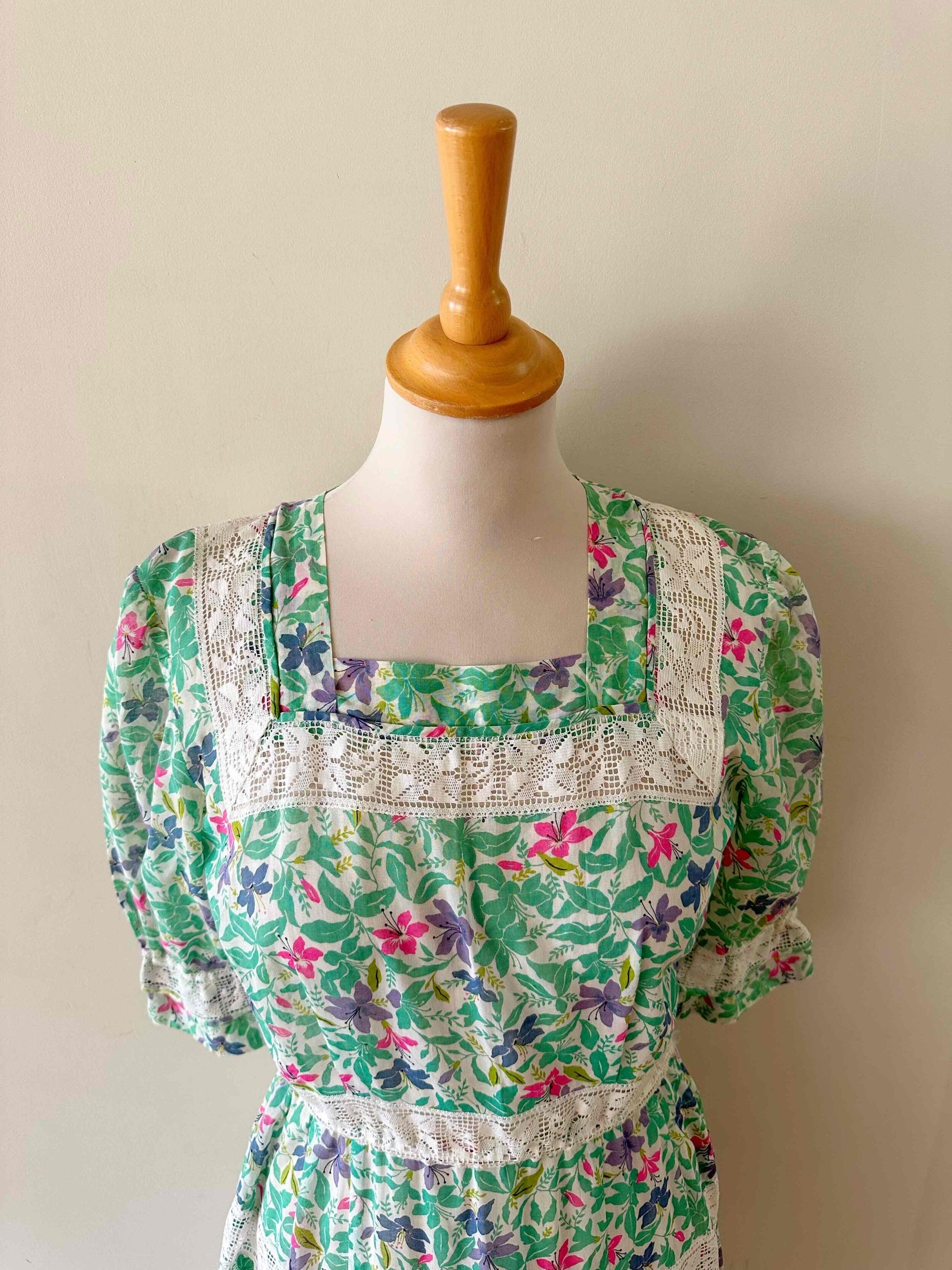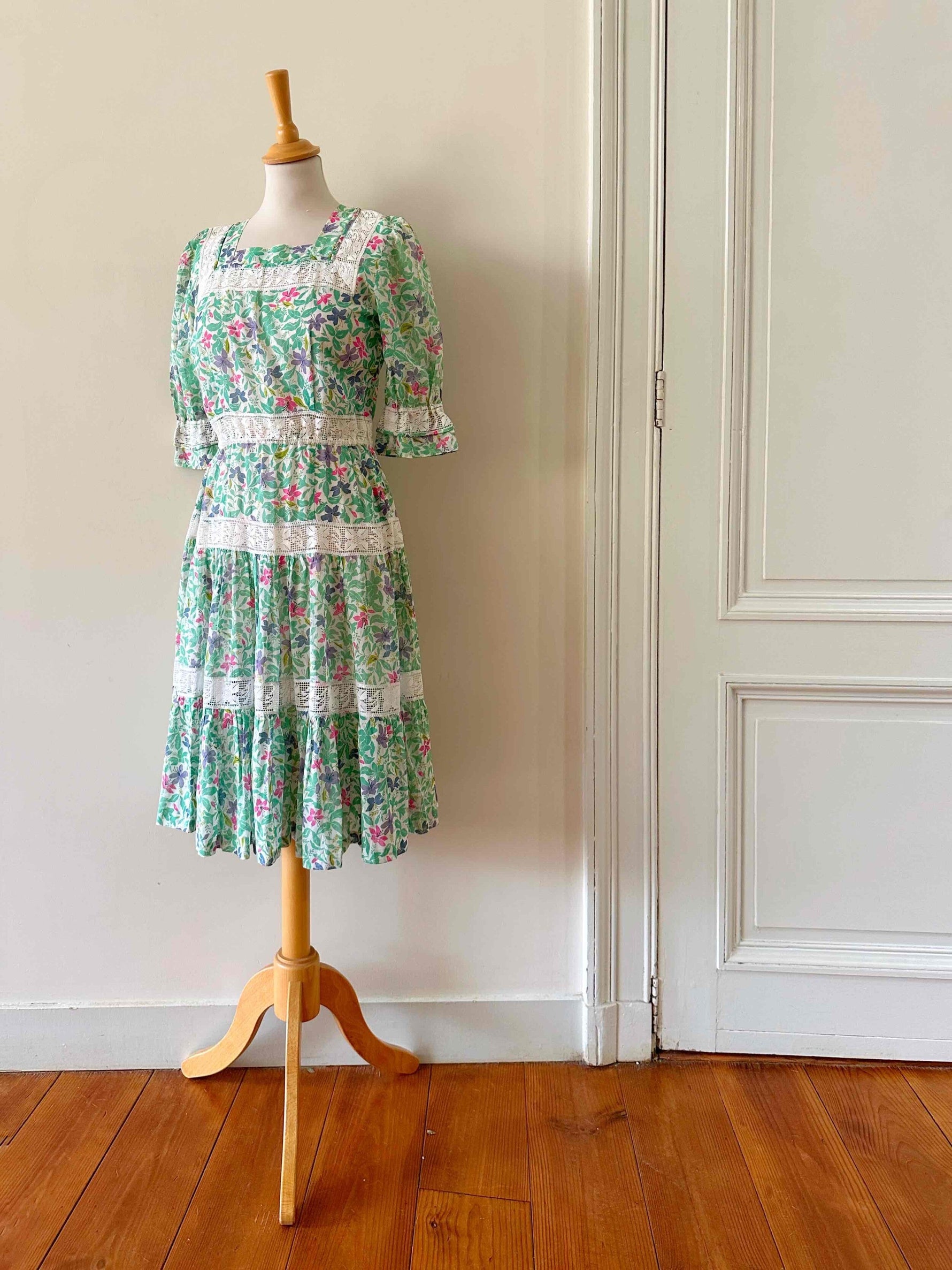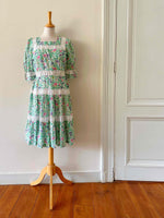 Prix unitaire parRobe prairie brodée, en gaze de coton imprimée fleurs prairies, brodée de dentelle broderie anglaise blanche ajourée, manches ballons, fermeture éclair côté, fabriquée dans les années 70s, taille 36 portée ici sur un mannequin T36, aisselles 43cm.