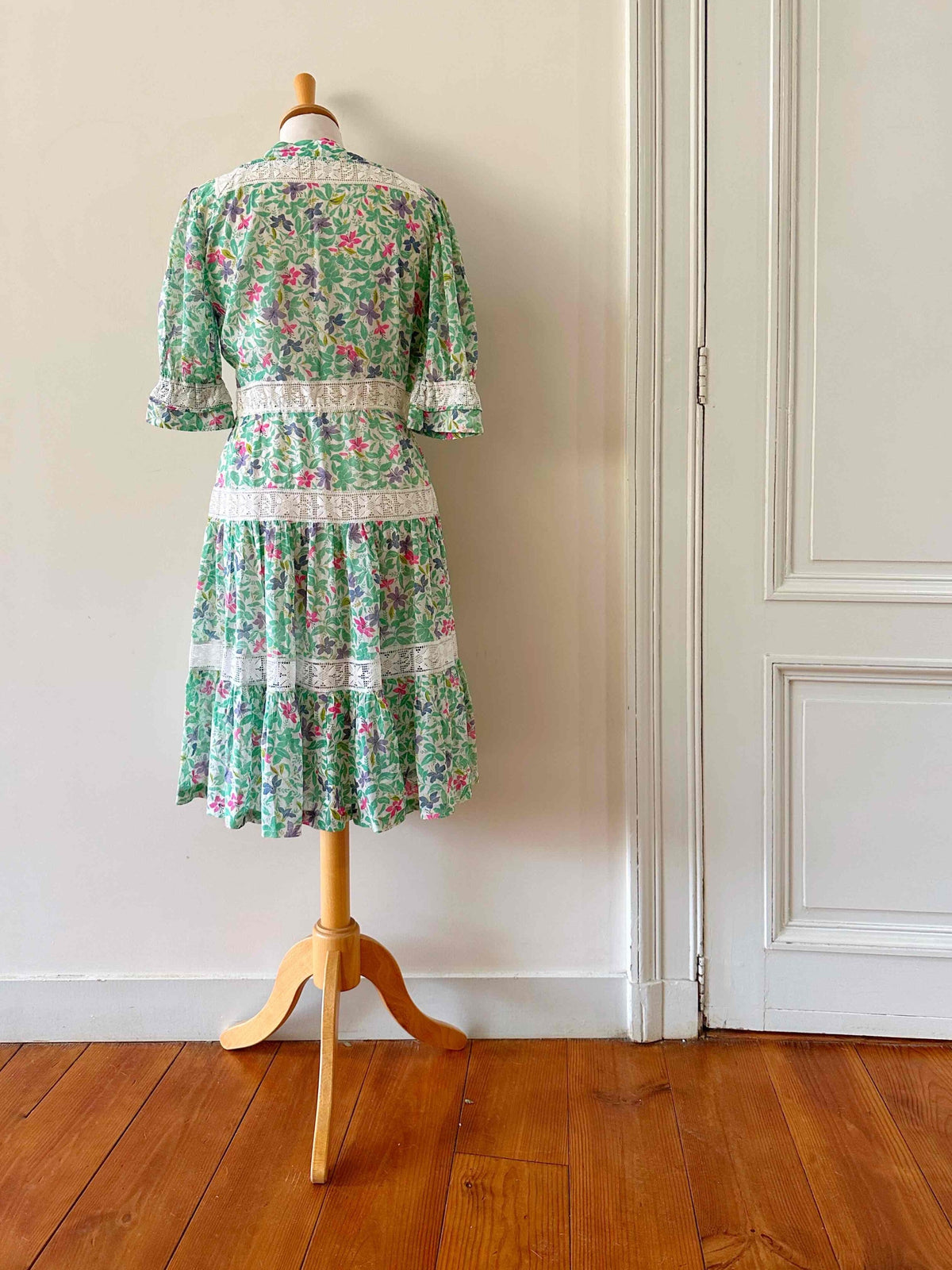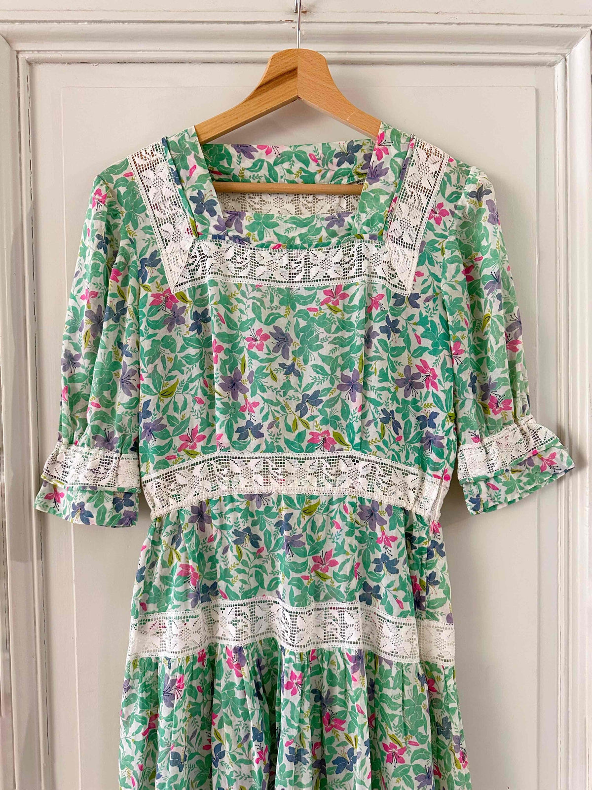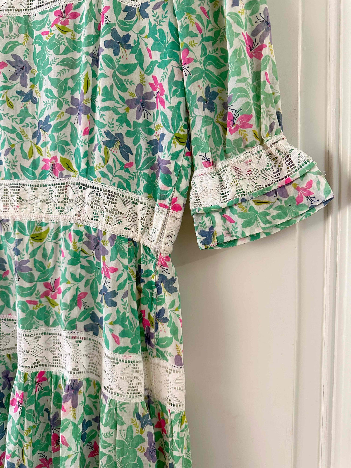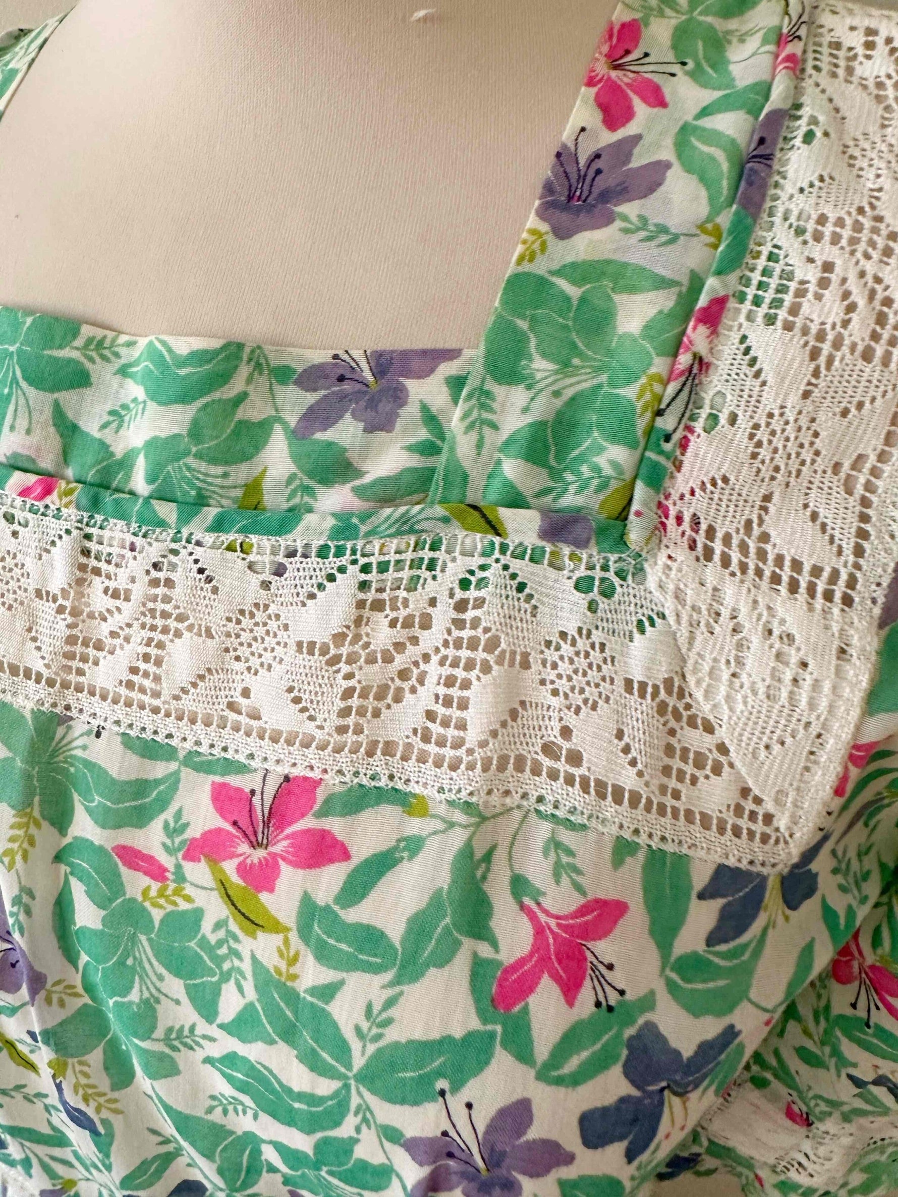 Prix unitaire parRobe prairie brodée, en gaze de coton imprimée fleurs prairies, brodée de dentelle broderie anglaise blanche ajourée, manches ballons, fermeture éclair côté, fabriquée dans les années 70s, taille 36 portée ici sur un mannequin T36, aisselles 43cm.
