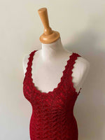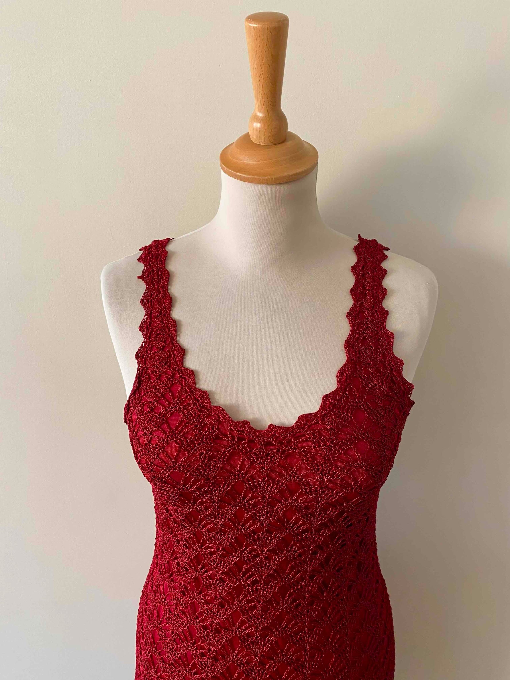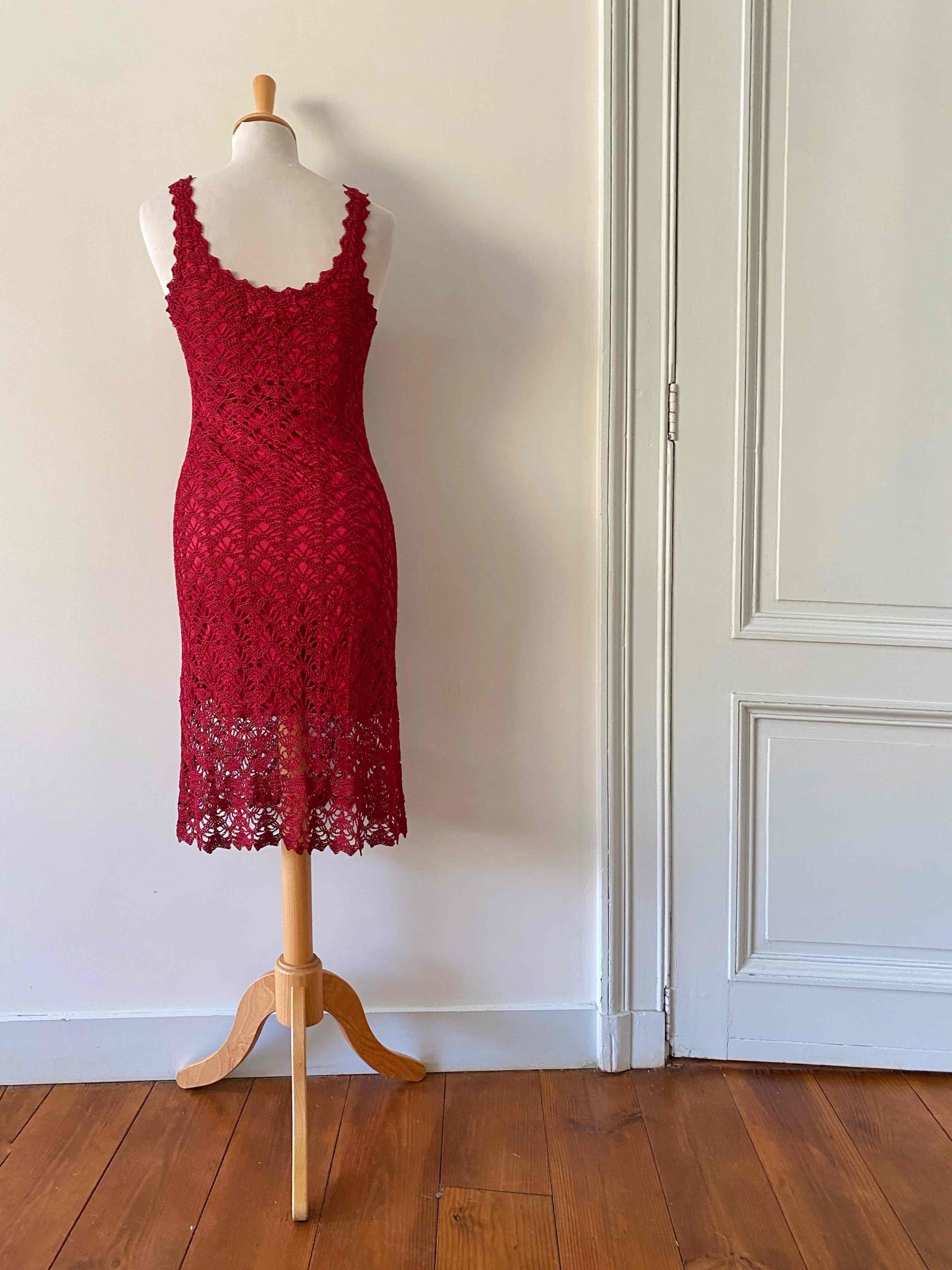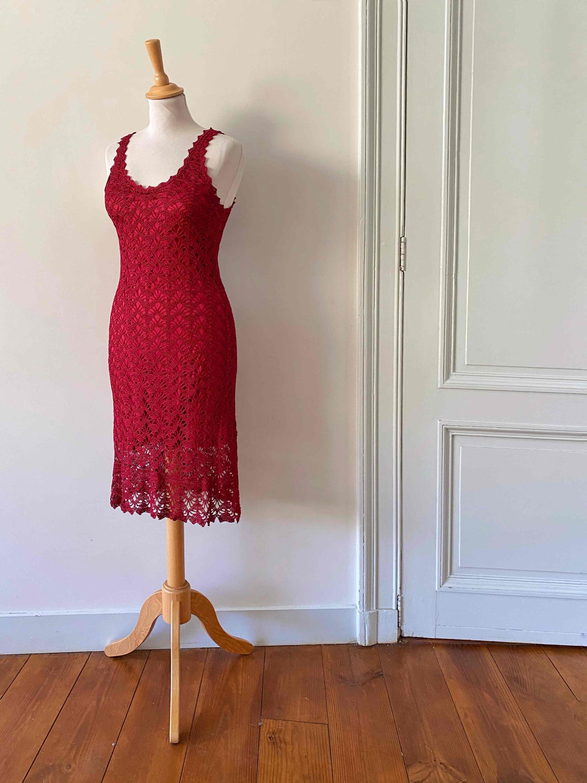 Prix unitaire parRobe en crochet, crochet viscose rouge cerise doublée, bretelles brodées, forme fit and flare, René Derhy, taille 36 actuelle portée ici sur un mannequin T36, aisselles 42cm.