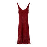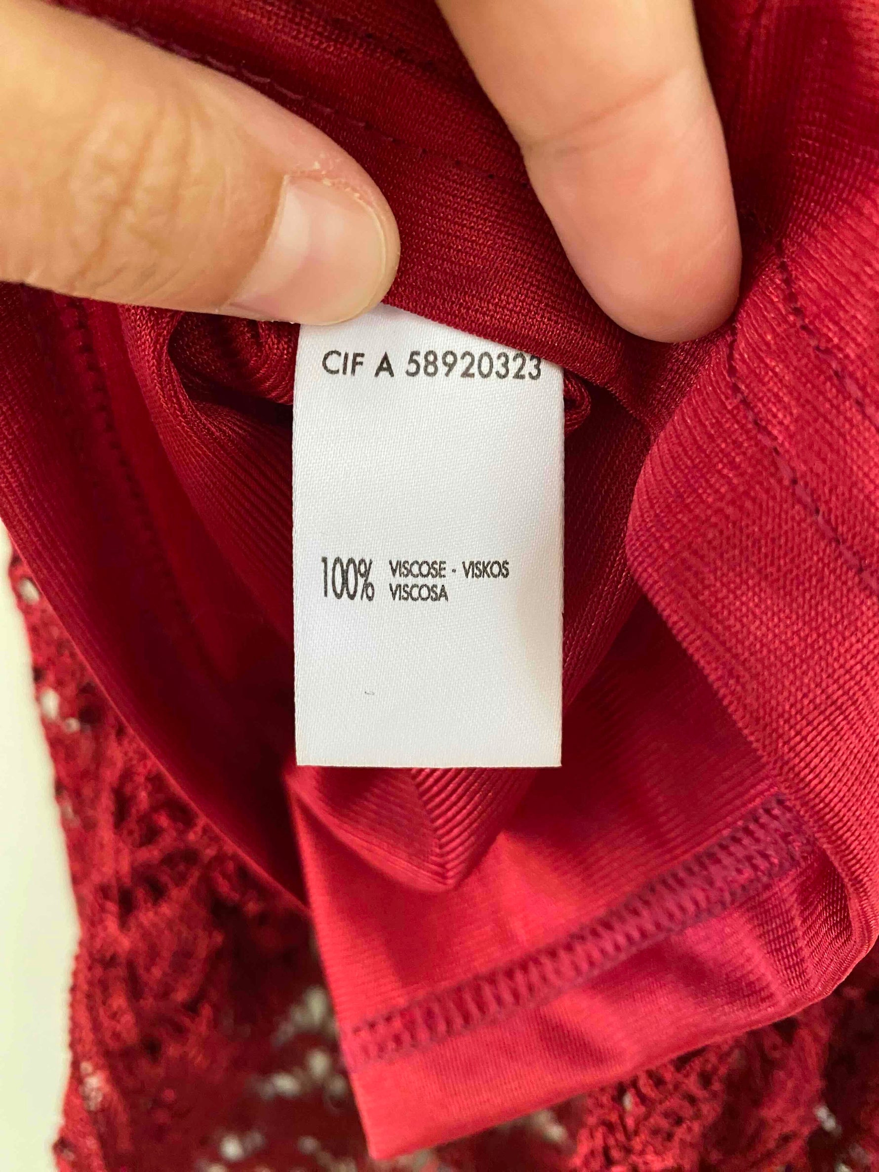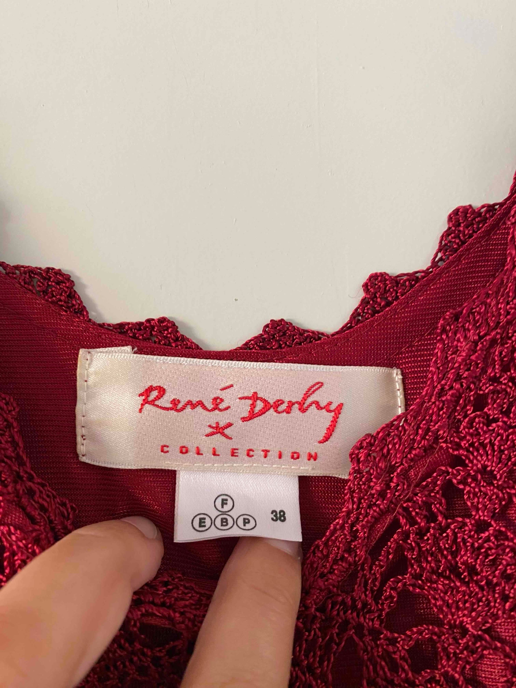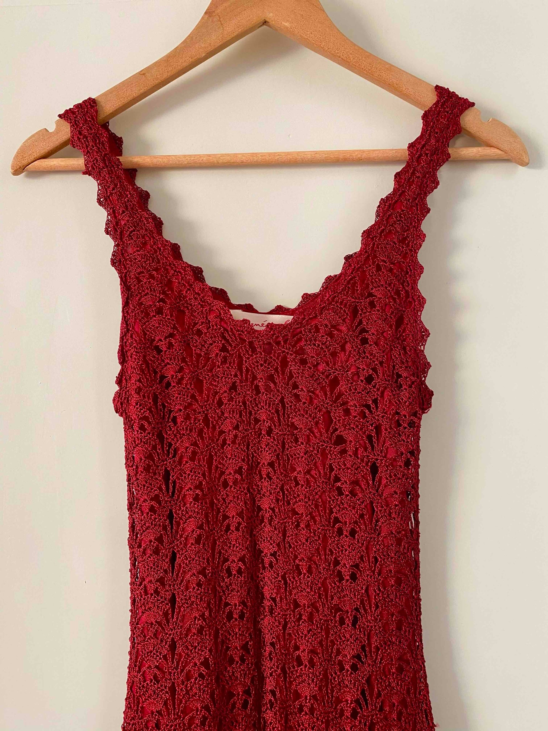 Prix unitaire parRobe en crochet, crochet viscose rouge cerise doublée, bretelles brodées, forme fit and flare, René Derhy, taille 36 actuelle portée ici sur un mannequin T36, aisselles 42cm.