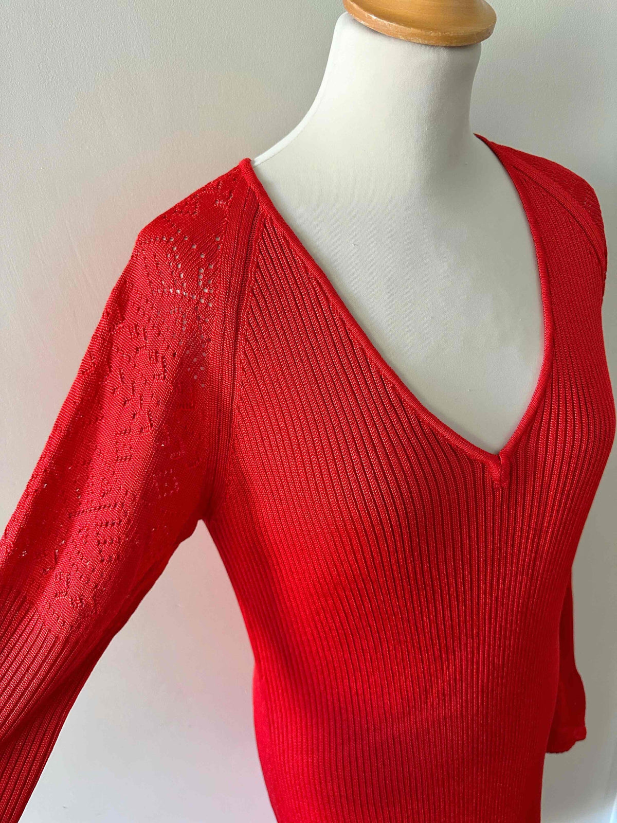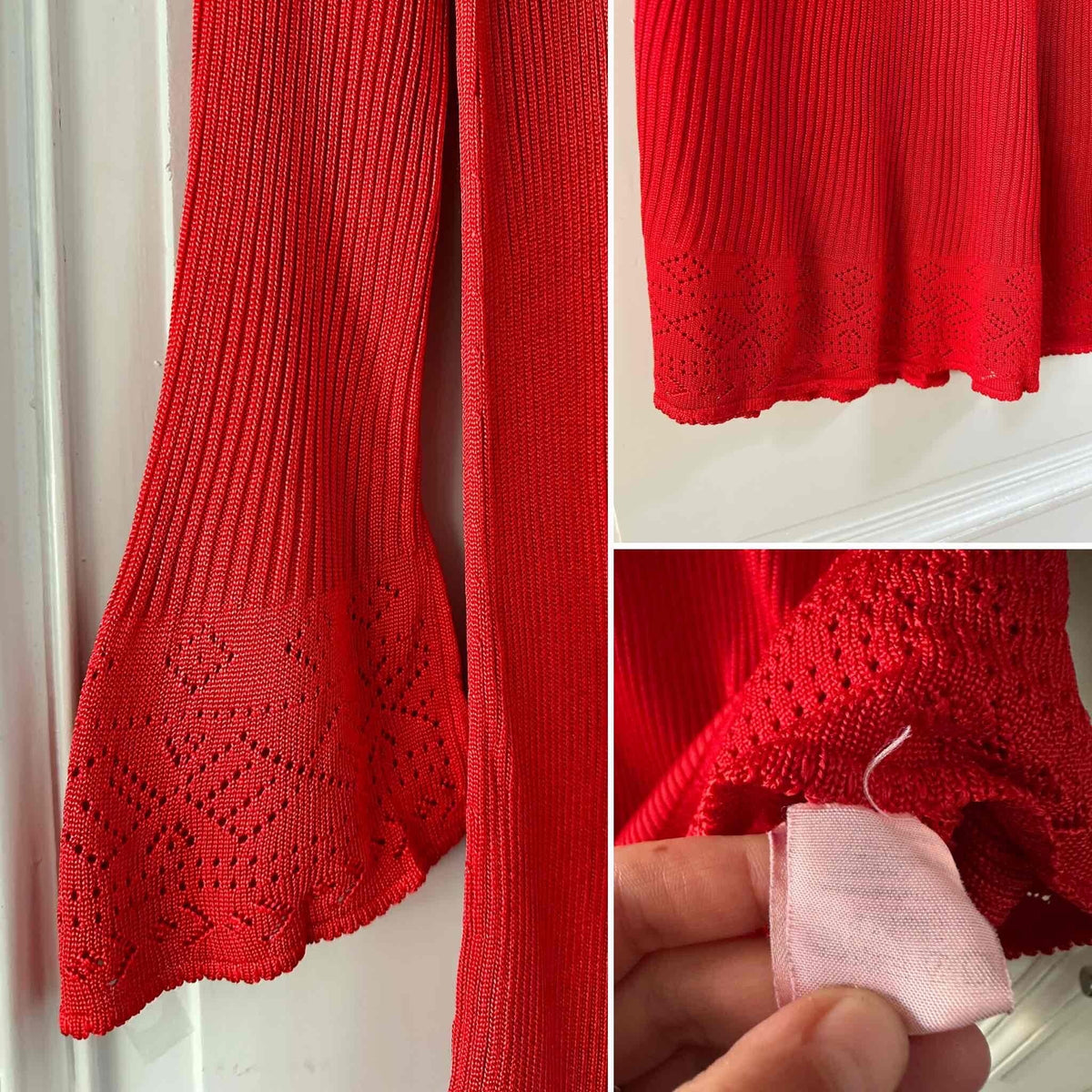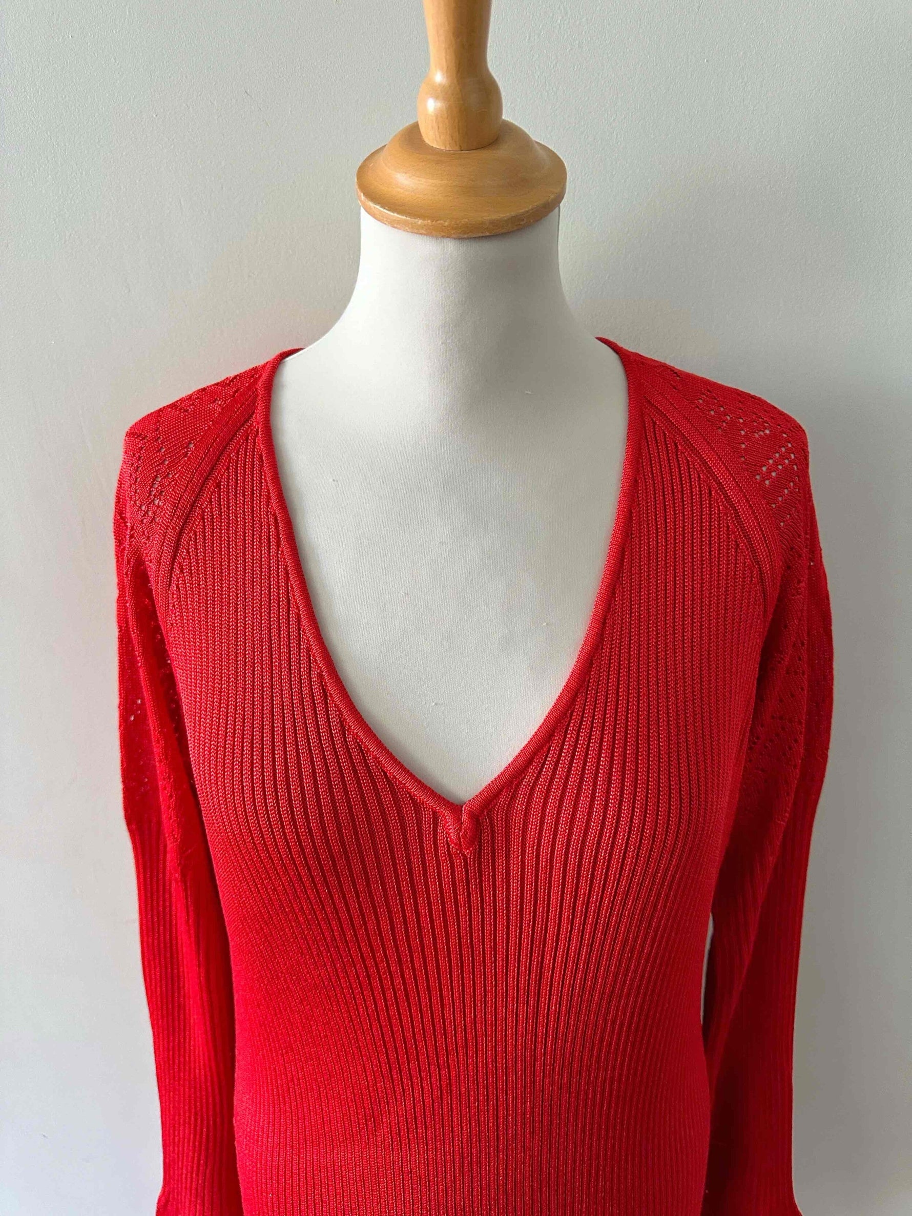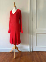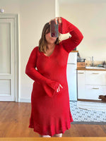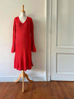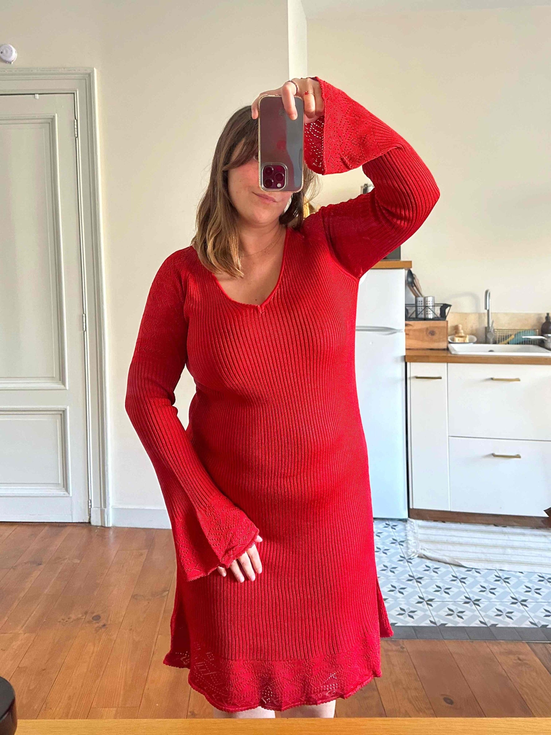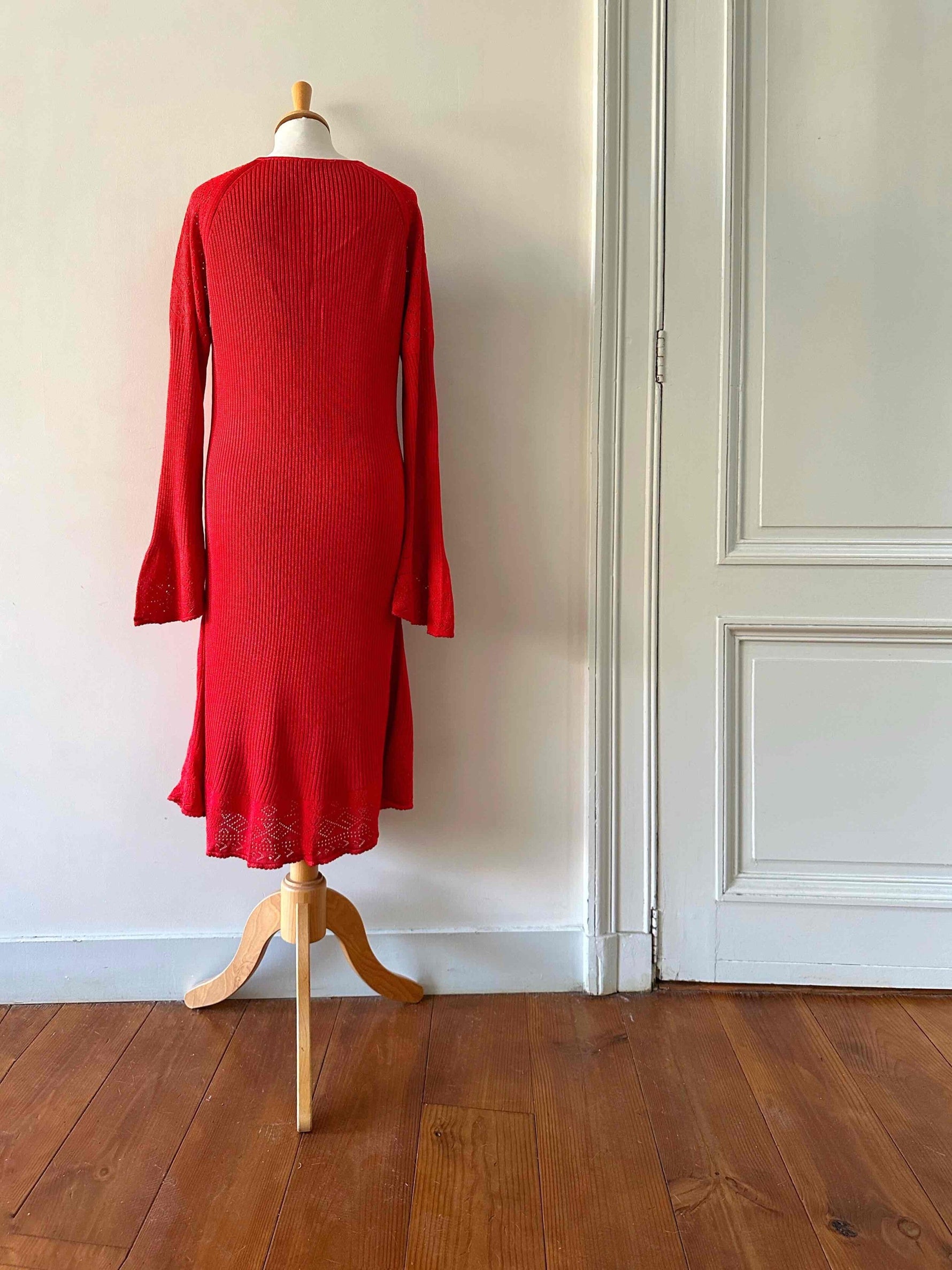 Robe en maille et crochet, rouge vermillon, maille côtelée fine en viscose, détails de motifs au crochet ajourés en bas et aux bas de manches, manches trompettes évasées, années 90s, convient aux tailles 38 et 40 portée ici sur un mannequin T36 et une personne T40.