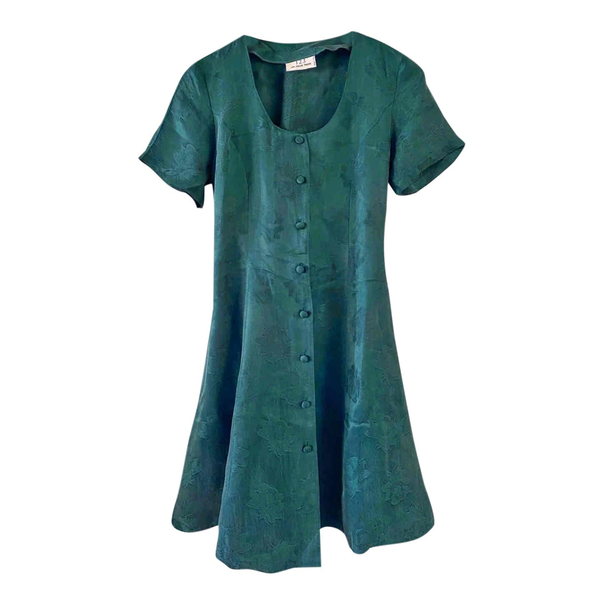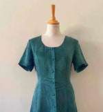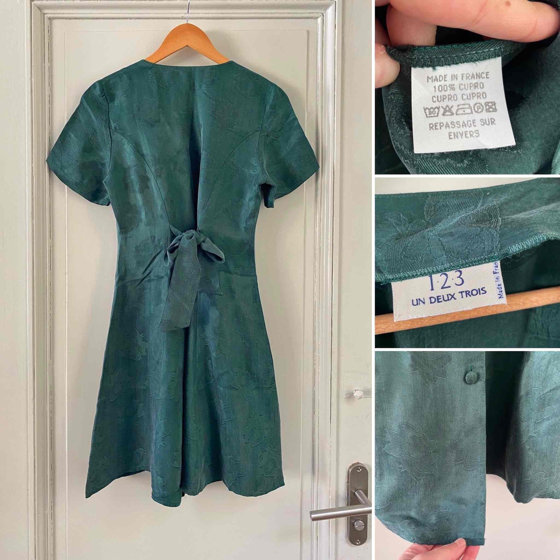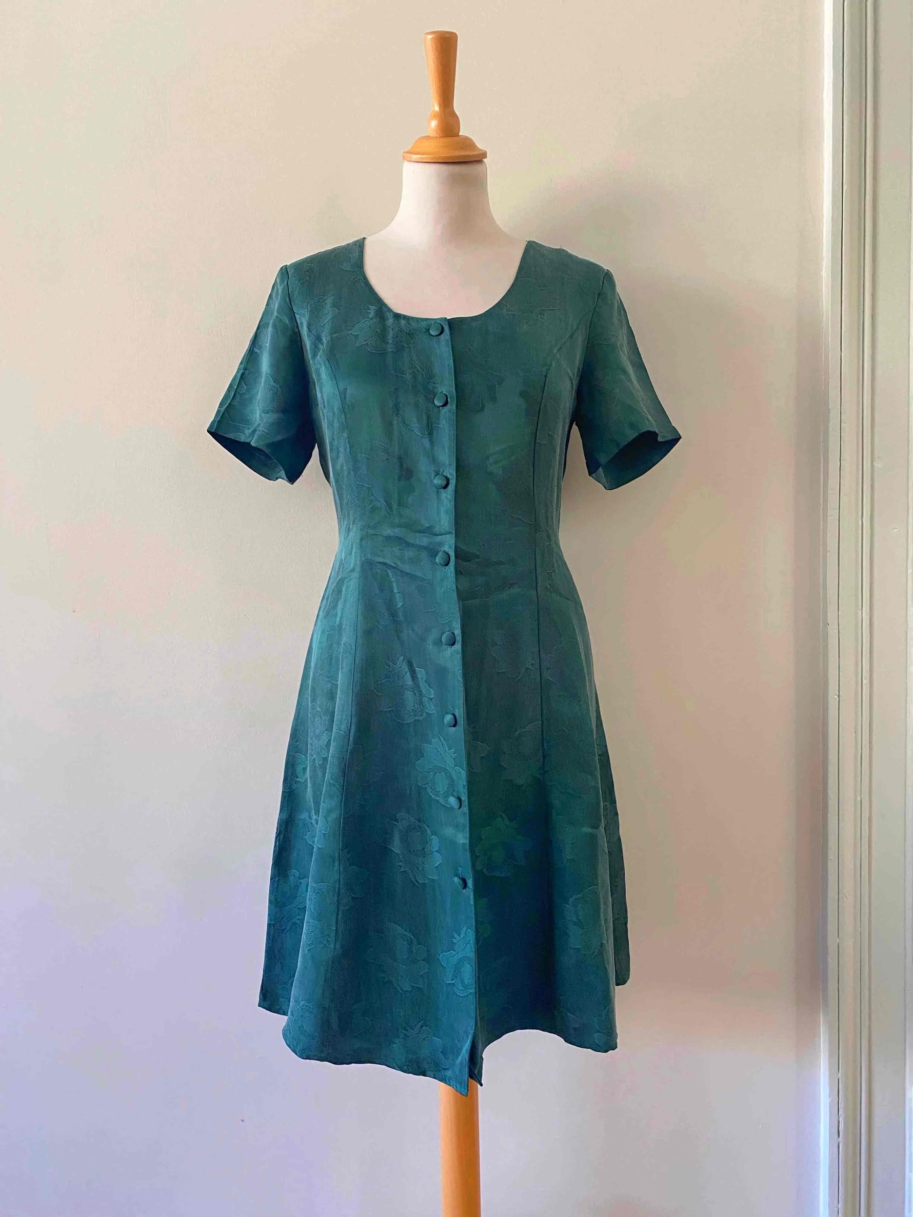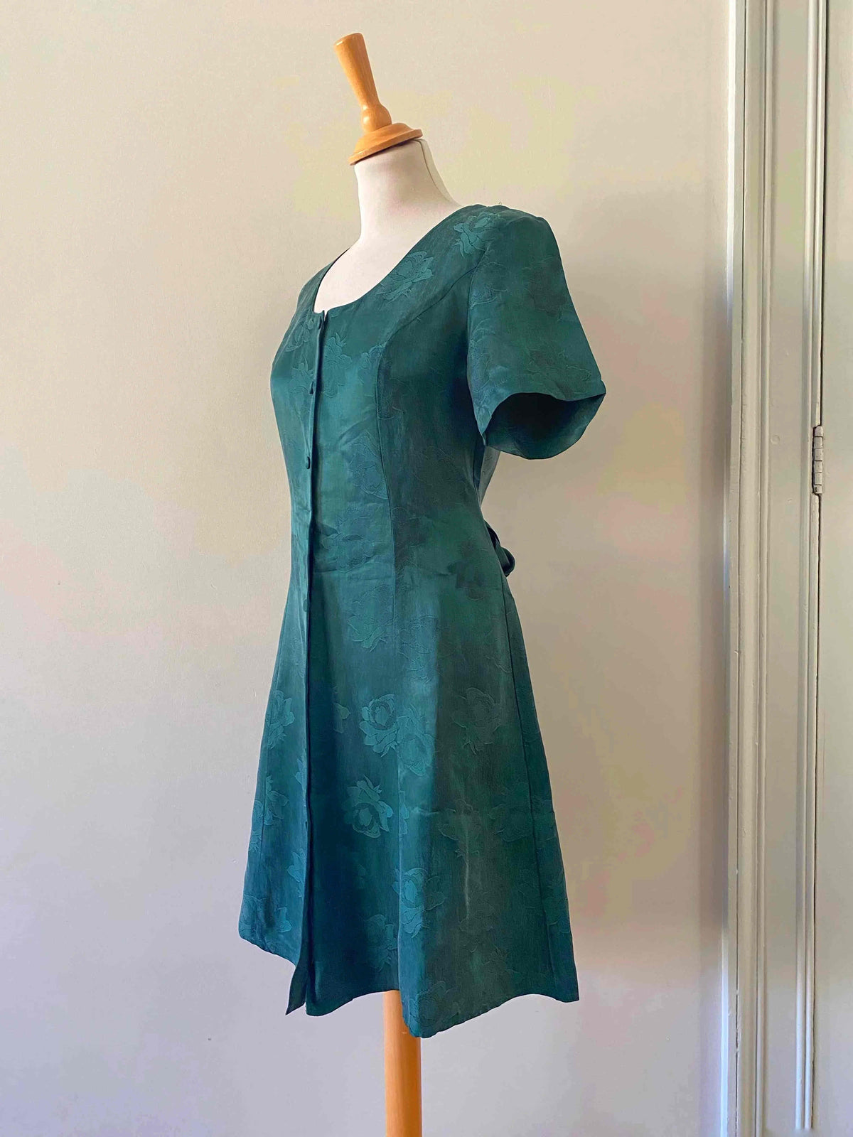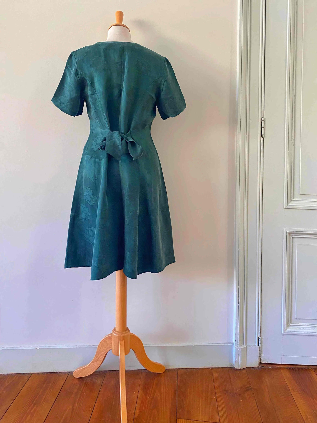 Robe damassée à fleurs, en cupro satiné vert émeraude jacquard damassé fleuri, boutons recouverts, taille dos à nouer, forme fit and flare, fabriquée en France, taille 36 portée ici sur un mannequin T36, aisselles 44cm.
