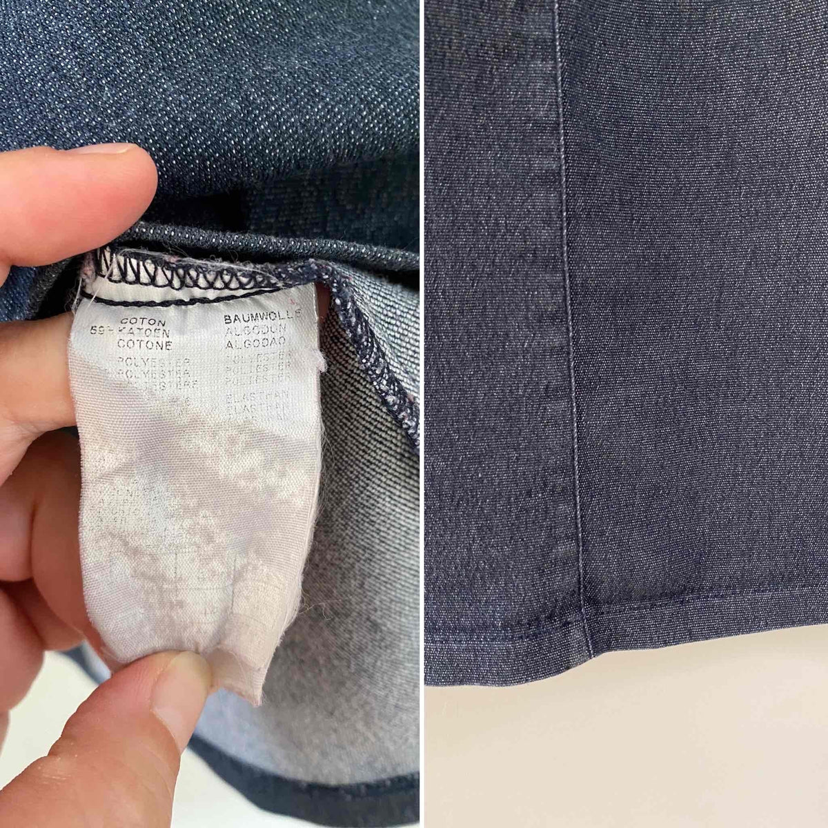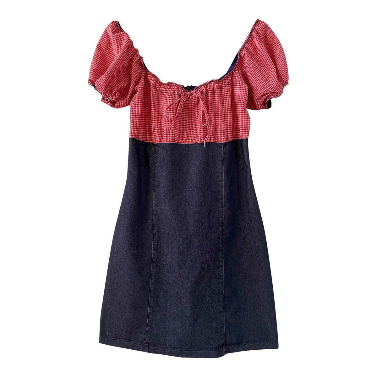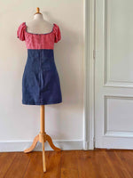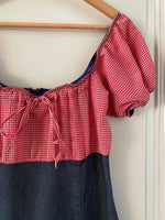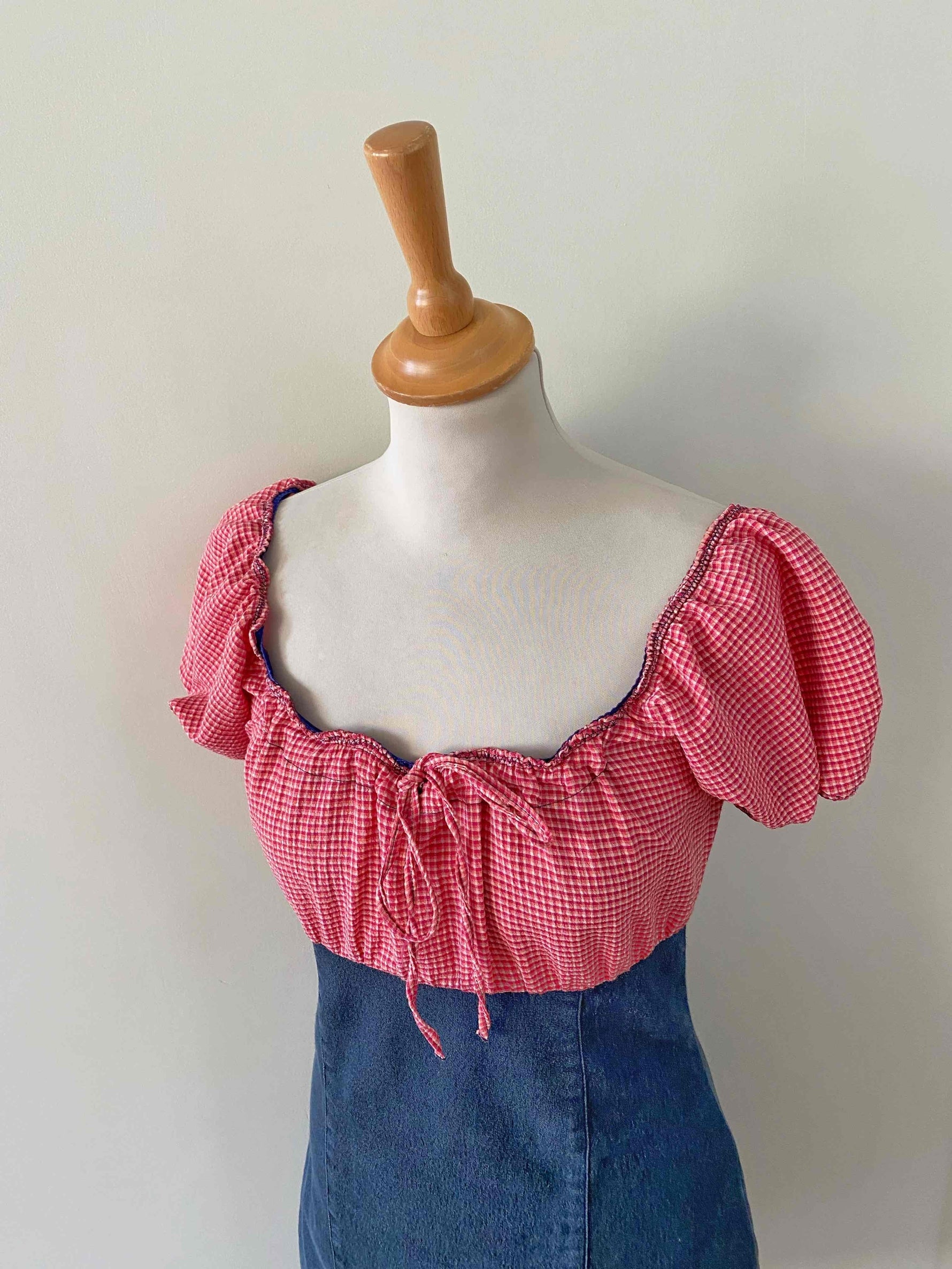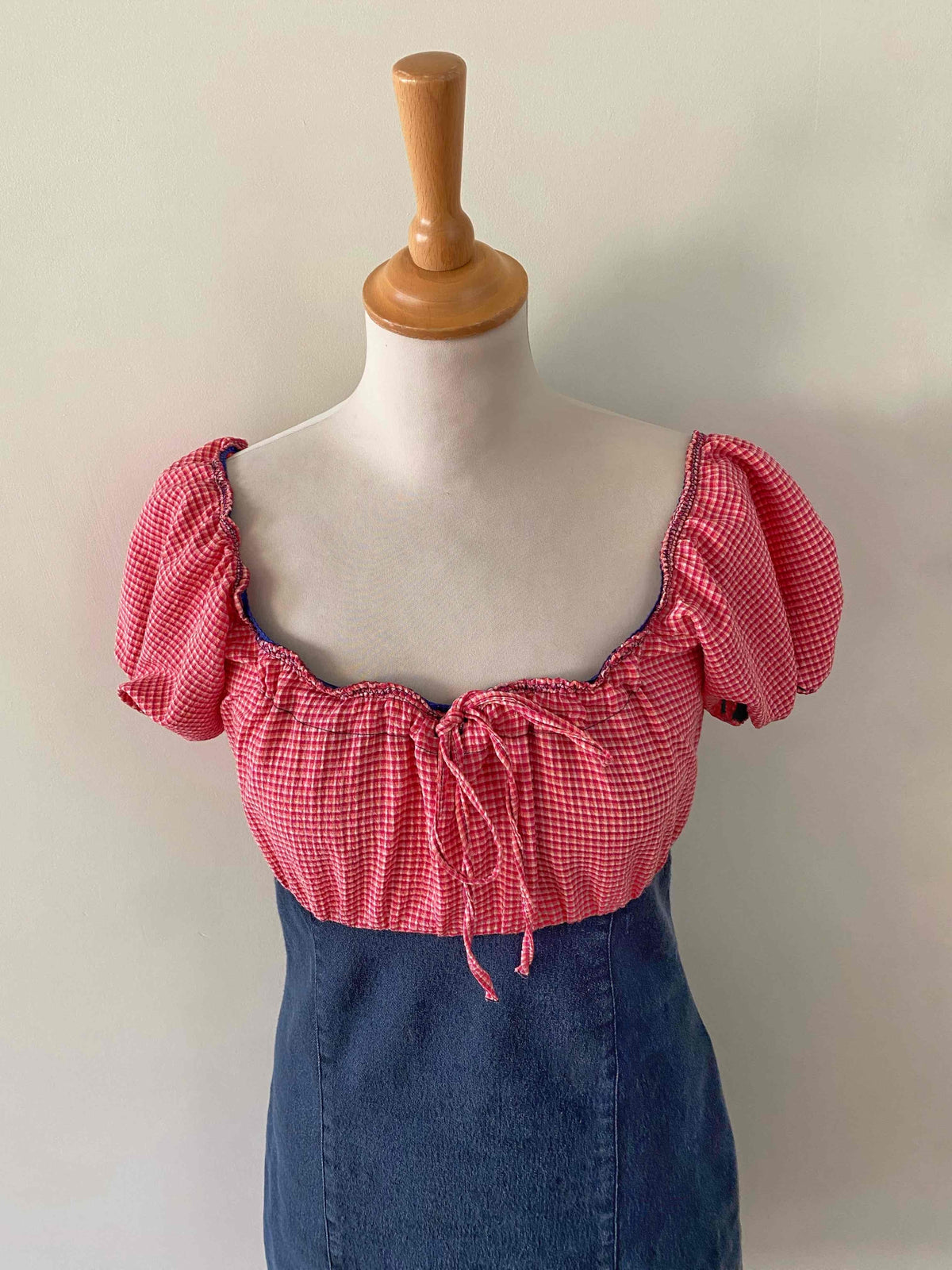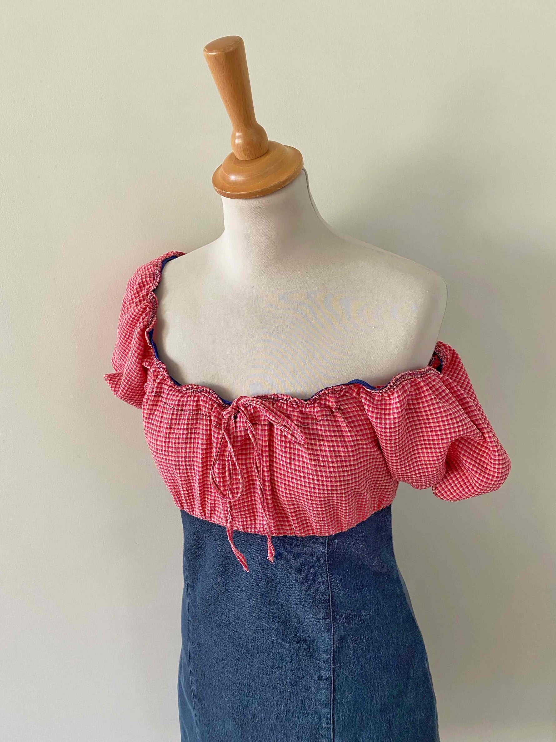 Prix unitaire parRobe en denim et vichy, bi-matiere en coton denim bleu marine, haut manches ballons en viscose à minis carreaux vichy rouges et blancs, encolure élastique à porter open shoulder, poitrine froncée à nouer, années 90’s, taille 38 portée ici sur un mannequin T36, aisselles 45cm.