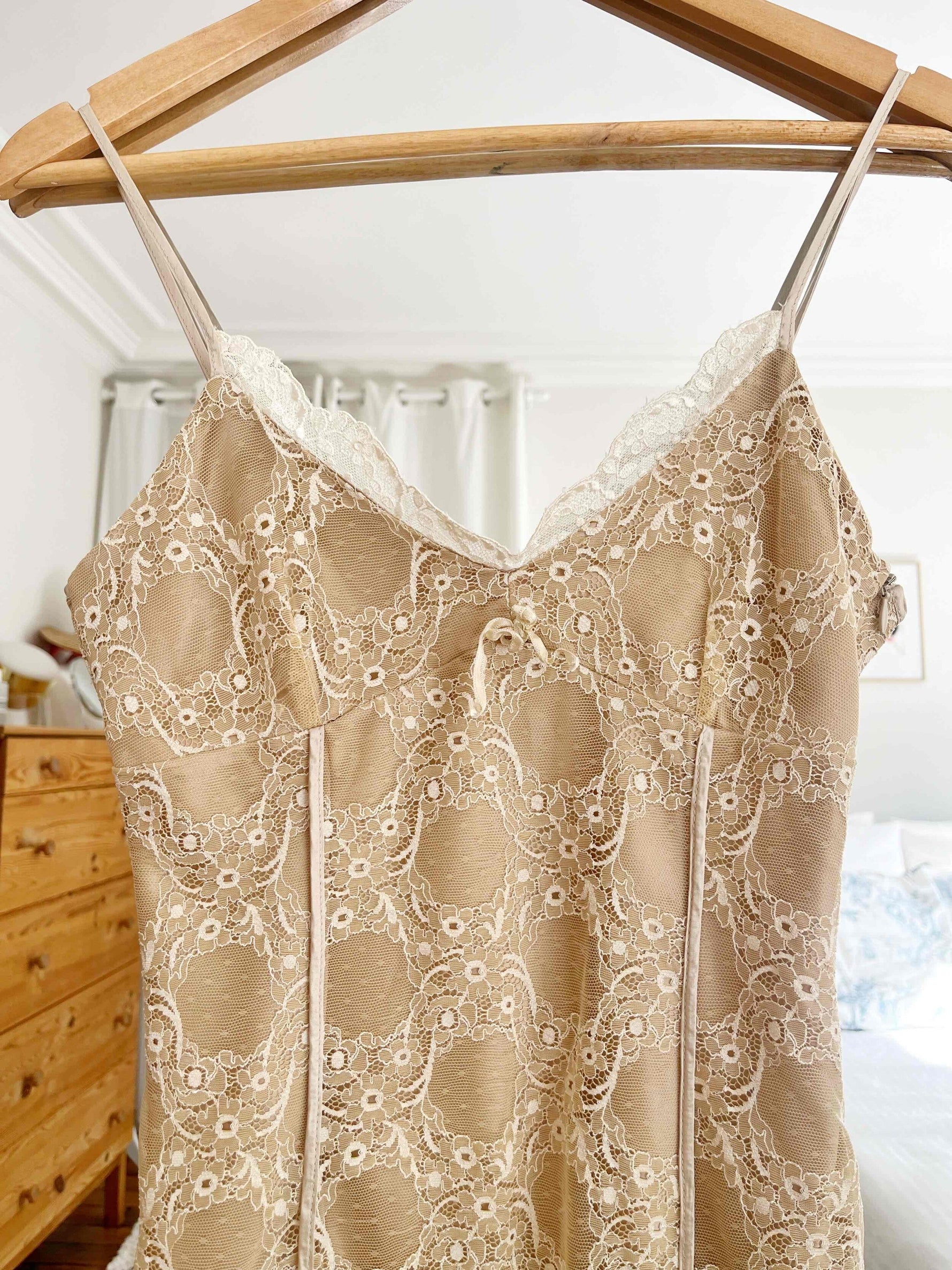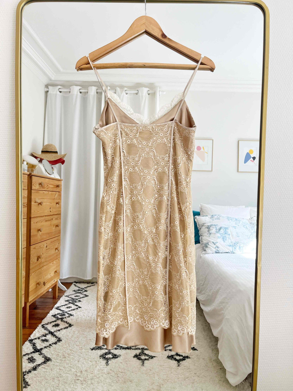 Prix unitaire parRobe en dentelle beige, décolleté en V orné de dentelle écrue, bretelles non ajustables, tissu doublé non stretch, portée ici sur une T36 pour 1m64
