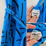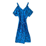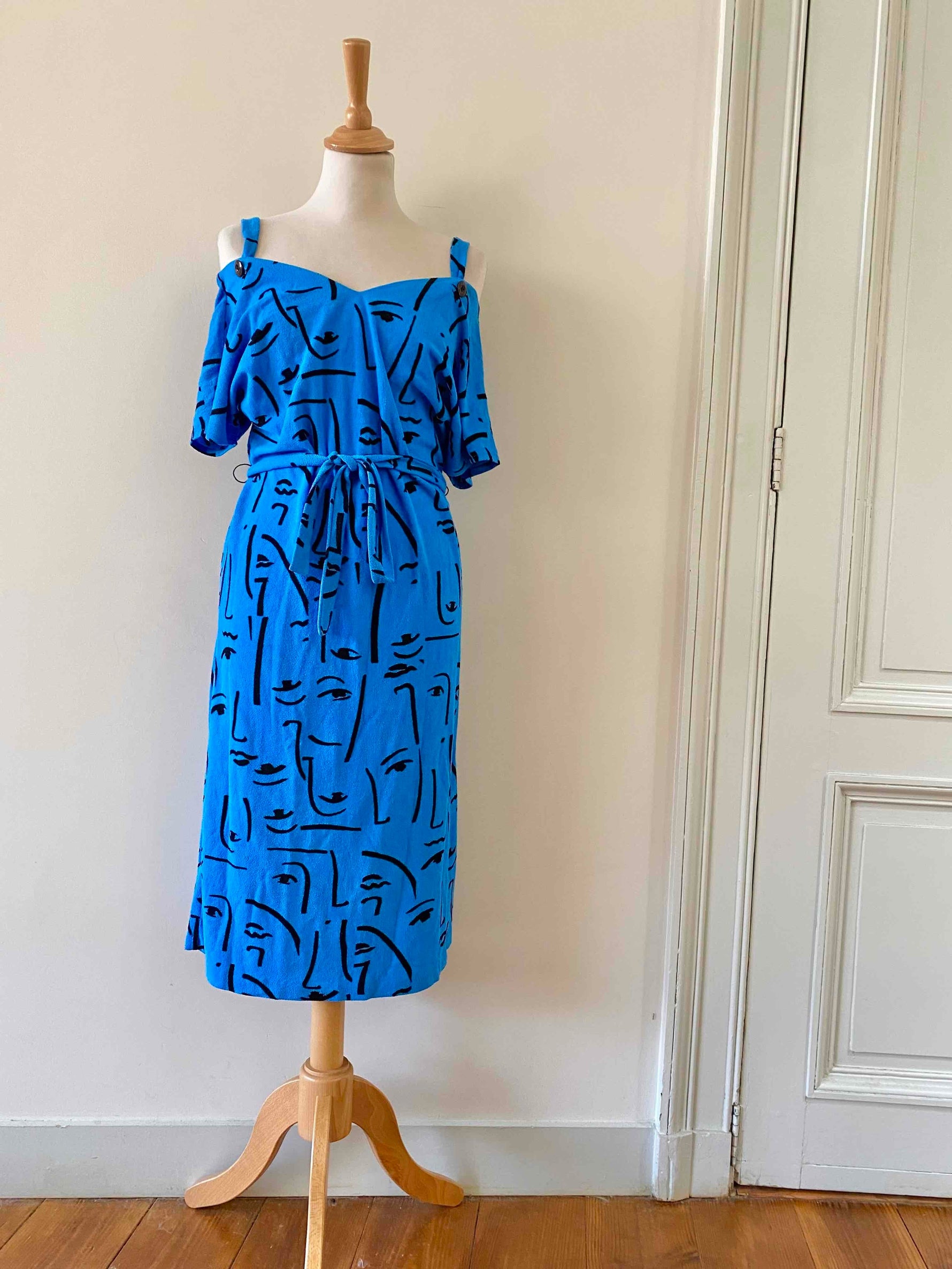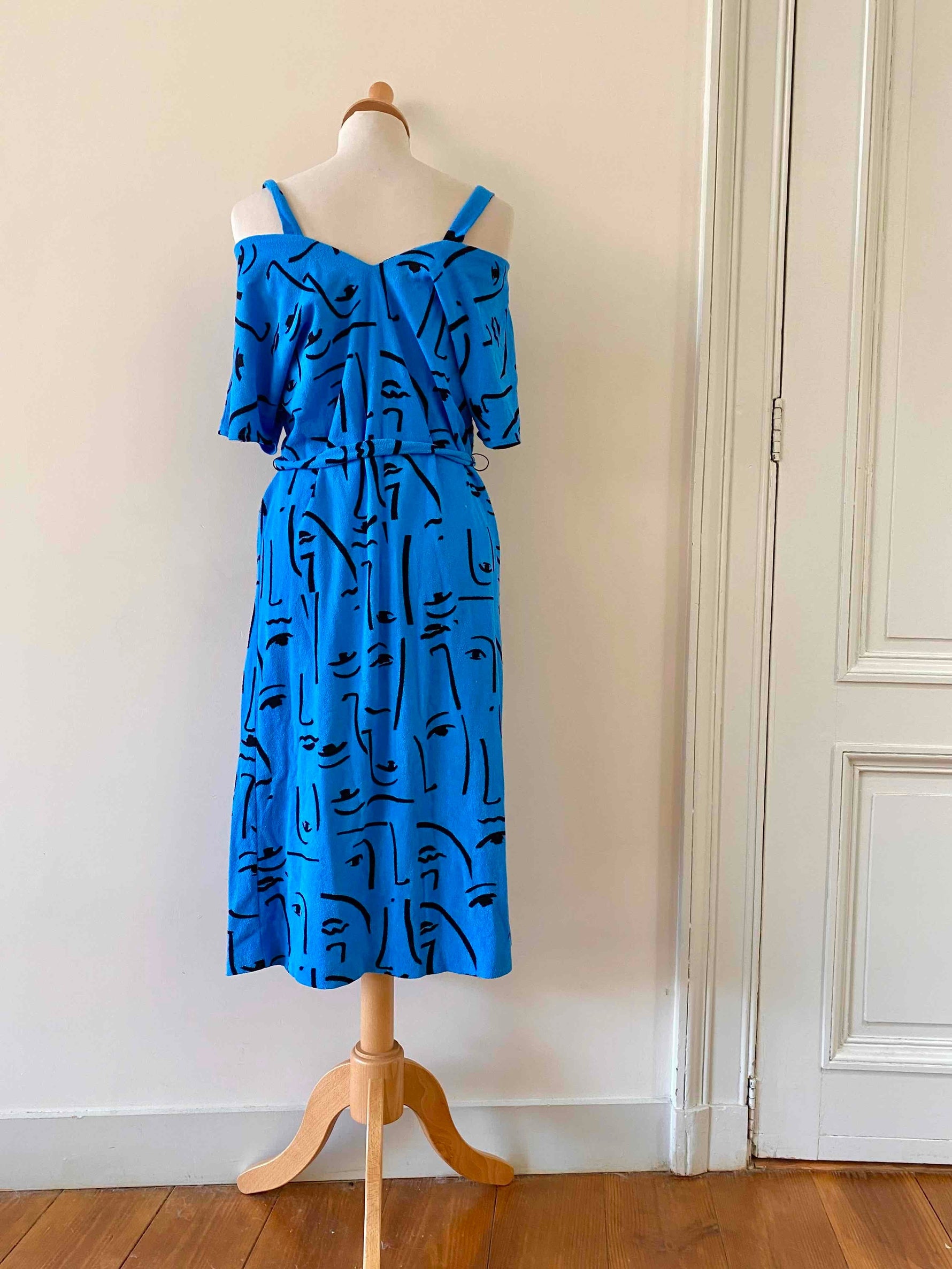 Robe en Éponge motifs visages bleue roi et noirs, bretelles boutonnées et open shoulder, ceinture à nouer taille, fabriquée en France, années 80’s, taille 36/38 portée ici sur un mannequin T36.