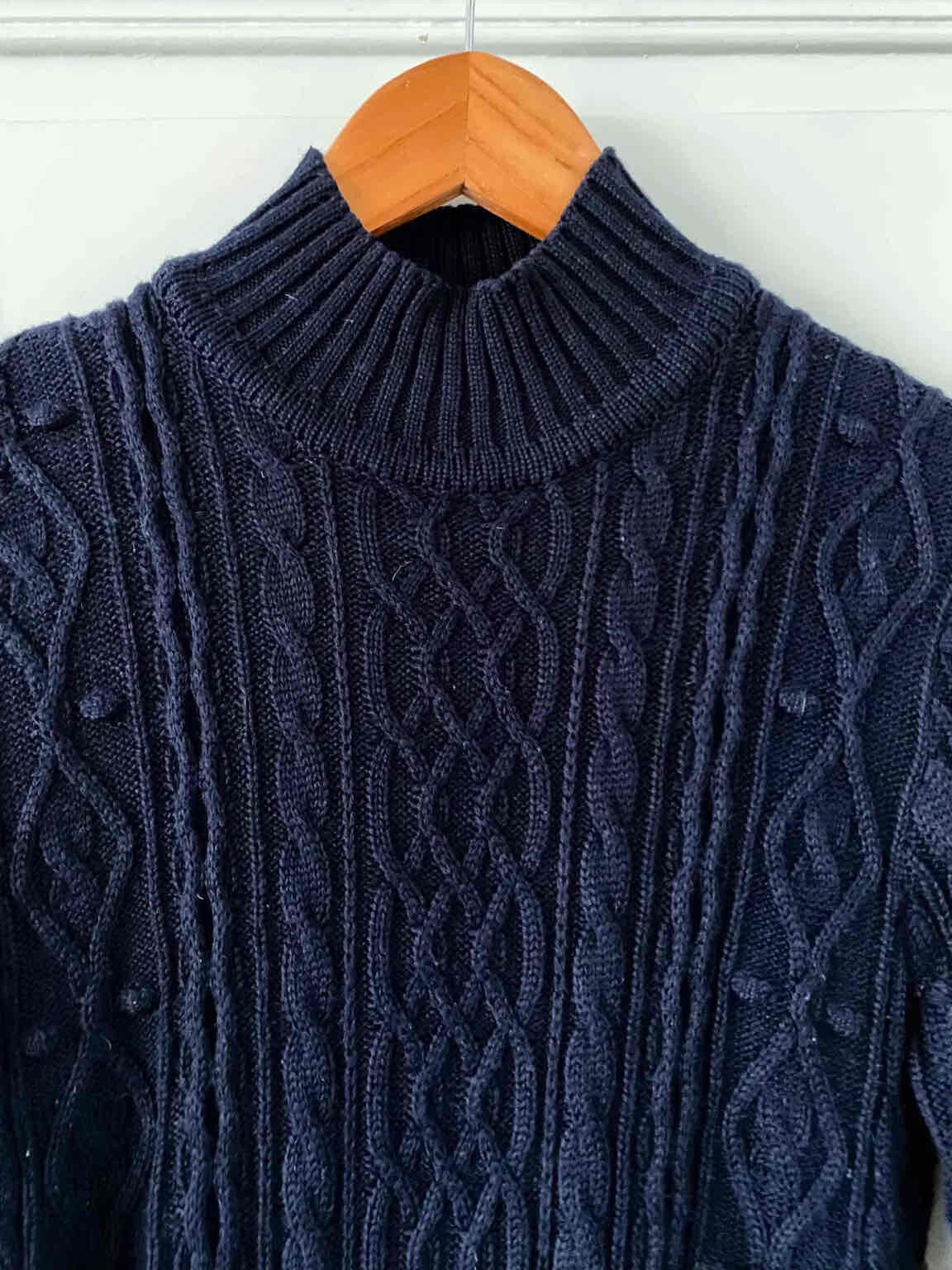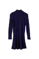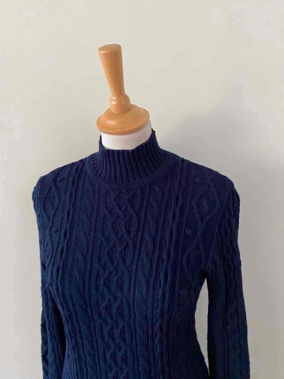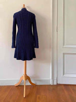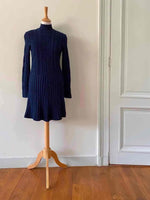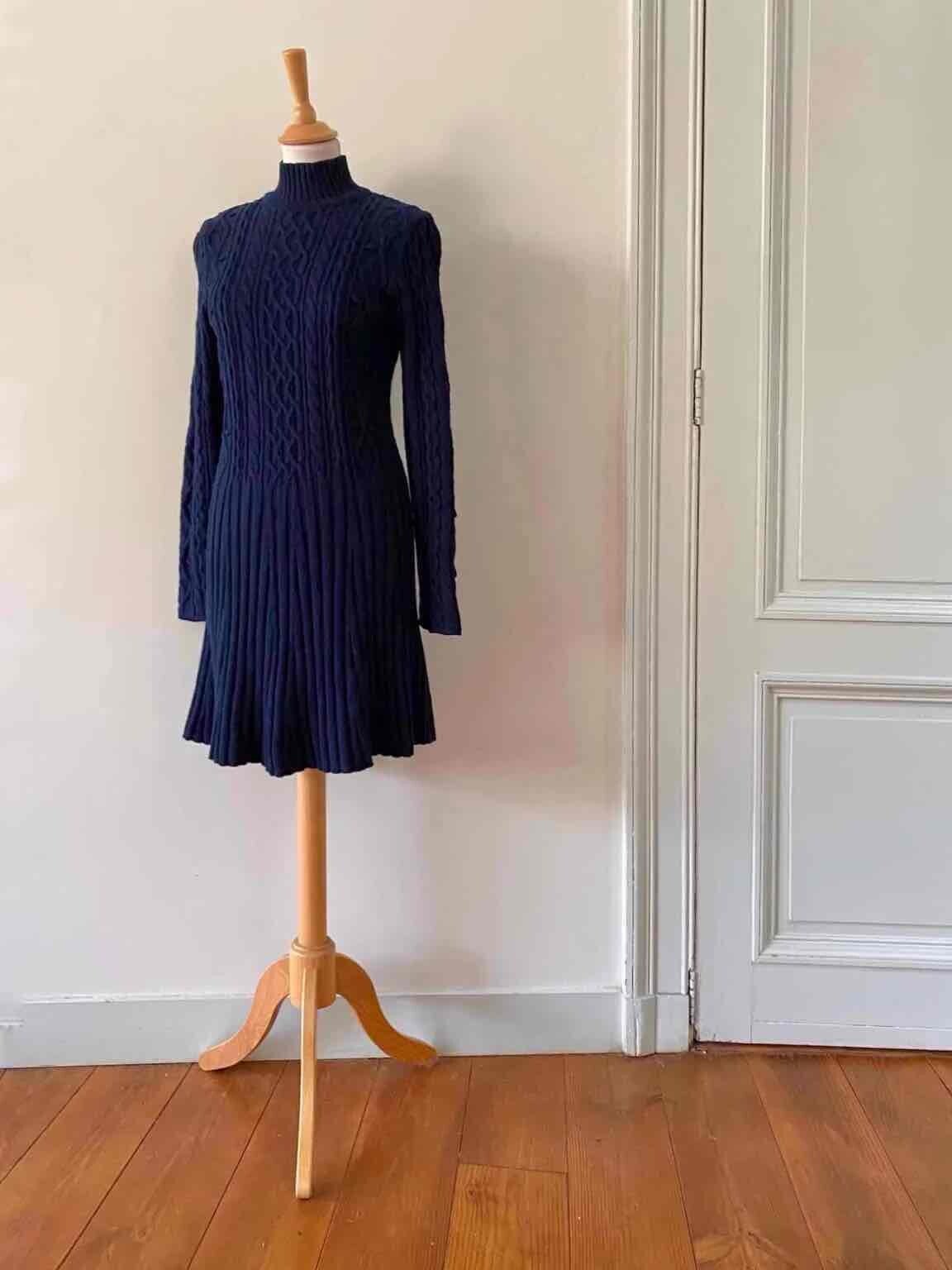 Prix unitaire parRobe en laine torsadée, laine merinos mélangée bleue marine, col montant, maille torsadée et pompons, bas flare en maille côtelée, taille 36 portée ici sur un mannequin T36, aisselles 43cm.