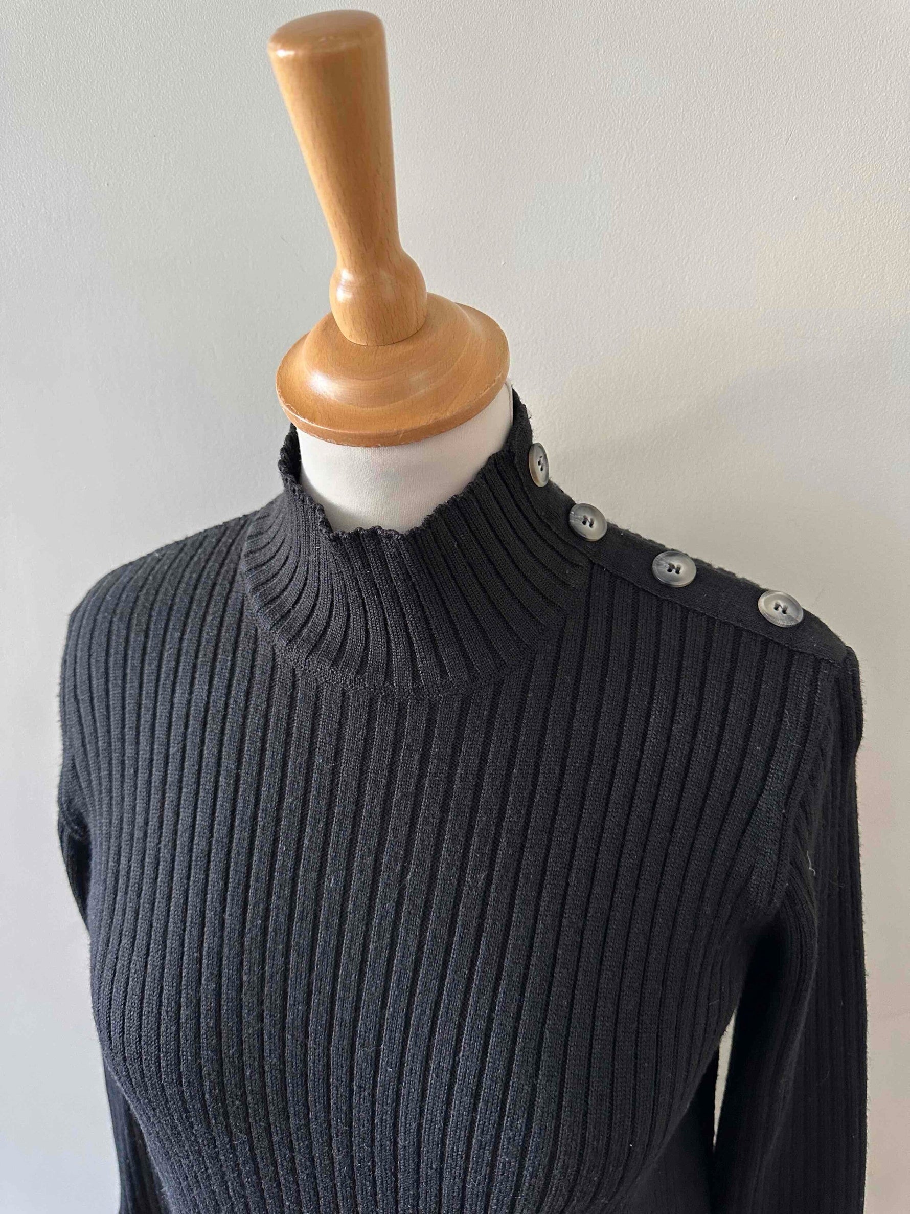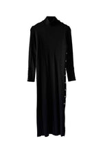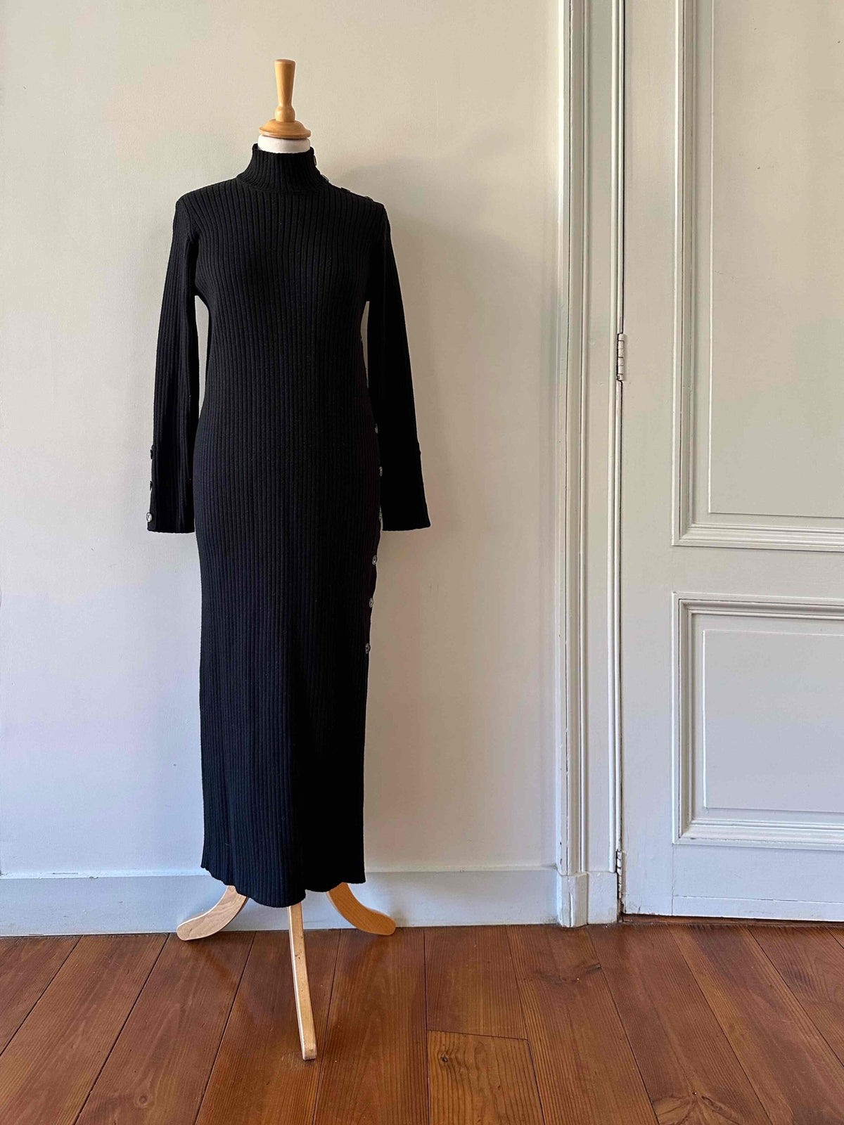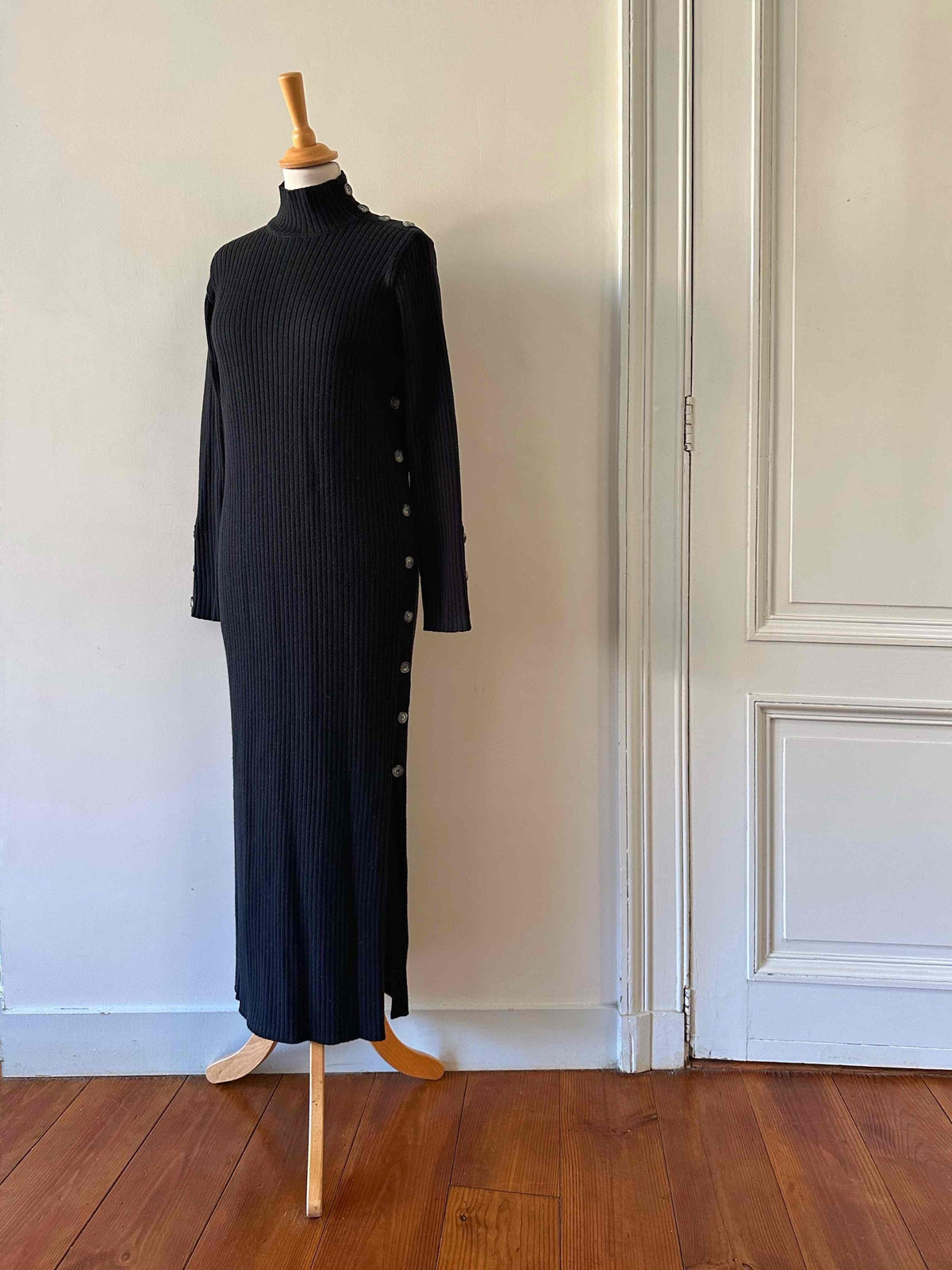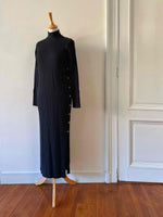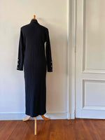 Prix unitaire parRobe longue en laine, maille cotelee noire, col cheminé, details de boutons aux manches, à l'epaule, et sur un côté fendu, convient aux tailles 36 et 38 portée ici sur un mannequin T36.