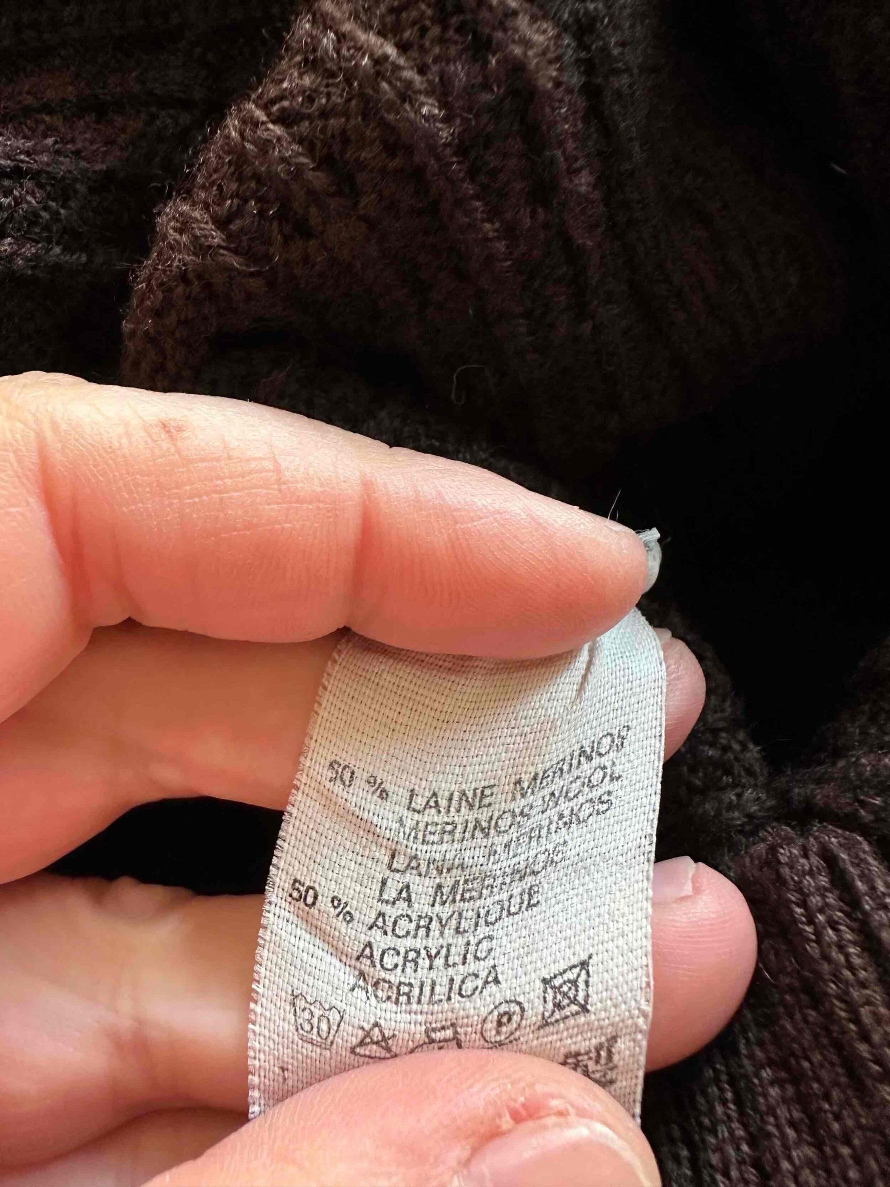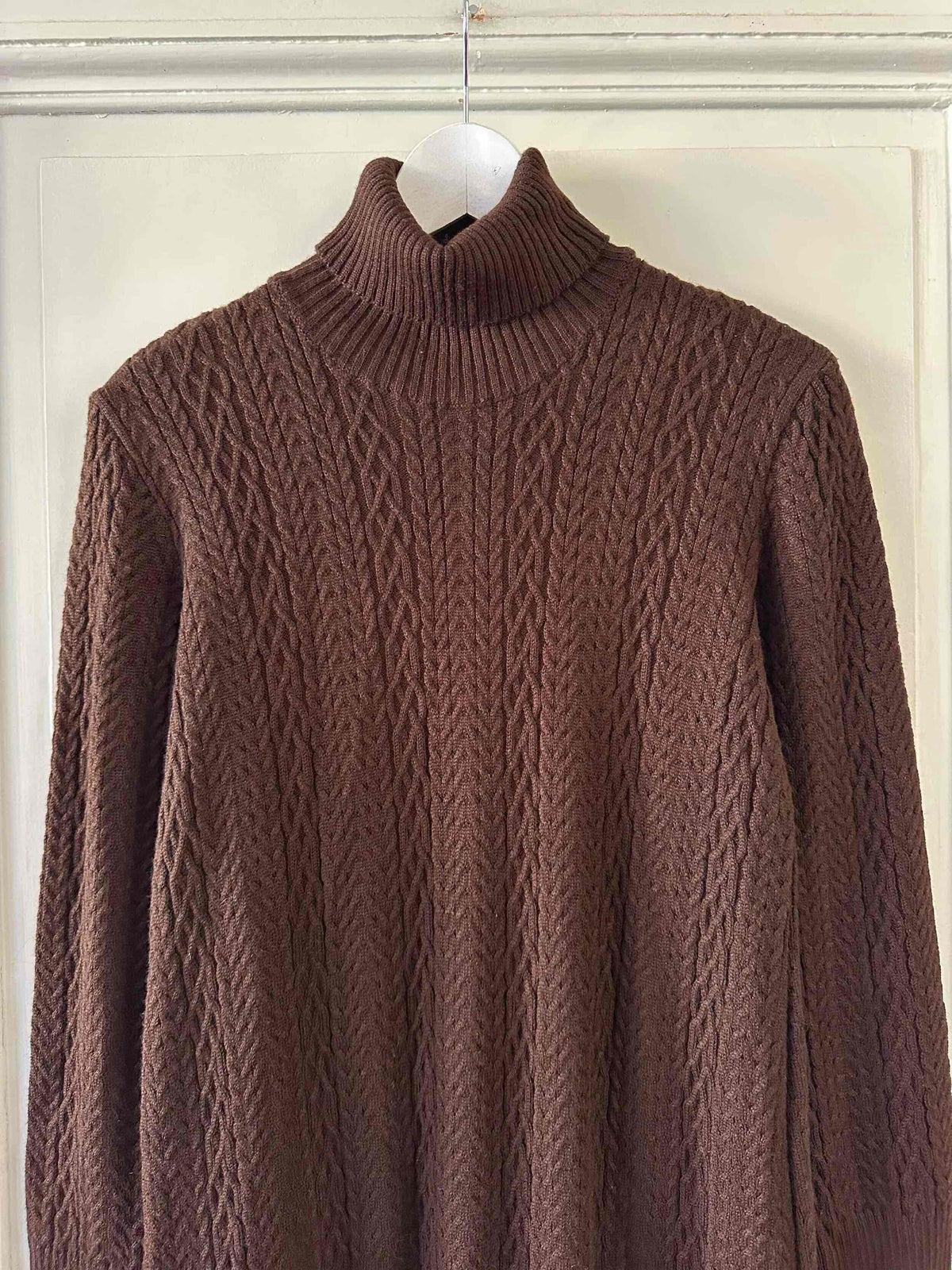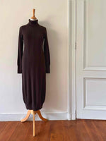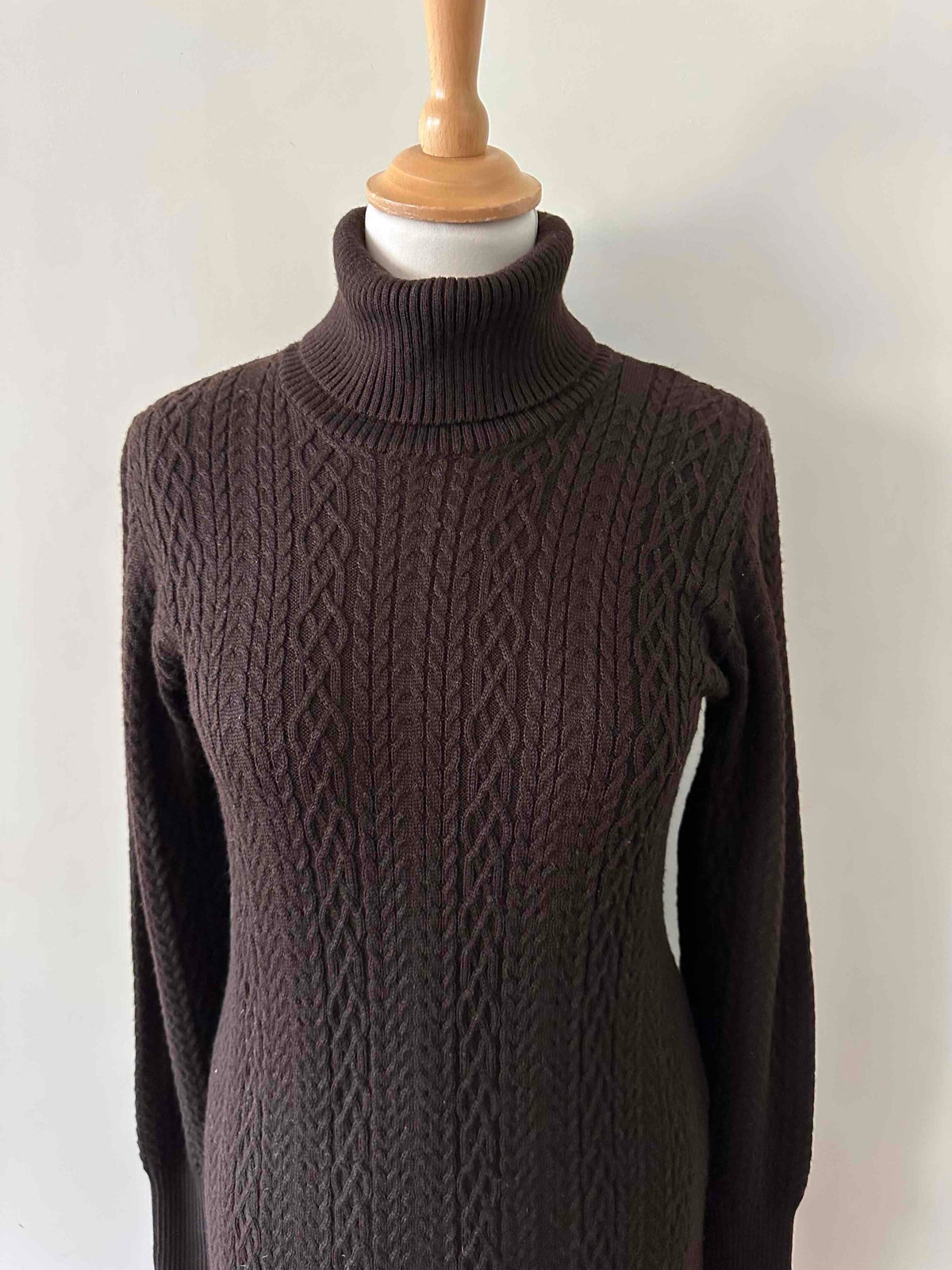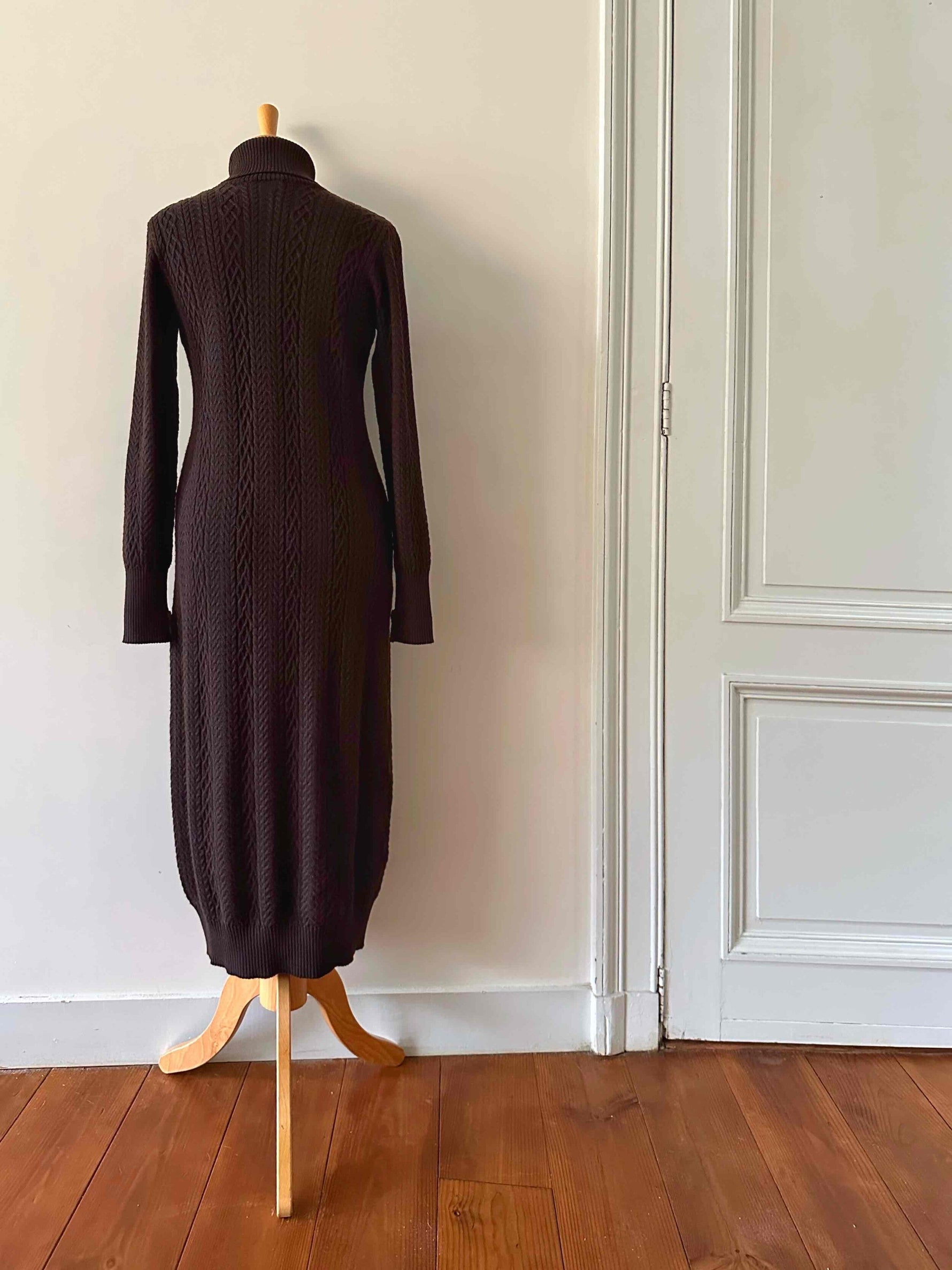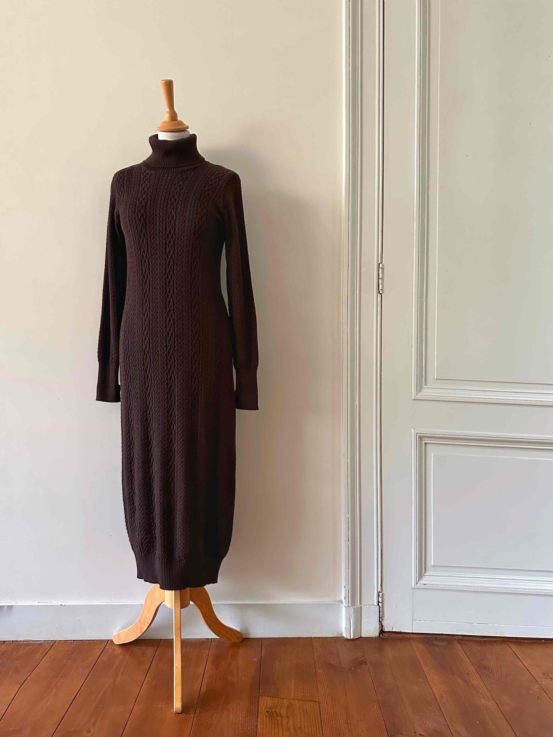 Prix unitaire parRobe longue en laine, maille torsadée chocolat, col roulé, robe pull, convient aux tailles 34 et 36 portée ici sur un mannequin T36.