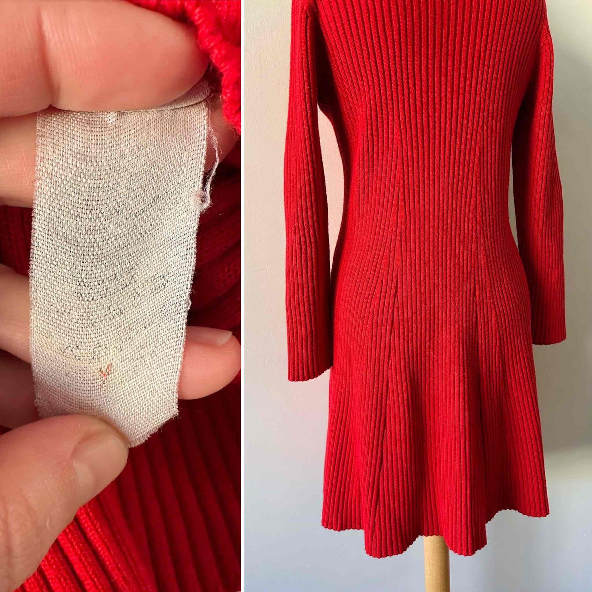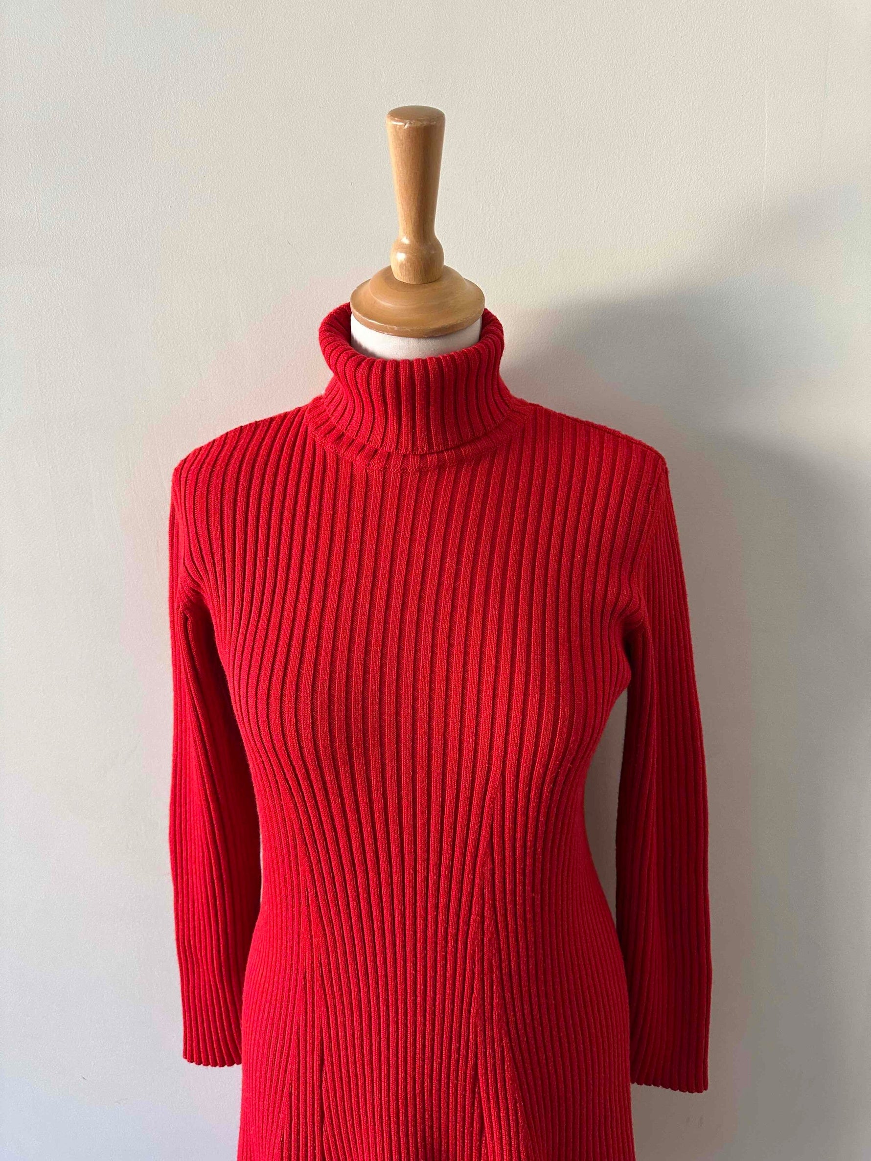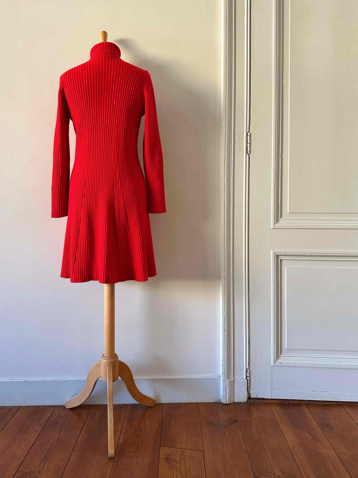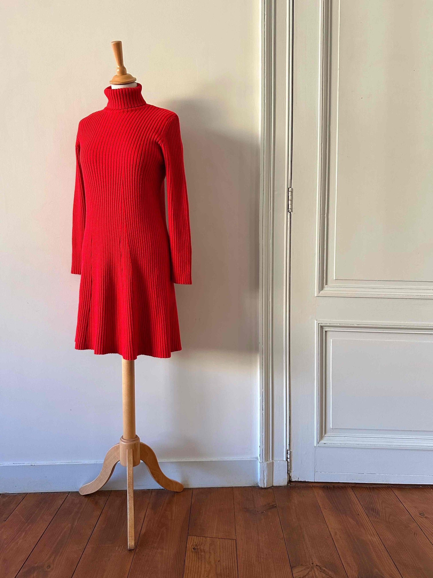 Robe en laine, laine merinos mélangée rouge vermillon, col roulé, maille côtelée, bas flare, taille 36 portée ici sur un mannequin T36, aisselles 43cm.