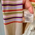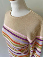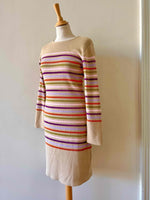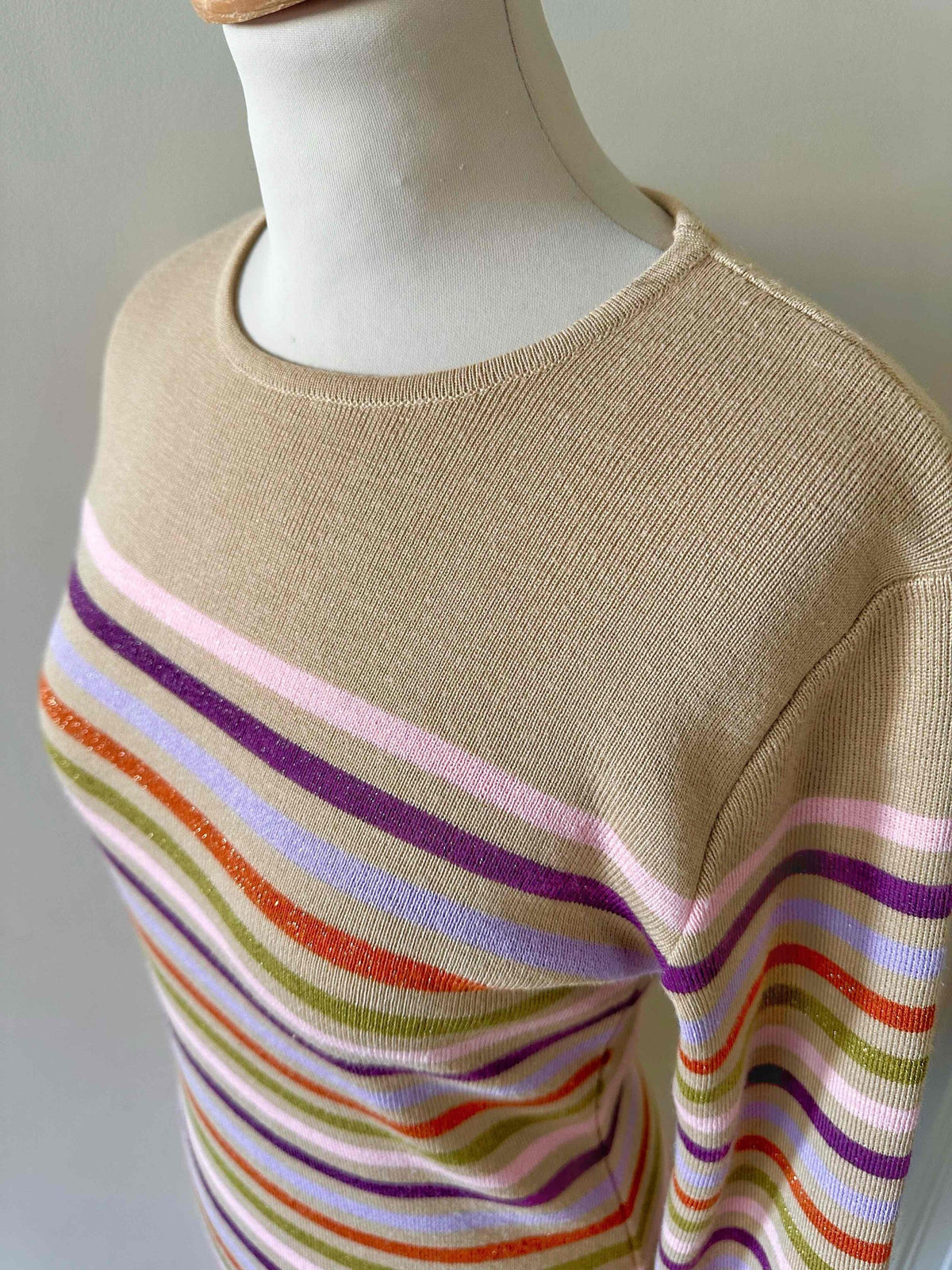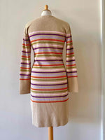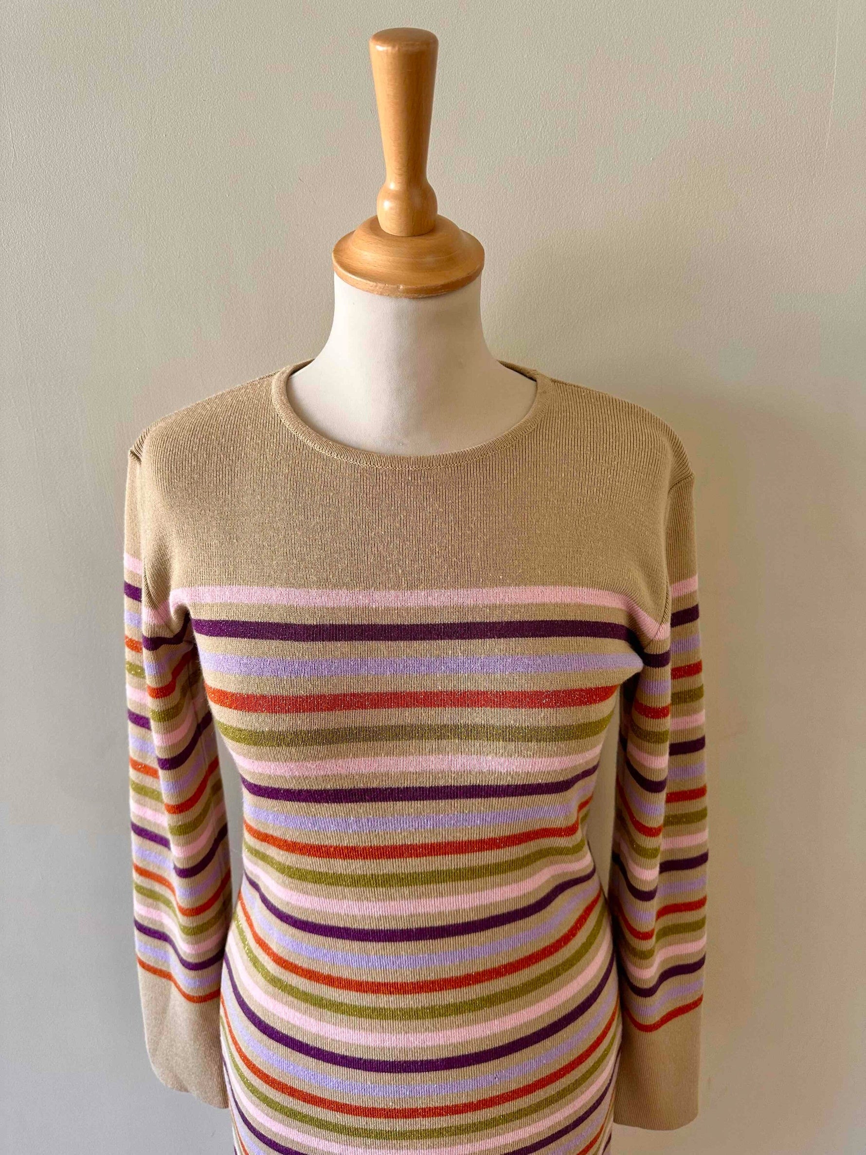 Robe en laine et lurex, laine mélangée camel et rayures lurex métallisé multicolore rose, violet, orange et vert olive, courte et manches longues, taille 36 portée ici sur un mannequin T36.