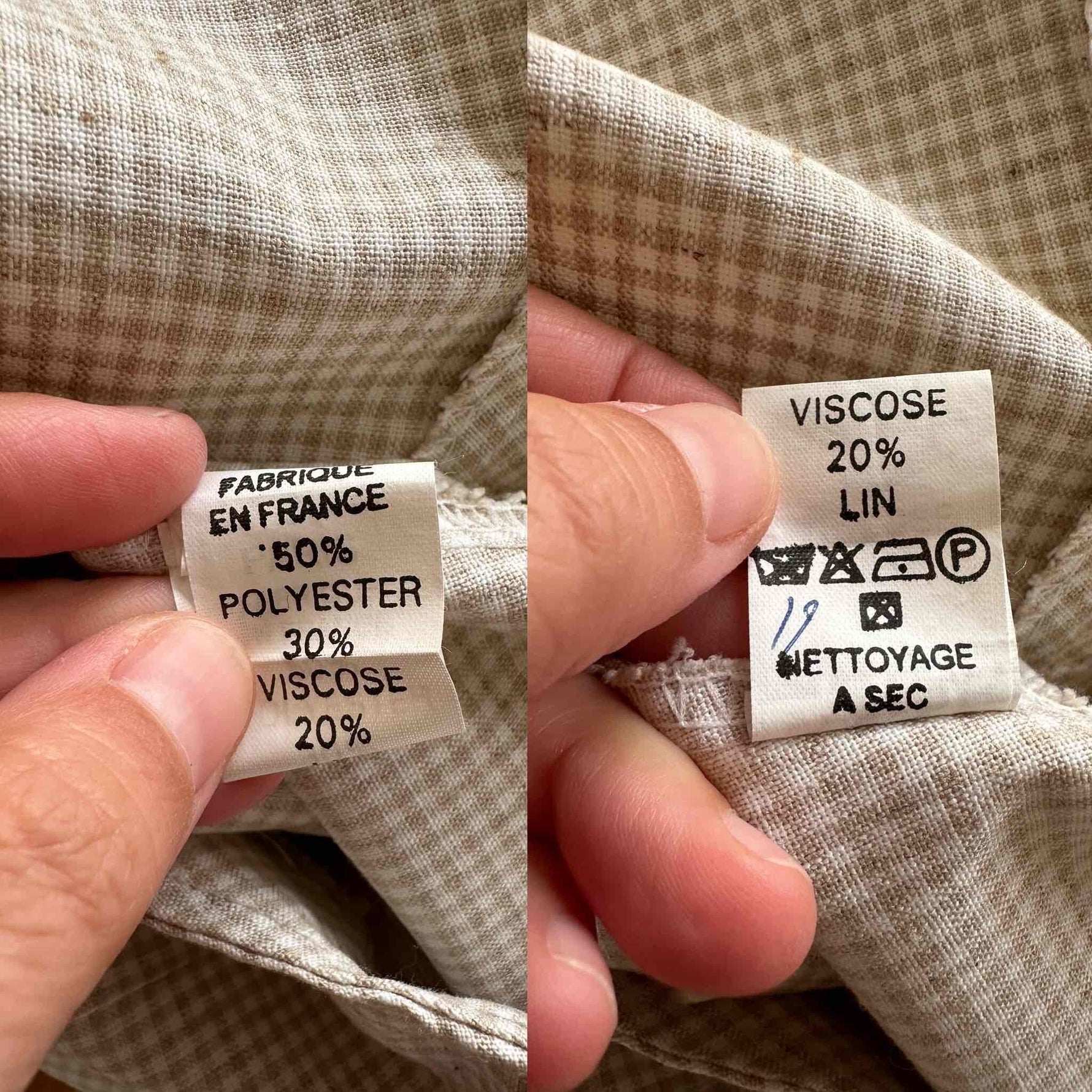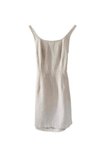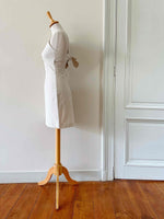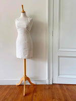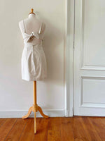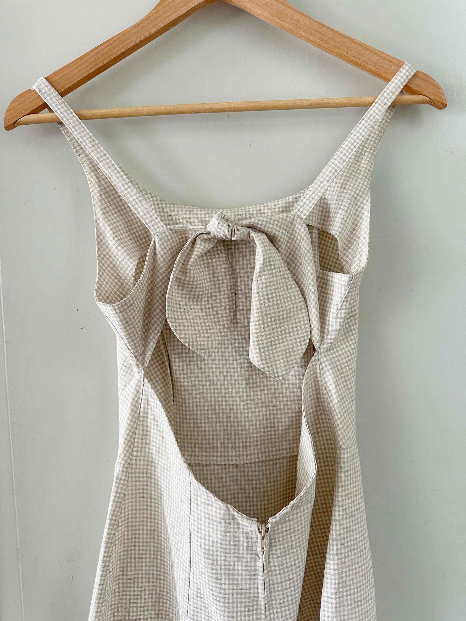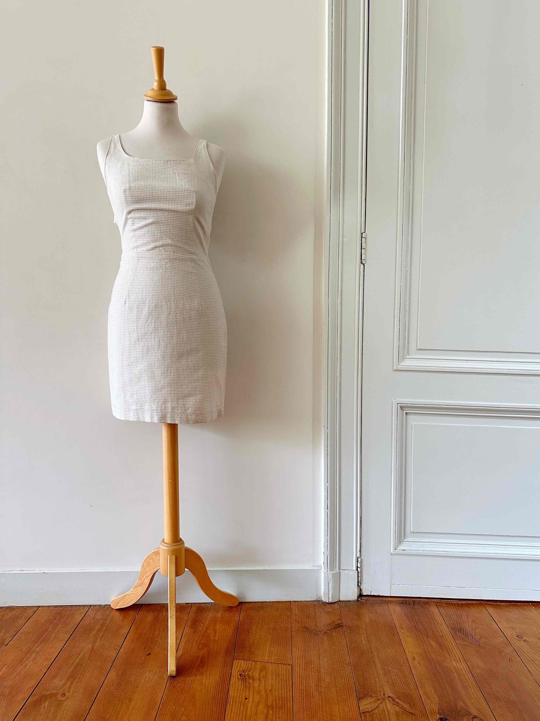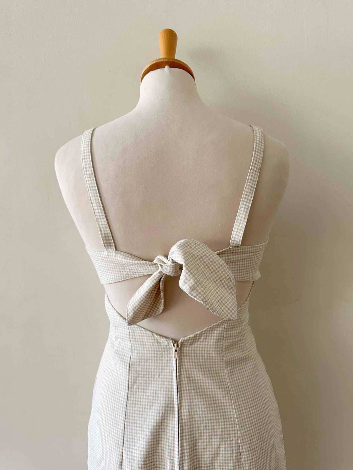 Robe vichy dos nu, en lin et viscose mélangés à carreaux vichy beige et blancs, dos à nouer par un joli nœud, fabriquée en France, convient aux tailles 34 et 36, portée ici sur un mannequin T36, aisselles 43 cm.