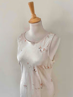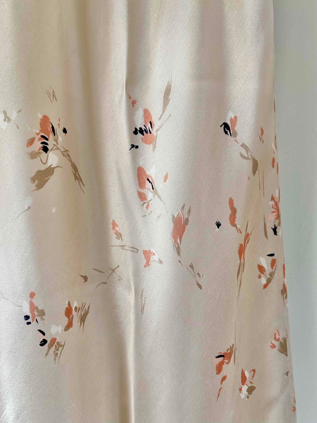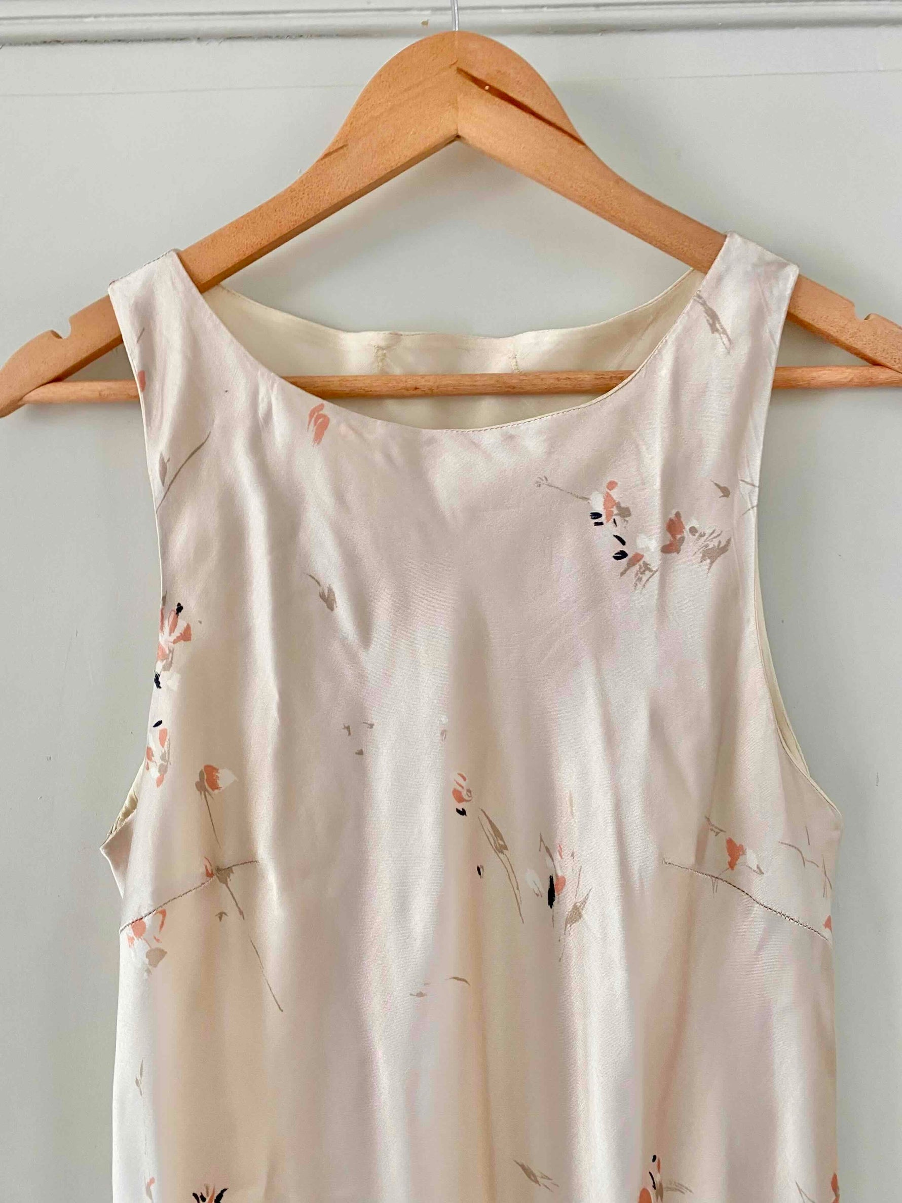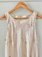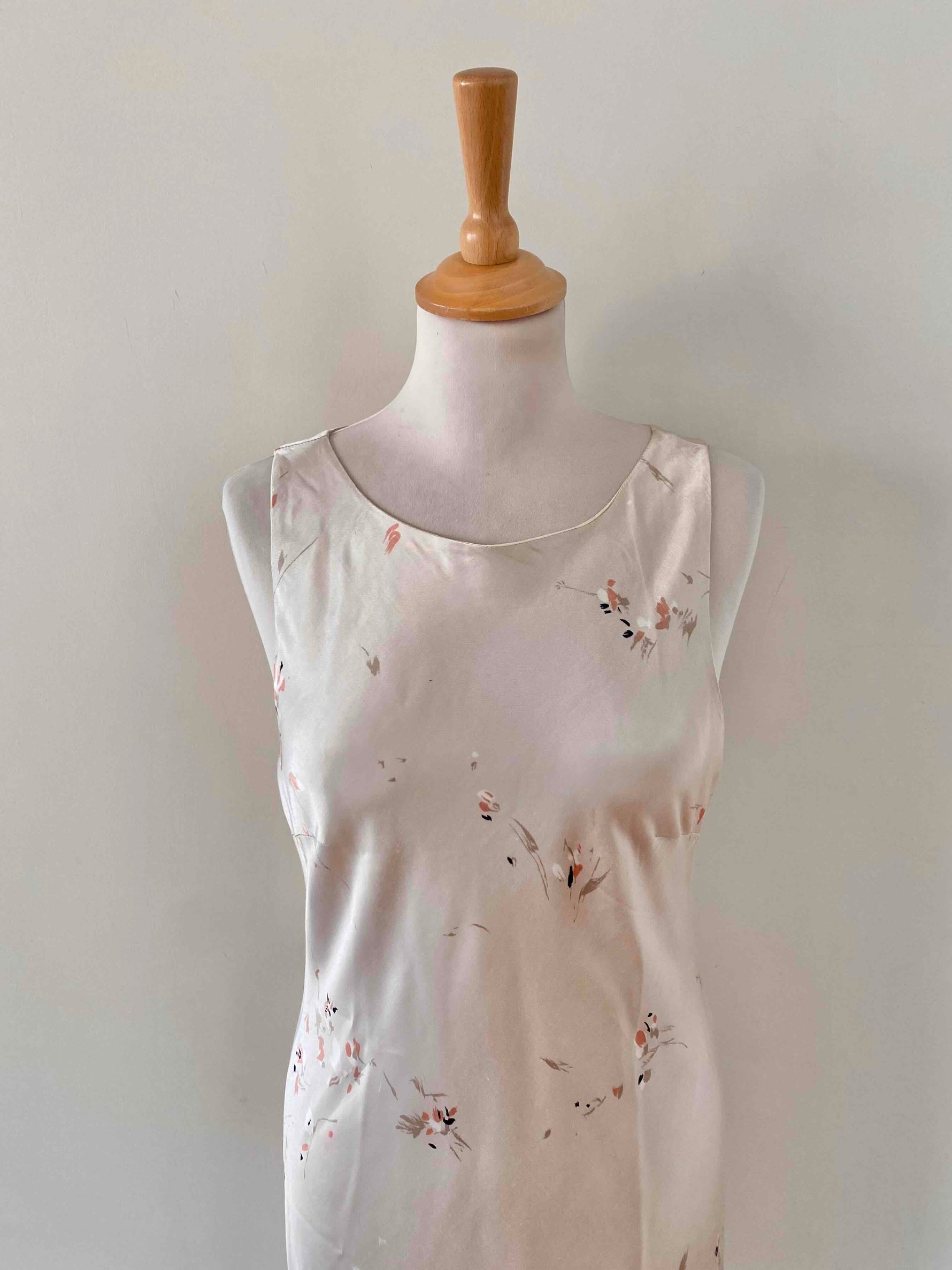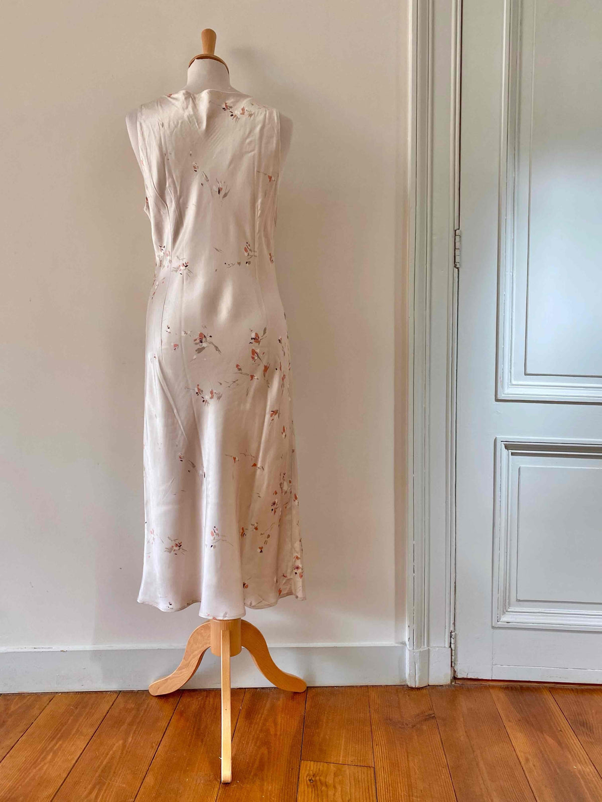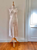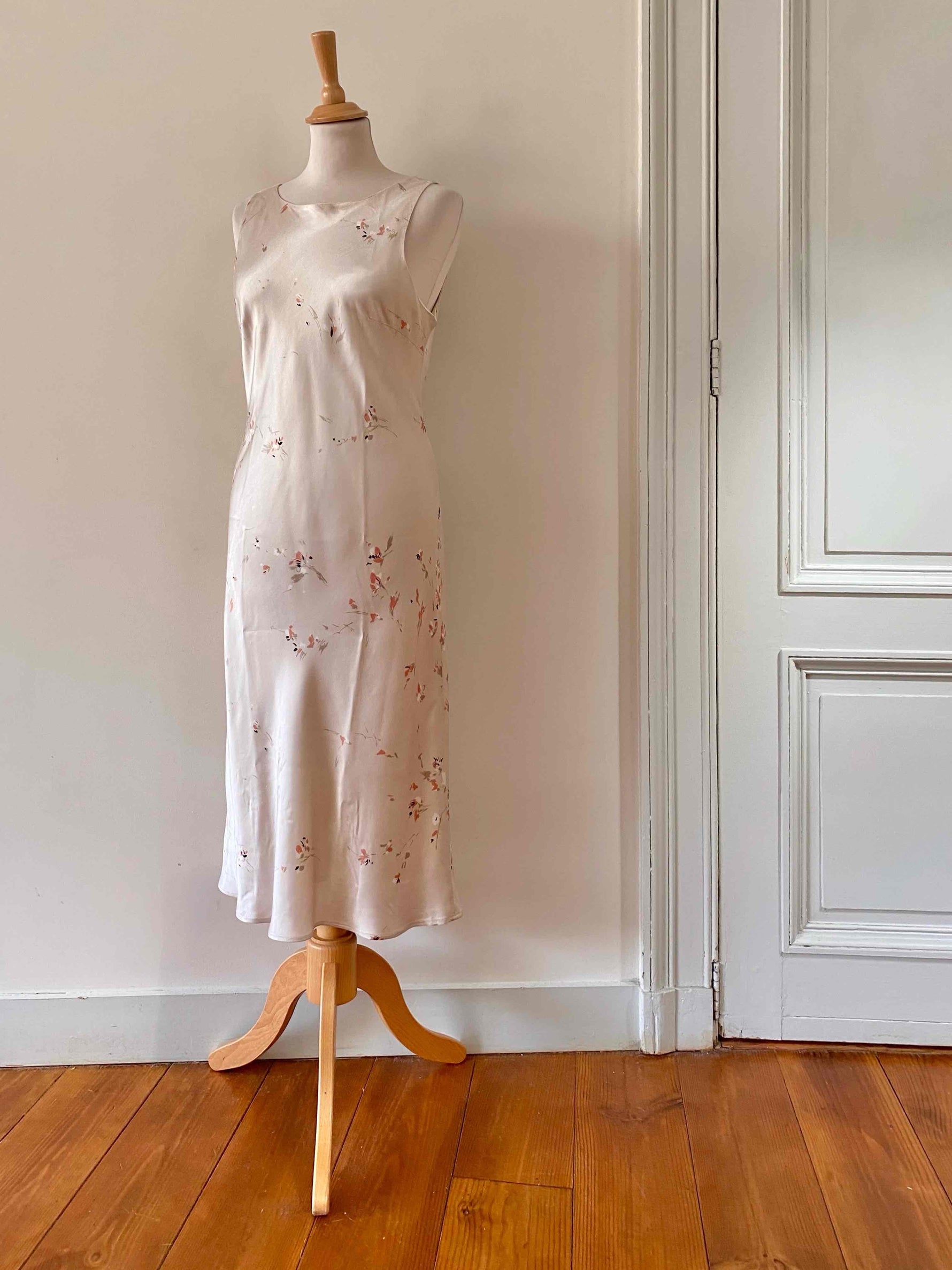 Robe en satin fleurie, en satin viscose ivoire imprimée fines fleurs roses, forme fit and flare en biais, fabriquée en France, taille 36 et 38 portée ici sur un mannequin T36, aisselles 45cm.