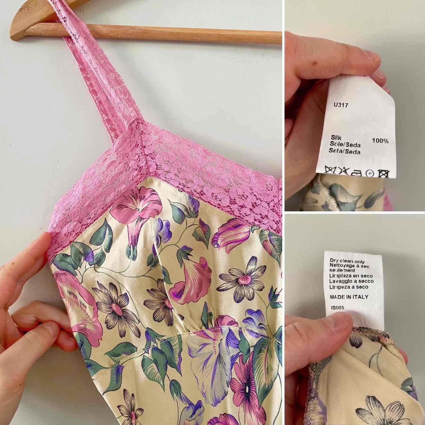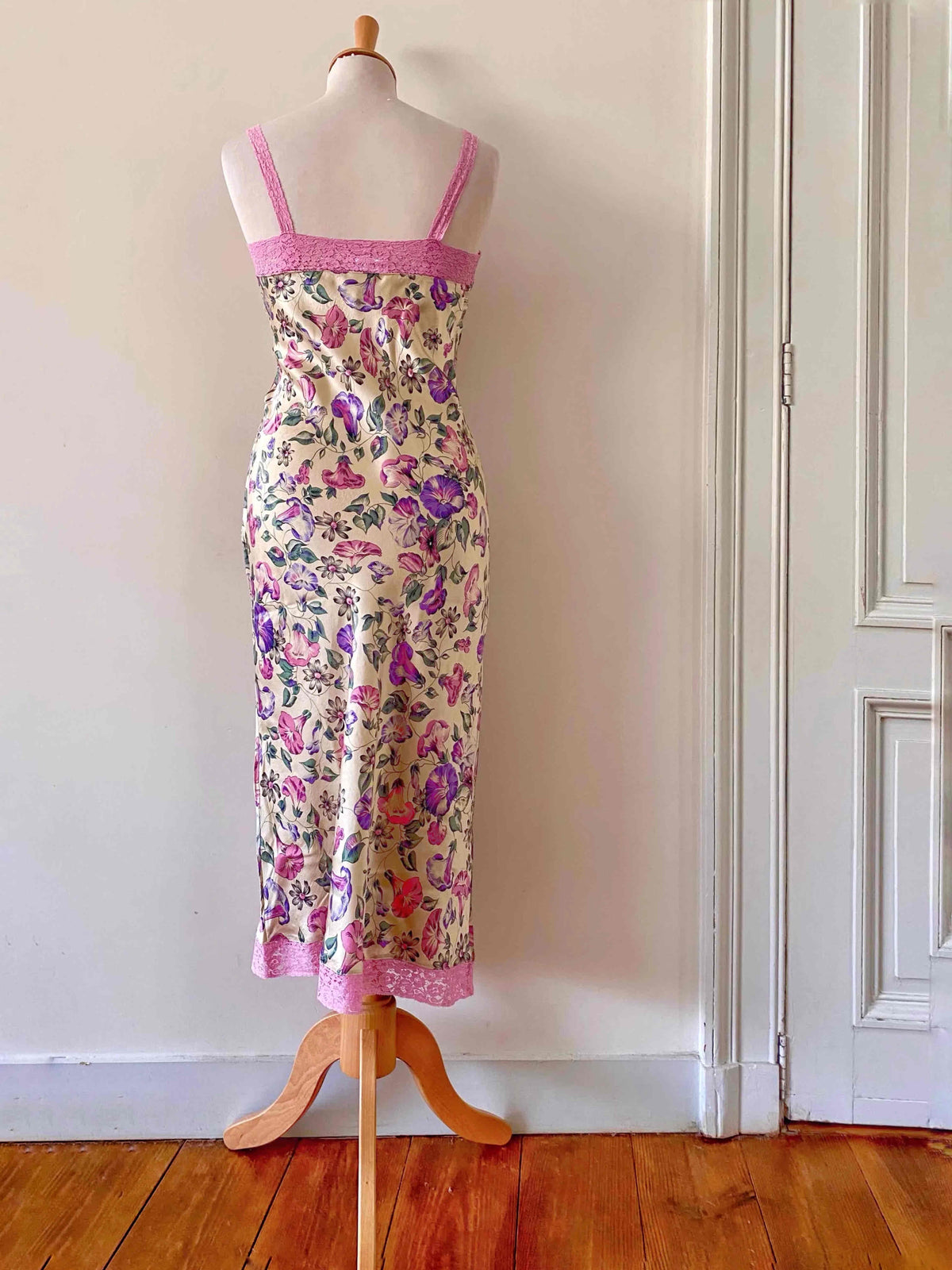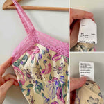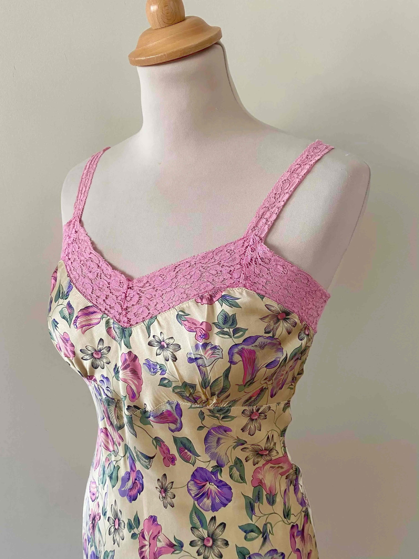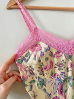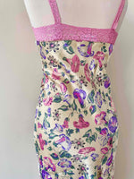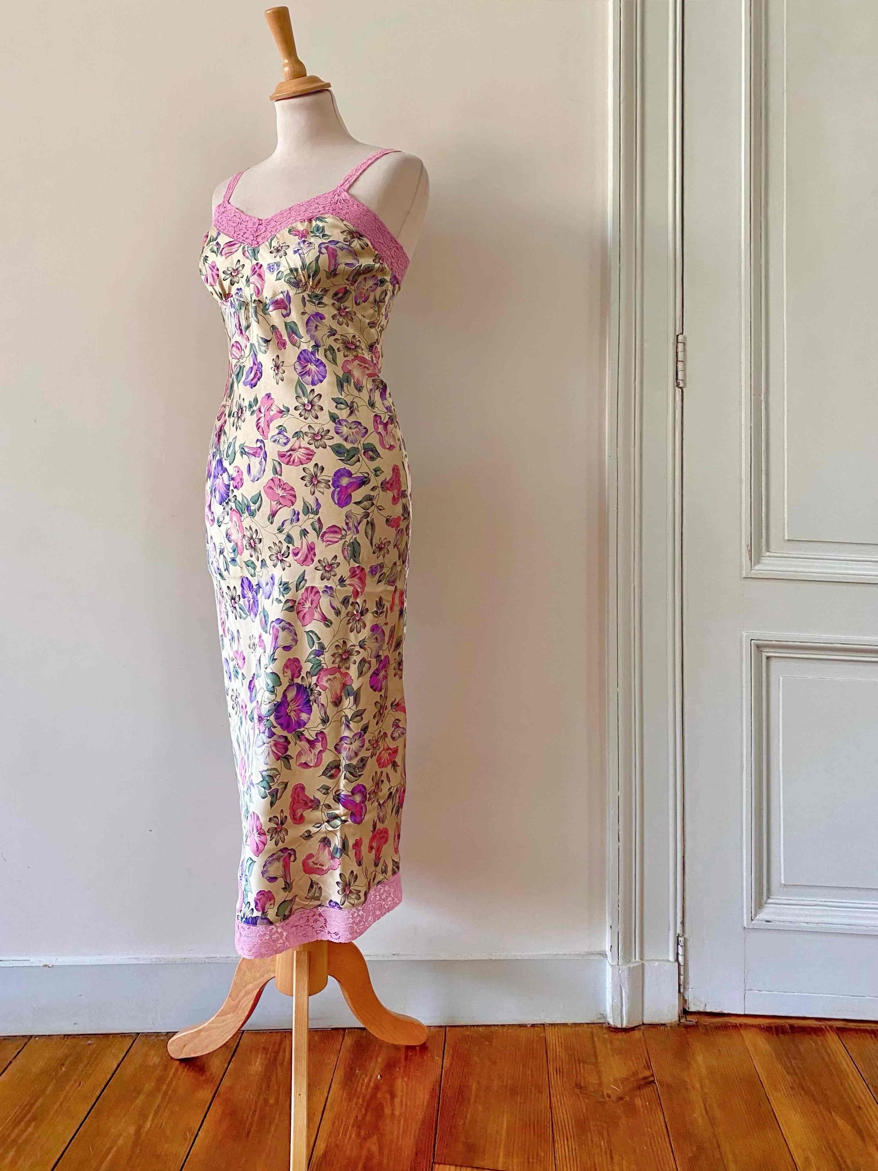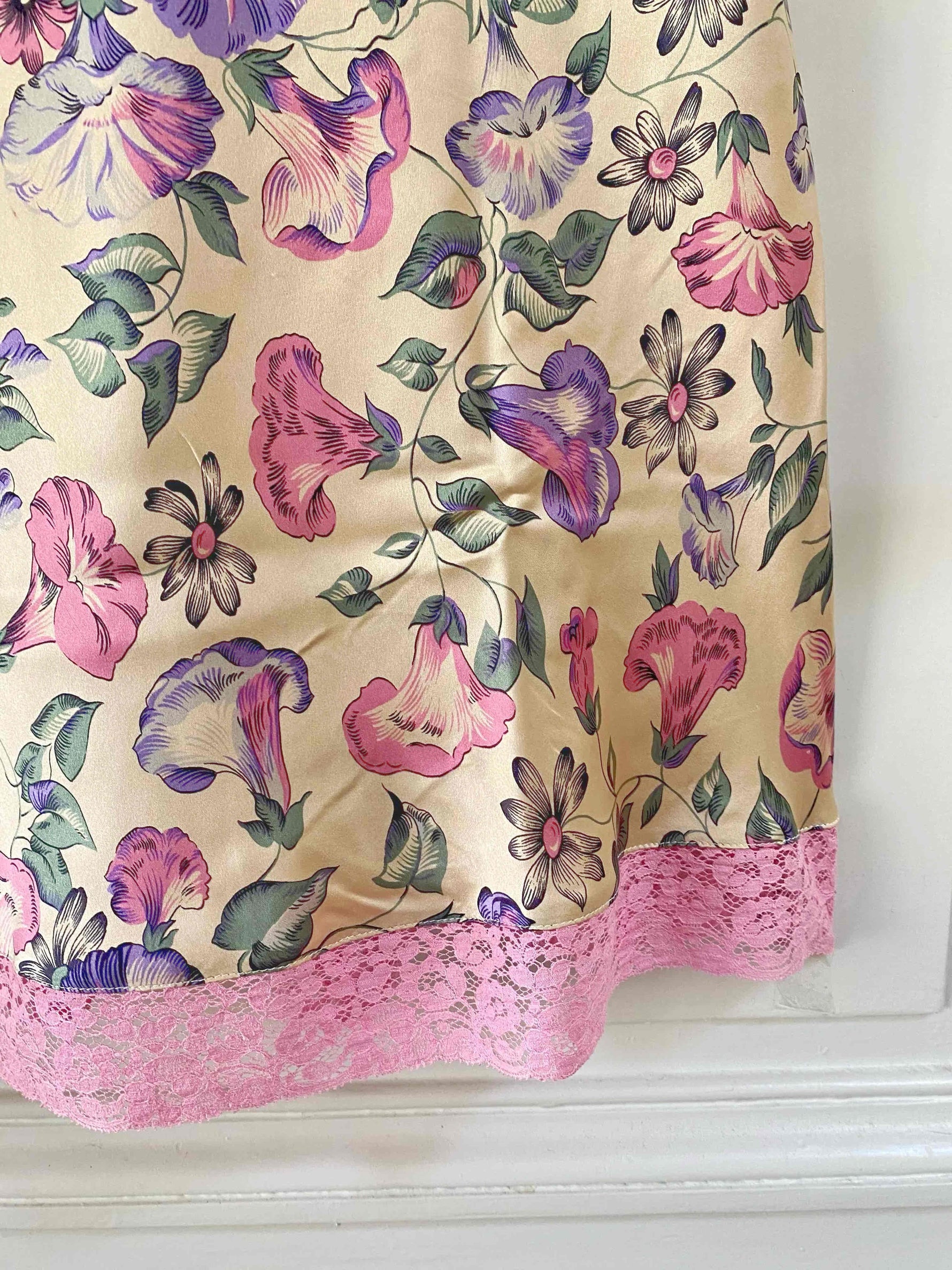 Robe nuisette en soie satin champagne imprimée fleurs lilas, roses, violettes et vert pastel motifs liserons, bordures encolure V, bretelles et bas en dentelle rose, découpes sous poitrine froncée et forme fit and flare, Gerard Darel y2k, taille 36 portée ici sur un mannequin T36, aisselles 43cm.