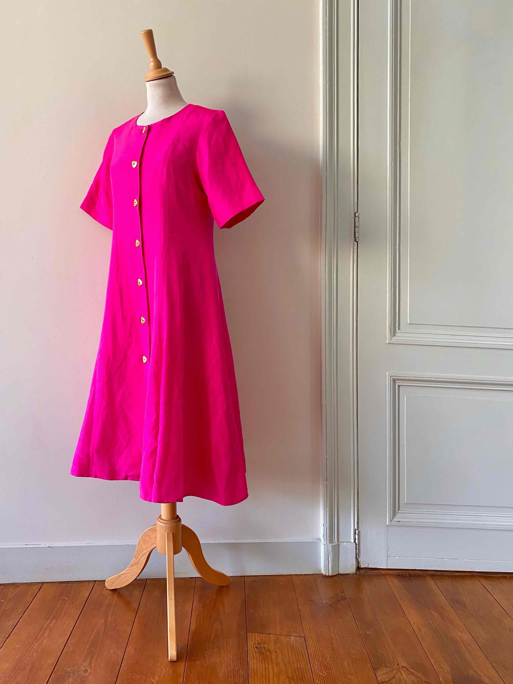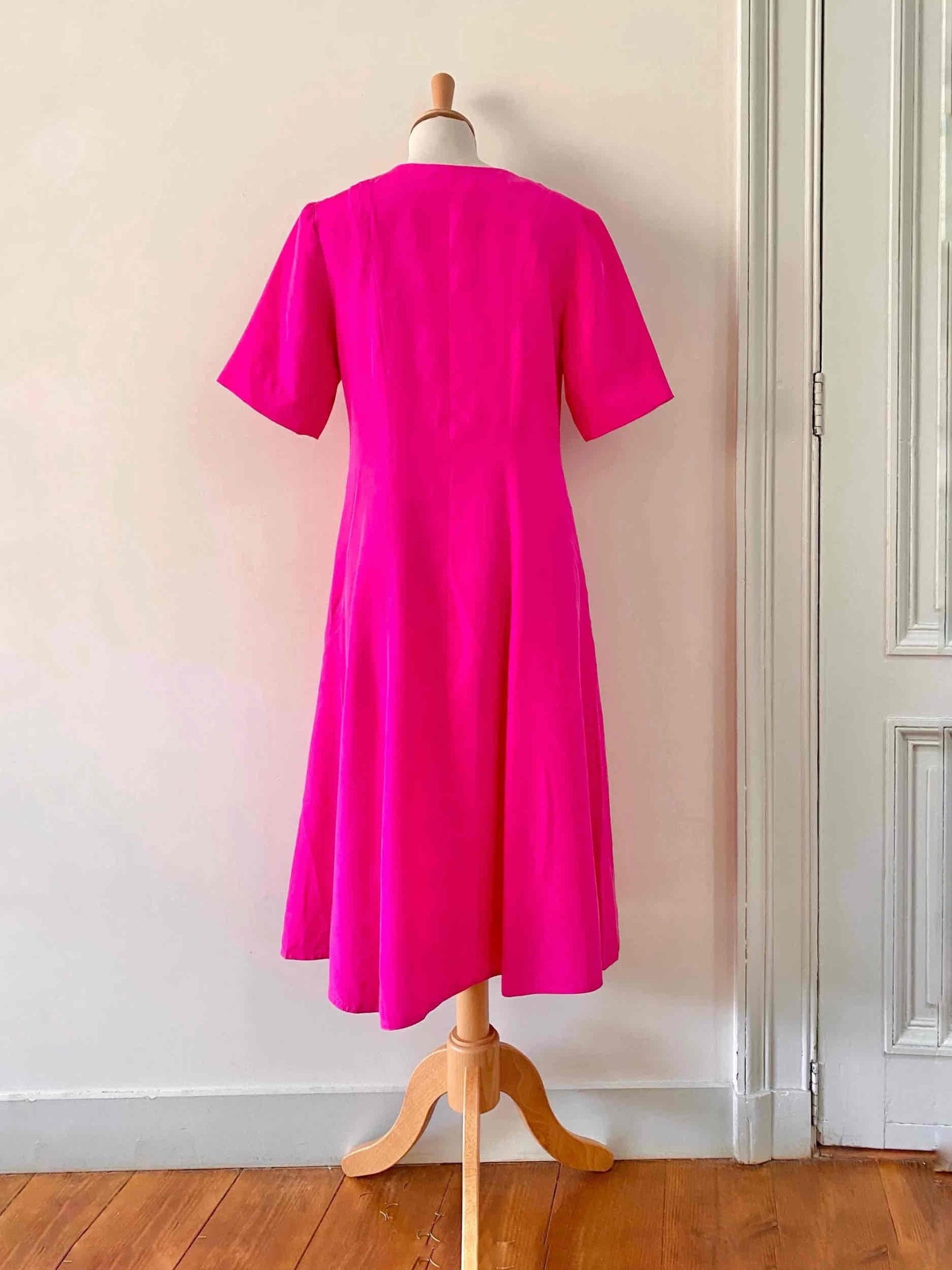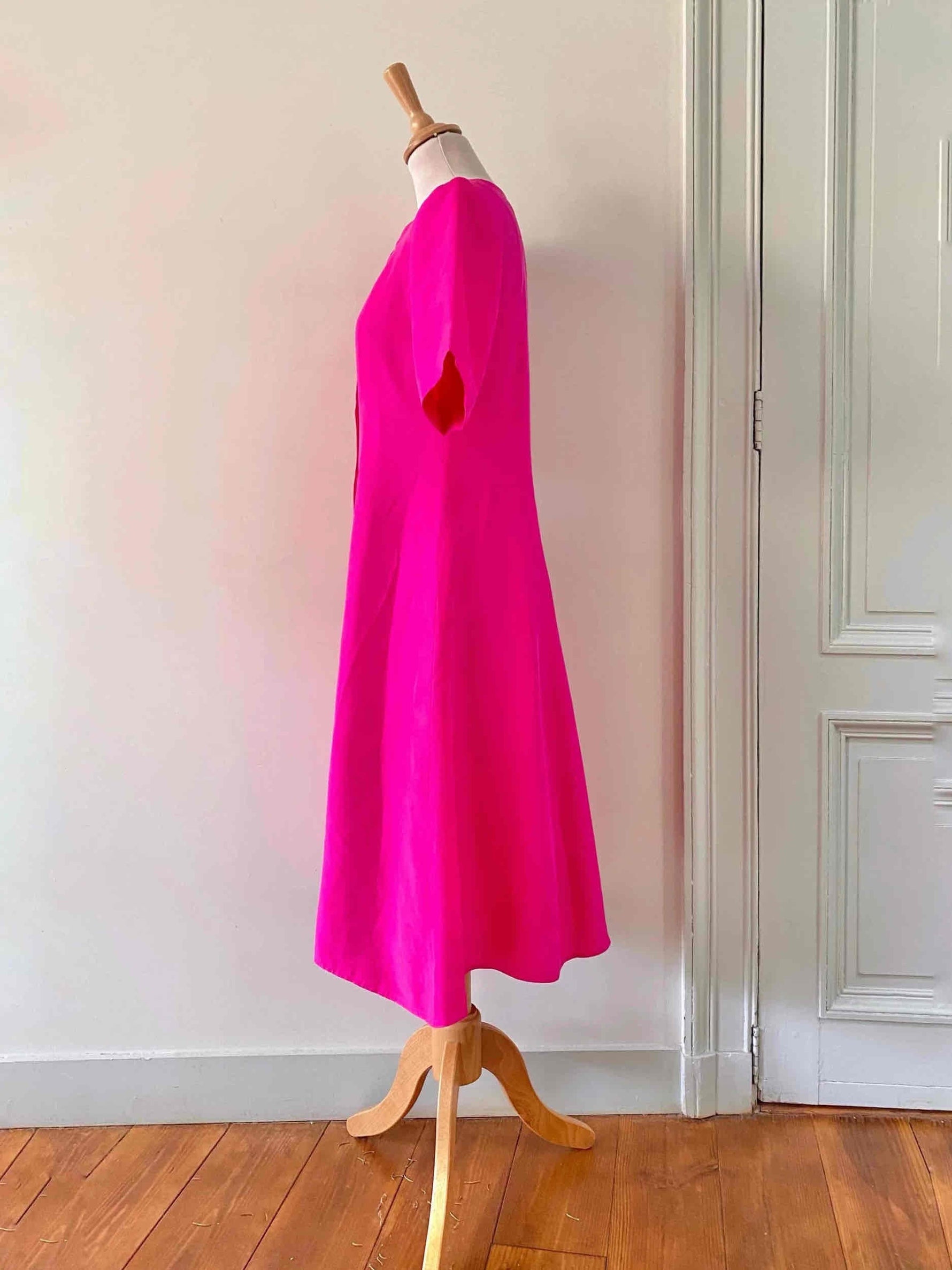 Prix unitaire parRobe midi en soie, 100% soie rose indien fuschia, boutons cornes triangulaires, forme fit and flare, soie Thaï, années 90’s, taille 38 portée ici sur un mannequin T36, aisselles 46cm.