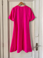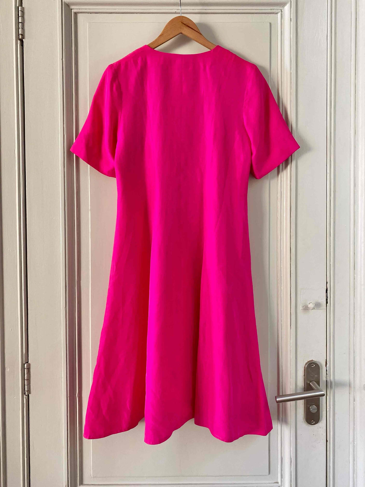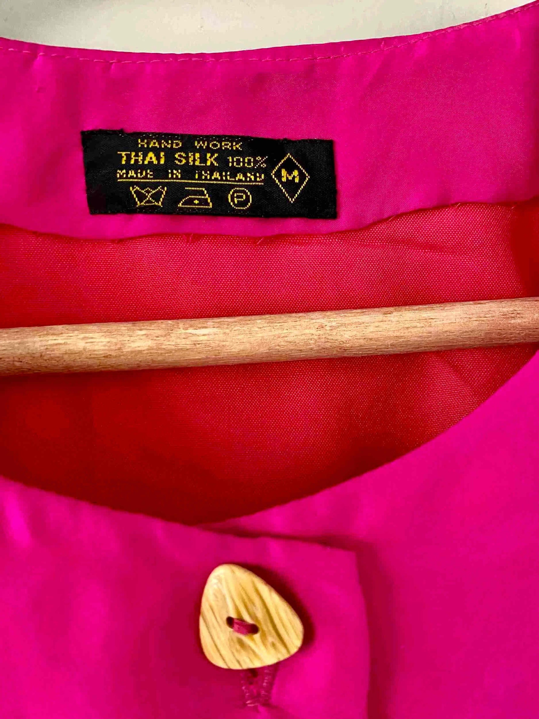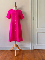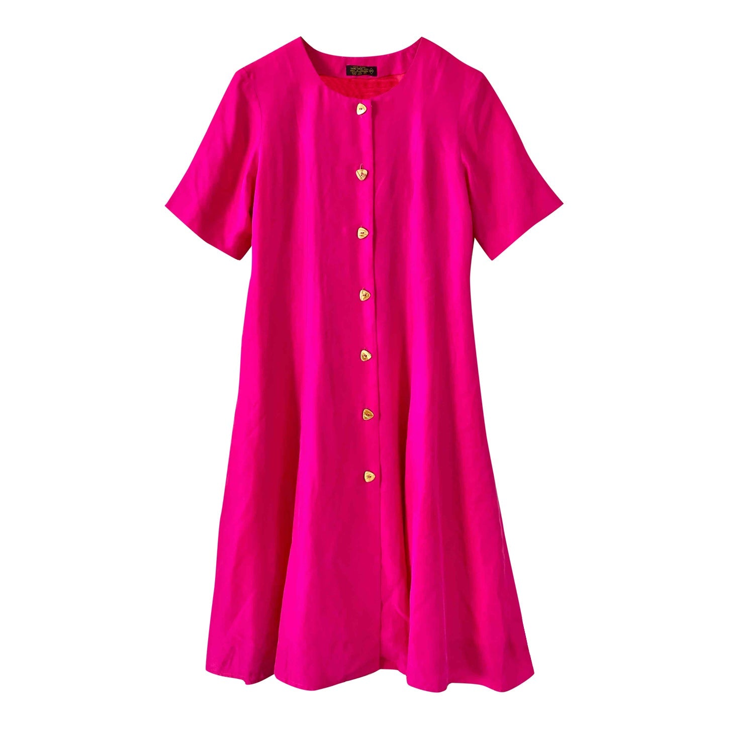 Prix unitaire parRobe midi en soie, 100% soie rose indien fuschia, boutons cornes triangulaires, forme fit and flare, soie Thaï, années 90’s, taille 38 portée ici sur un mannequin T36, aisselles 46cm.