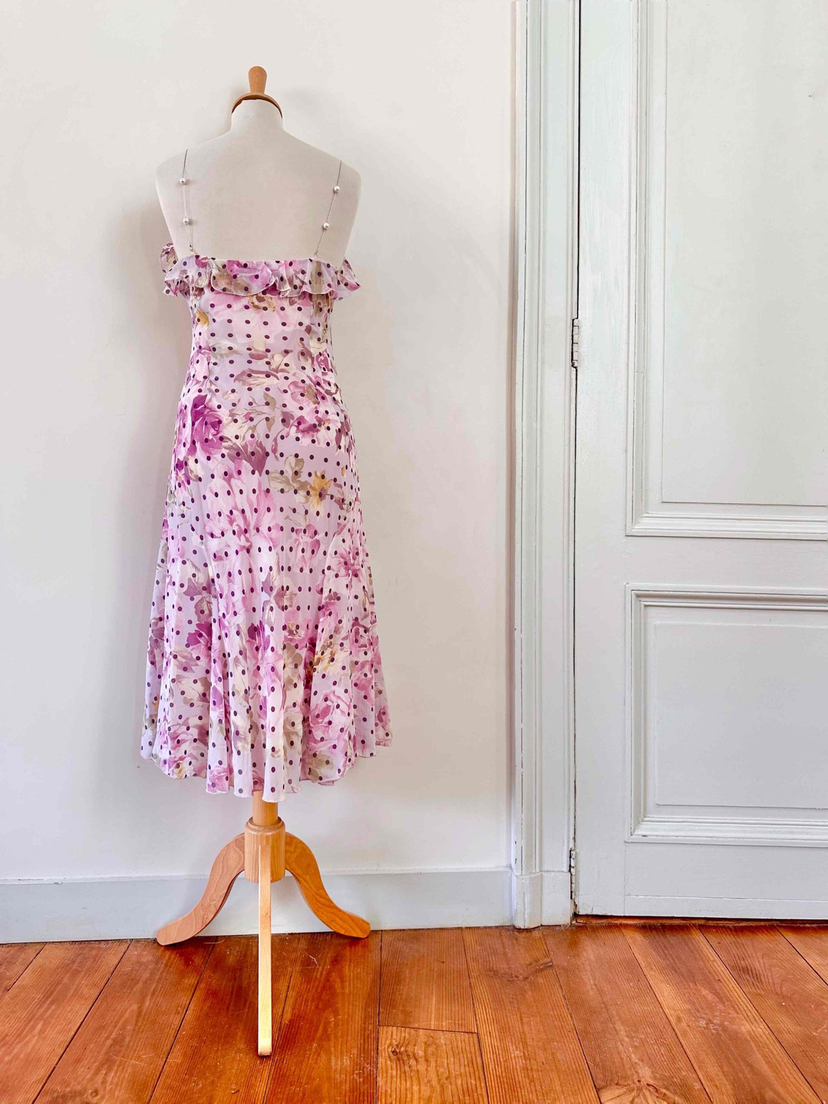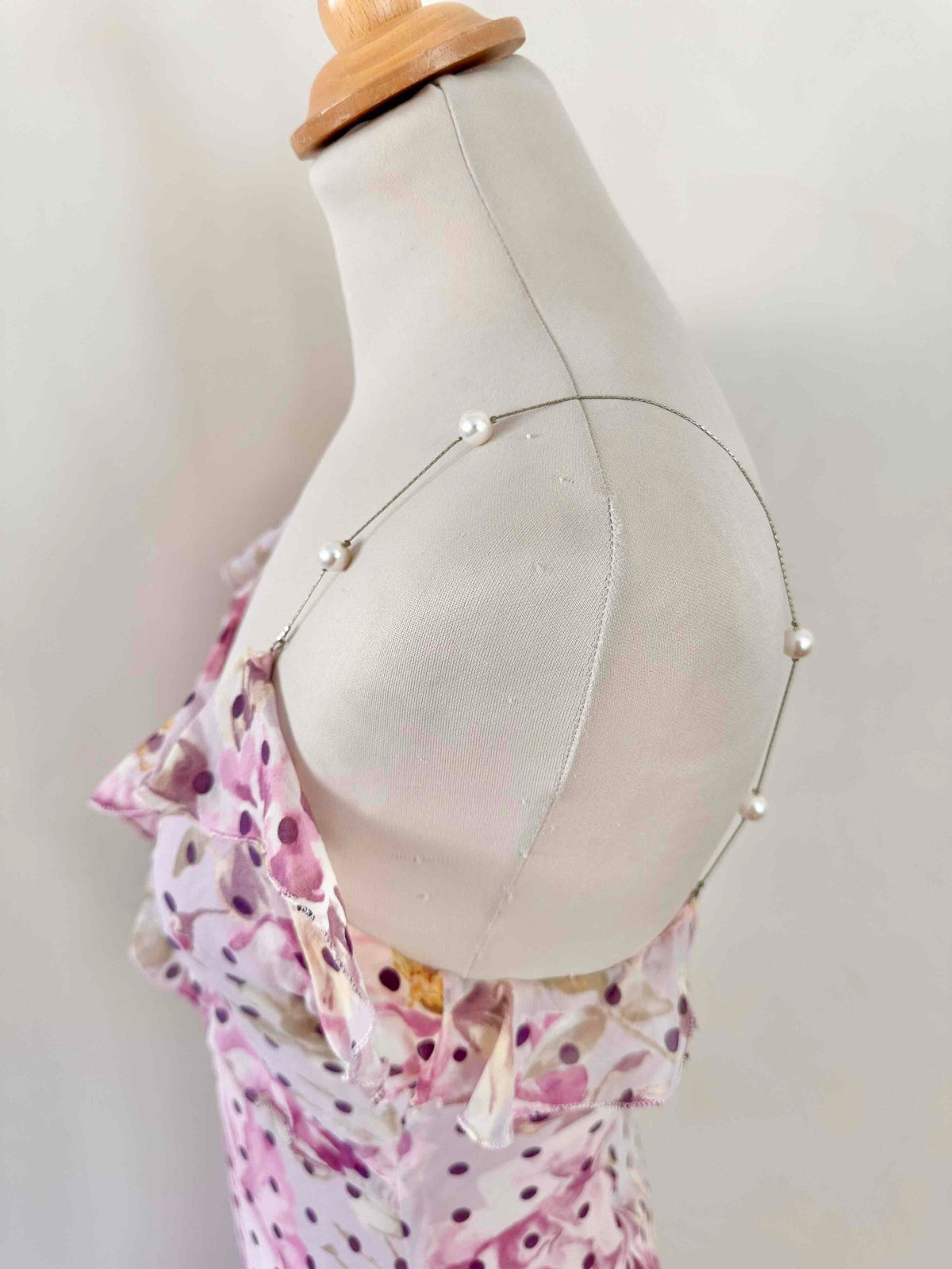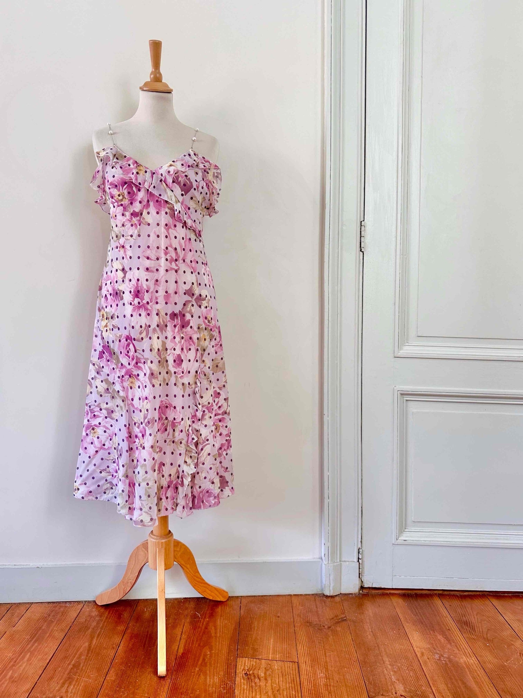Robe nuisette en soie, mousseline de soie rose lilas, imprimée pois violets et fleurs roses, lilas, fuchsias, encolure volantée, bretelles bijoux, en chaîne serpent argentée et perles nacrées, fabriquée en Italie, taille 36, portée ici sur un mannequin T36, aisselles 44 cm.