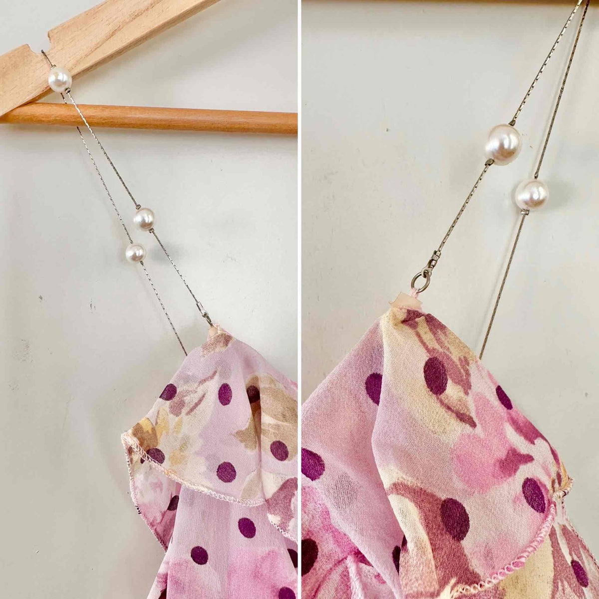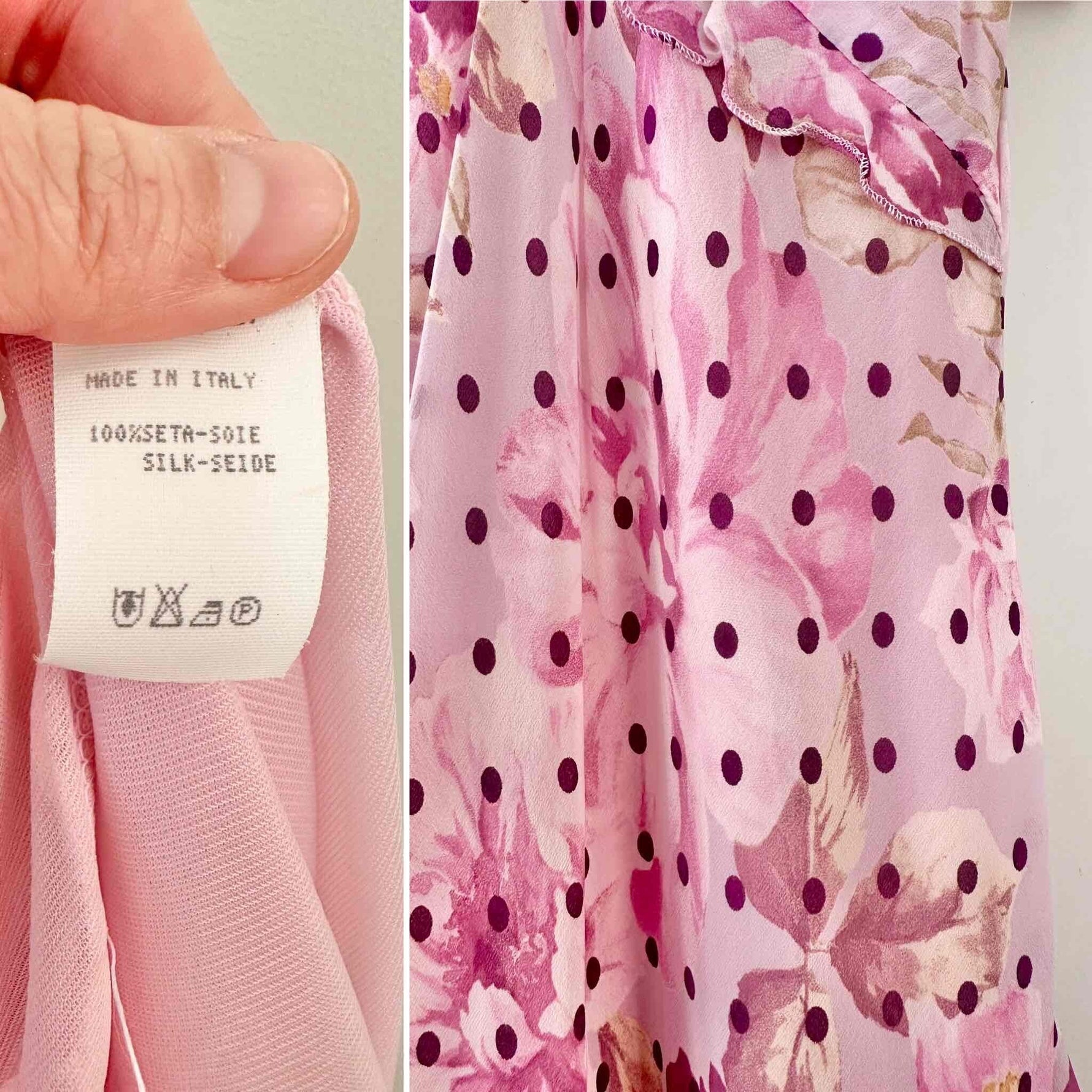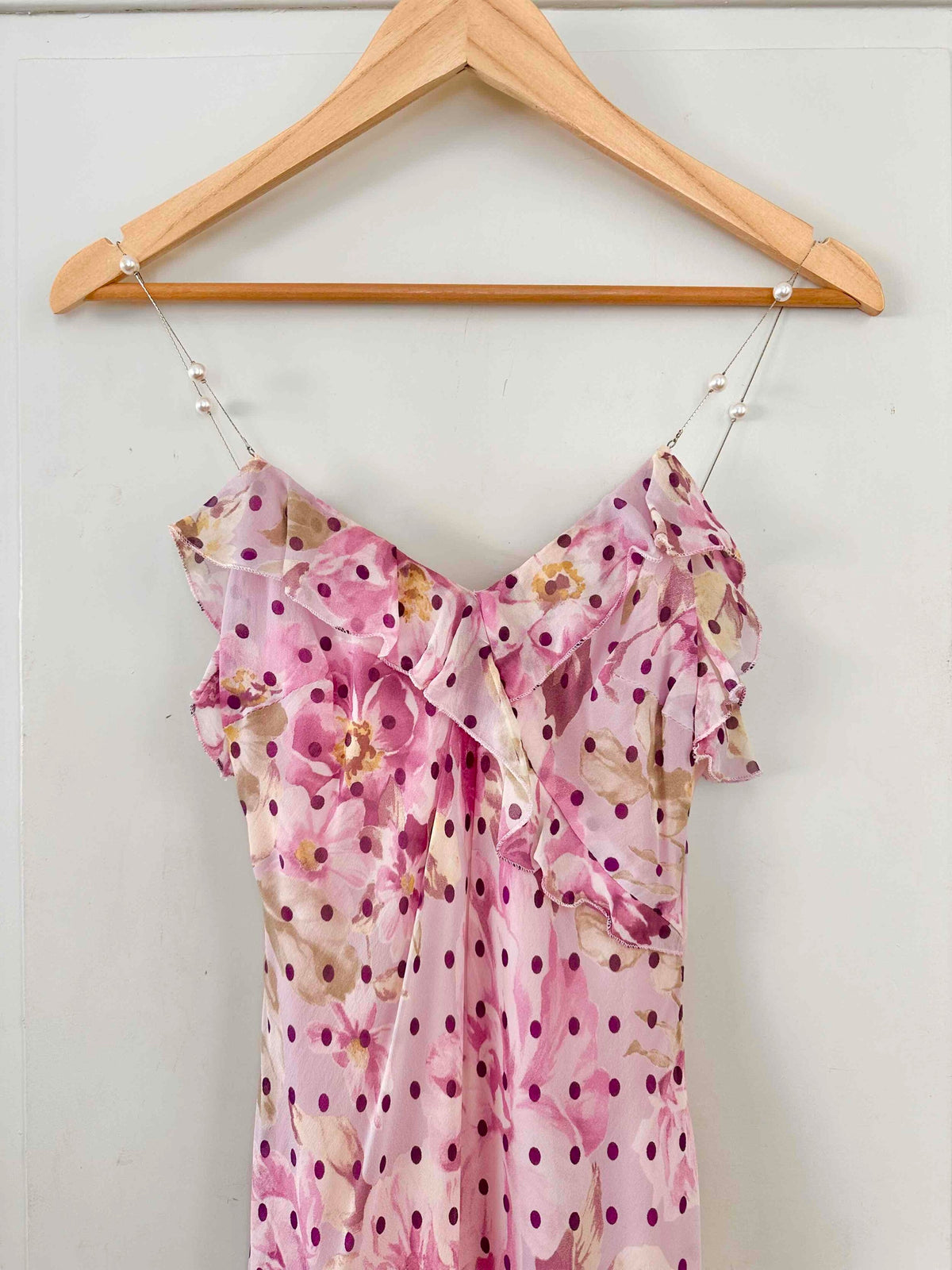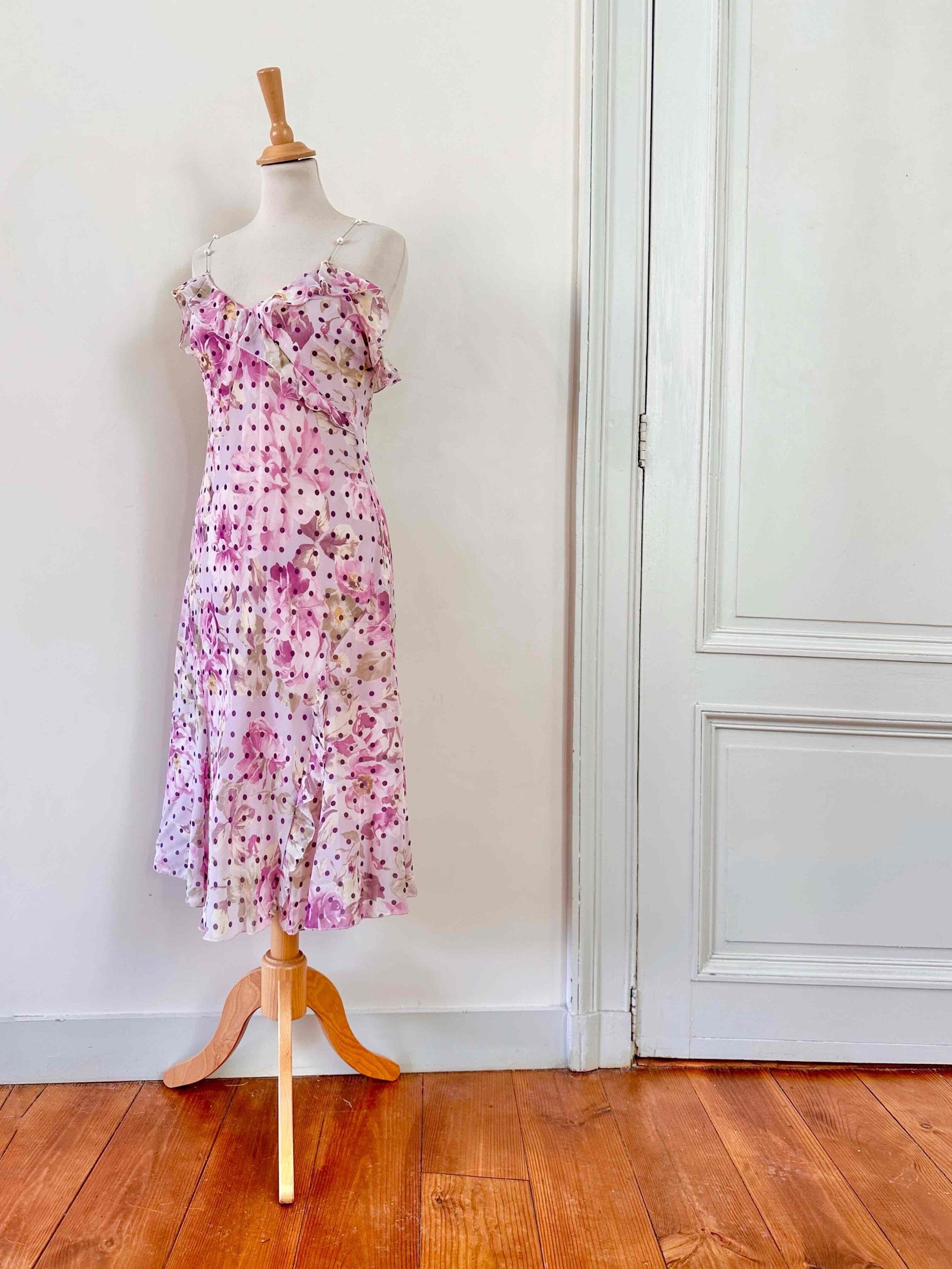 Robe nuisette en soie, mousseline de soie rose lilas, imprimée pois violets et fleurs roses, lilas, fuchsias, encolure volantée, bretelles bijoux, en chaîne serpent argentée et perles nacrées, fabriquée en Italie, taille 36, portée ici sur un mannequin T36, aisselles 44 cm.