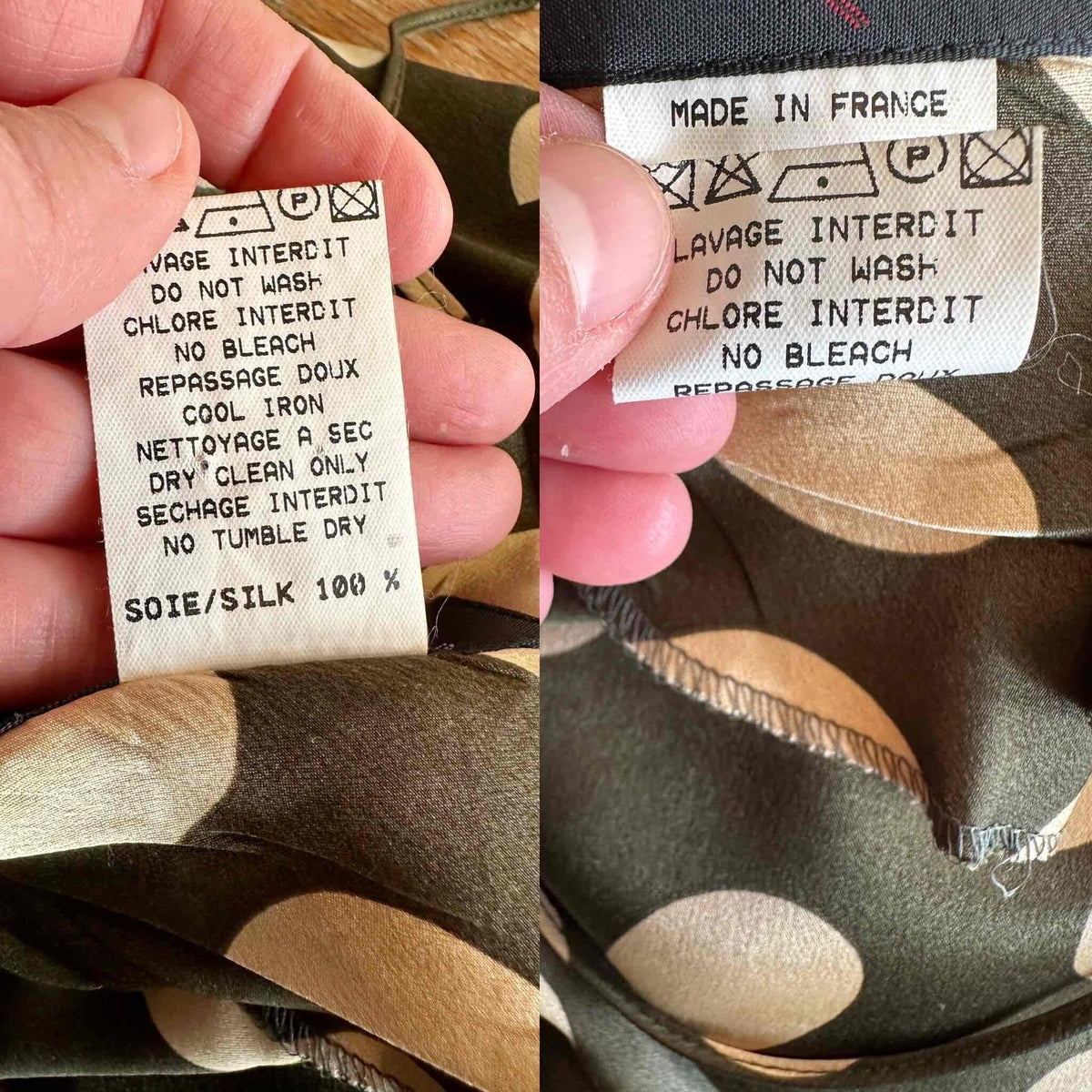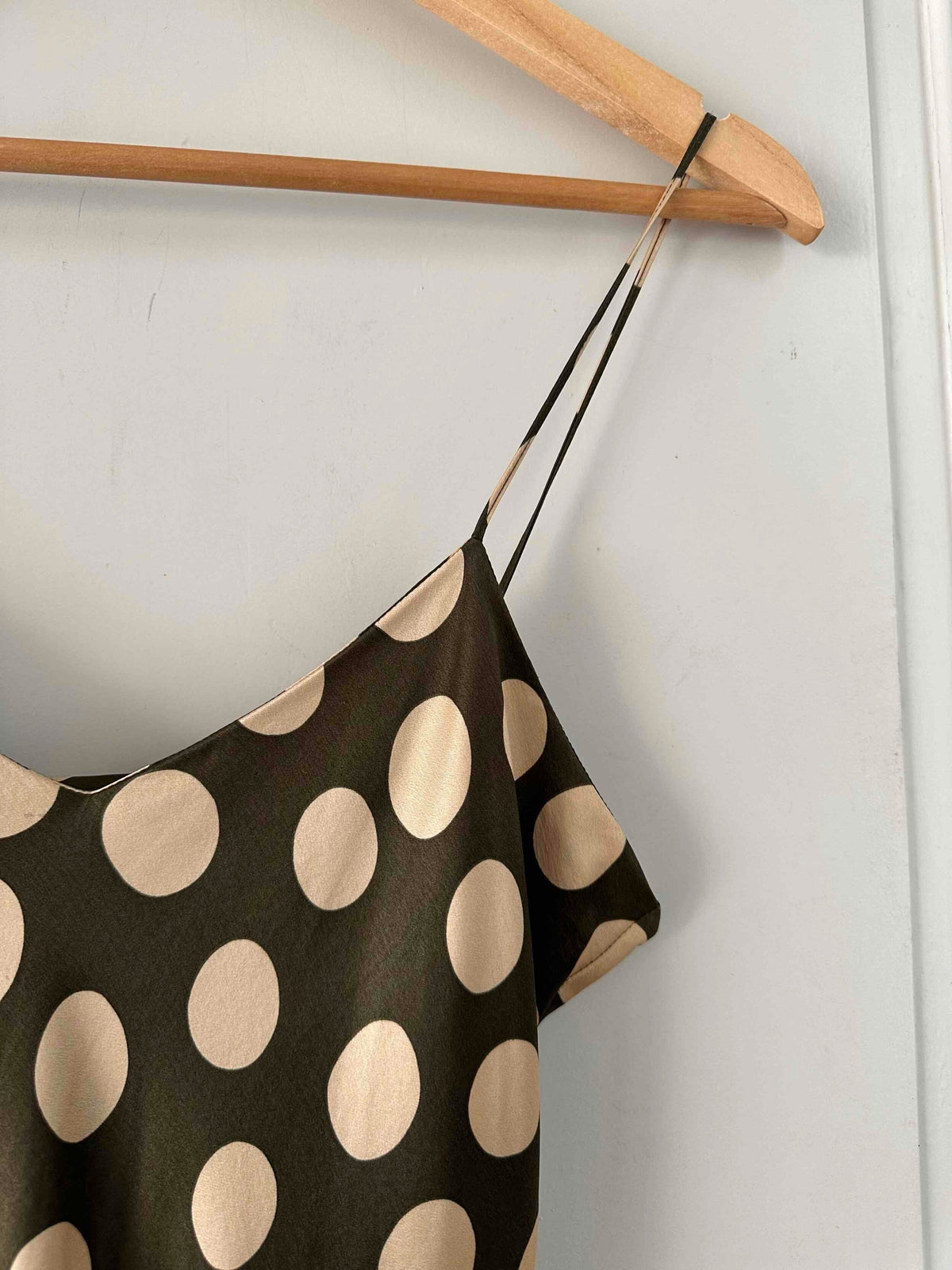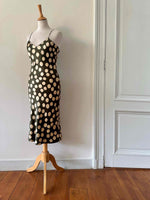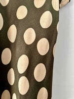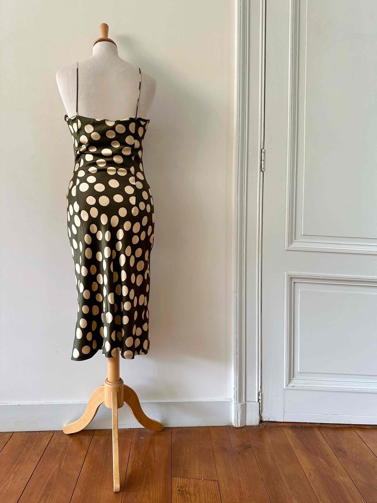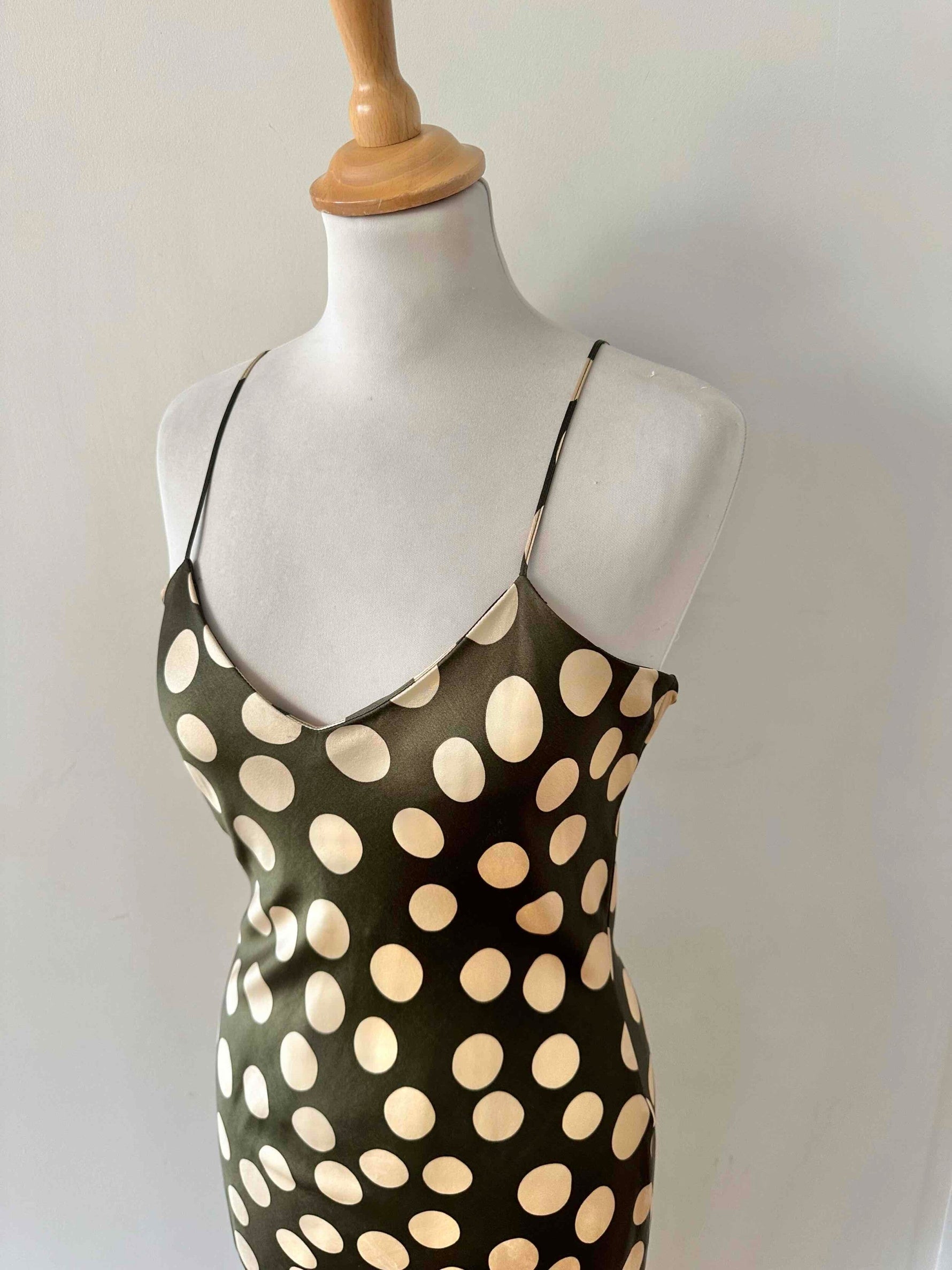Prix unitaire parRobe nuisette en soie satin vert olive à pois pastille blanc écru, bretelles spaghettis, forme fit and flare, fabriquée en France, pièce rare des années 00s, taille 36, portée ici sur un mannequin T36, aisselles 43 cm