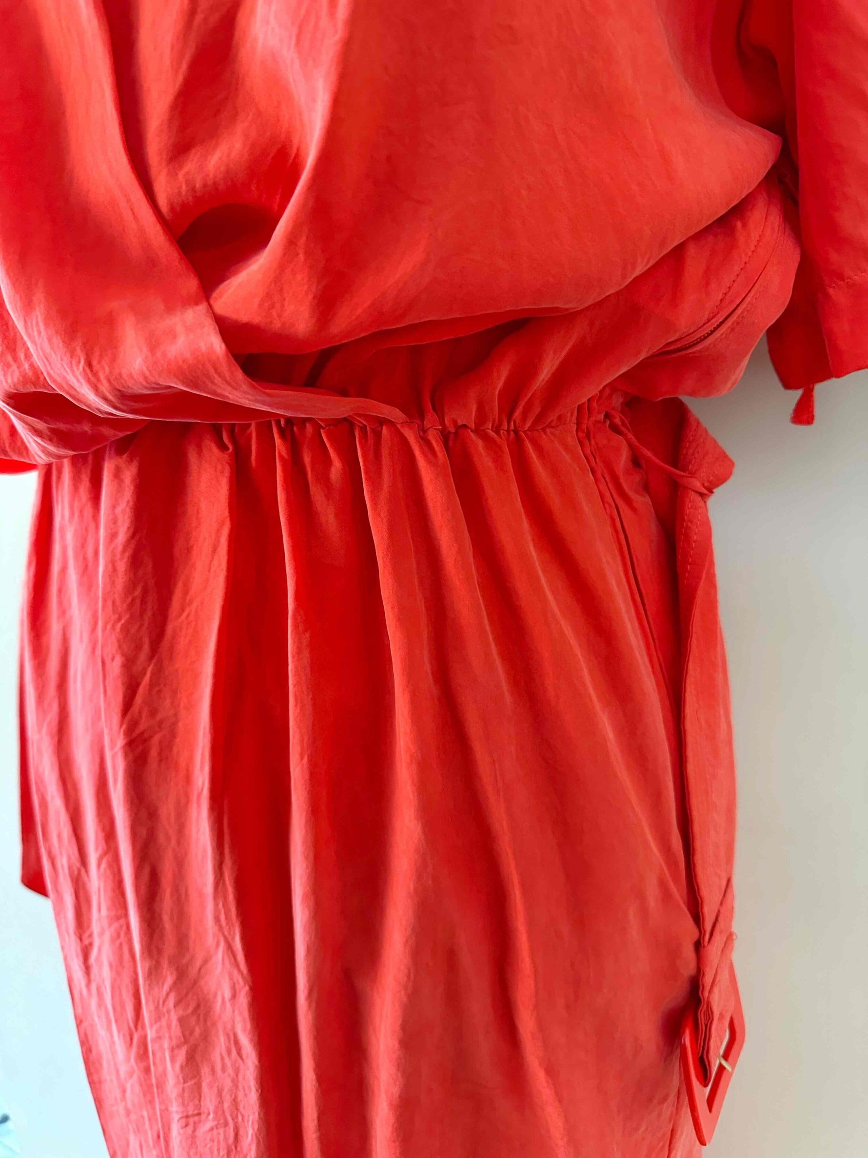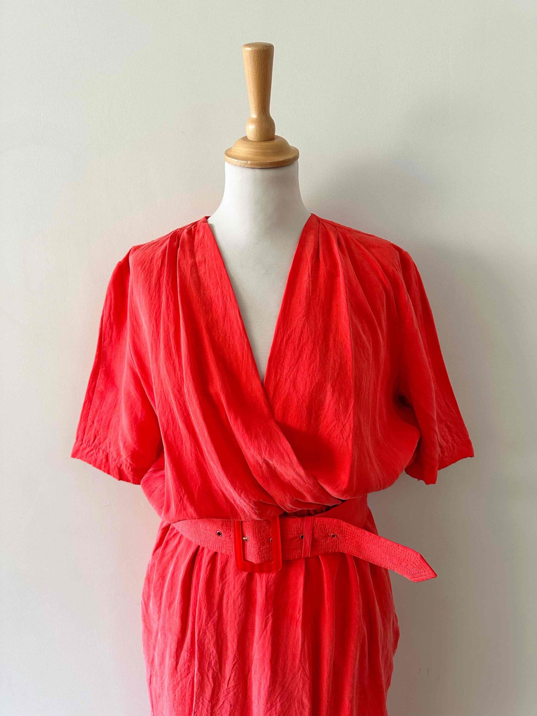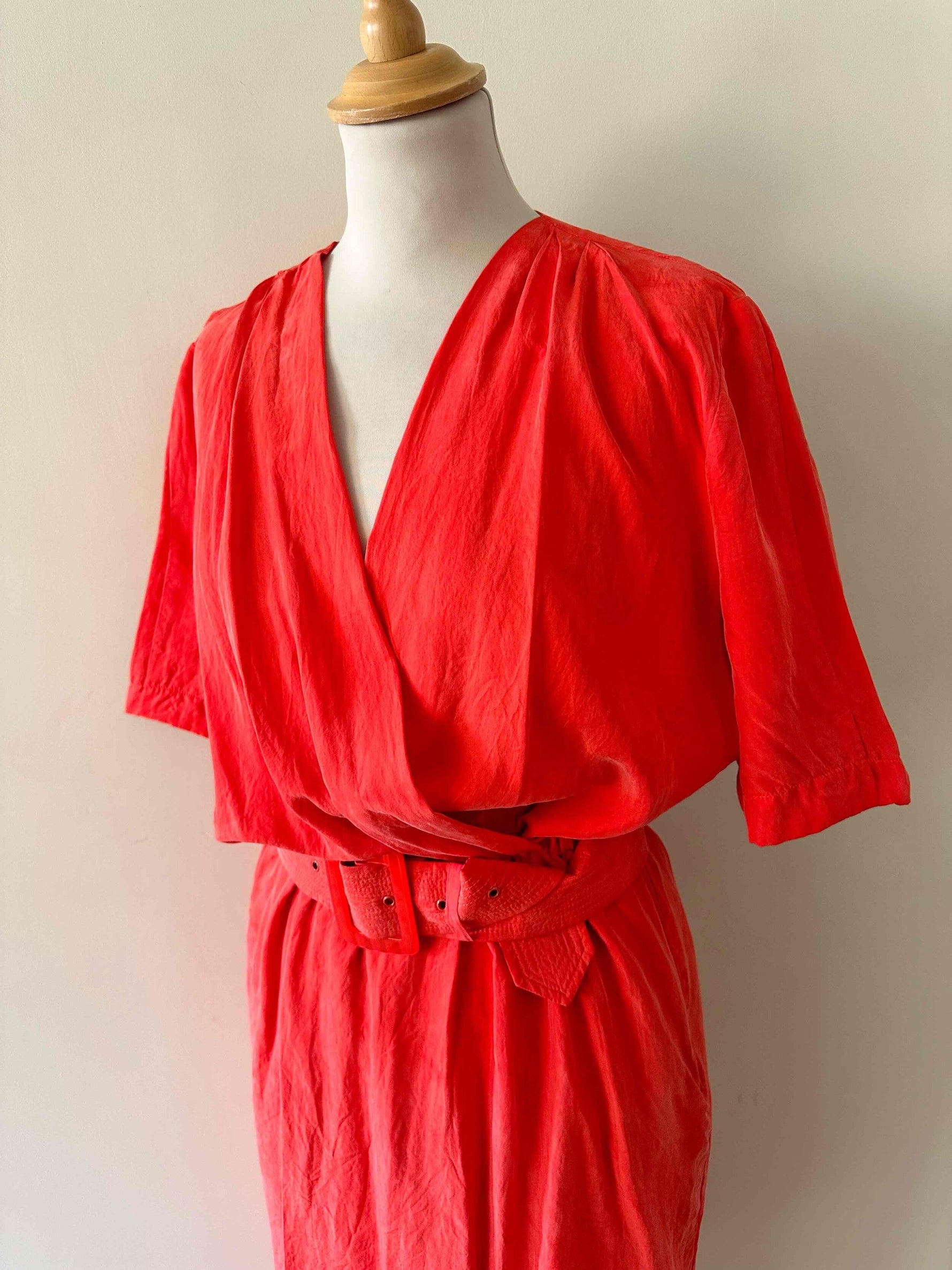 Robe portefeuille en soie, soie lavée rouge vermillon, haut encolure cache-cœur croisé et drappé, taille élastique et fermeture Éclair sur le côté, ceinture à belle boucle rouge, années 80s, taille 38, portée ici sur un mannequin T36, aisselles 45 cm.