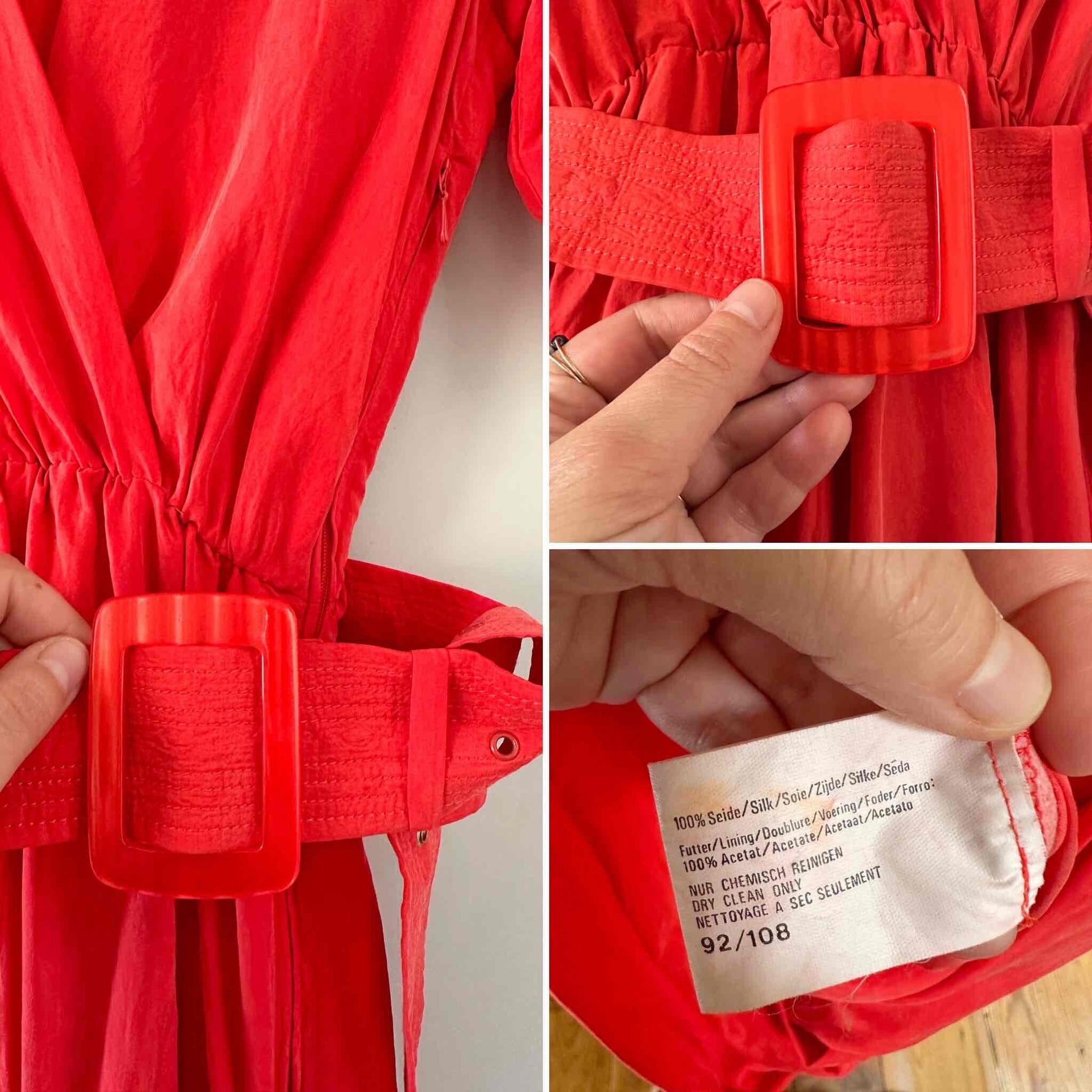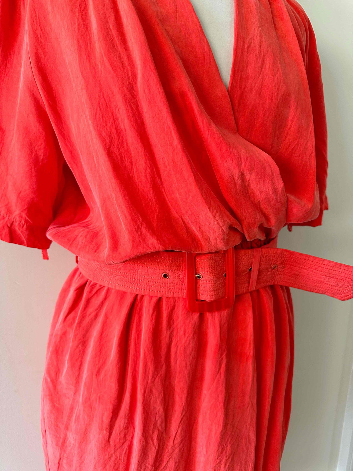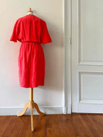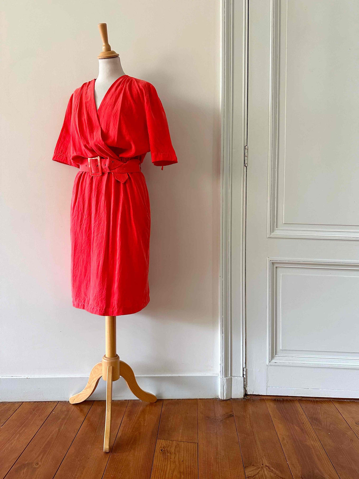Robe portefeuille en soie, soie lavée rouge vermillon, haut encolure cache-cœur croisé et drappé, taille élastique et fermeture Éclair sur le côté, ceinture à belle boucle rouge, années 80s, taille 38, portée ici sur un mannequin T36, aisselles 45 cm.