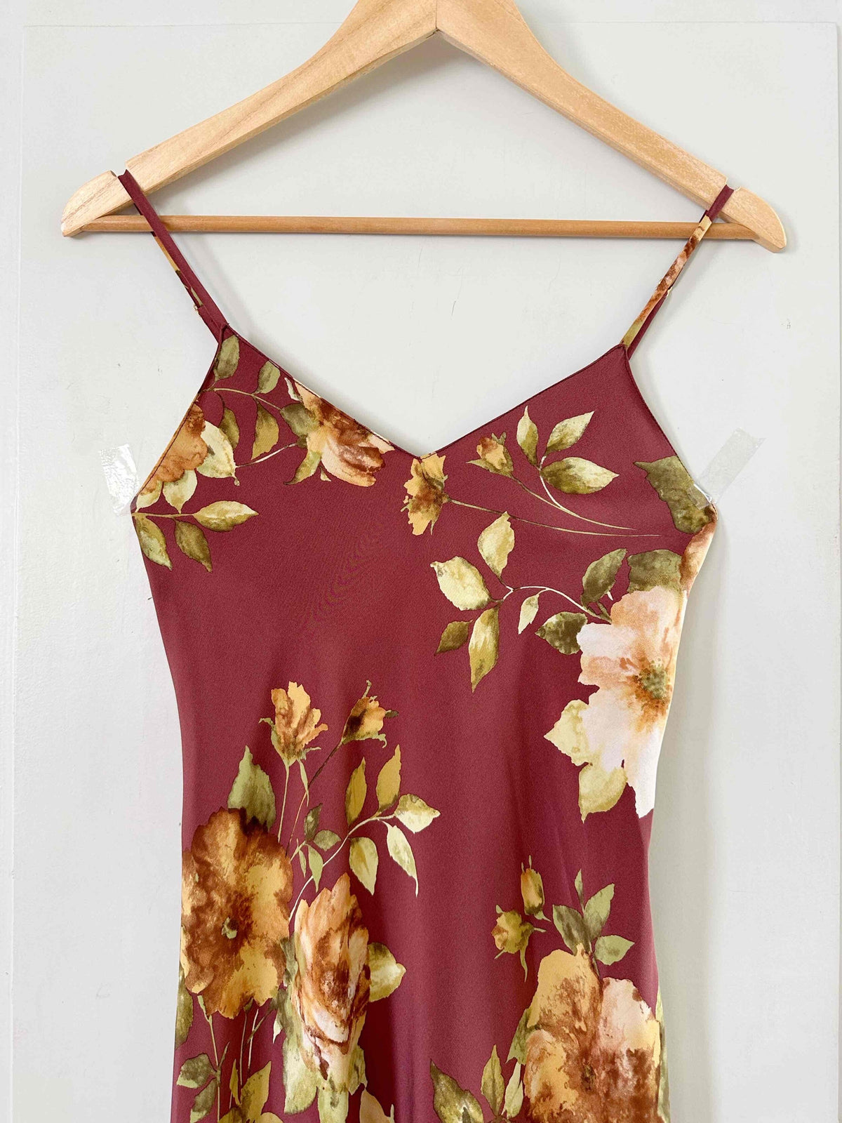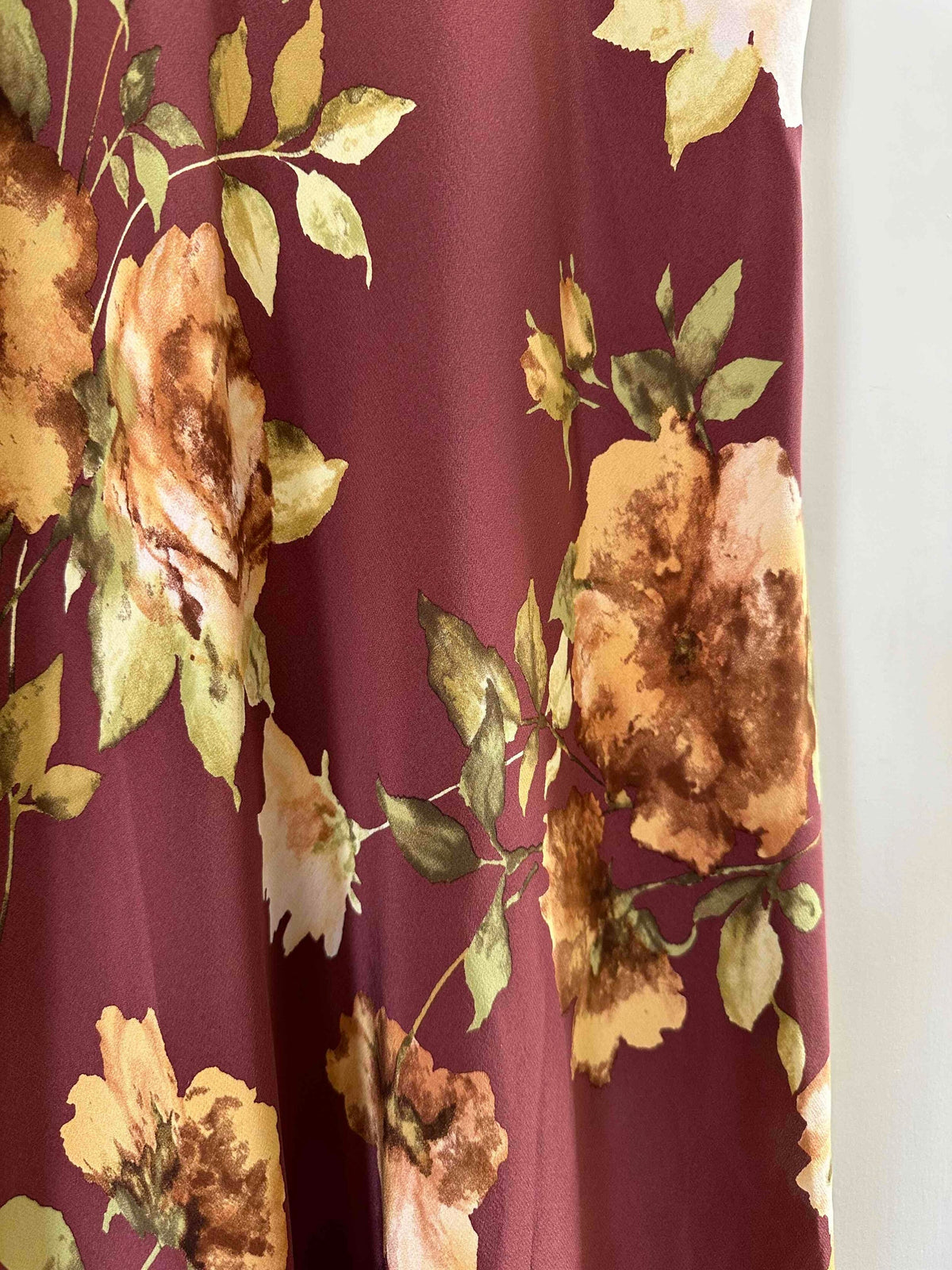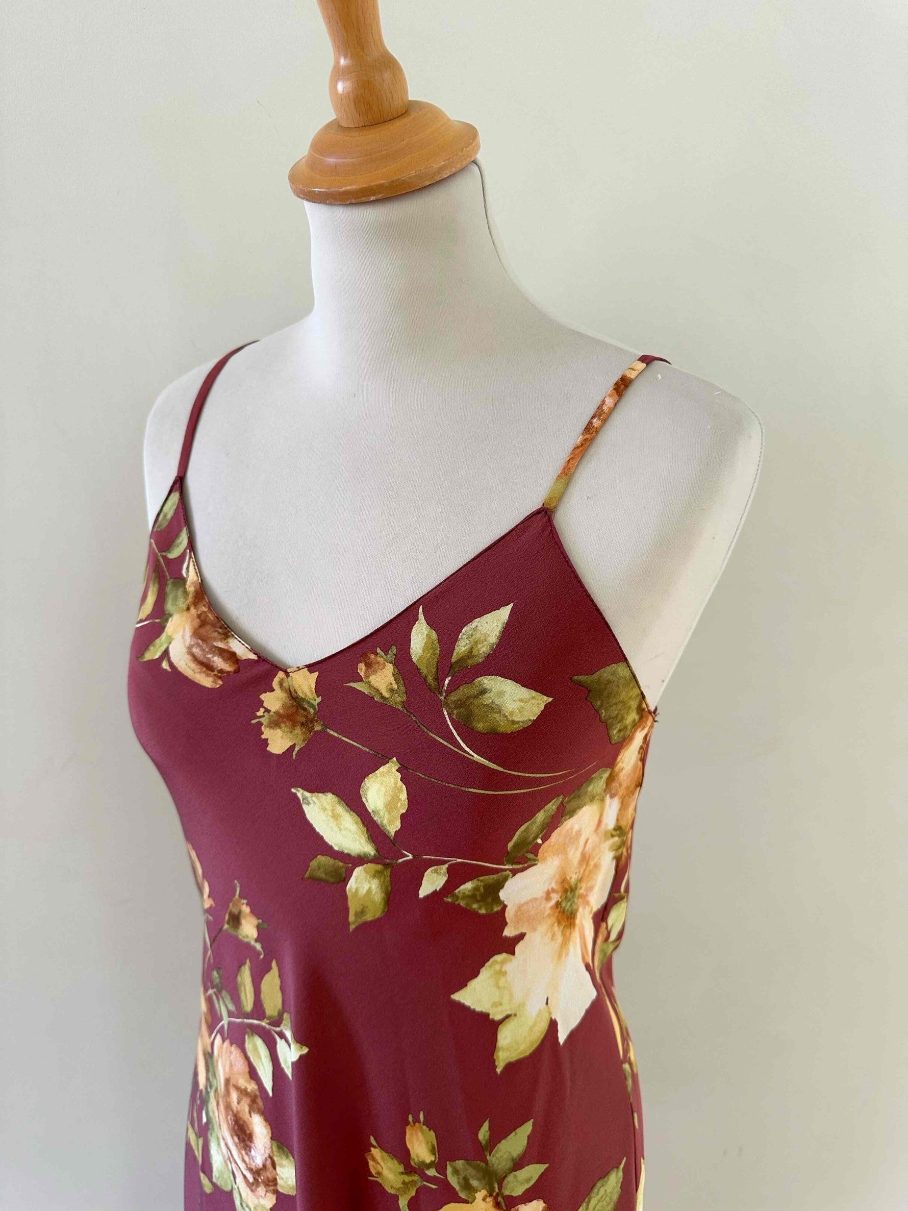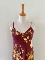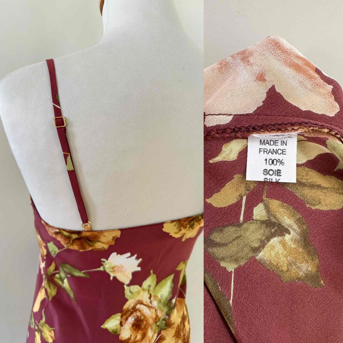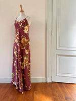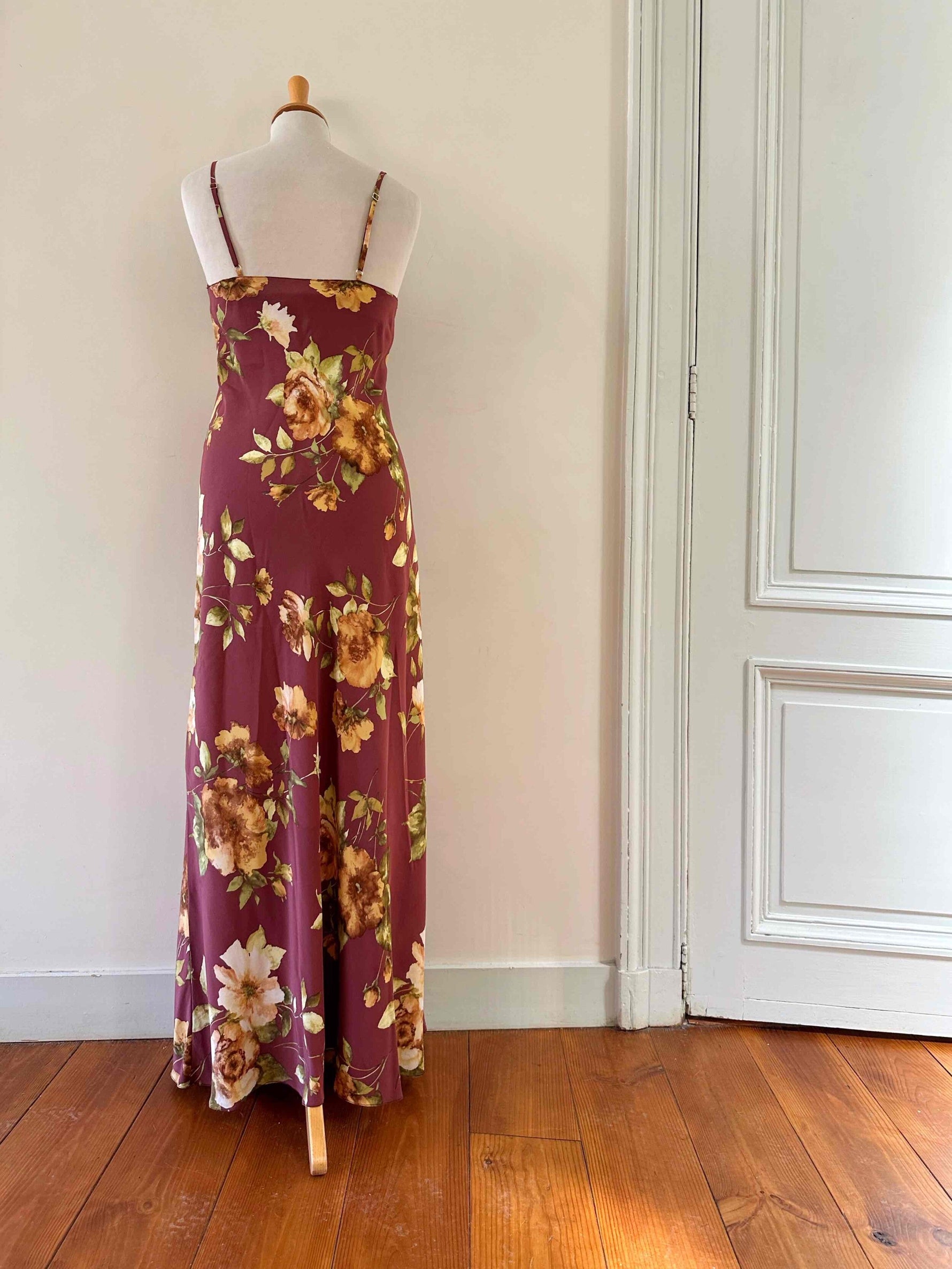 Robe nuisette en soie, soie marron chocolat imprimée grandes fleurs camel, écrues et vertes, bretelles spaghettis réglables, longueur maxi forme en biais, fabriquée en France, pièce rare des années 90s, taille 36 portée ici sur un mannequin T36, aisselles 43 cm.