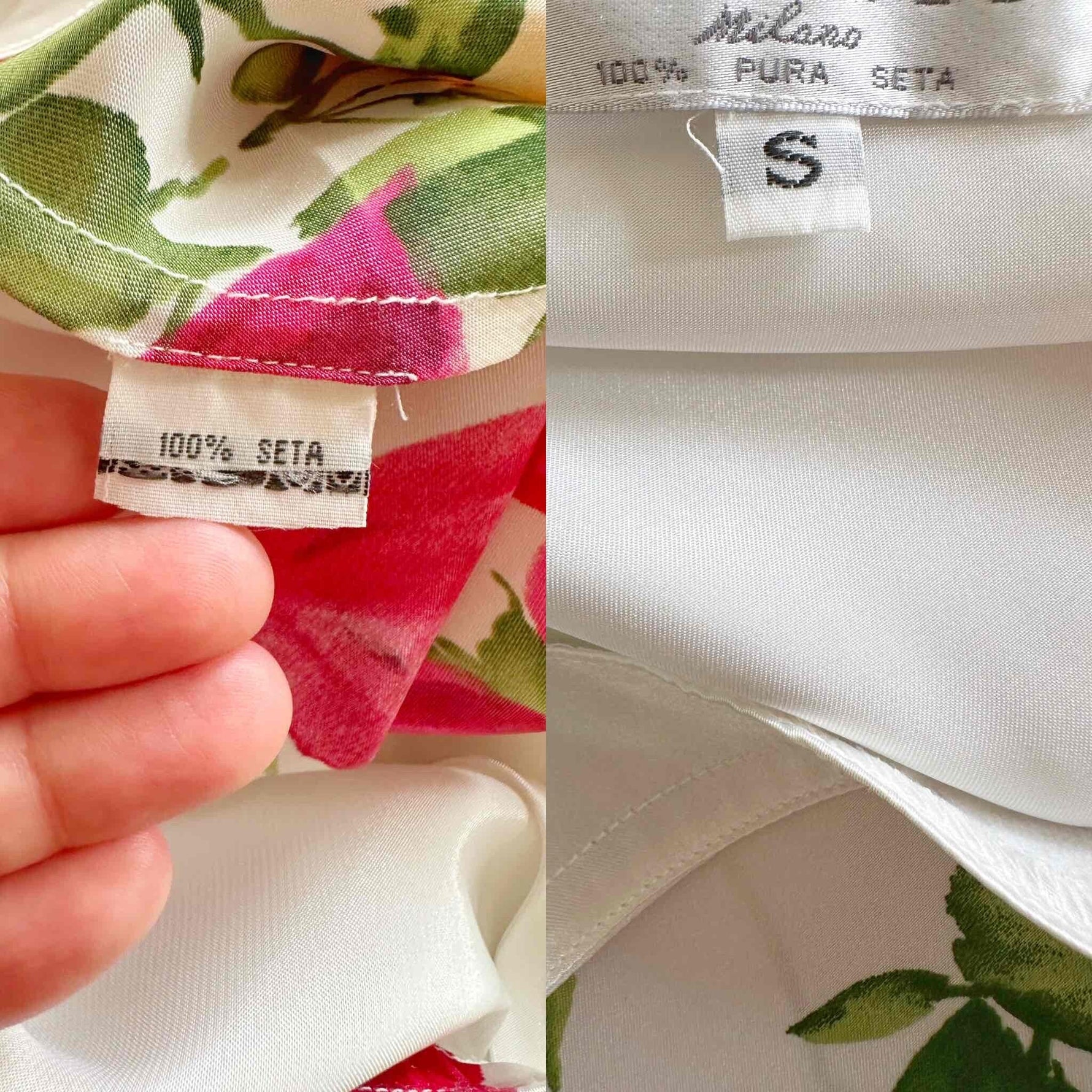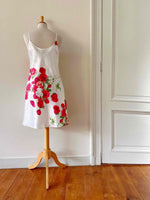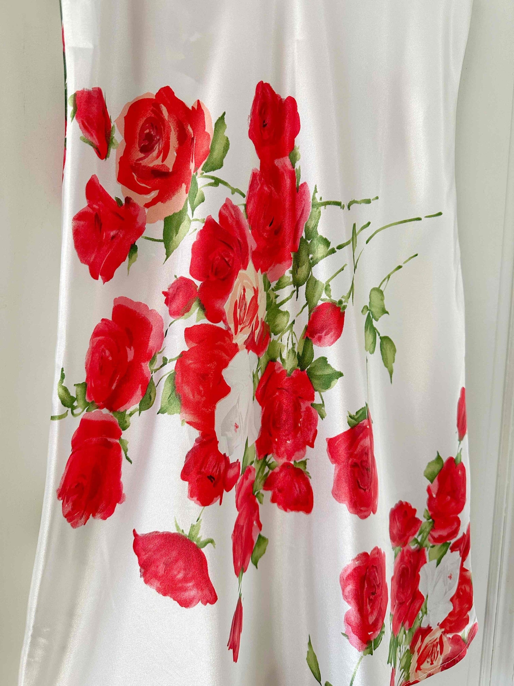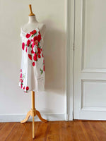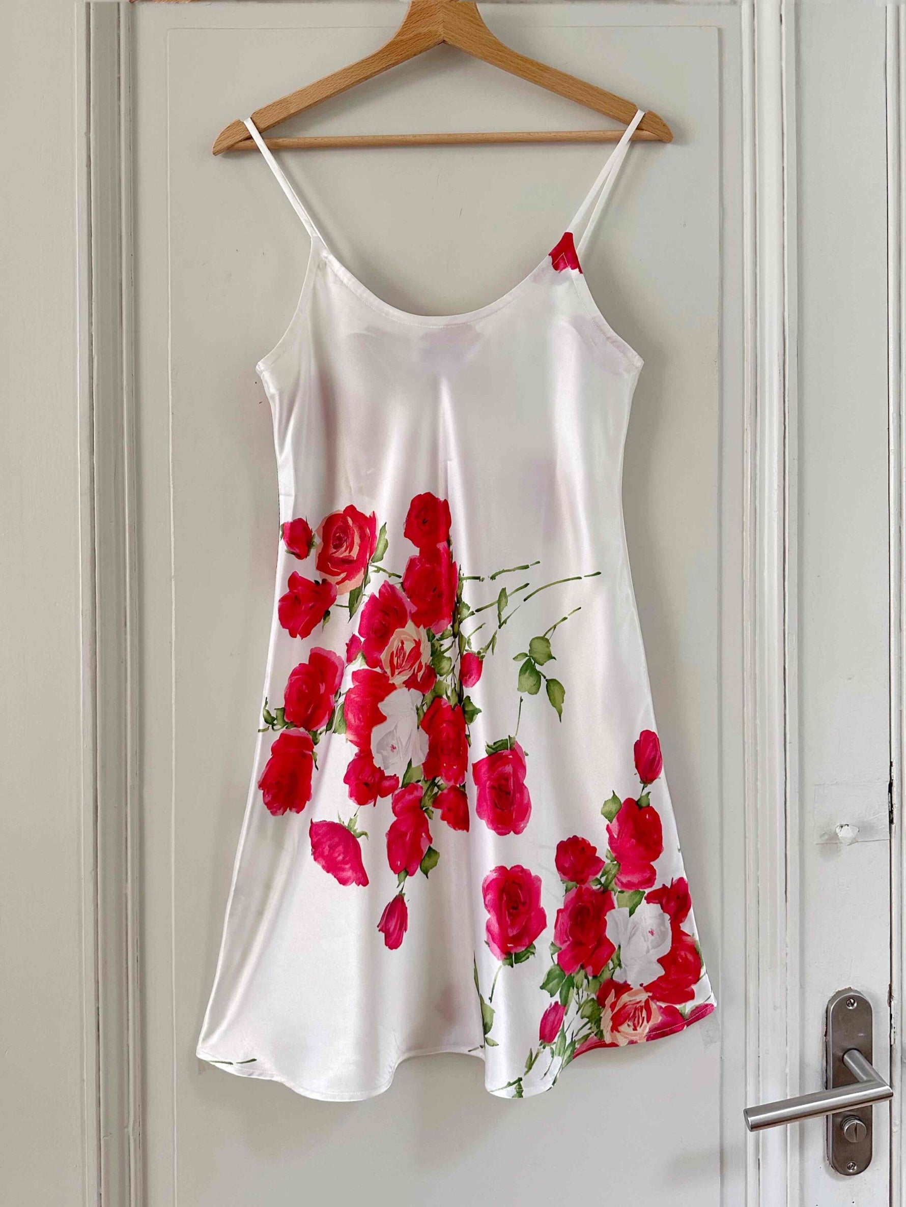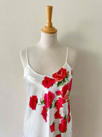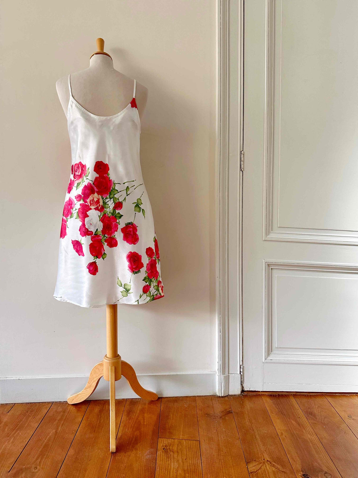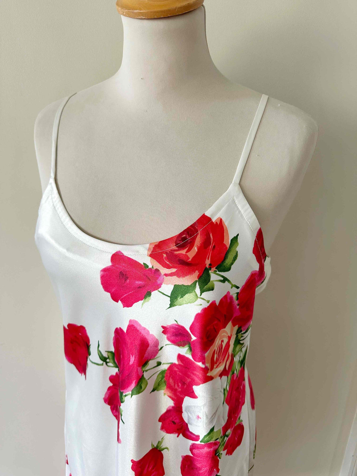 Robe nuisette en soie satin écru, imprimée fleur rose fuchsia, rouges et vertes, bretelles spaghettis, forme en biais, fabriquée en Italie, taille 36, portée ici sur un mannequin T36.