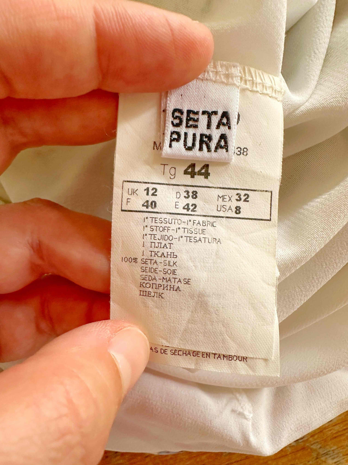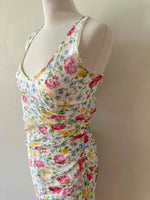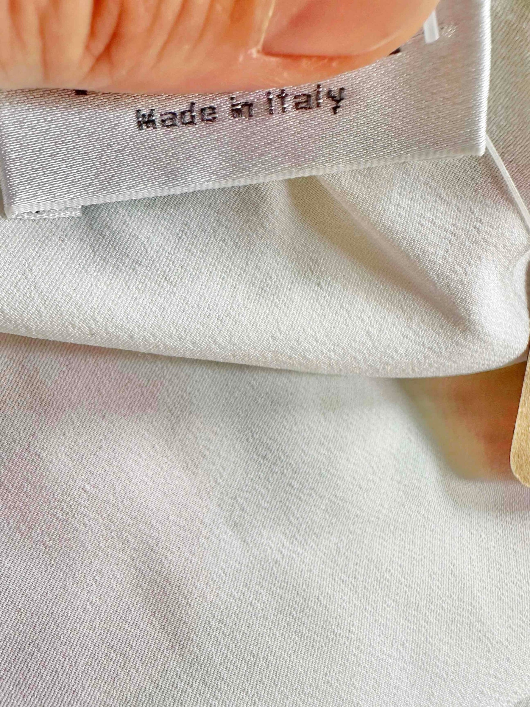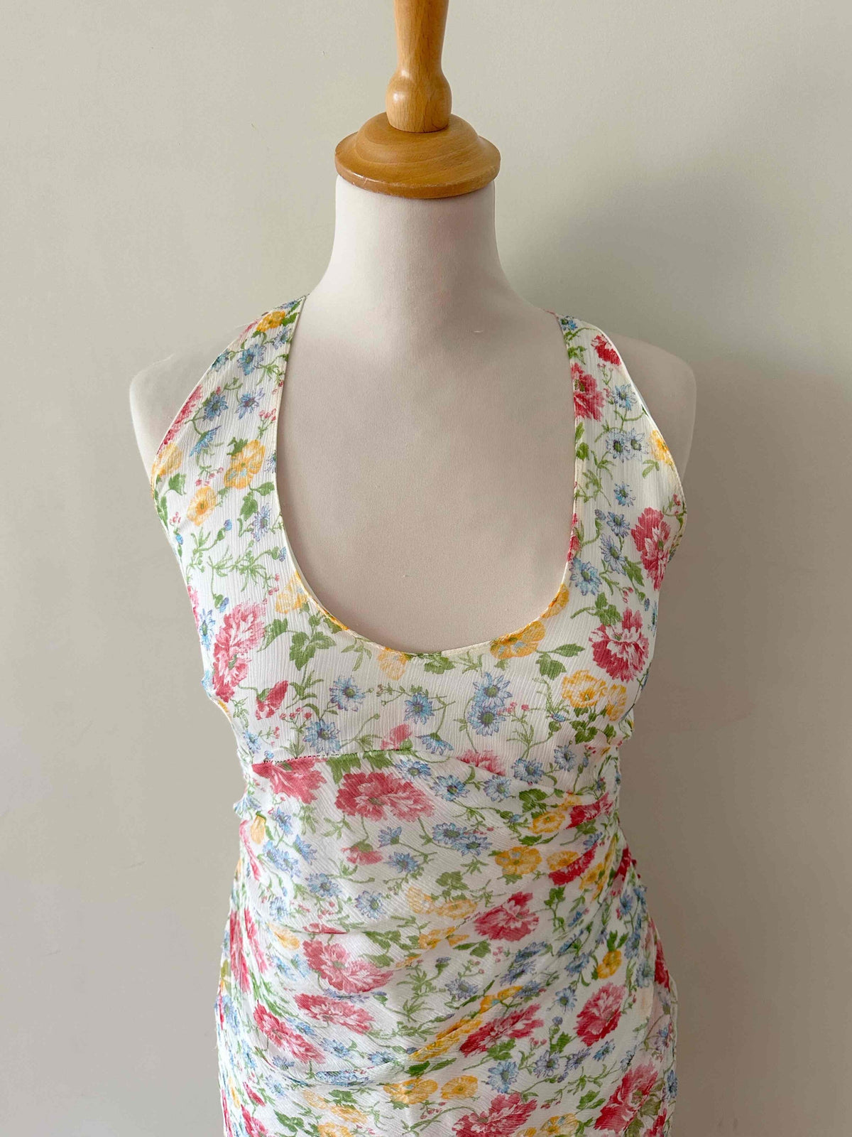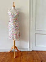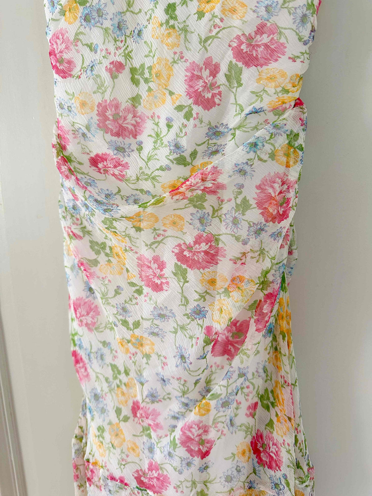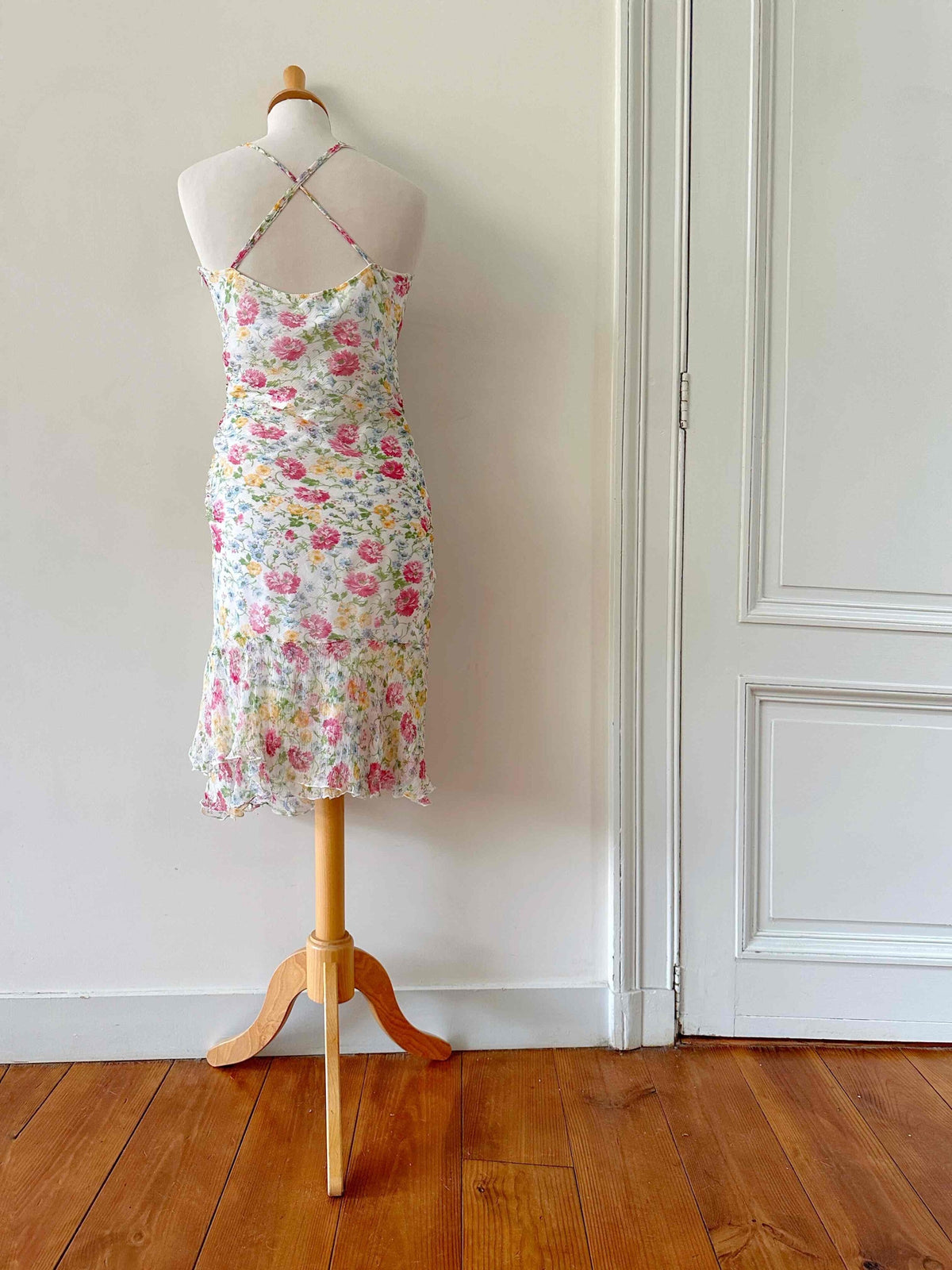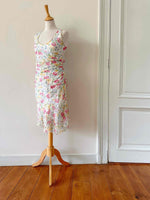 Prix unitaire parRobe nuisette en soie, mousseline de soie crepon blanche imprimée fleurs multicolores, bretelles spaghettis croisées au dos, côté drappé et plissé, fabriquée en Italie, convient aux tailles 34 et 36 portée ici sur un mannequin T36. Aisselles 43cm.
