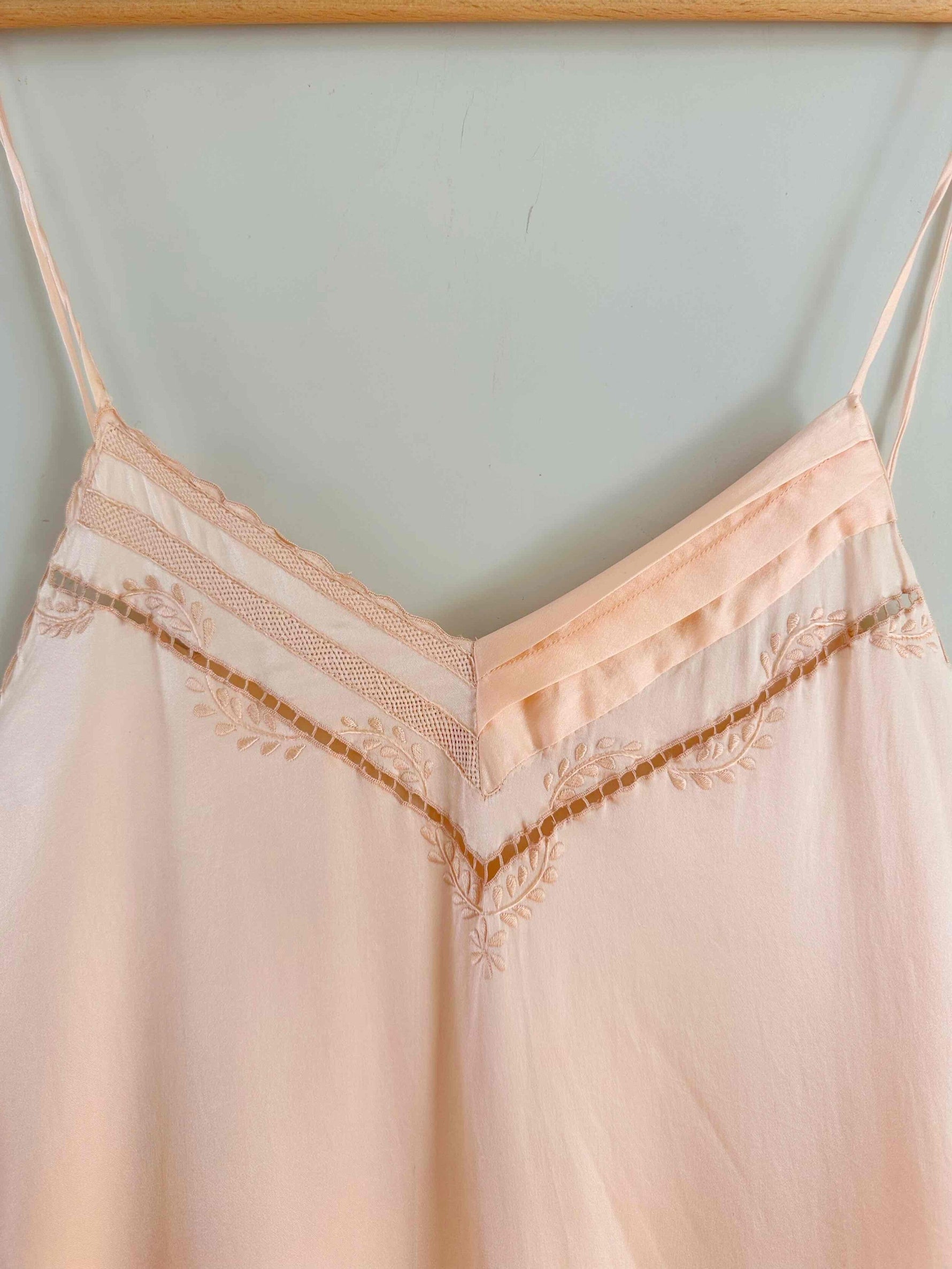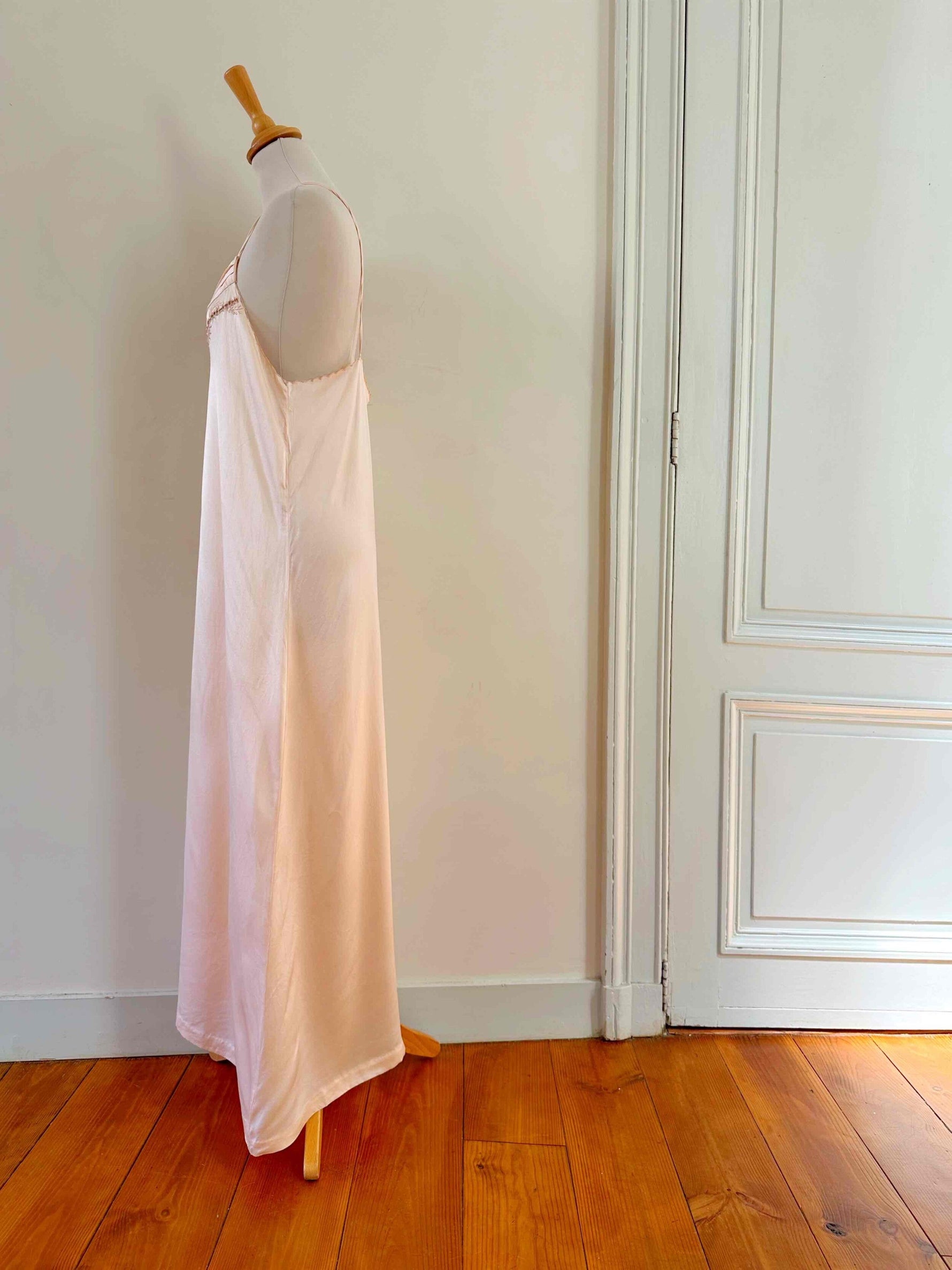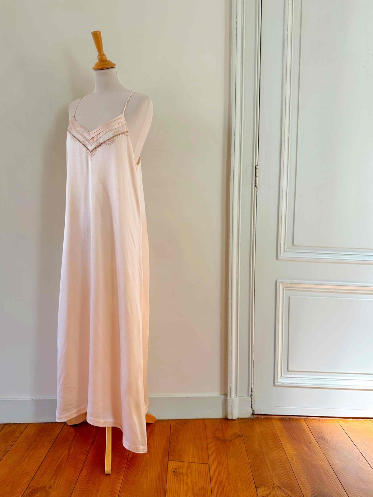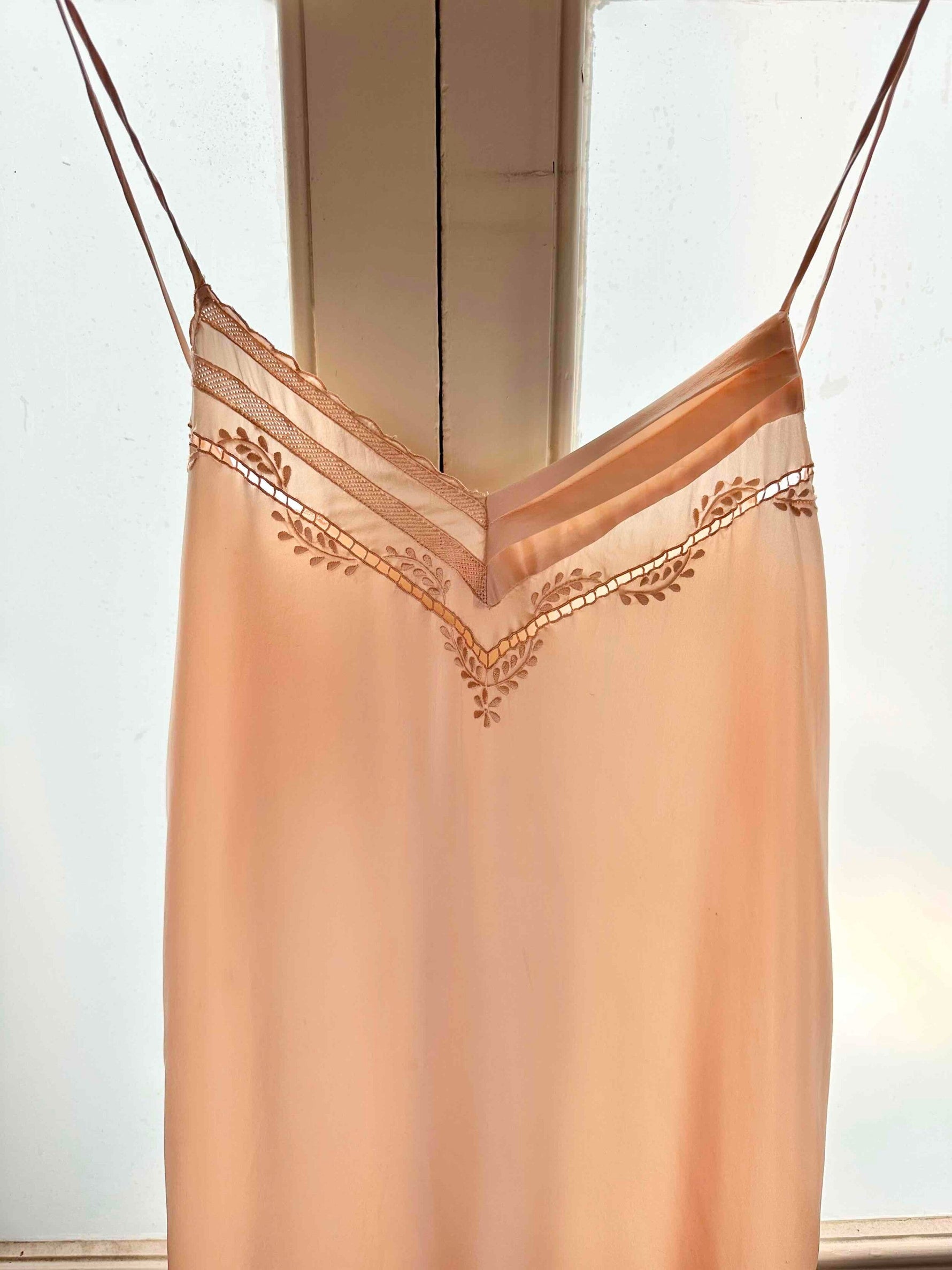Robe nuisette en satin de soie rose peche, bretelles spaghettis, emmanchures échancrées, encolure brodée et ajourées de fleurs, bords festonnés, années 80s, convient aux tailles 36 porté ample et 38 portée ici sur un mannequin T36, aisselles 45cm.